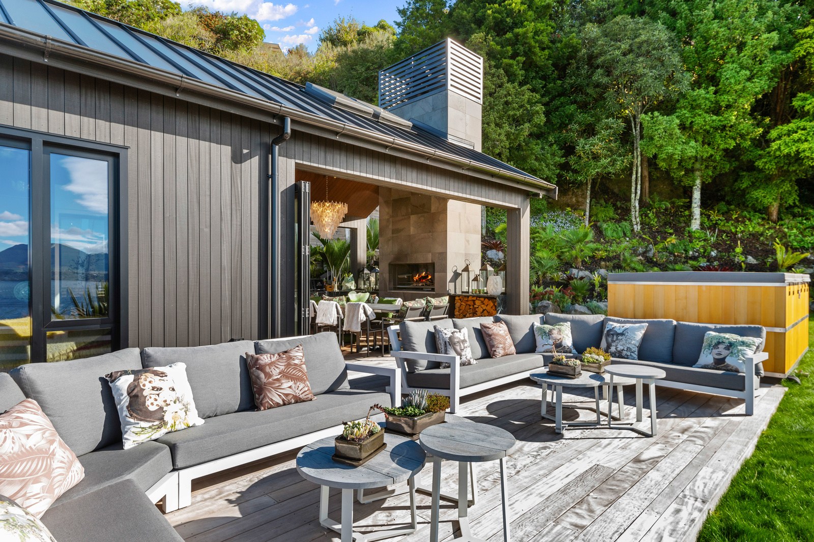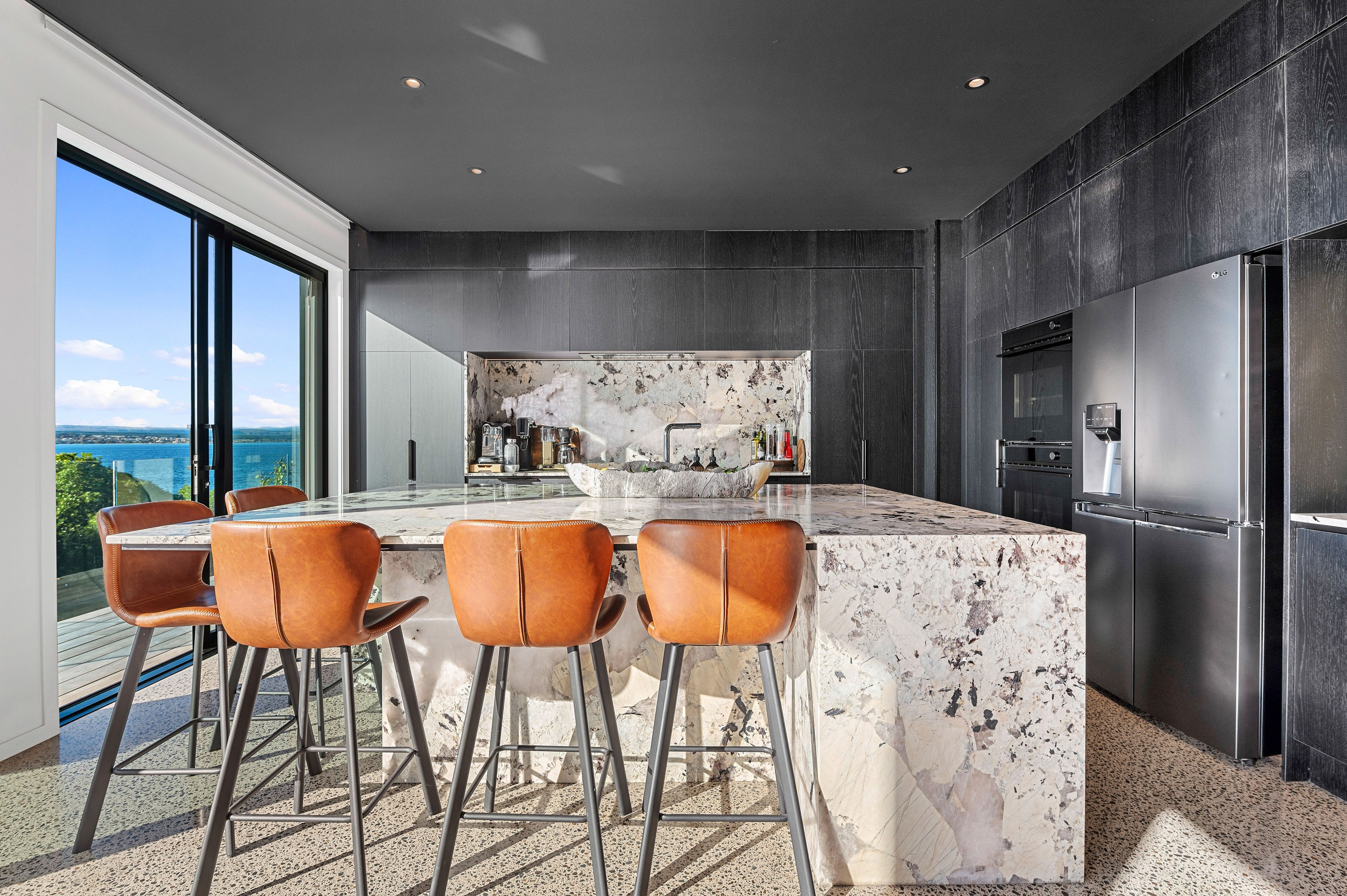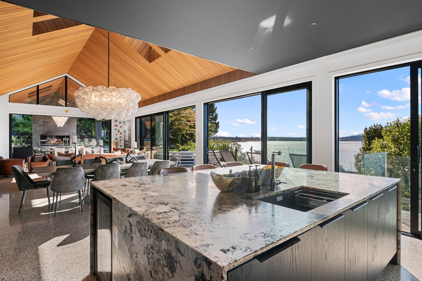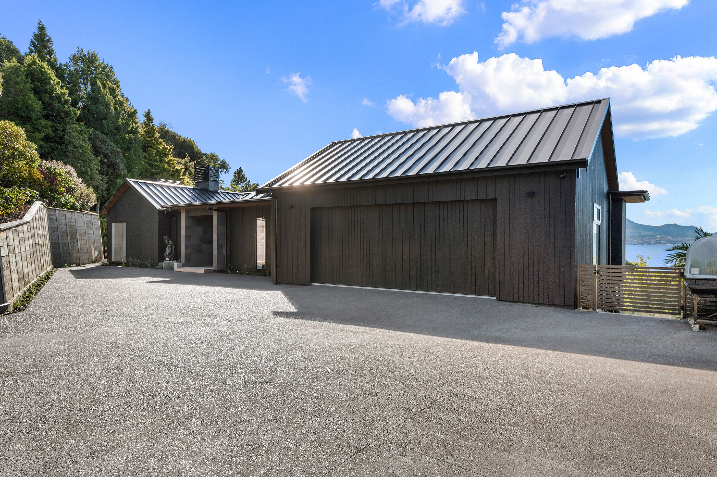 Set into the hillside above Lake Taupō, this expansive six-bedroom home was designed to accommodate an extended family, without overwhelming its surroundings. Known as Lakestone Lodge, the residence is thoughtfully positioned with a predominantly eastern outlook to the lake. Despite its 446sqm footprint, the home sits gently within the site thanks to careful use of form and materials. Gable and flat rooflines help to break up the visual mass from the approach, while dark cladding and a clean linear elevation allow the lake-facing side to recede into the landscape.