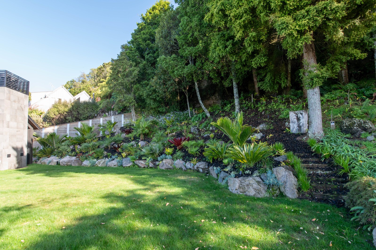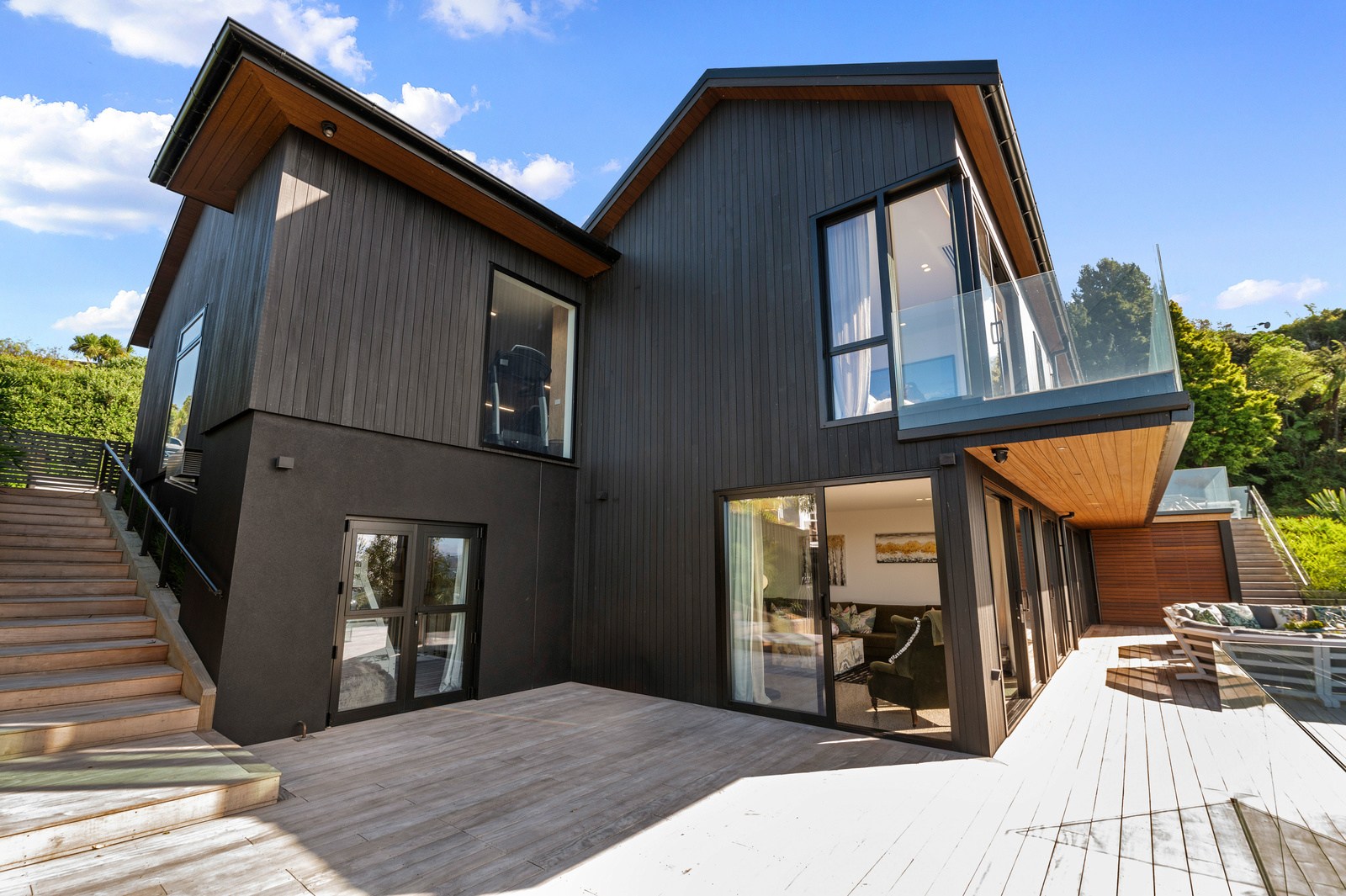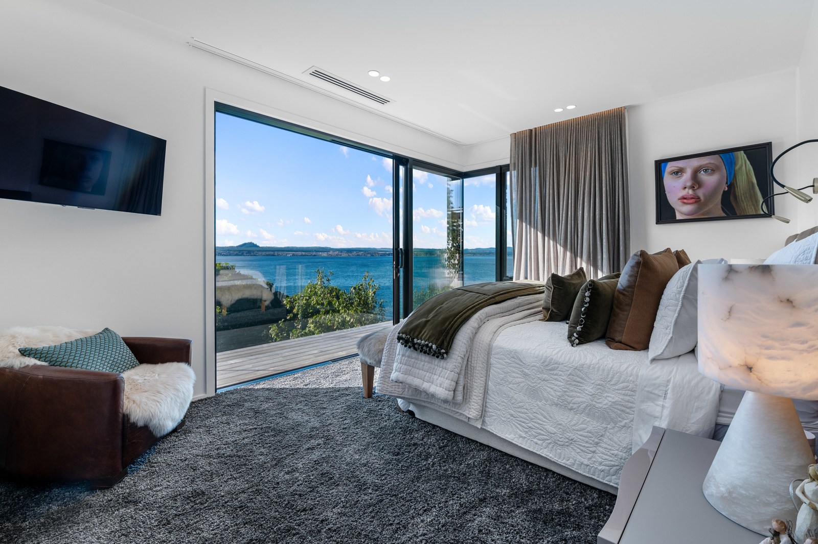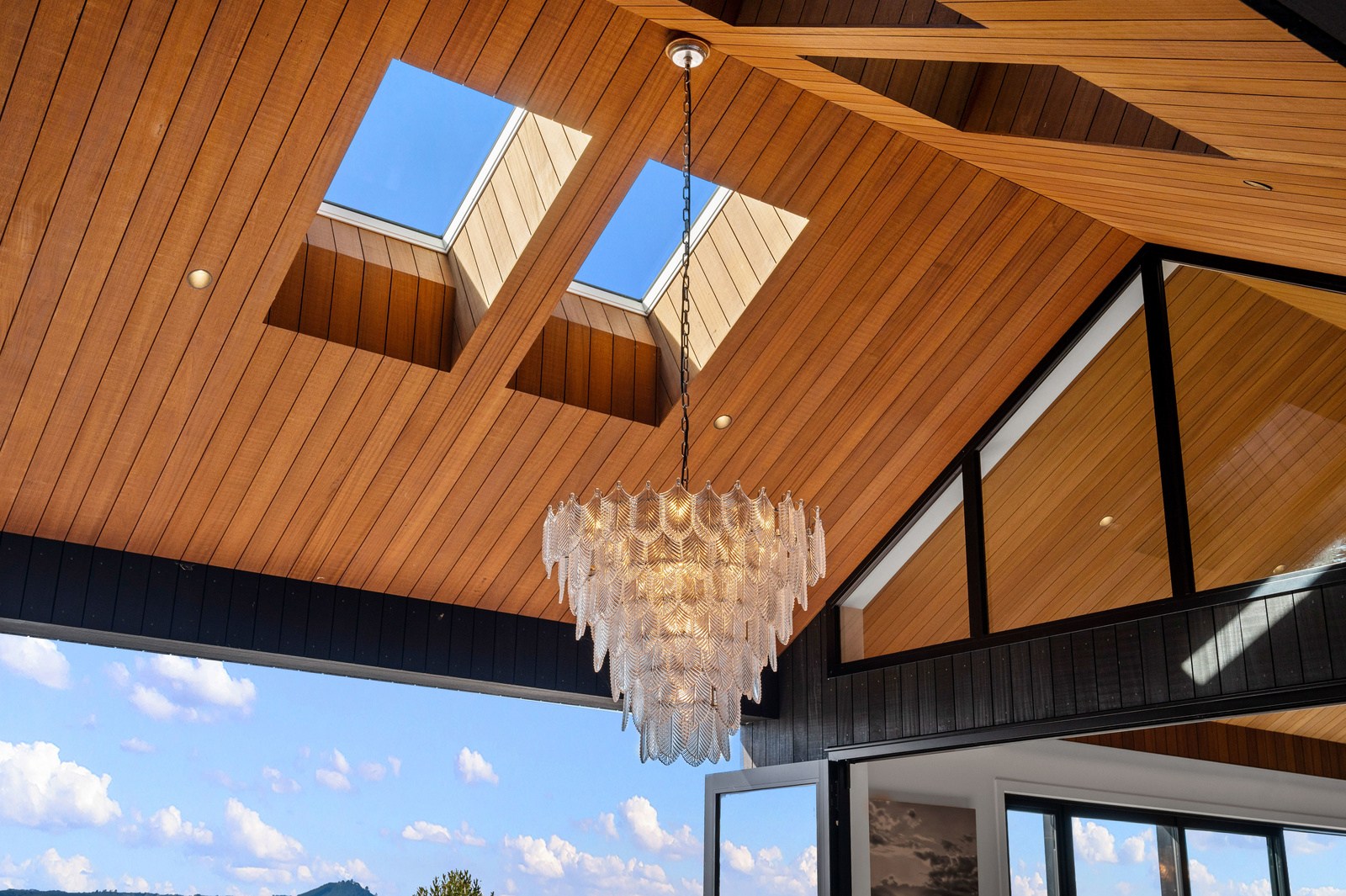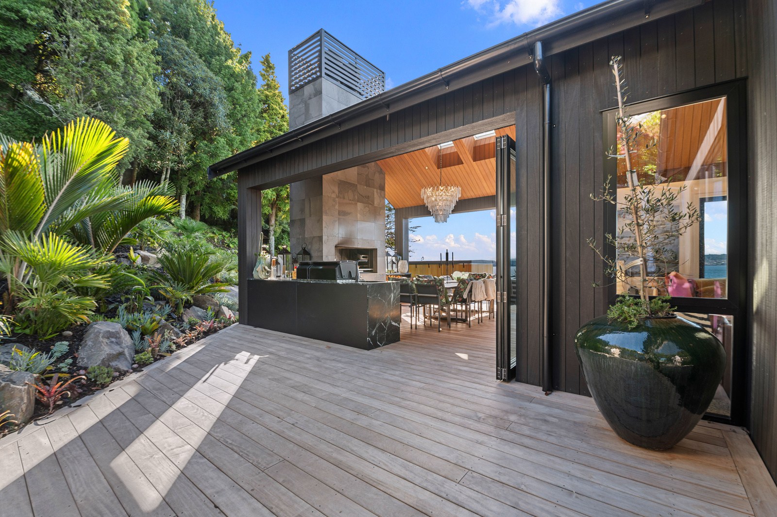 Set into the hillside above Lake Taupō, this expansive six-bedroom home was designed to accommodate an extended family, without overwhelming its surroundings. Known as Lakestone Lodge, the residence is thoughtfully positioned with a predominantly eastern outlook to the lake. Despite its 446sqm footprint, the home sits gently within the site thanks to careful use of form and materials. Gable and flat rooflines help to break up the visual mass from the approach, while dark cladding and a clean linear elevation allow the lake-facing side to recede into the landscape.