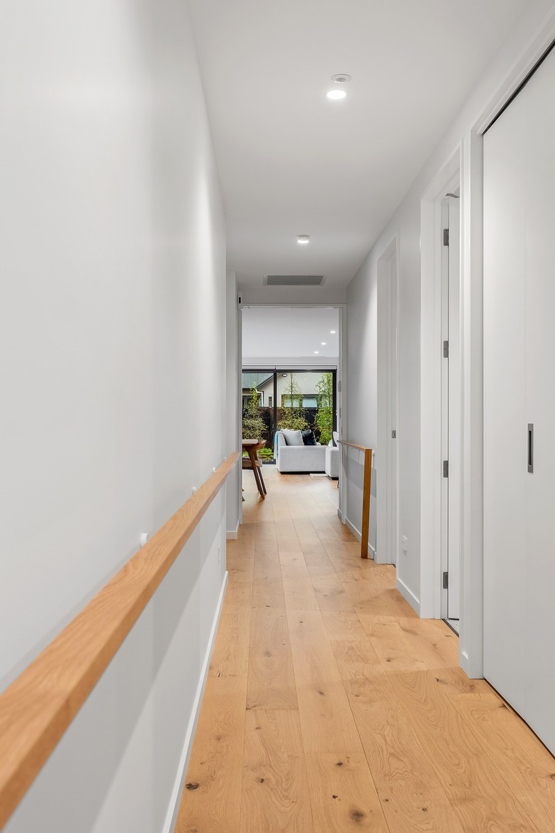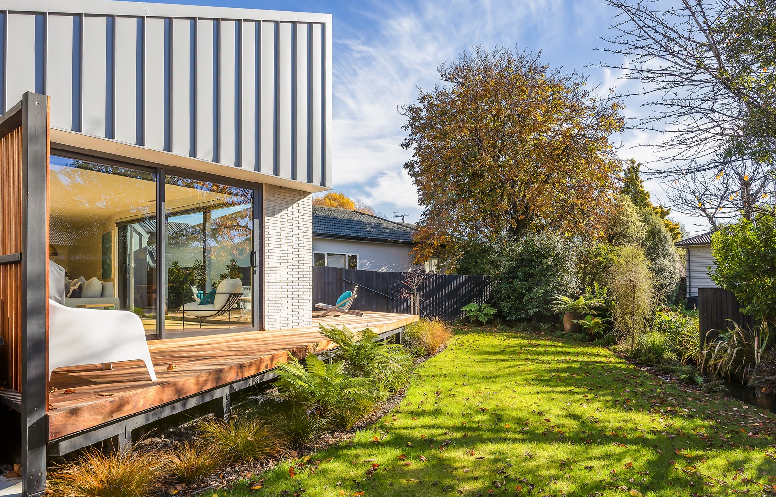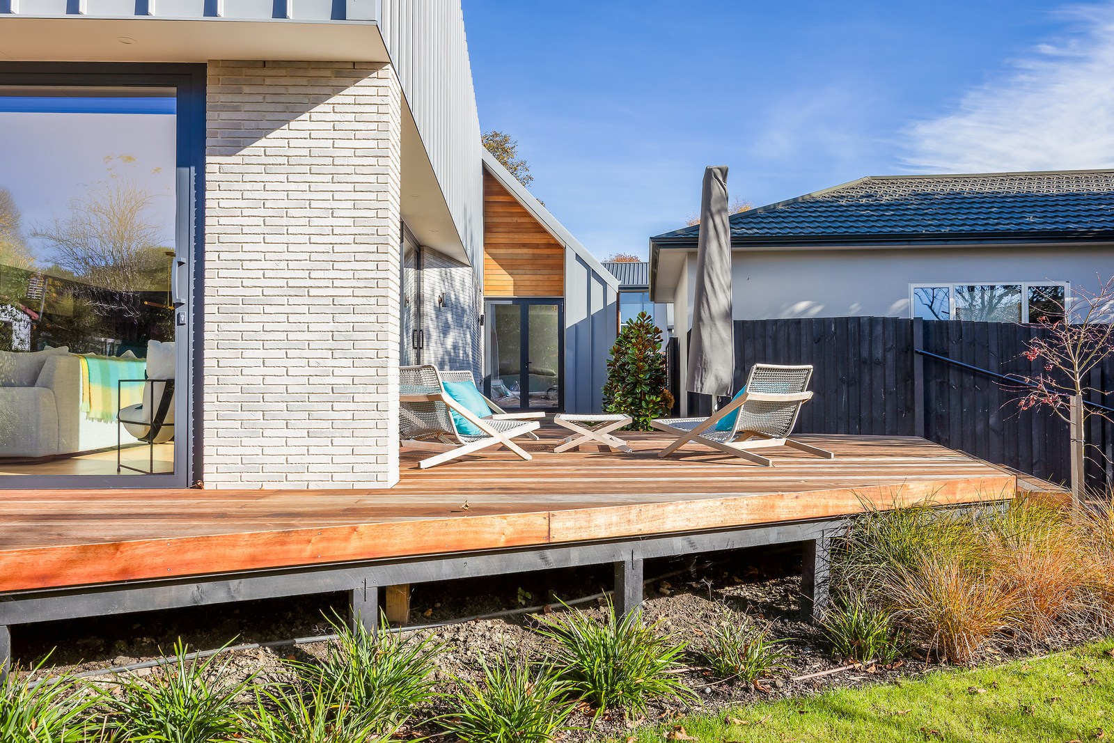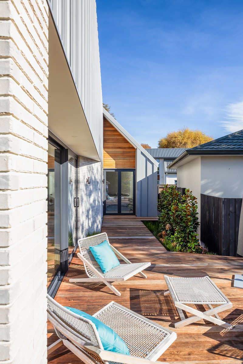 Tucked down a driveway in an established Christchurch suburb is a new piece of modern sculpture. The architect-designed three-bedroom home is bold with strong lines, intriguing angles and a dazzling white and timber multi-textured exterior. Yes, it’s an exemplar of contemporary elegance — the exterior is crafted from European bricks, cedar and metal wall cladding and roofing — but also of design smarts. The 198sqm house fits neatly into an irregular-shaped section, with a stream on one boundary. Built with high-rated timber piles and double-pod foundations, it’s also strong and stable.