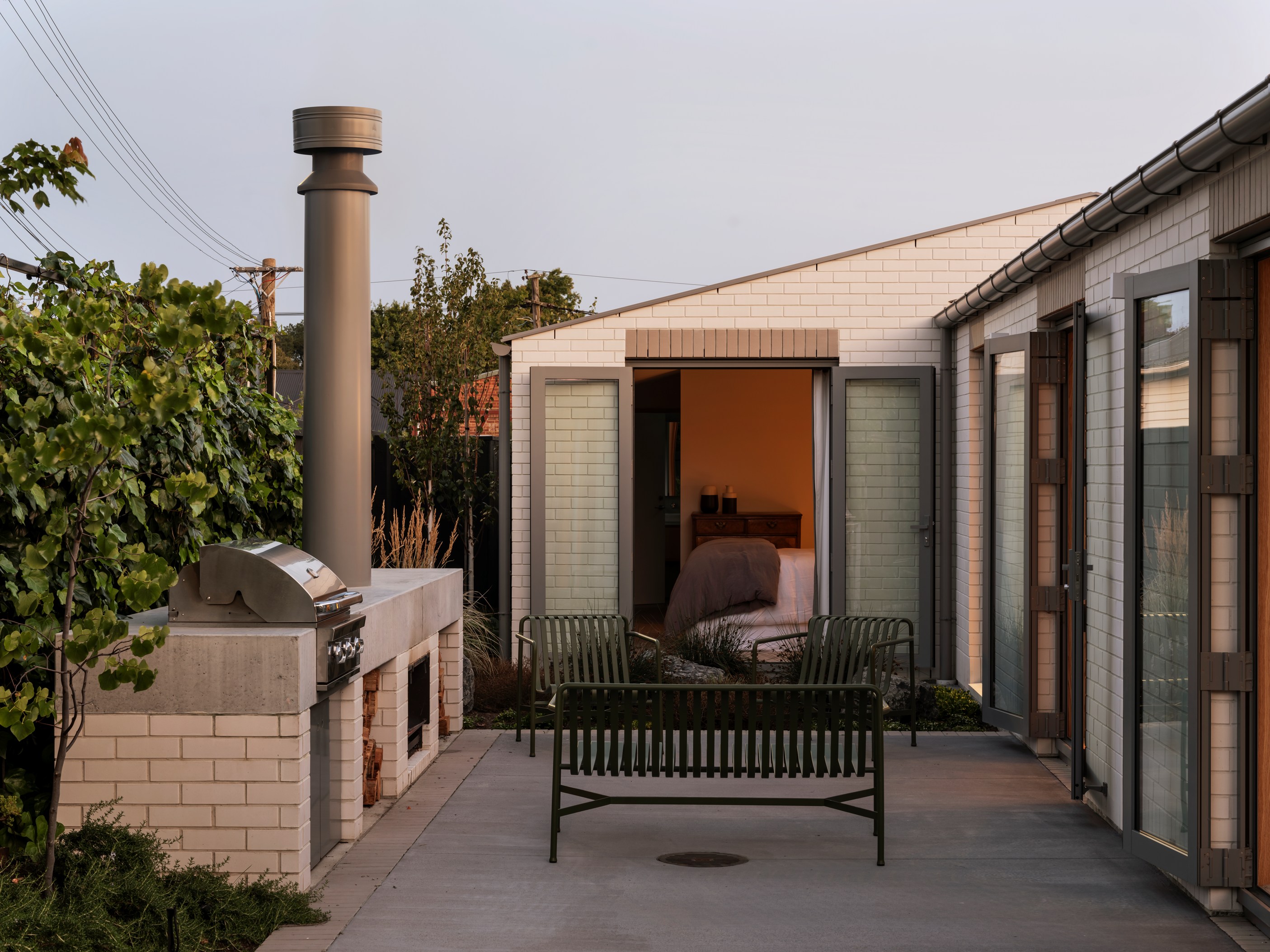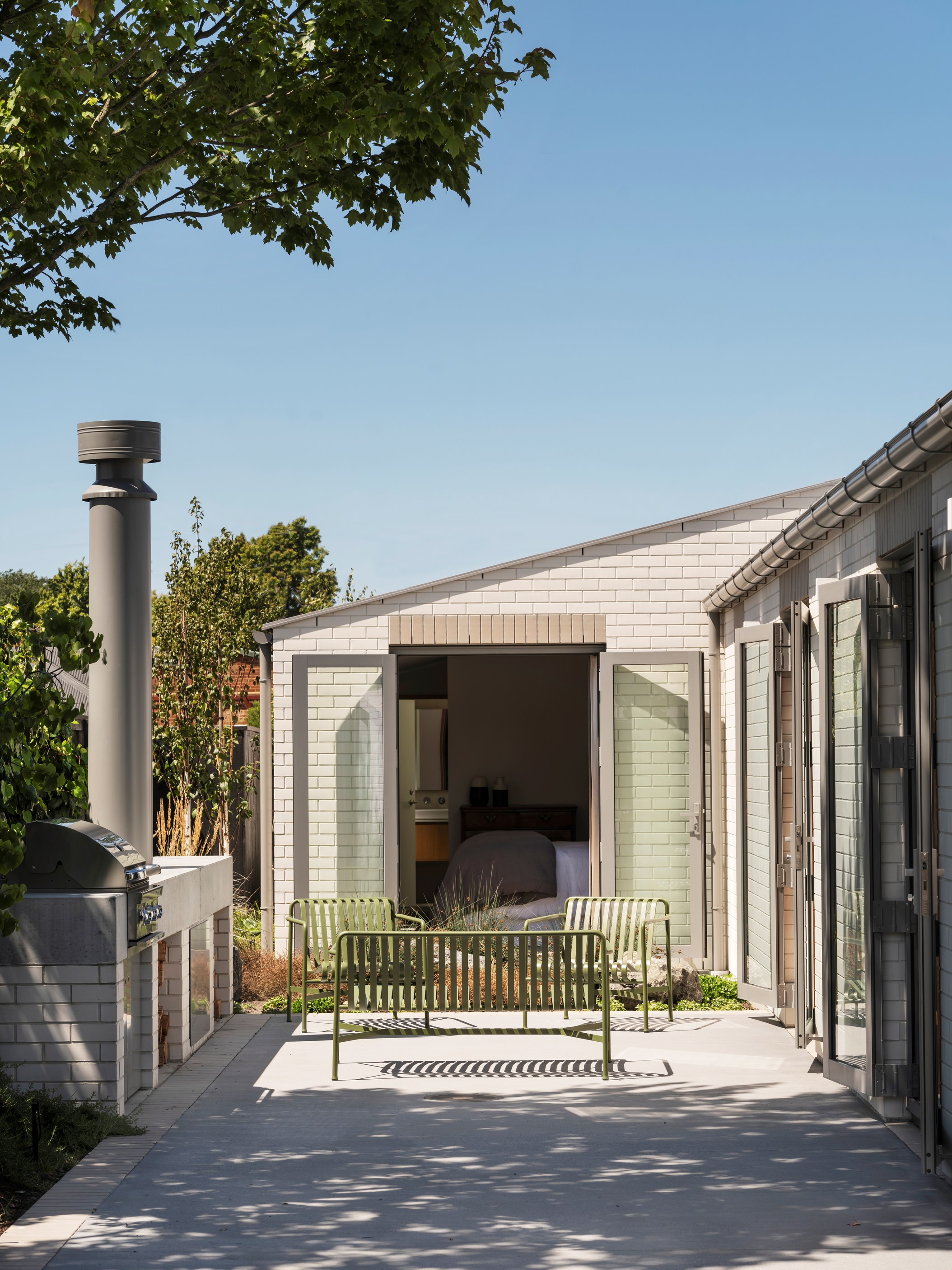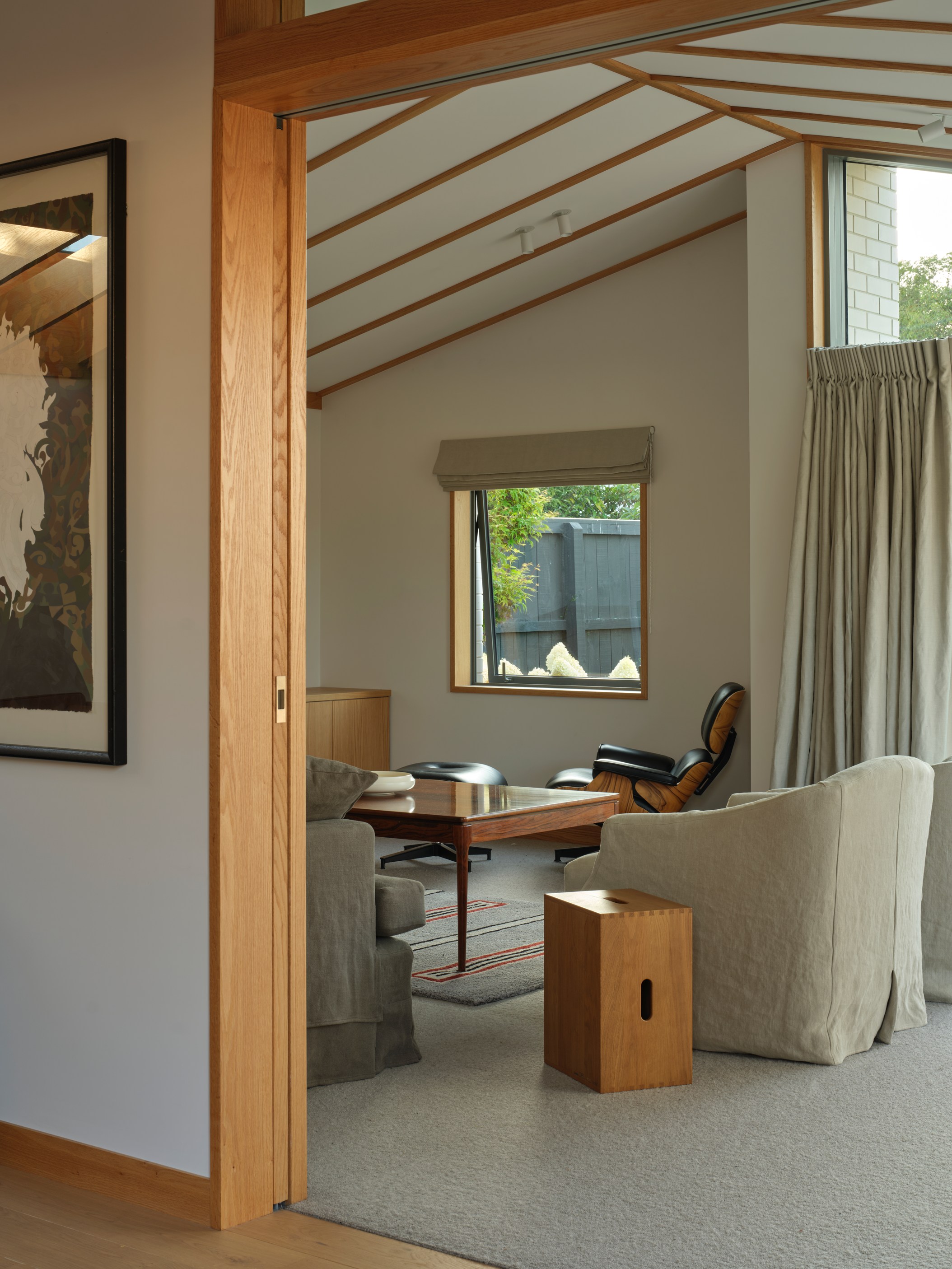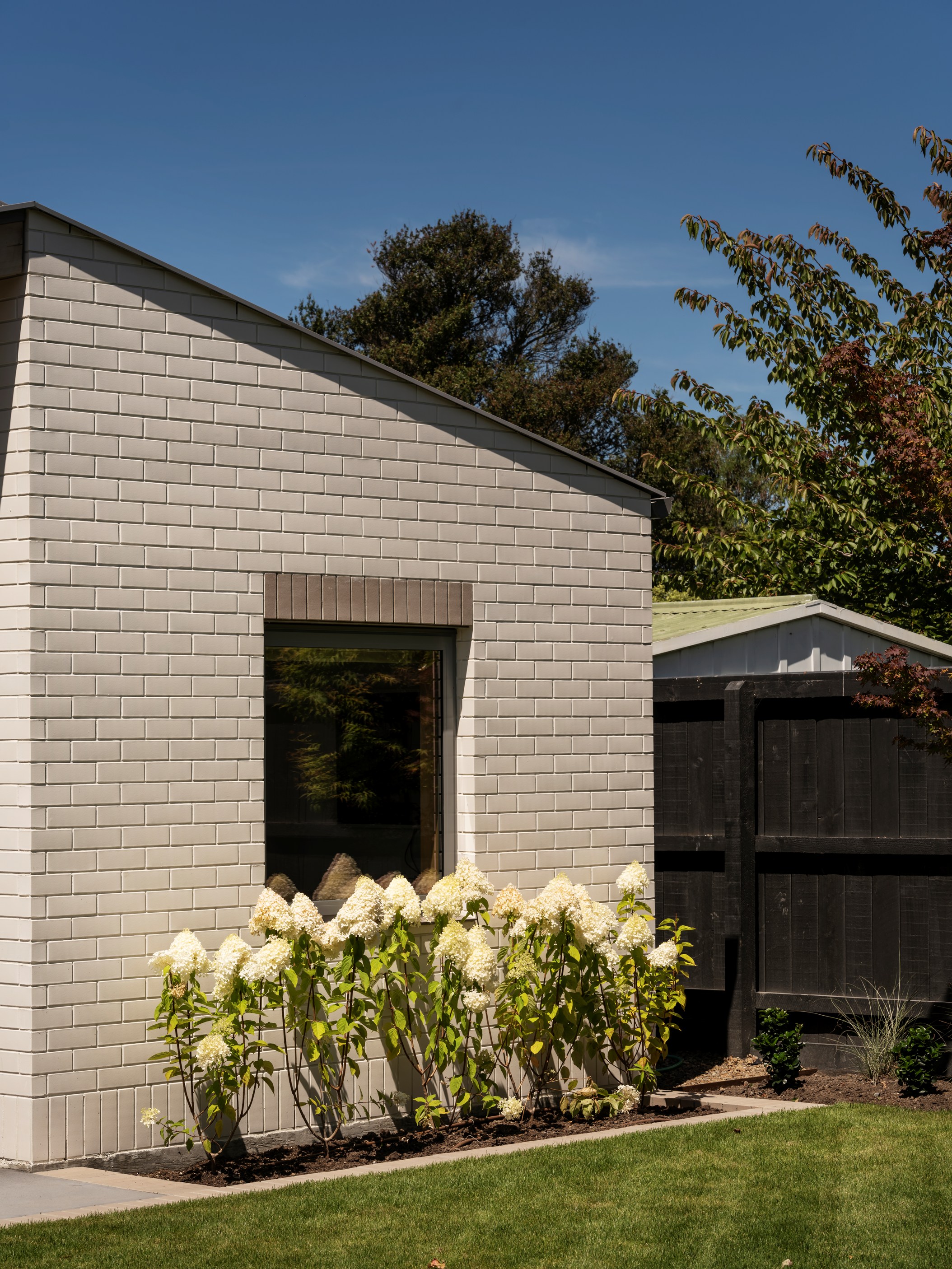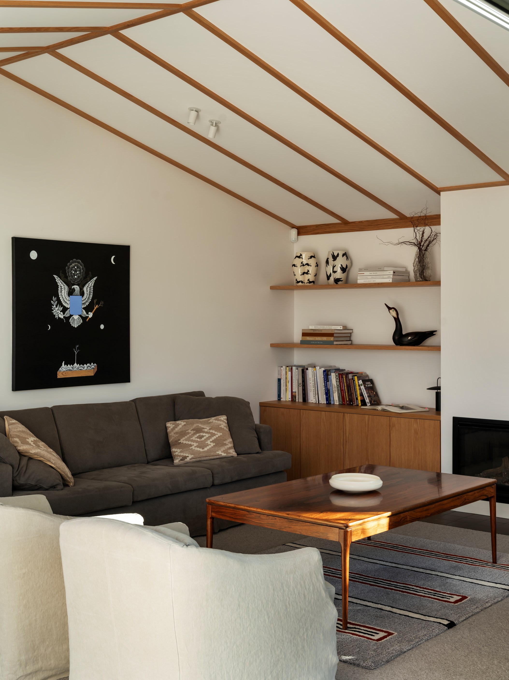 From the street, this brick-clad house looks smart, but you don’t appreciate the scale of what’s on offer here until you venture into the property. The four-bedroom home, influenced by the owners’ love of mid-century architecture, is long, low and undeniably lovely. To make the most of the long, narrow site, a single-gable offset floorplan was used, which had the advantage of creating side yards for sheltered outdoor areas. The gables also gave rise to pitched ceilings with timber battens in the living spaces, reinforcing the mid-century vibe. The white-and-wood interior is crammed full of pleasing details.