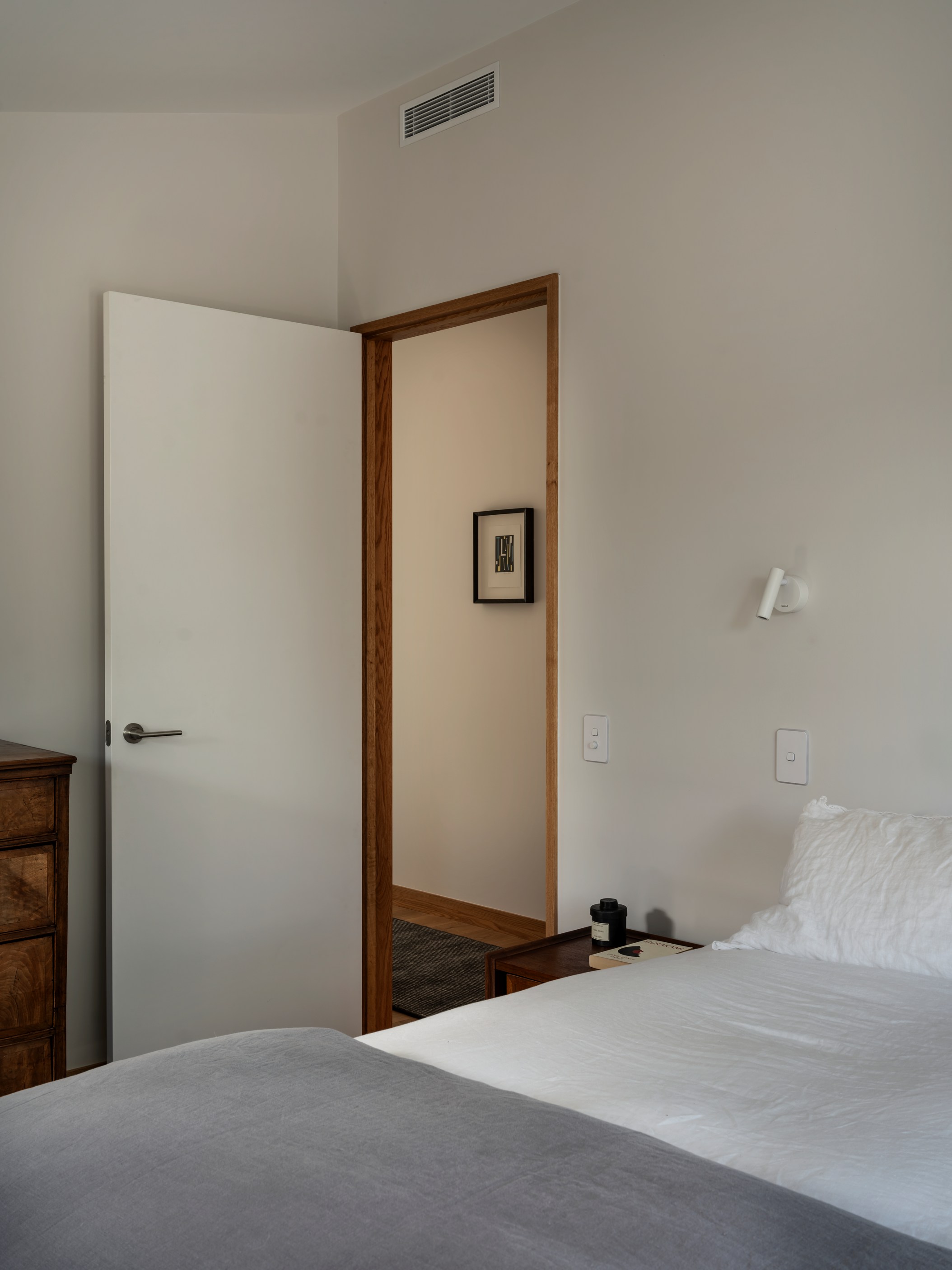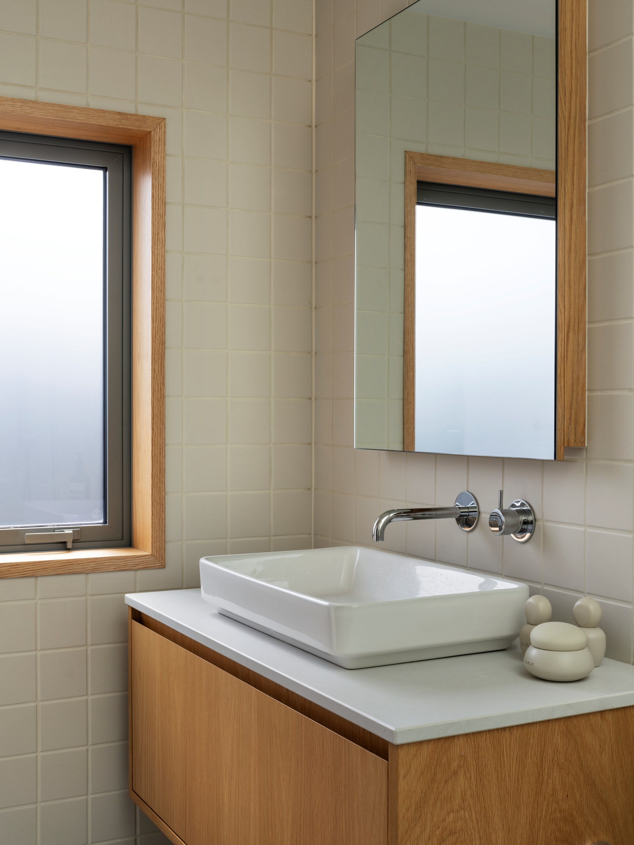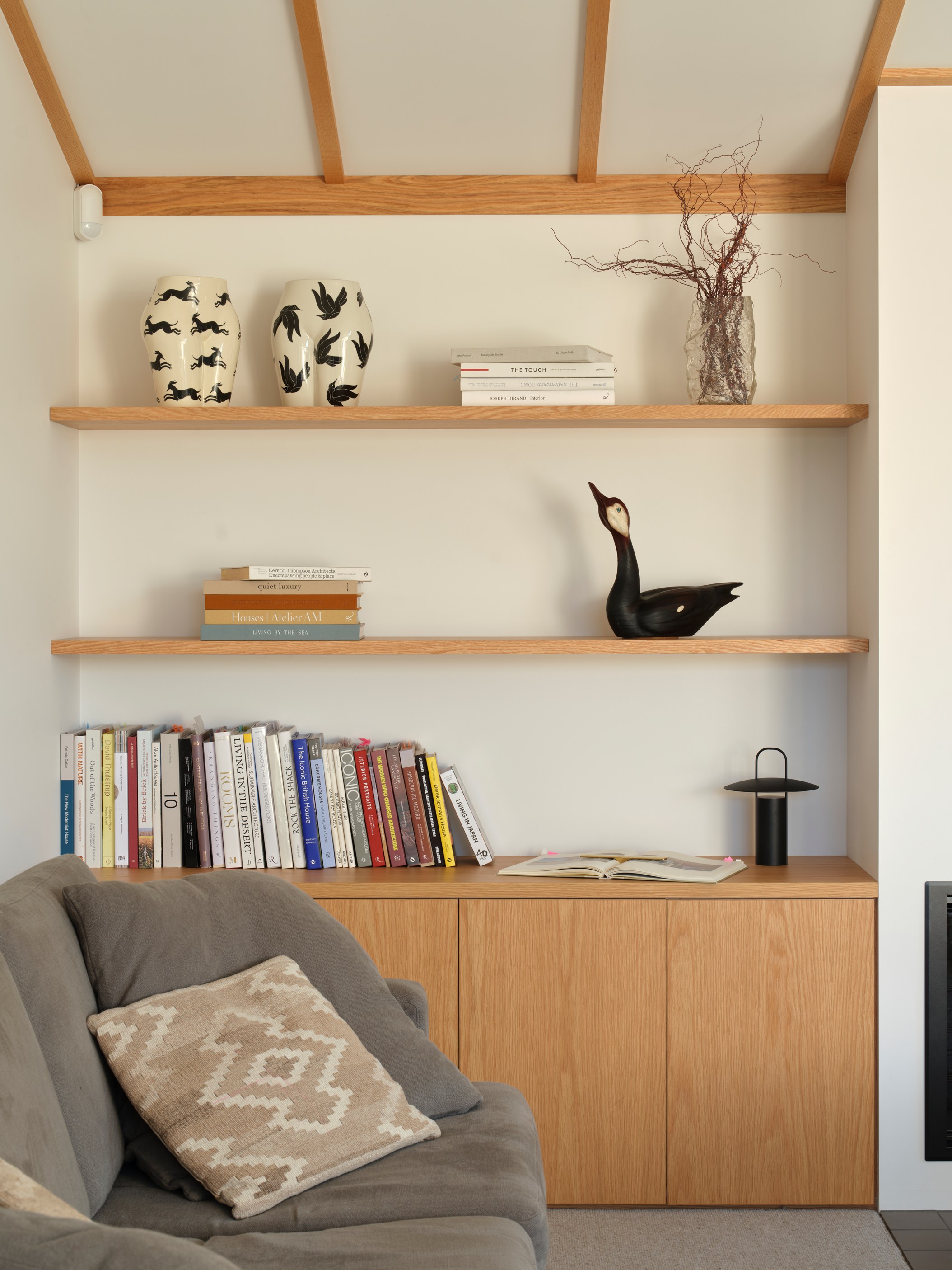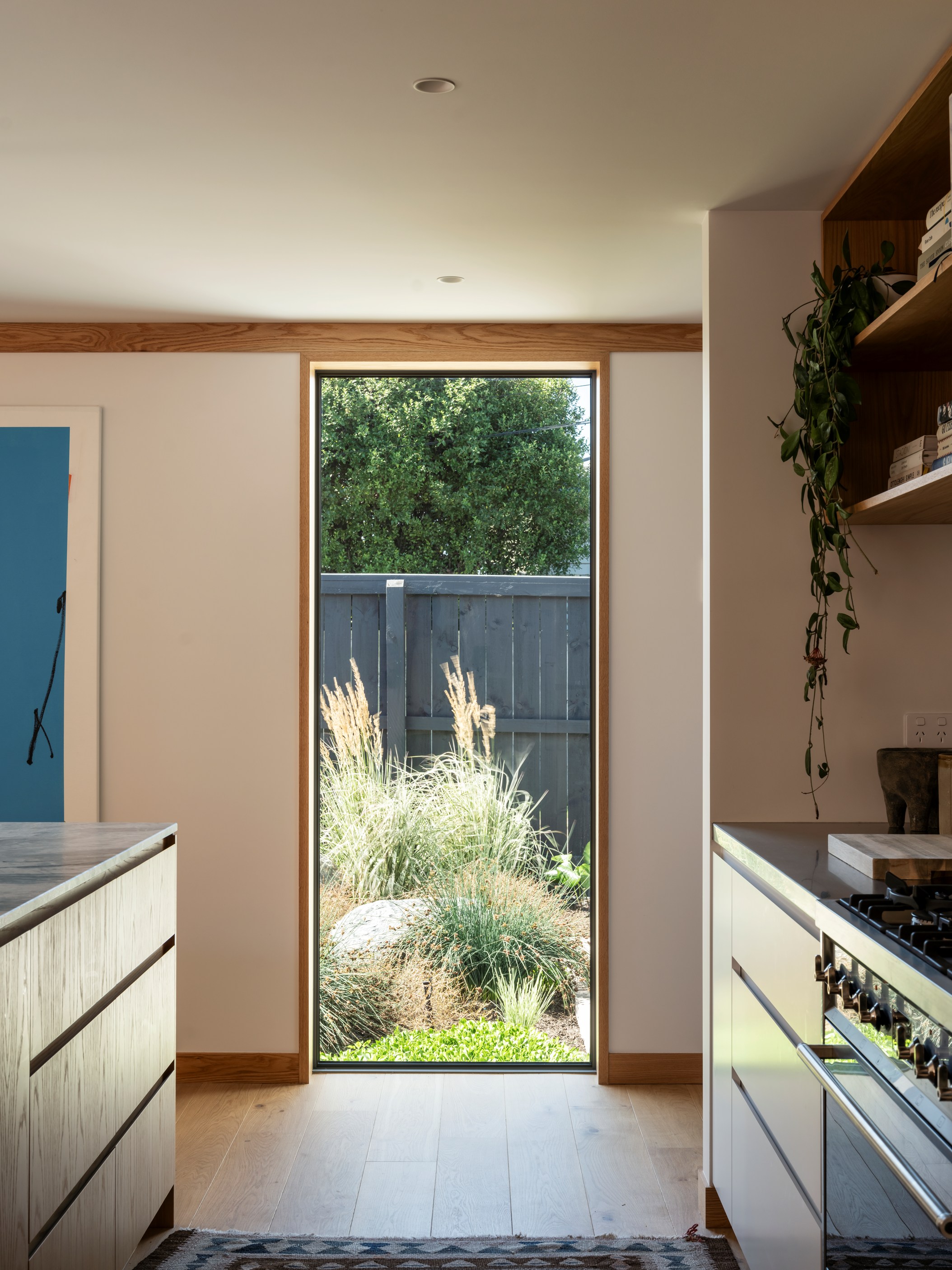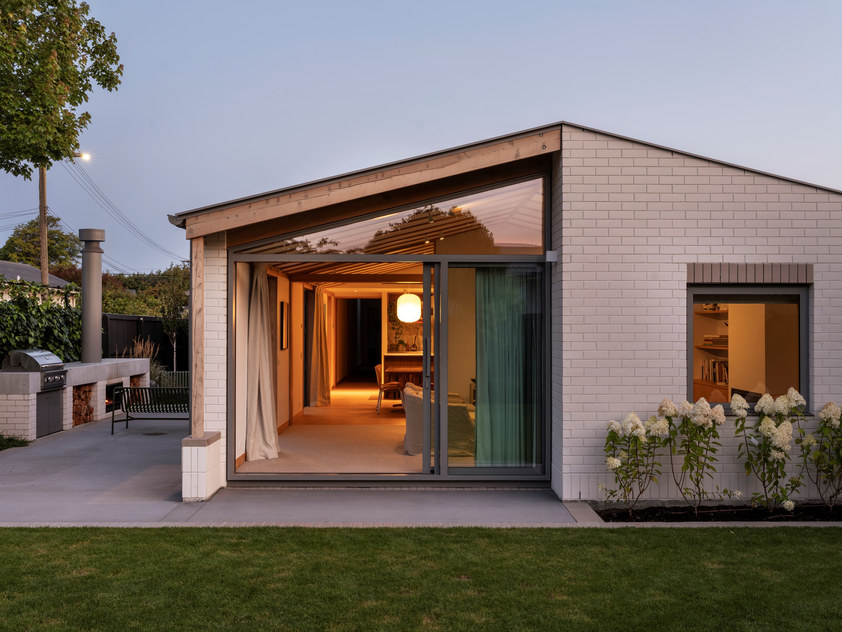 From the street, this brick-clad house looks smart, but you don’t appreciate the scale of what’s on offer here until you venture into the property. The four-bedroom home, influenced by the owners’ love of mid-century architecture, is long, low and undeniably lovely. To make the most of the long, narrow site, a single-gable offset floorplan was used, which had the advantage of creating side yards for sheltered outdoor areas. The gables also gave rise to pitched ceilings with timber battens in the living spaces, reinforcing the mid-century vibe. The white-and-wood interior is crammed full of pleasing details.
