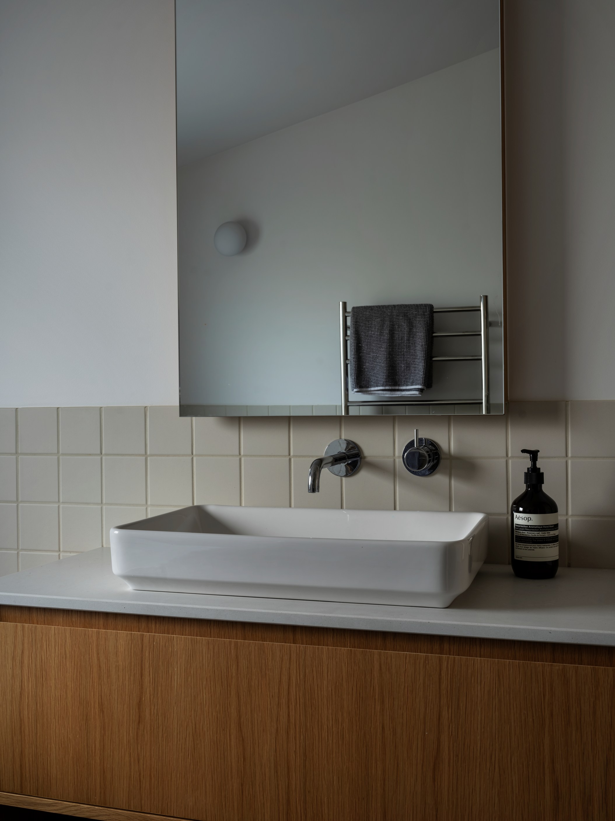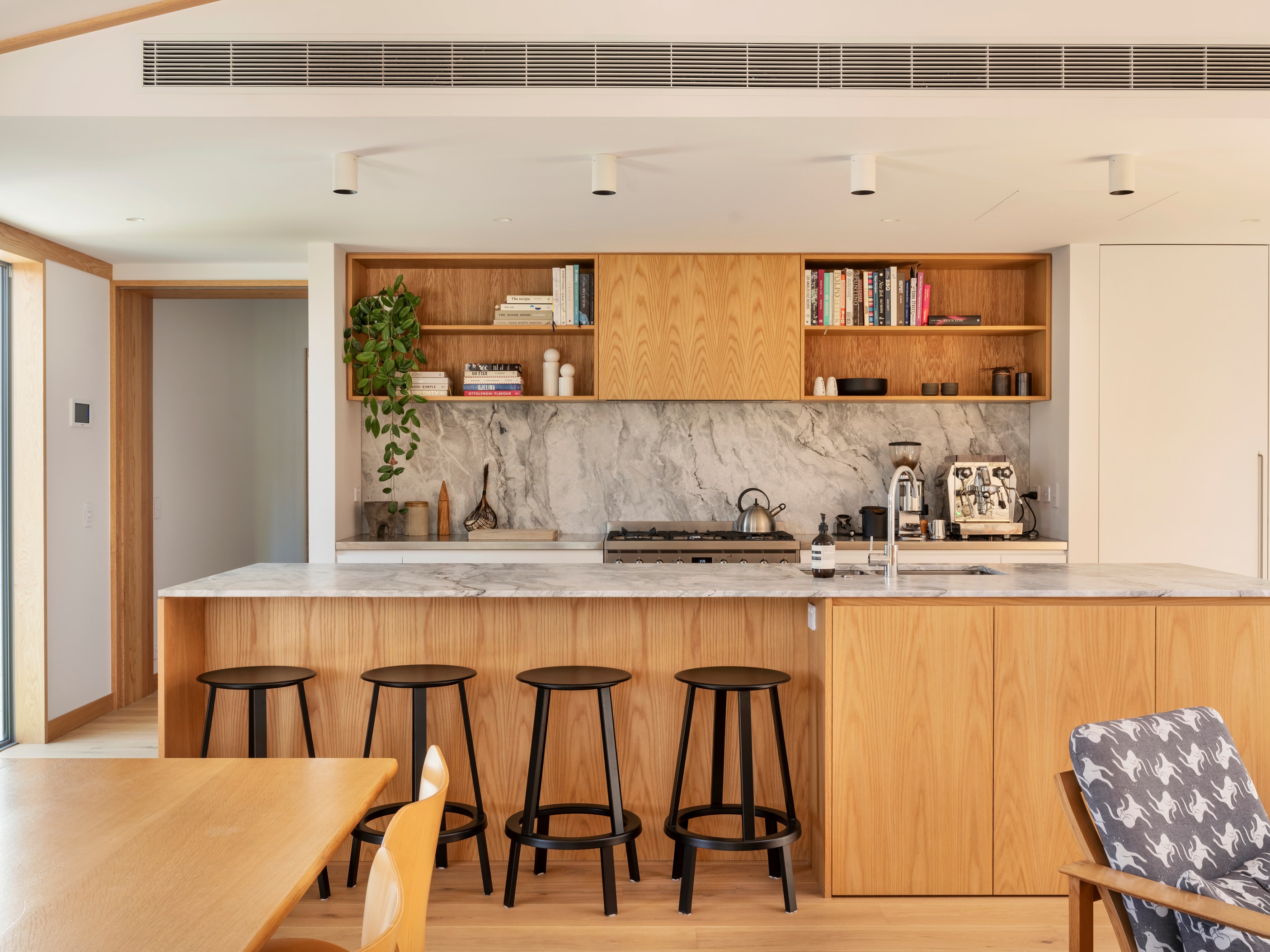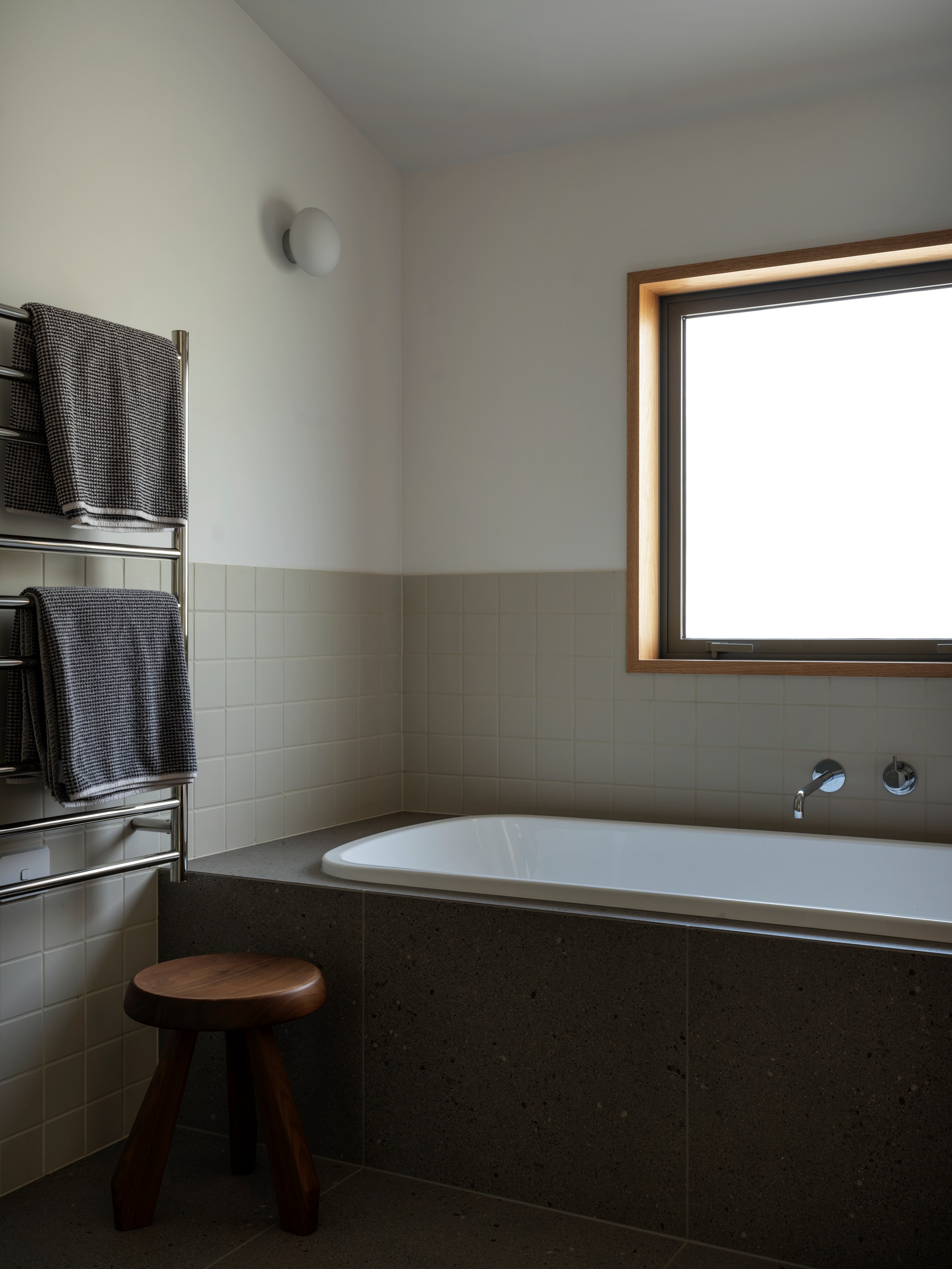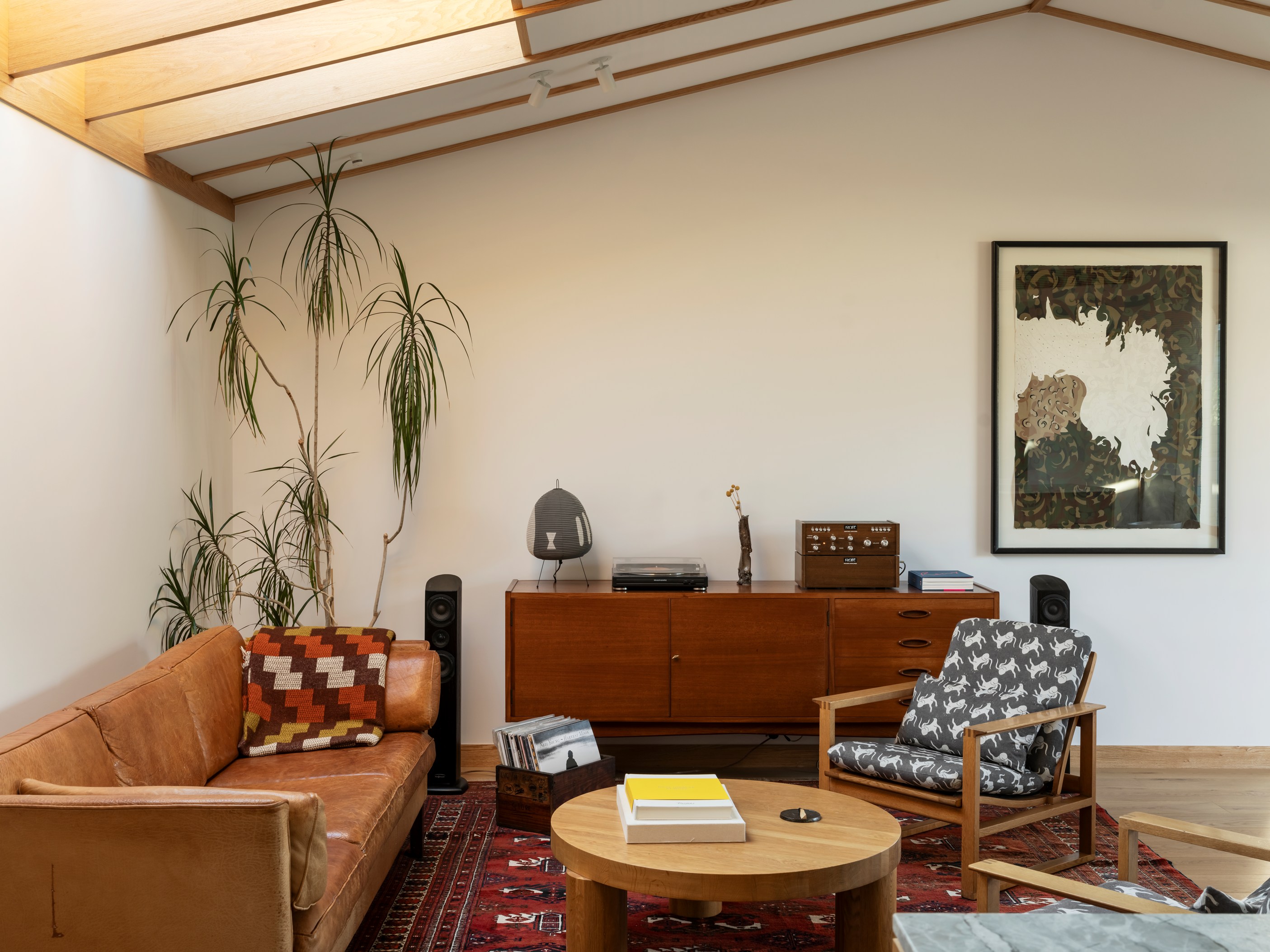 From the street, this brick-clad house looks smart, but you don’t appreciate the scale of what’s on offer here until you venture into the property. The four-bedroom home, influenced by the owners’ love of mid-century architecture, is long, low and undeniably lovely. To make the most of the long, narrow site, a single-gable offset floorplan was used, which had the advantage of creating side yards for sheltered outdoor areas. The gables also gave rise to pitched ceilings with timber battens in the living spaces, reinforcing the mid-century vibe. The white-and-wood interior is crammed full of pleasing details.