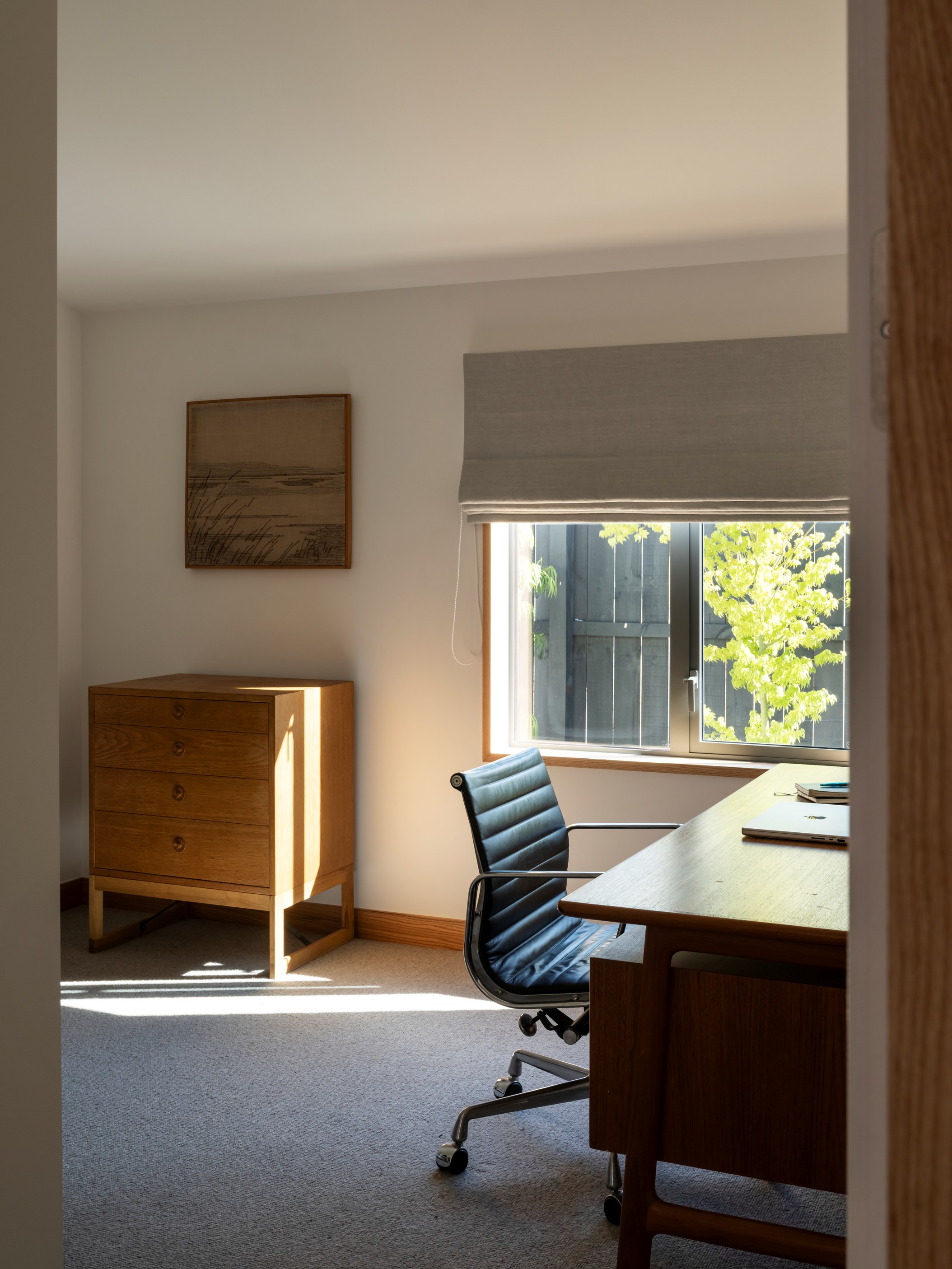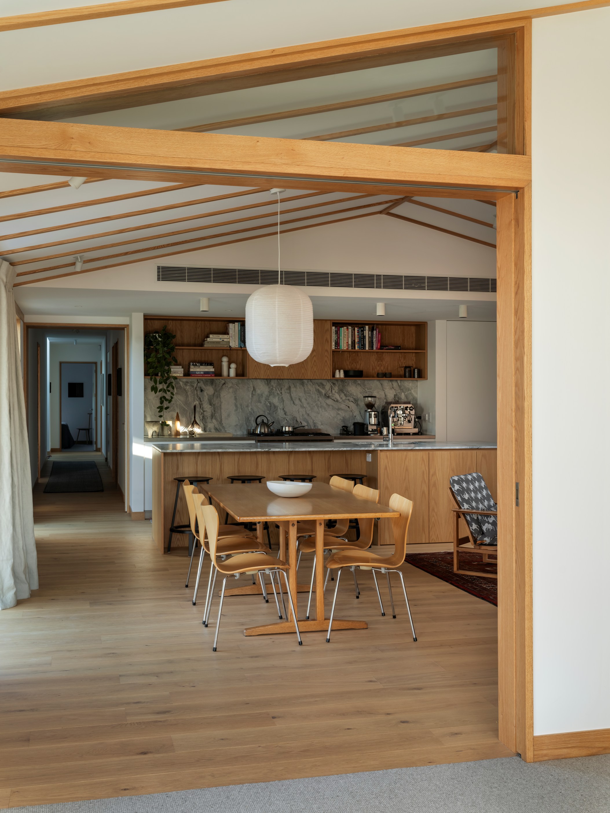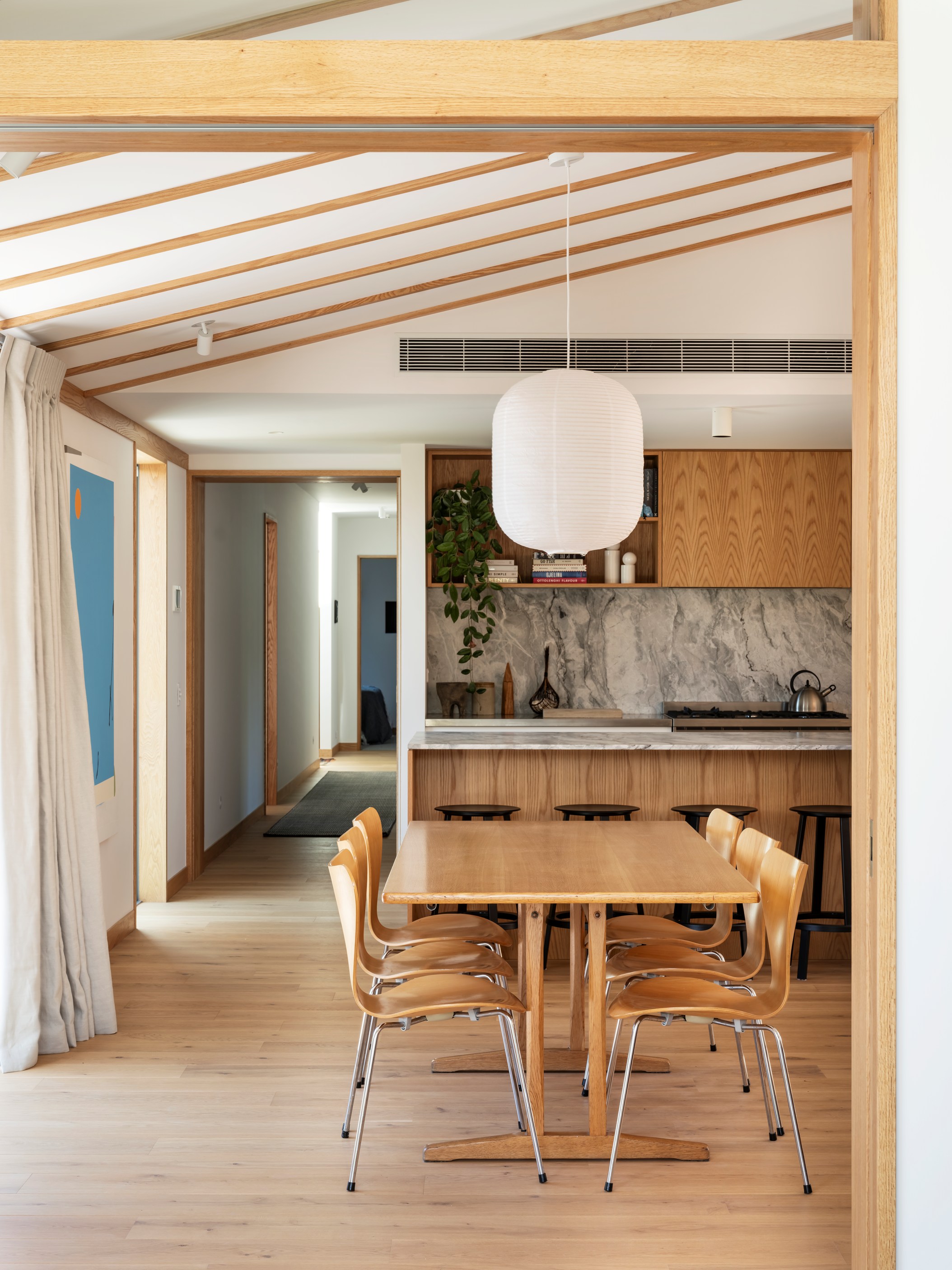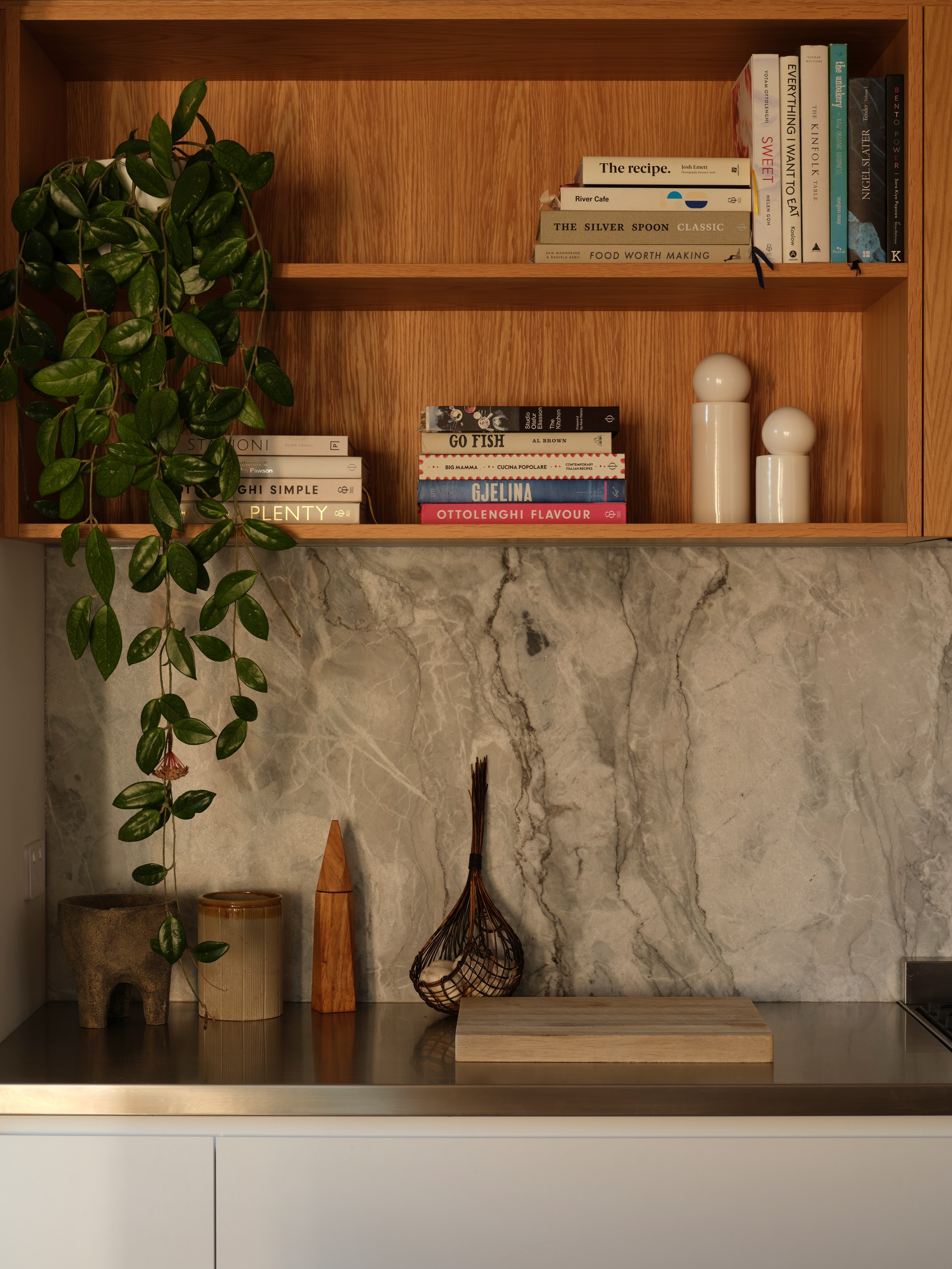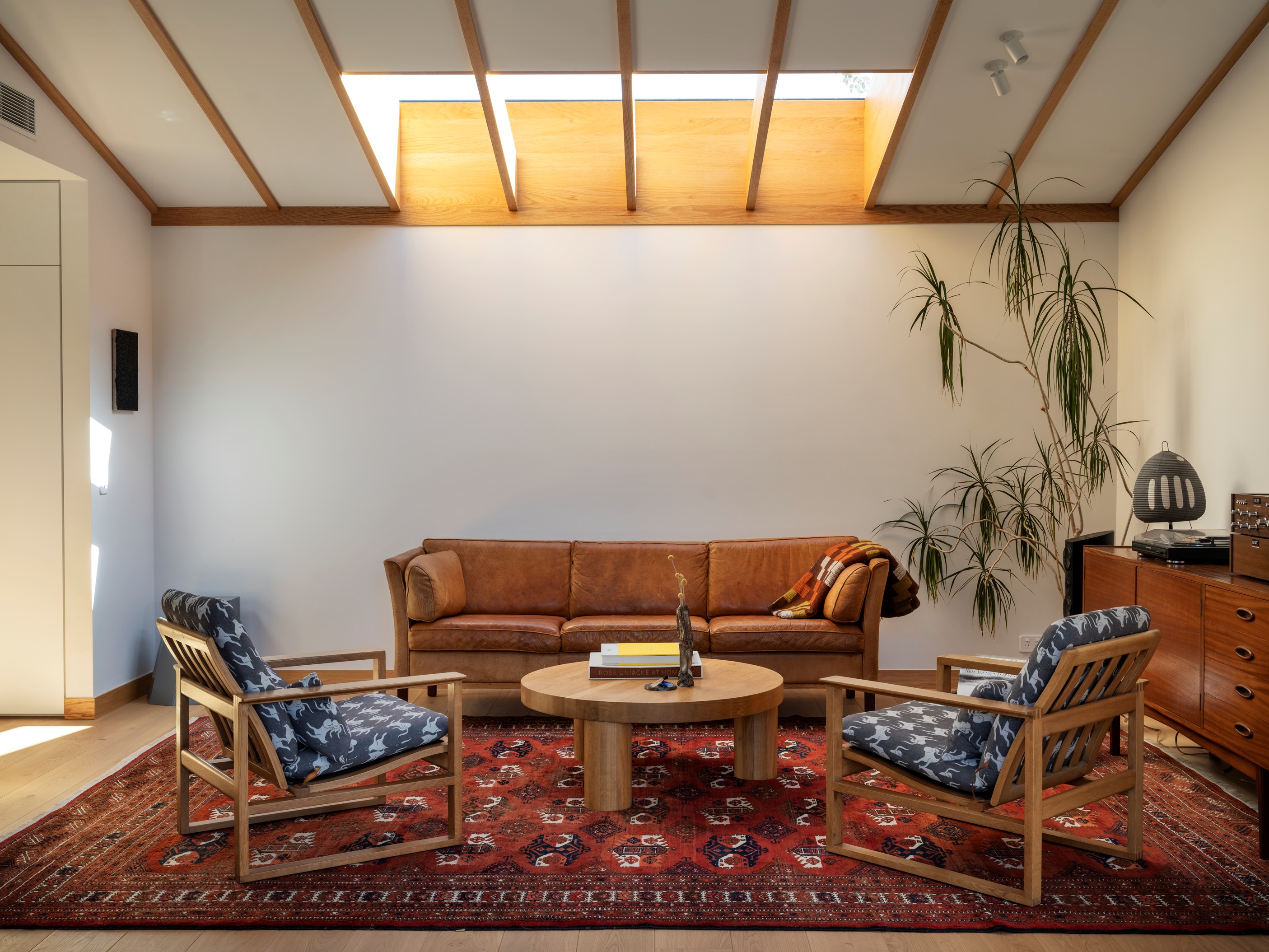 From the street, this brick-clad house looks smart, but you don’t appreciate the scale of what’s on offer here until you venture into the property. The four-bedroom home, influenced by the owners’ love of mid-century architecture, is long, low and undeniably lovely. To make the most of the long, narrow site, a single-gable offset floorplan was used, which had the advantage of creating side yards for sheltered outdoor areas. The gables also gave rise to pitched ceilings with timber battens in the living spaces, reinforcing the mid-century vibe. The white-and-wood interior is crammed full of pleasing details.