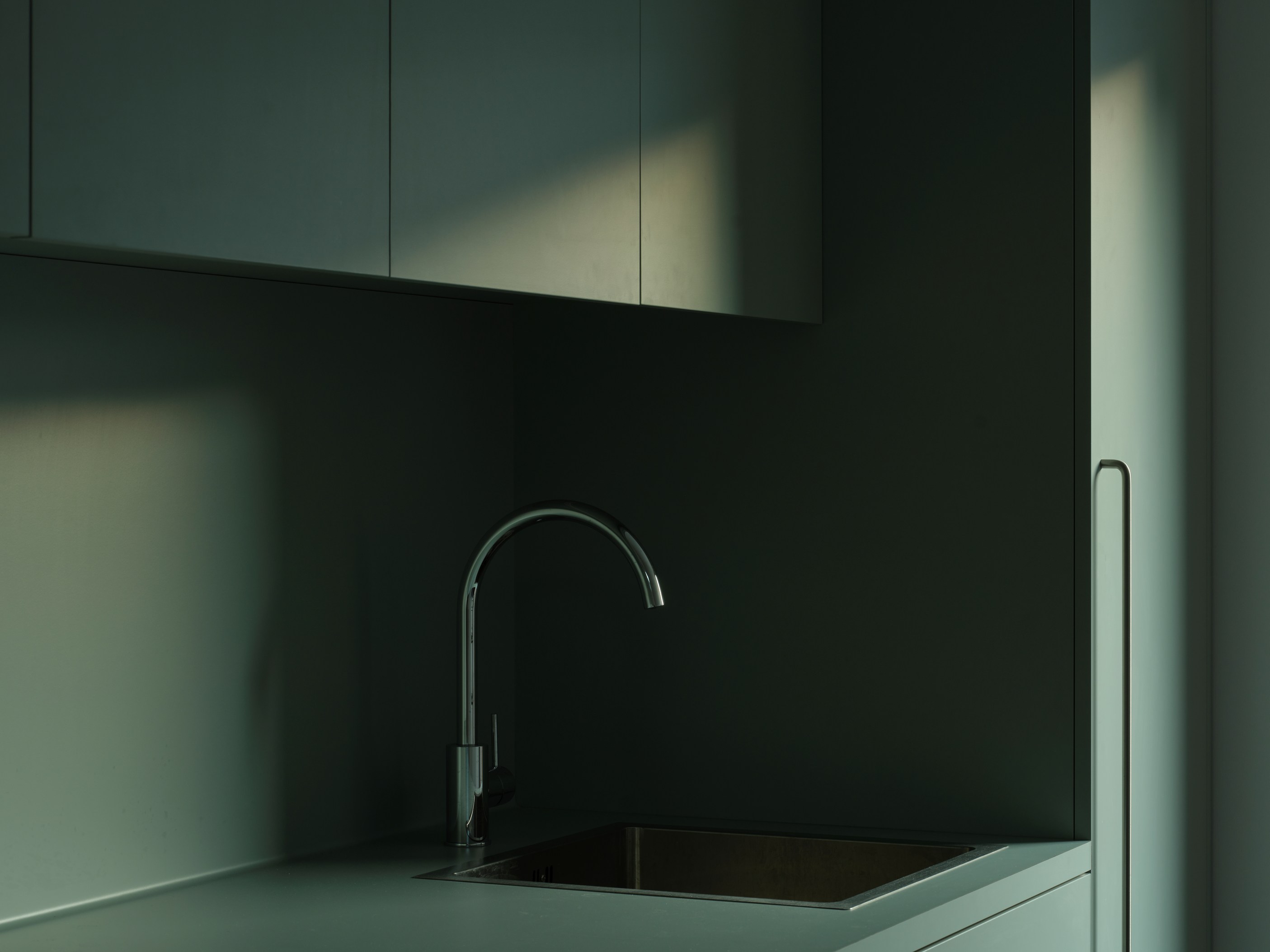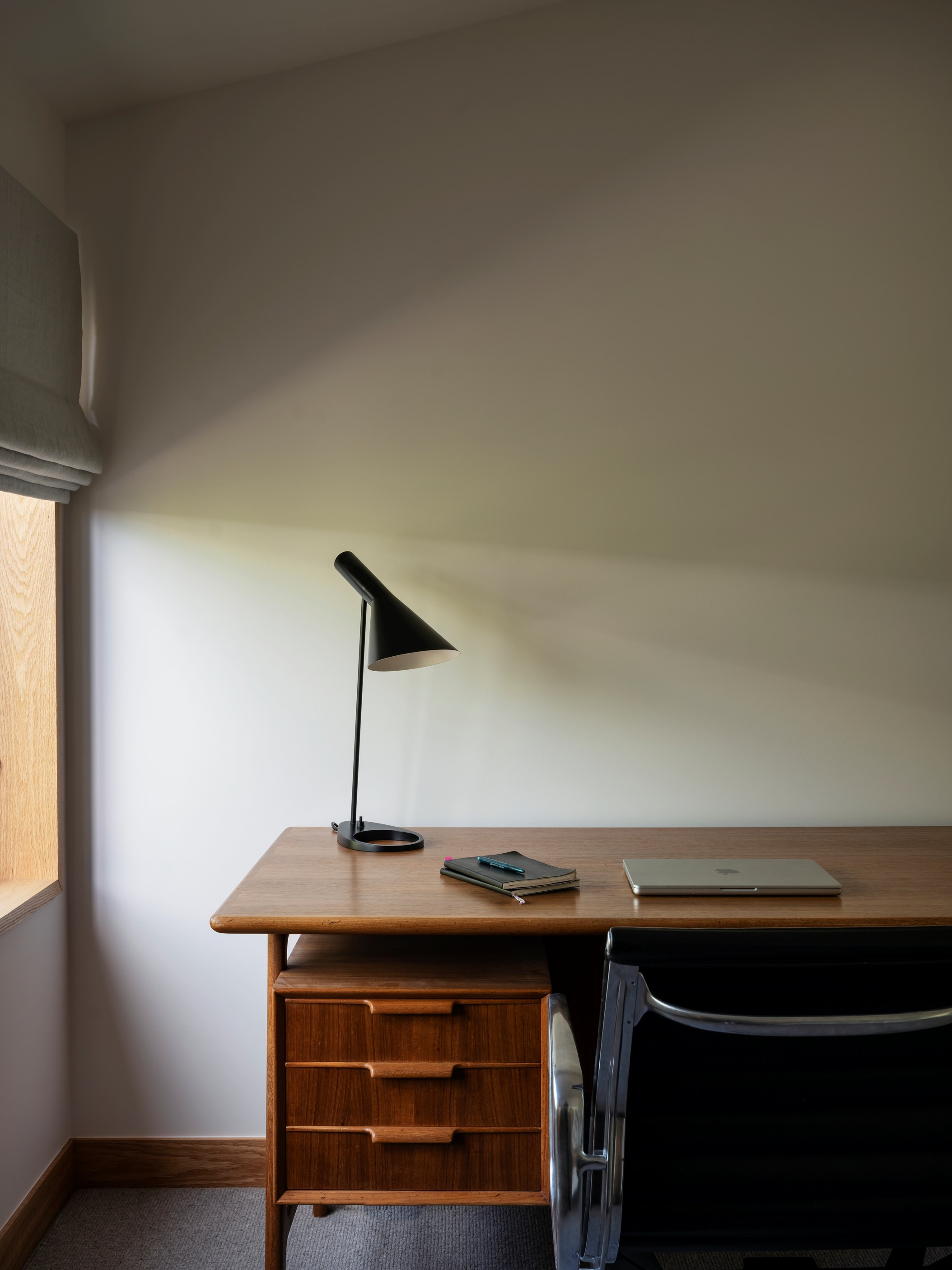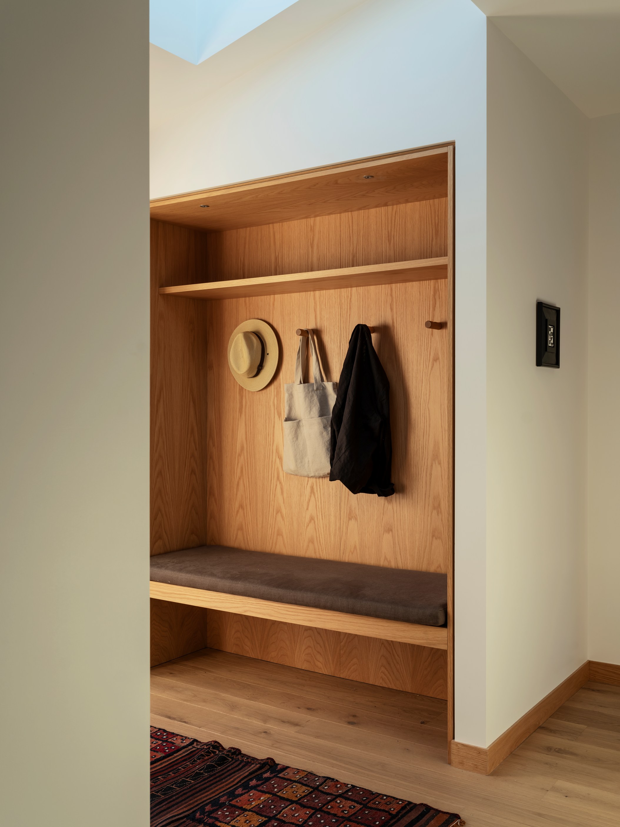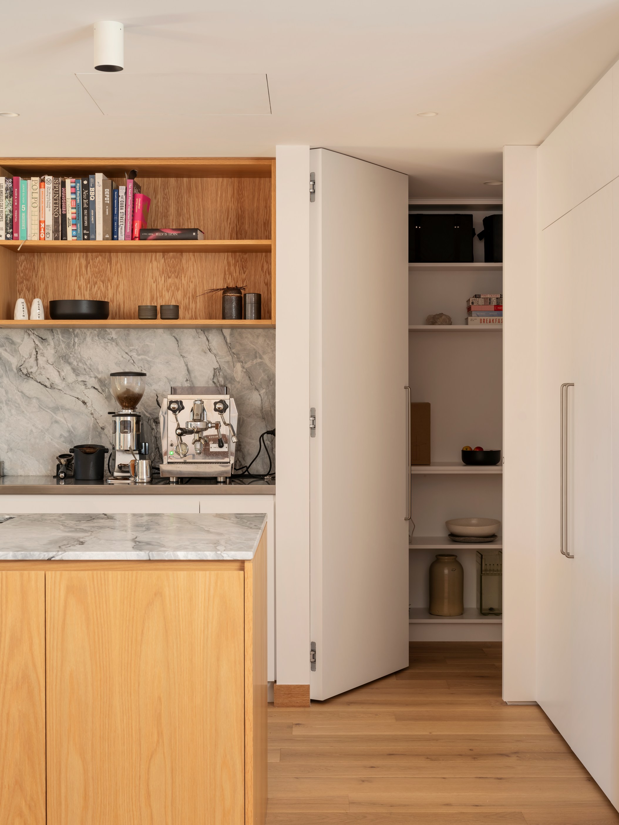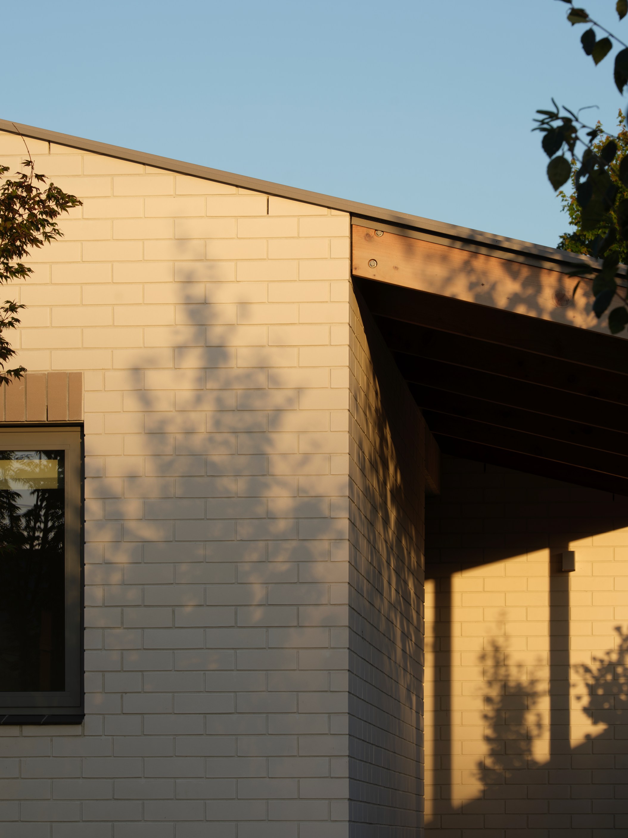 From the street, this brick-clad house looks smart, but you don’t appreciate the scale of what’s on offer here until you venture into the property. The four-bedroom home, influenced by the owners’ love of mid-century architecture, is long, low and undeniably lovely. To make the most of the long, narrow site, a single-gable offset floorplan was used, which had the advantage of creating side yards for sheltered outdoor areas. The gables also gave rise to pitched ceilings with timber battens in the living spaces, reinforcing the mid-century vibe. The white-and-wood interior is crammed full of pleasing details.