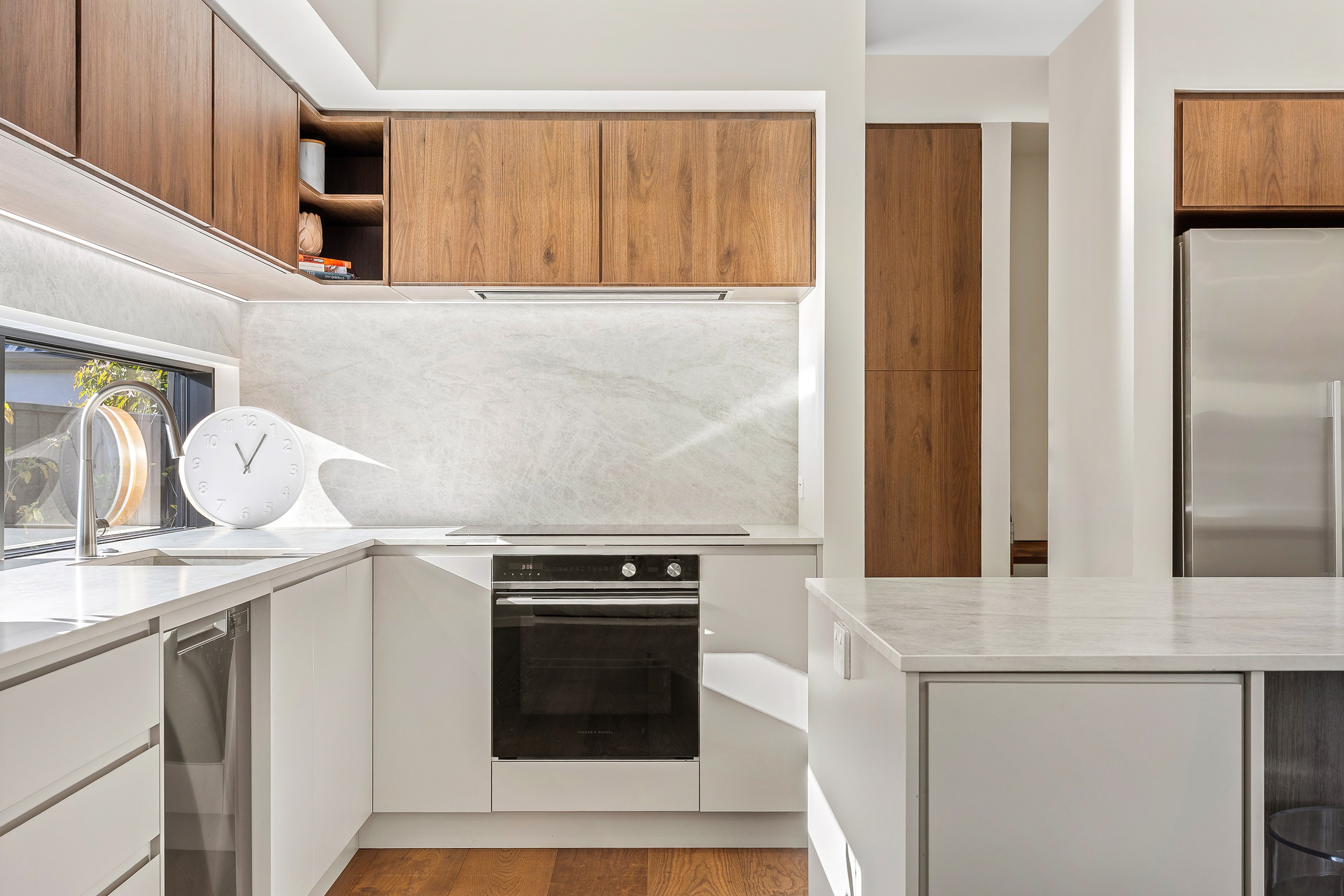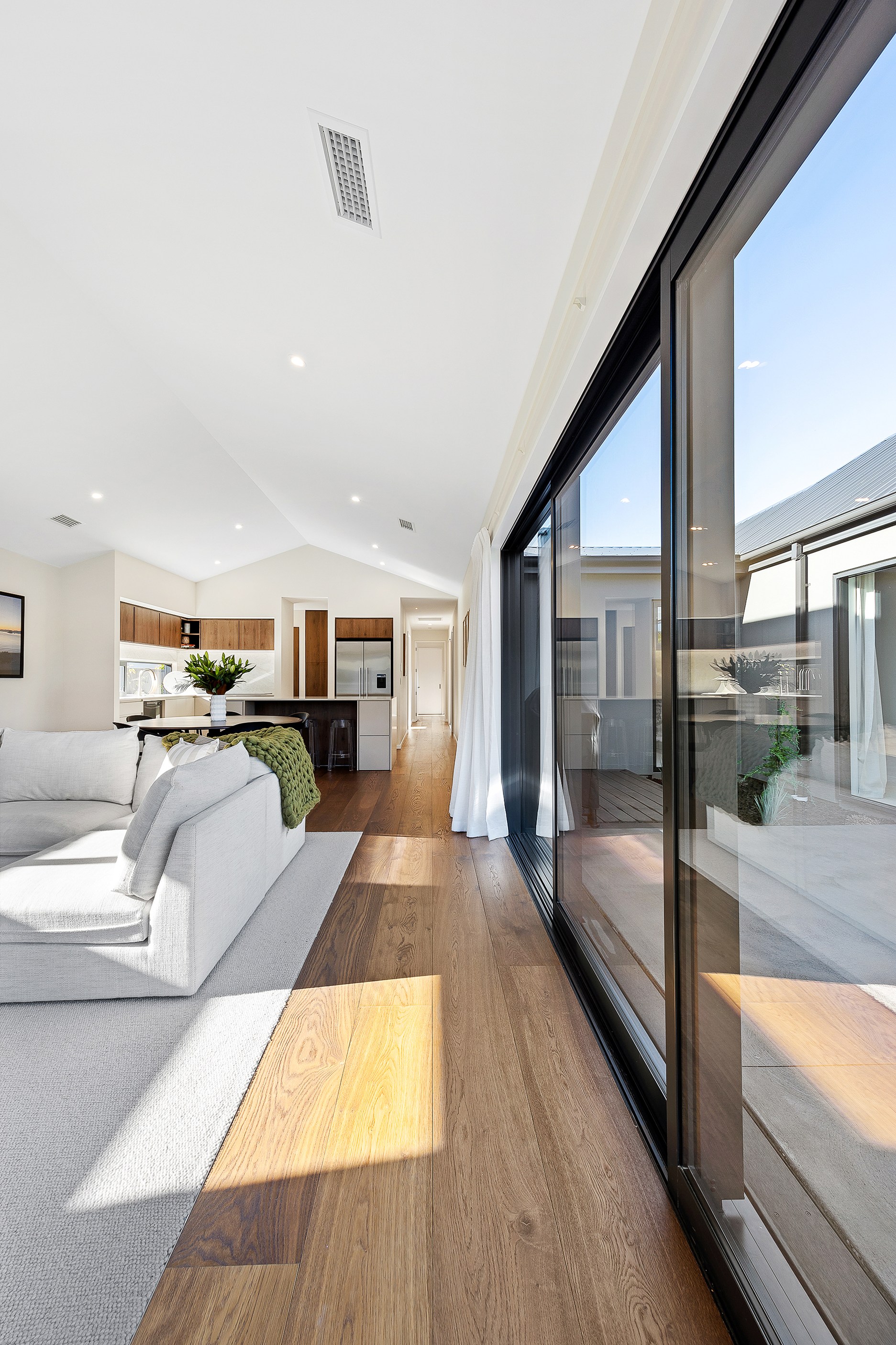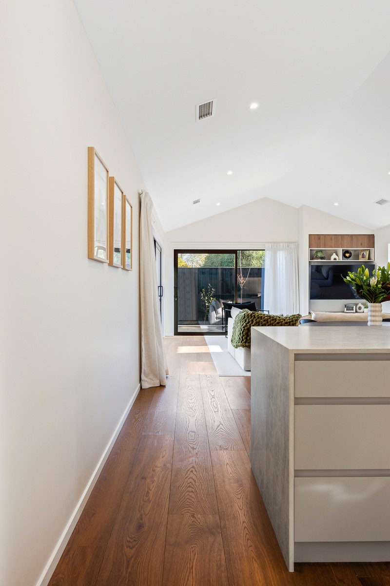 This thoughtfully designed 240sqm home strikes a confident balance between bold modernity and family warmth. From the street, deep-toned cladding and a sleek concrete-plaster finish create a strong architectural presence. But step inside and the mood softens. Earthy neutrals, natural textures and soft lighting work together to form a calm, cohesive interior that feels welcoming. Clever spatial planning allows for easy movement between the generous living areas, three bedrooms and a well-appointed master suite. A vaulted scissor-truss ceiling over the kitchen and living space lends volume and elegance, and sliding doors open onto a sunny, private courtyard.