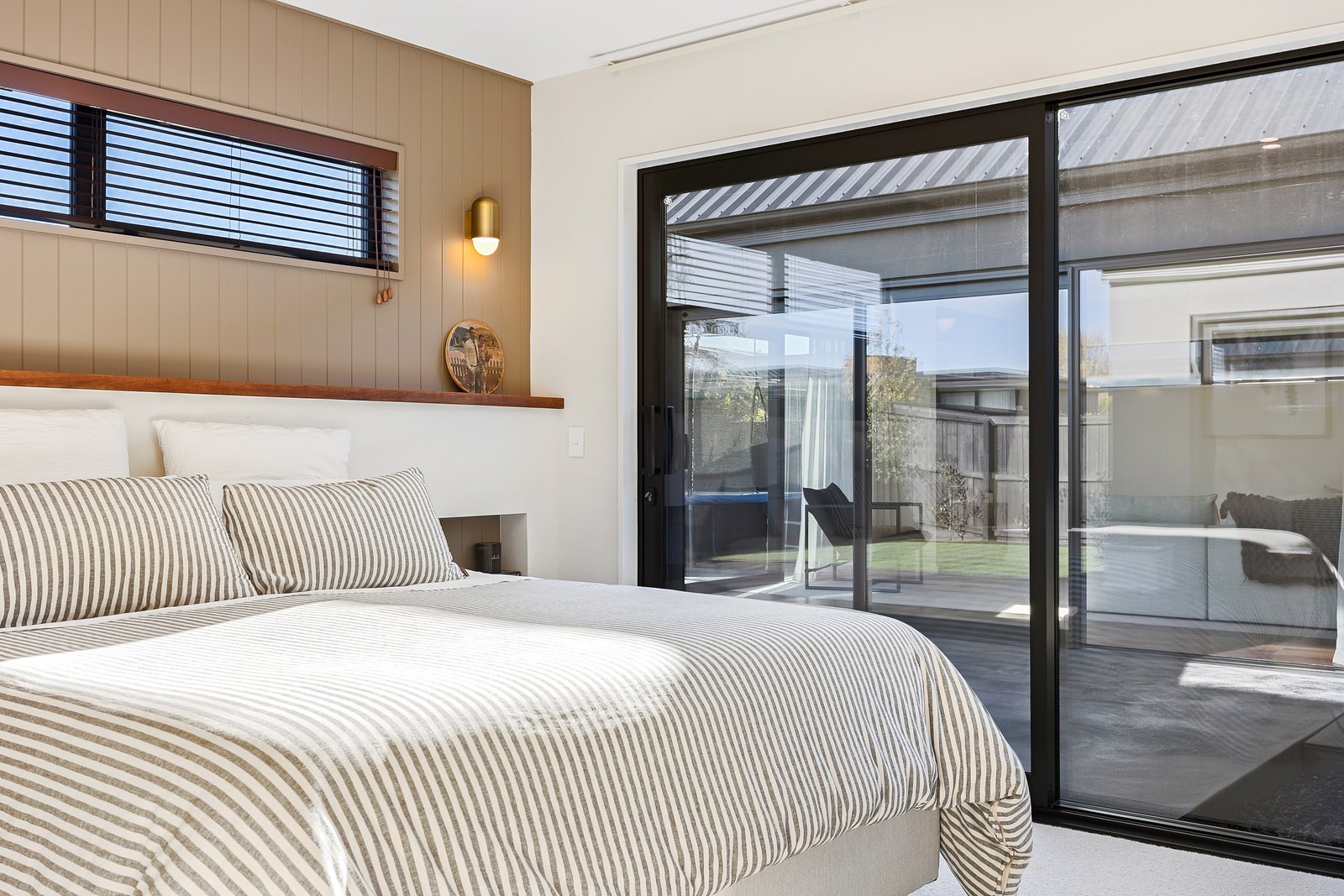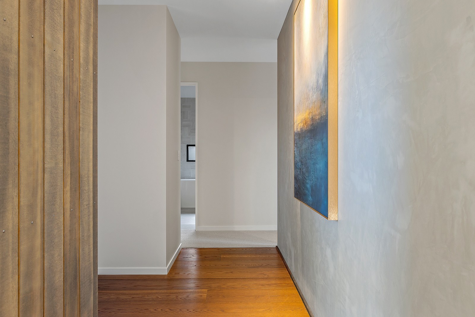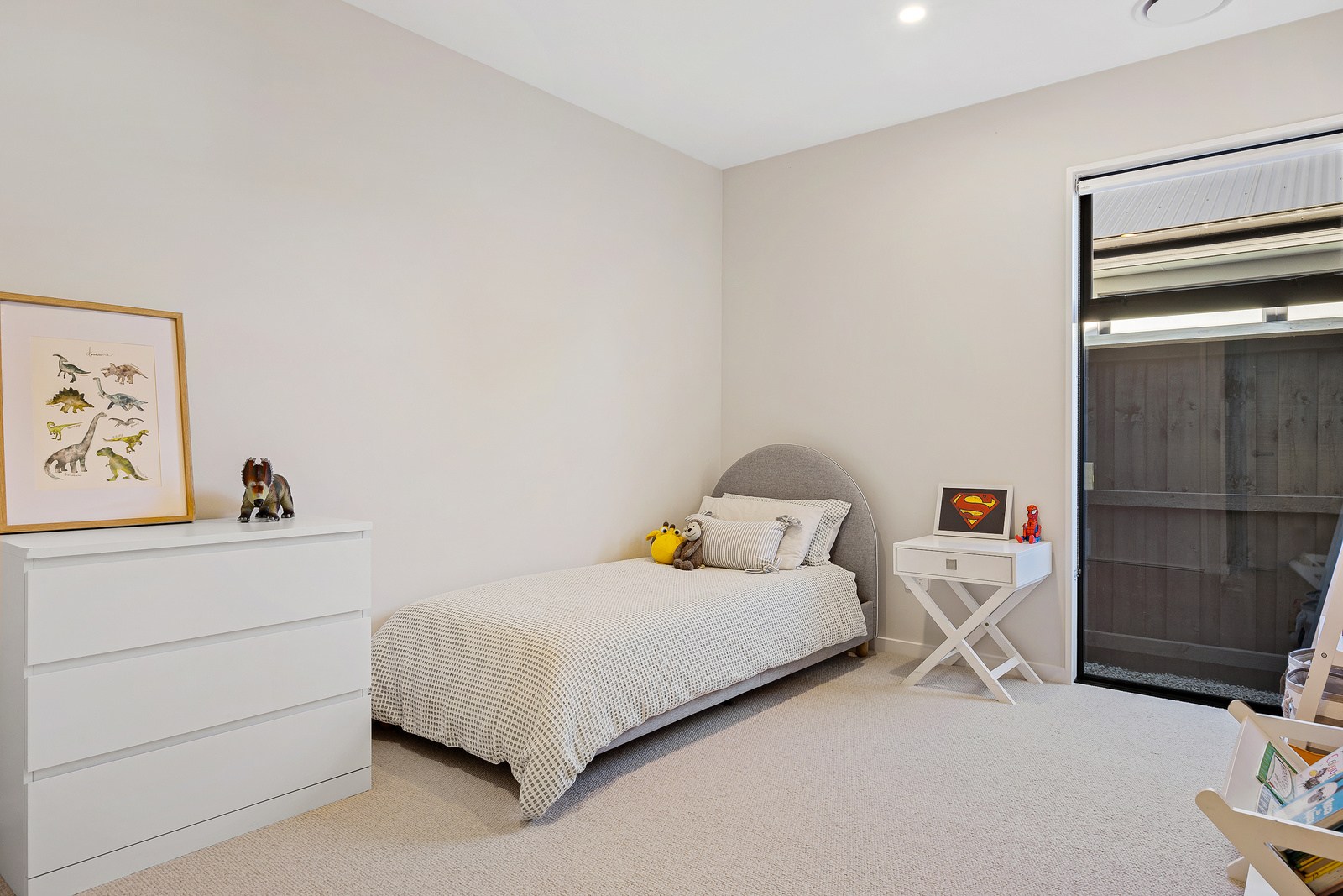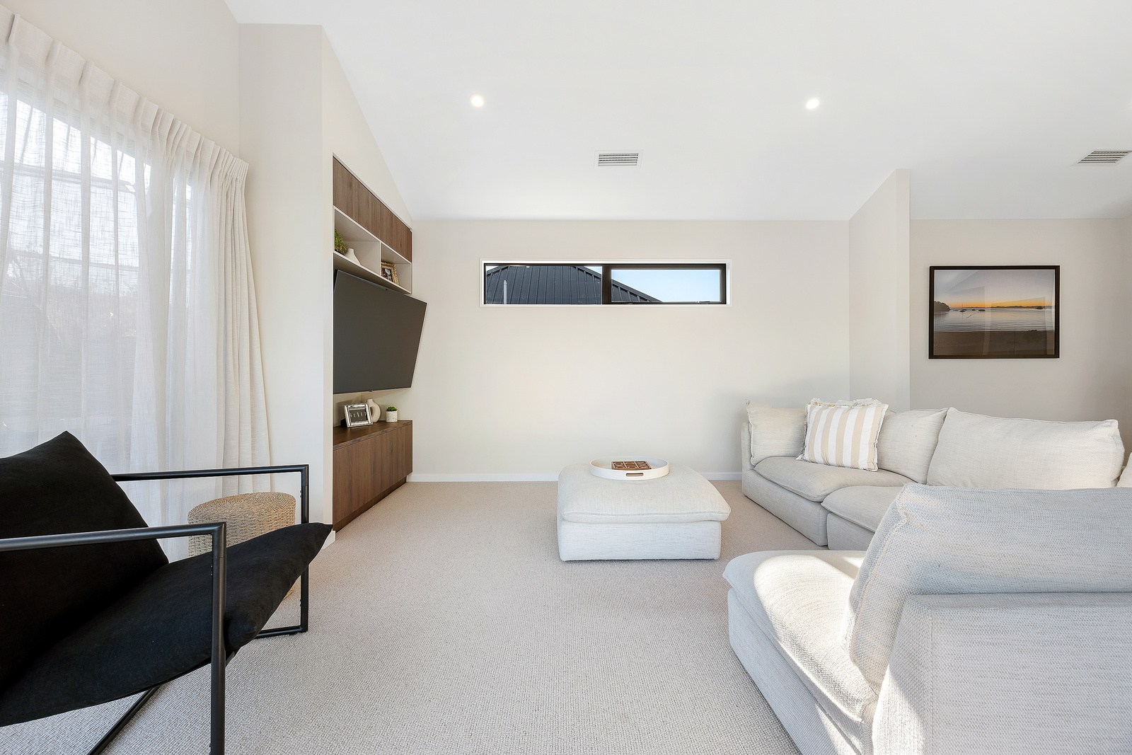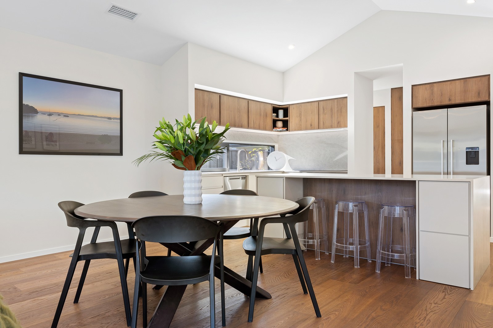 Continuity is key: timber flooring flows seamlessly through the living zones, whilst cabinetry and colour choices carry the same warm tones into every room. There’s elegance in the detailing (feature tiling in the bathrooms and a built-in headboard and bedside tables in the main bedroom), but it’s the functional customisation that really shines. A standout is the bespoke cloakroom and laundry, designed with five individual storage nooks to suit a busy household. Even the entryway makes a statement, continuing the external cladding indoors to blur the boundaries between inside and out. Every design choice feels intentional — creating a home truly fit for everyday life.