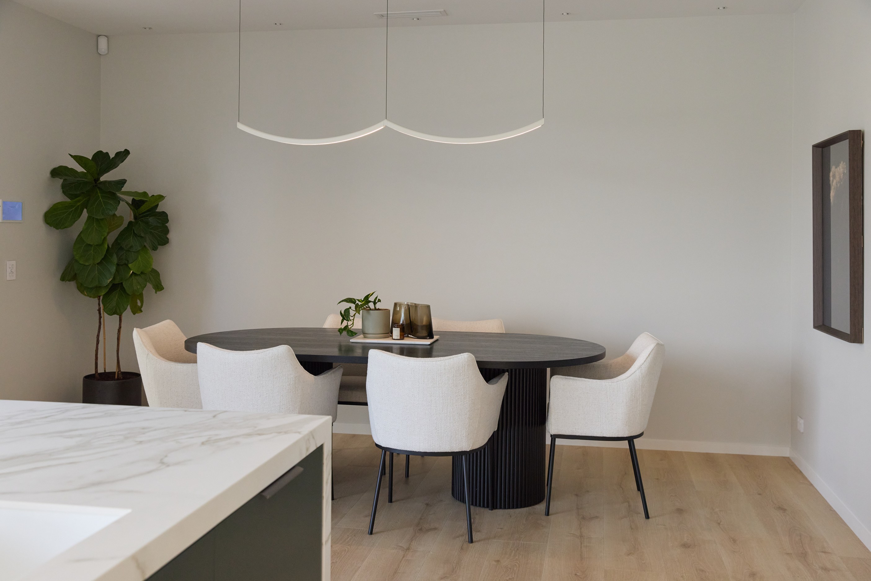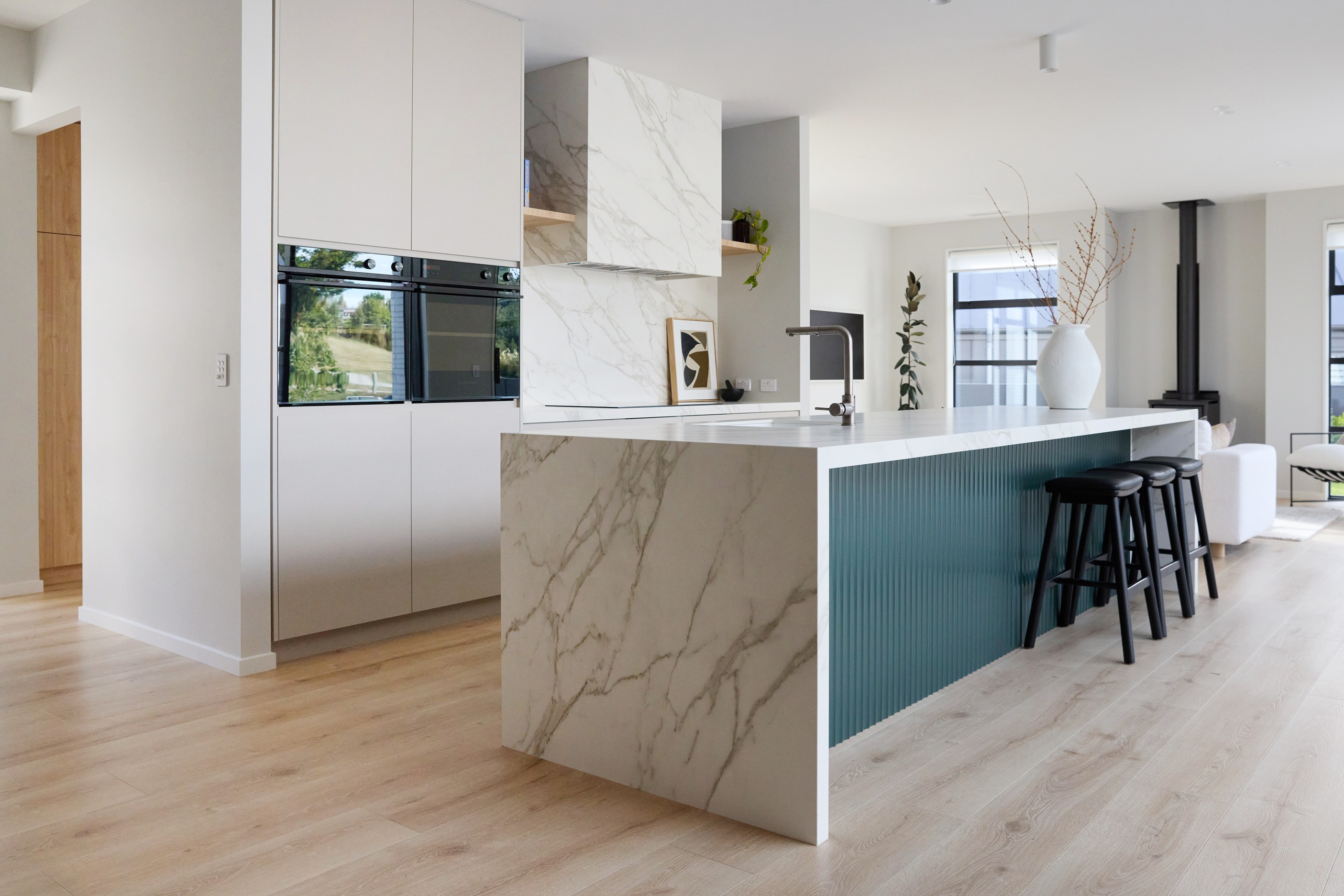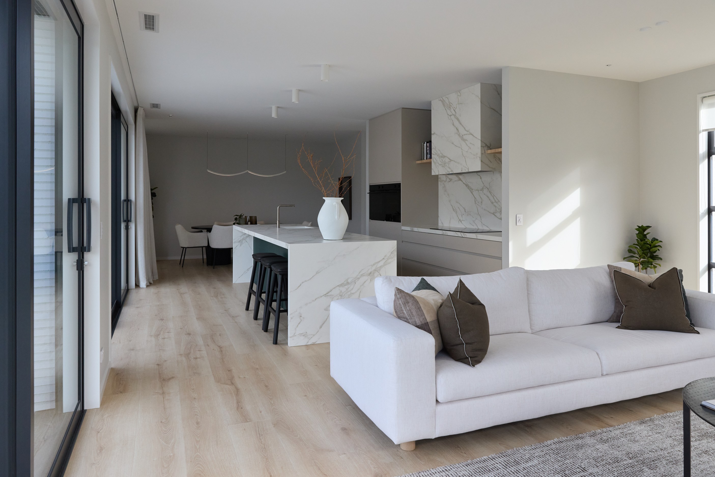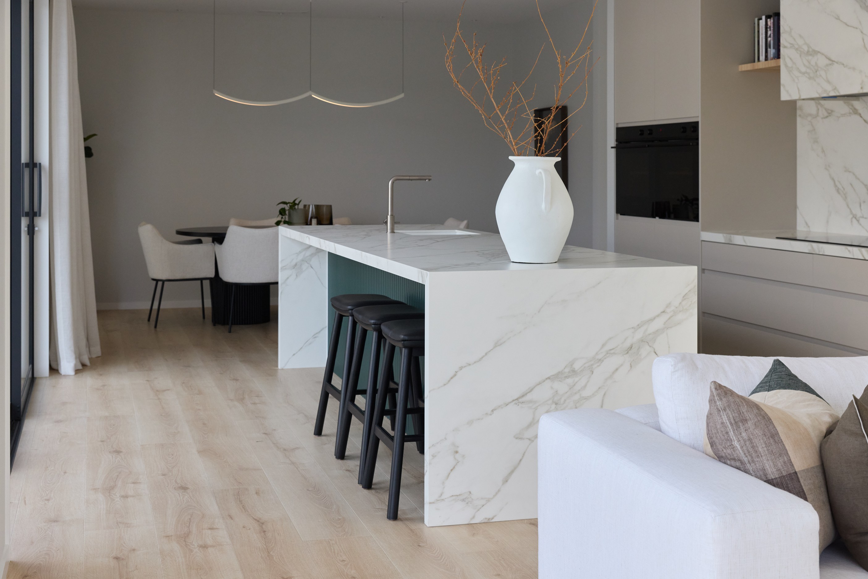 As well as four bedrooms, and the main suite with ensuite and dressing room, you’ll find a media room, family bathroom, powder room, office nook, scullery, laundry and double garage. The expansive communal space that flows between dining, kitchen and living has windows on both sides — another of bonus of the sun-trap, heat-absorbing floorplan. With such a focus on the courtyard, which is effectively the heart of the home, the decor is tastefully muted: think crisp white walls, marbled features, natural-toned tiles and timber floorboards. That’s not to say that the interior is completely neutral. You’ll find sage green fronting the kitchen island and the reeded feature wall in the moody media room. You’ll see evidence of craftsmanship wherever you turn, too. Turns out, H also stands for heavenly.