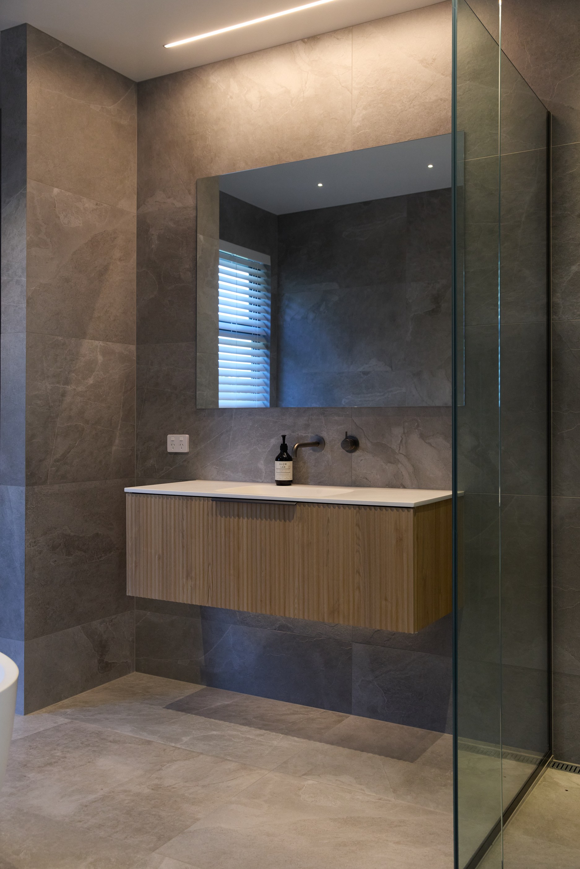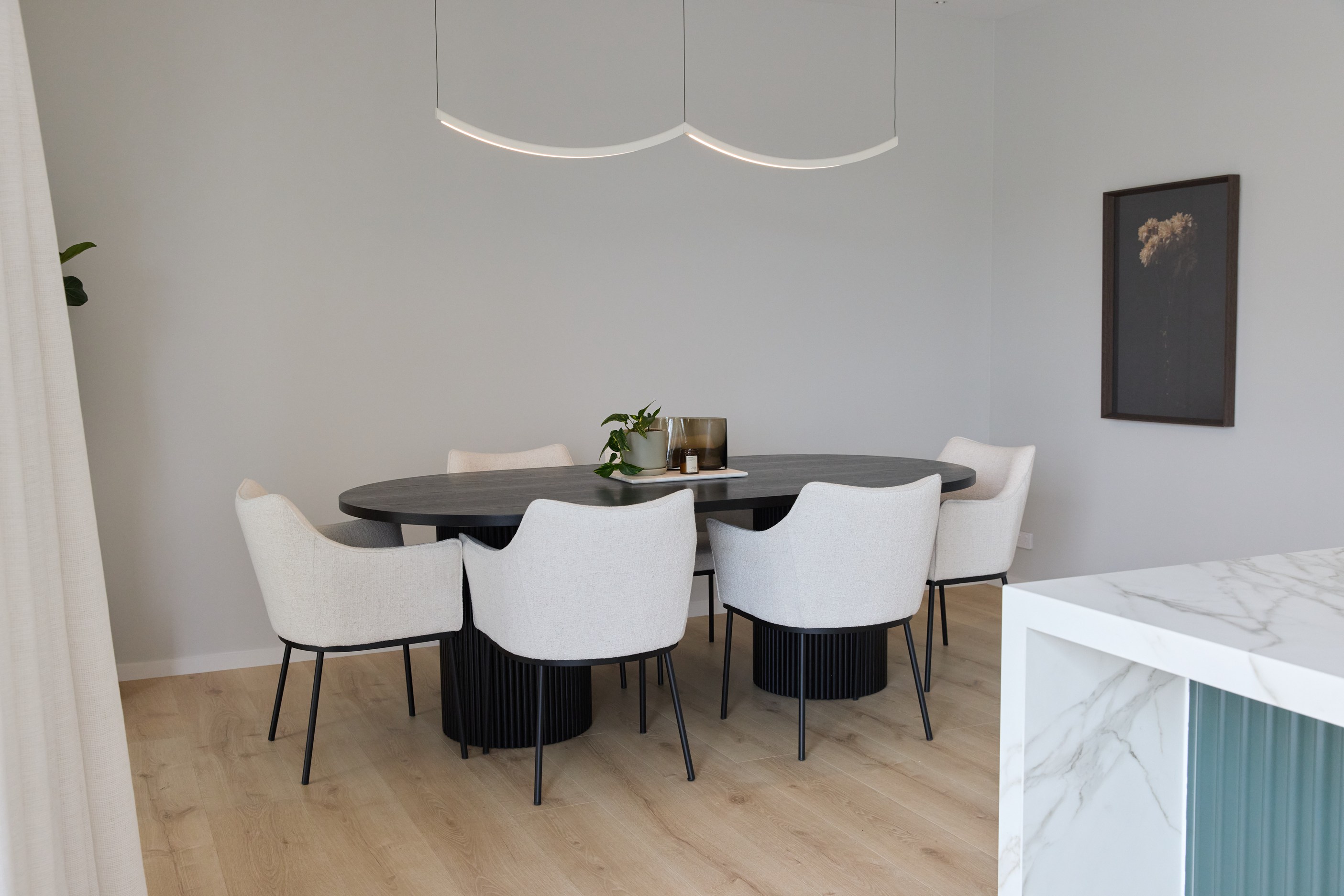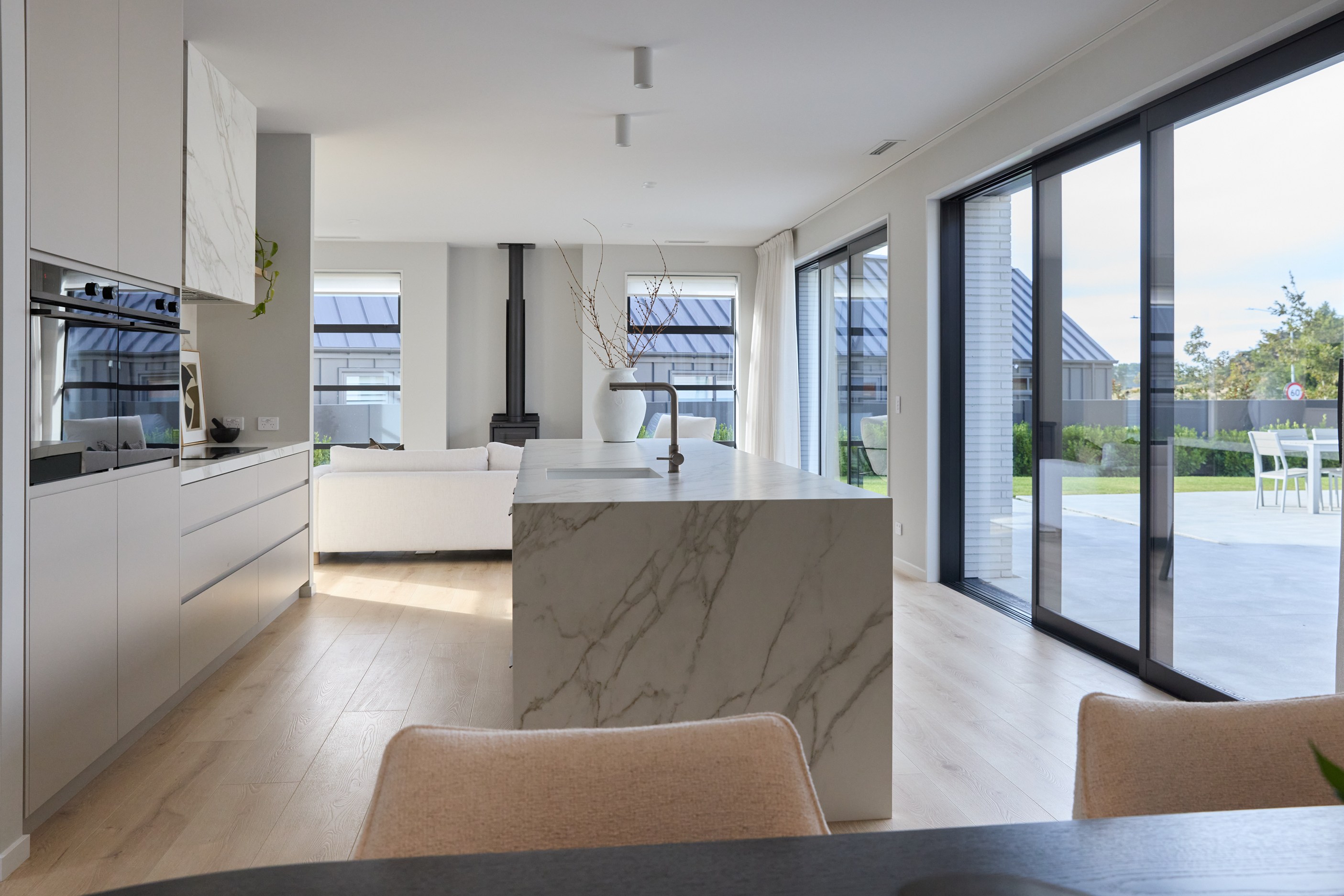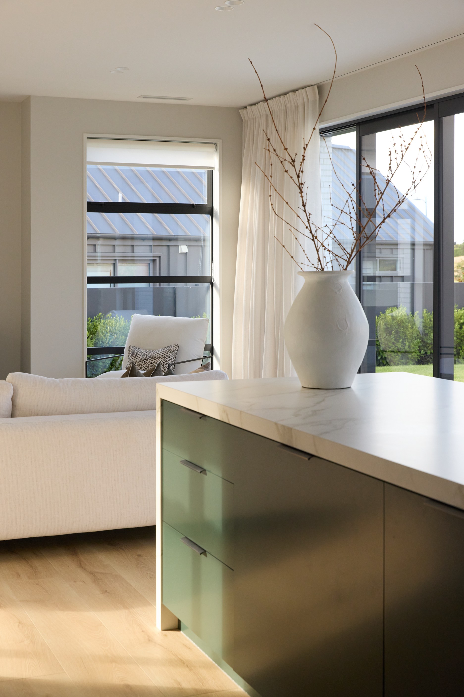 As well as four bedrooms, and the main suite with ensuite and dressing room, you’ll find a media room, family bathroom, powder room, office nook, scullery, laundry and double garage. The expansive communal space that flows between dining, kitchen and living has windows on both sides — another of bonus of the sun-trap, heat-absorbing floorplan. With such a focus on the courtyard, which is effectively the heart of the home, the decor is tastefully muted: think crisp white walls, marbled features, natural-toned tiles and timber floorboards. That’s not to say that the interior is completely neutral. You’ll find sage green fronting the kitchen island and the reeded feature wall in the moody media room. You’ll see evidence of craftsmanship wherever you turn, too. Turns out, H also stands for heavenly.