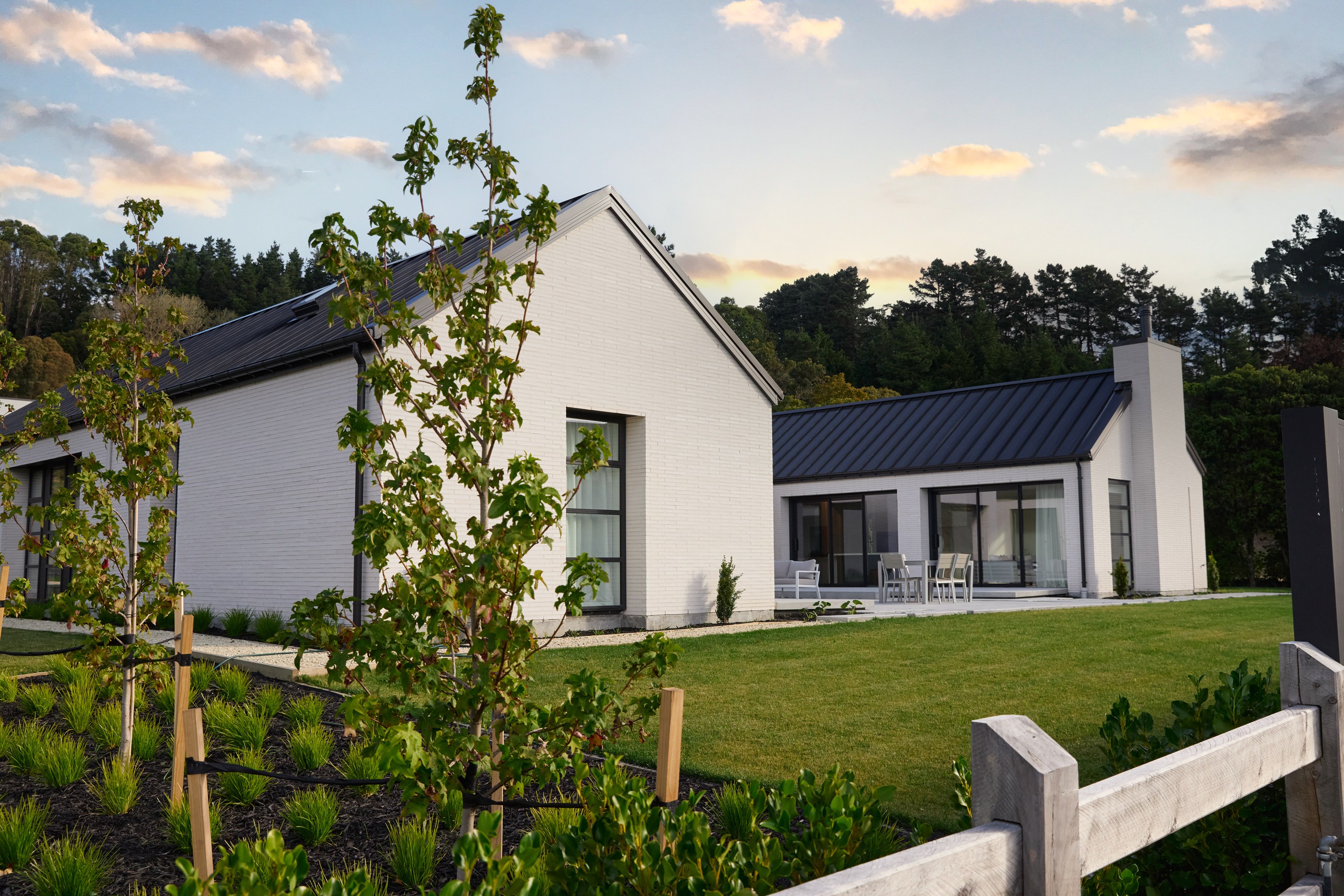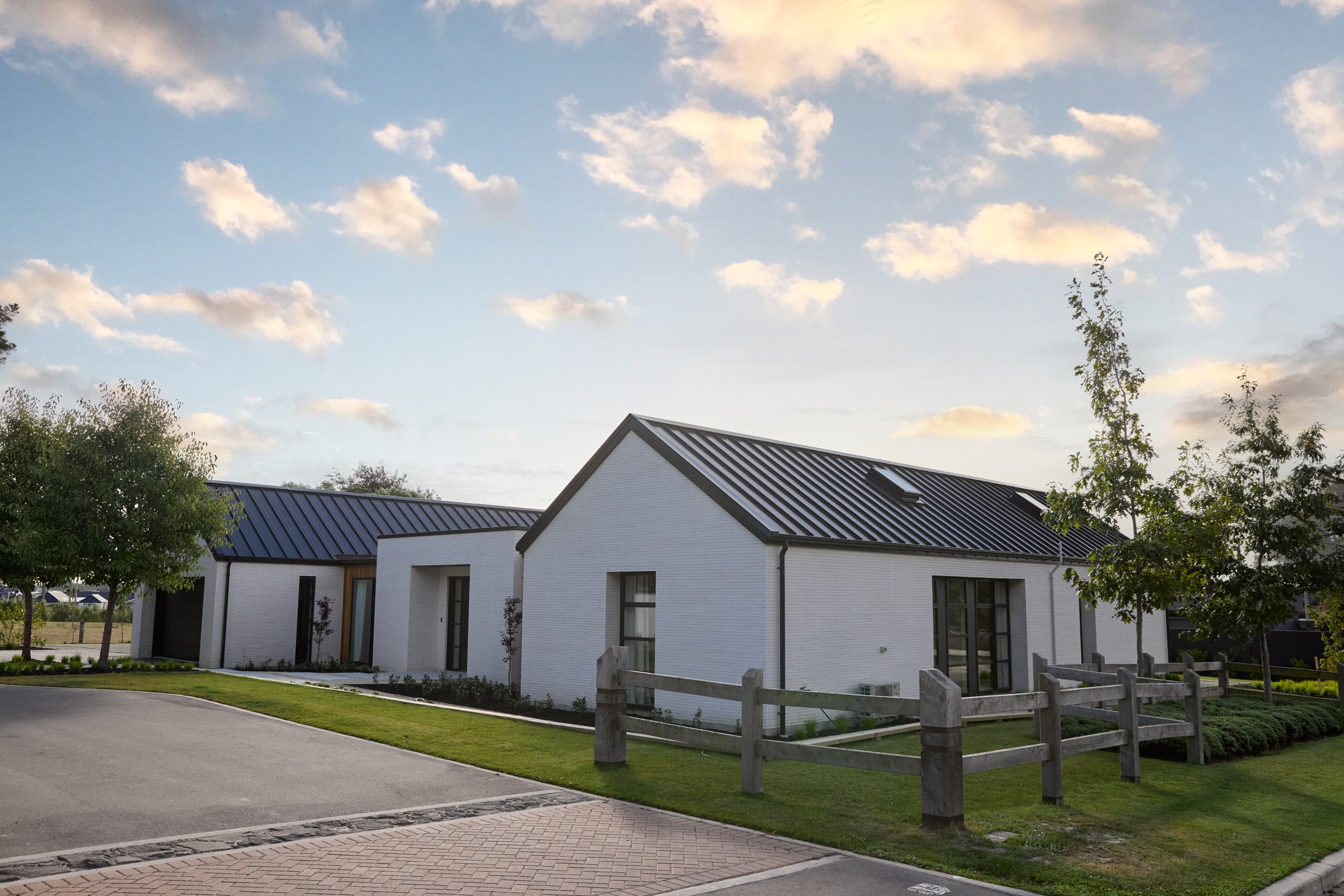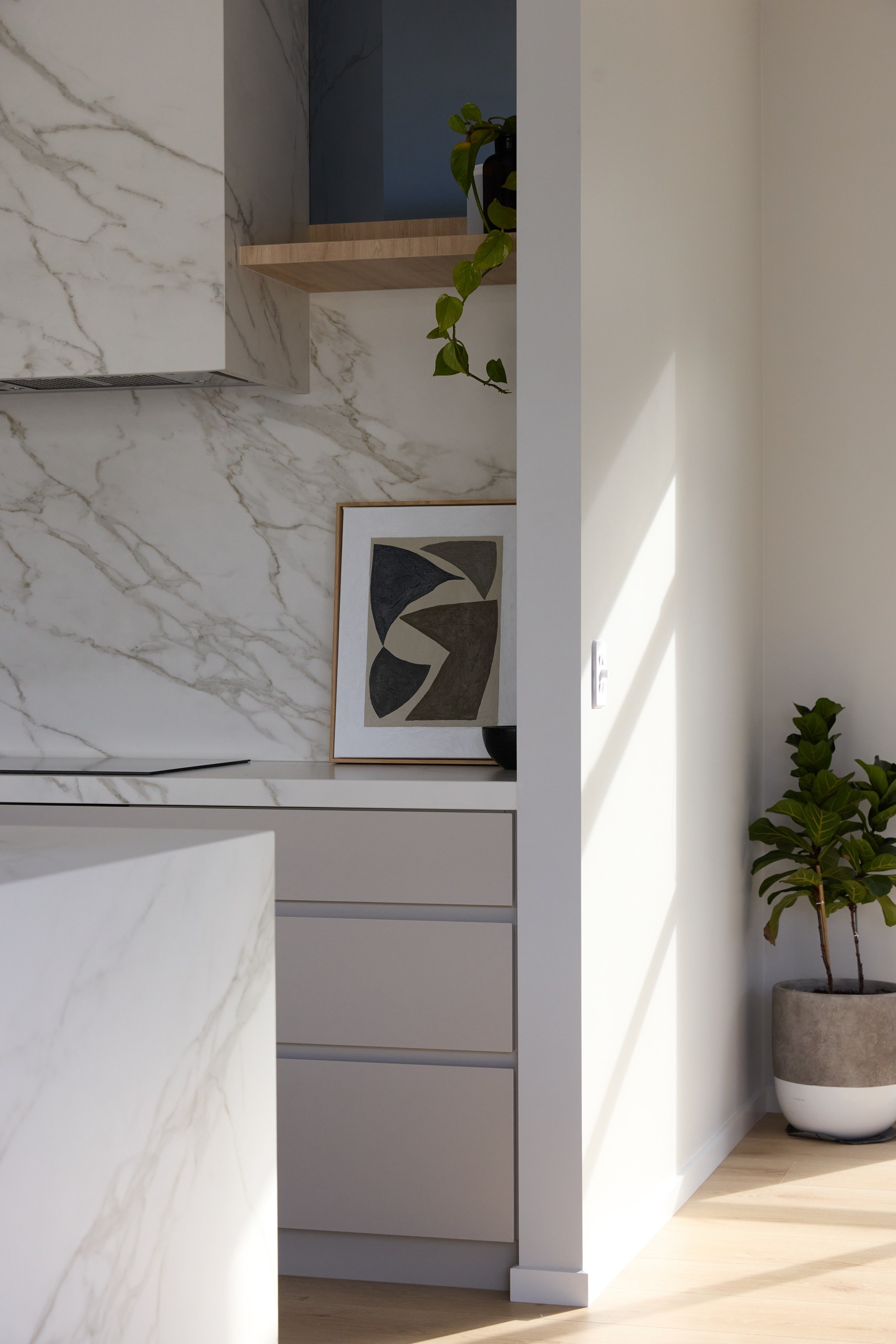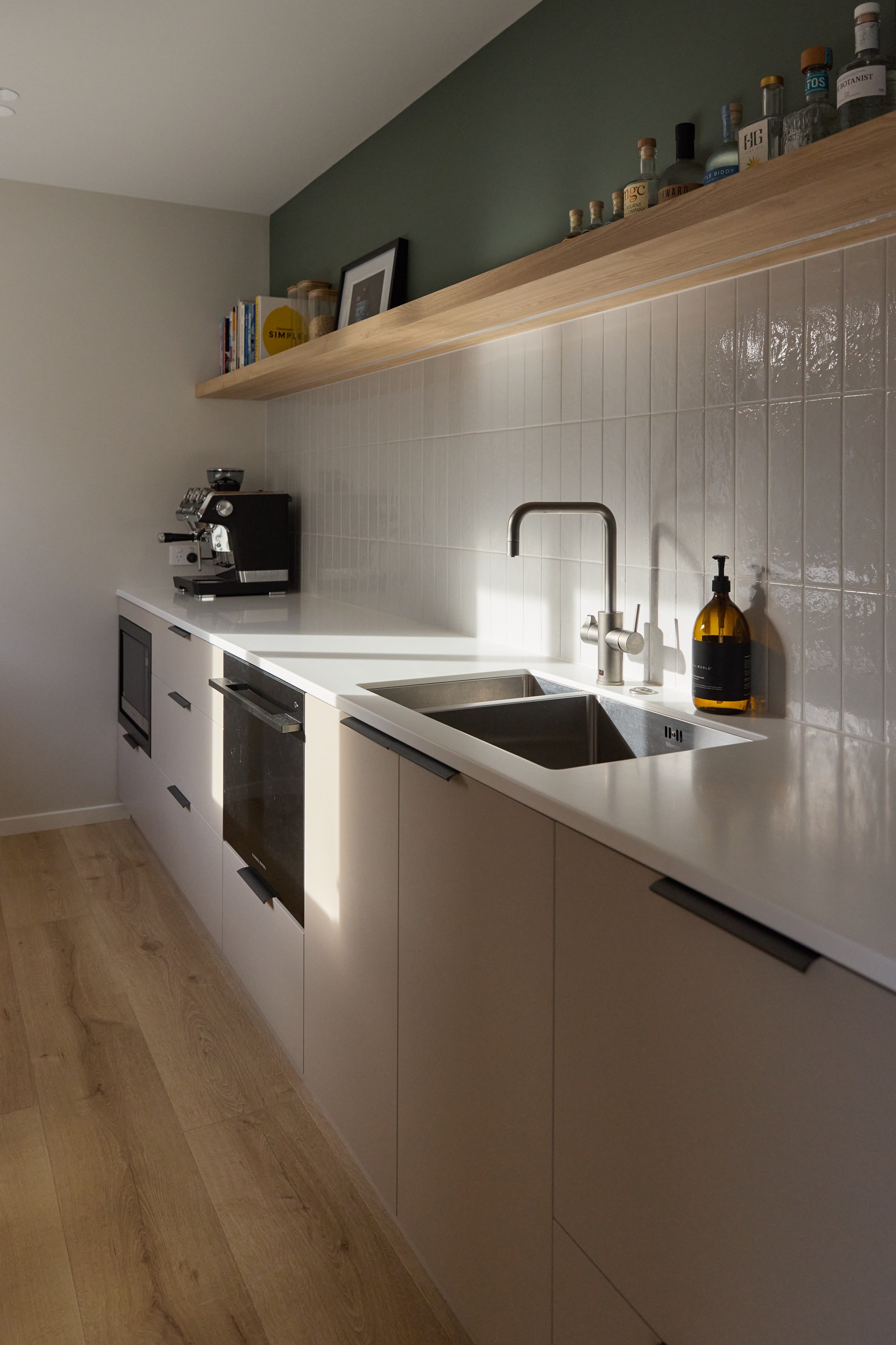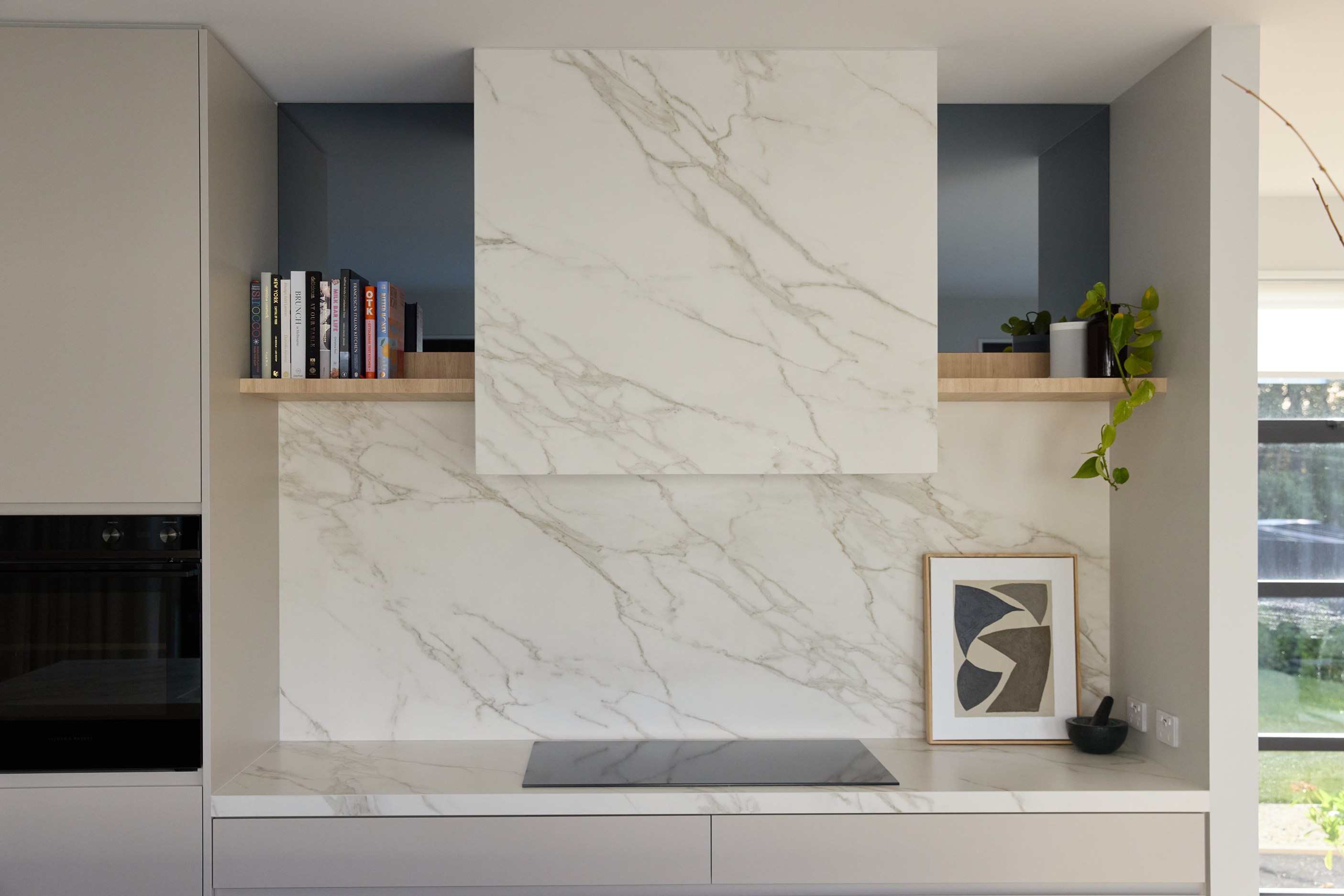 As well as four bedrooms, and the main suite with ensuite and dressing room, you’ll find a media room, family bathroom, powder room, office nook, scullery, laundry and double garage. The expansive communal space that flows between dining, kitchen and living has windows on both sides — another of bonus of the sun-trap, heat-absorbing floorplan. With such a focus on the courtyard, which is effectively the heart of the home, the decor is tastefully muted: think crisp white walls, marbled features, natural-toned tiles and timber floorboards. That’s not to say that the interior is completely neutral. You’ll find sage green fronting the kitchen island and the reeded feature wall in the moody media room. You’ll see evidence of craftsmanship wherever you turn, too. Turns out, H also stands for heavenly.
