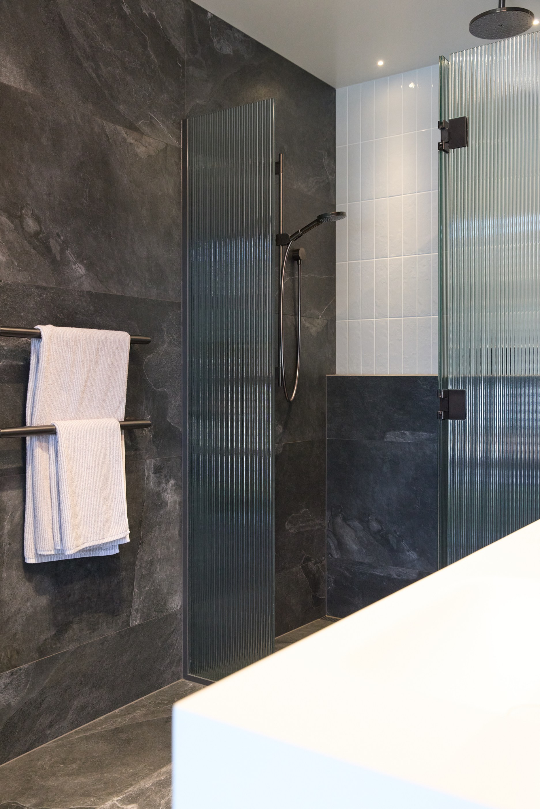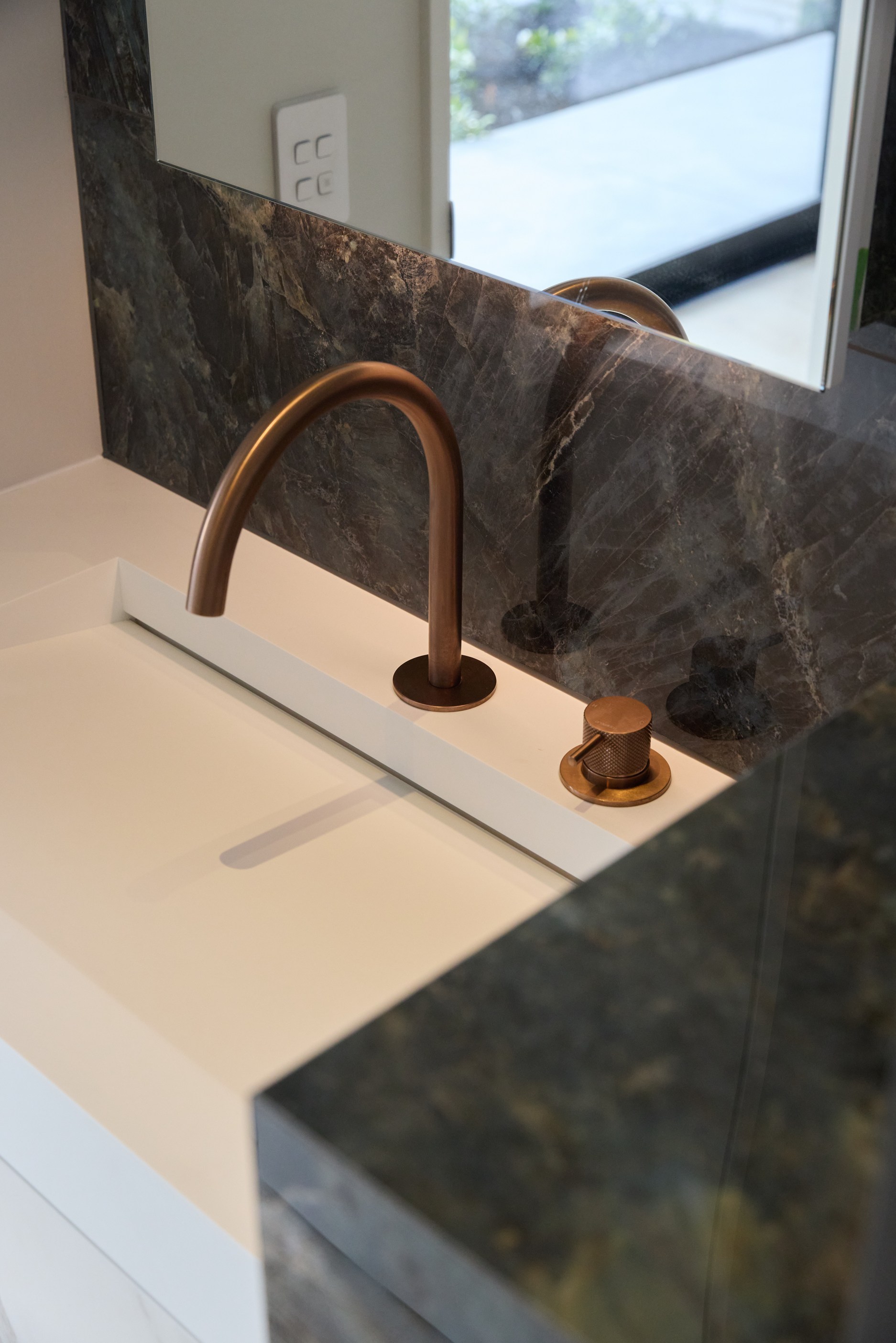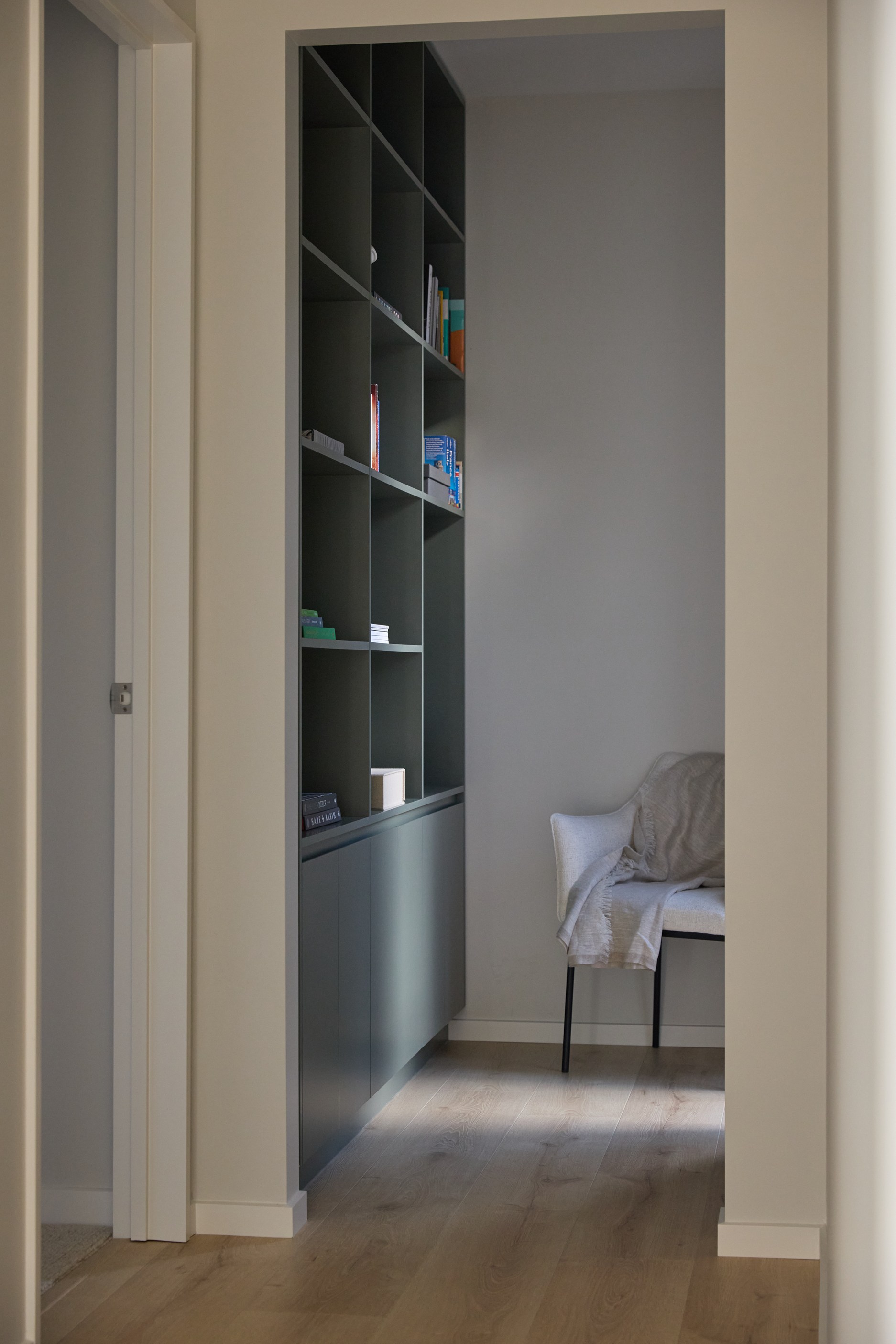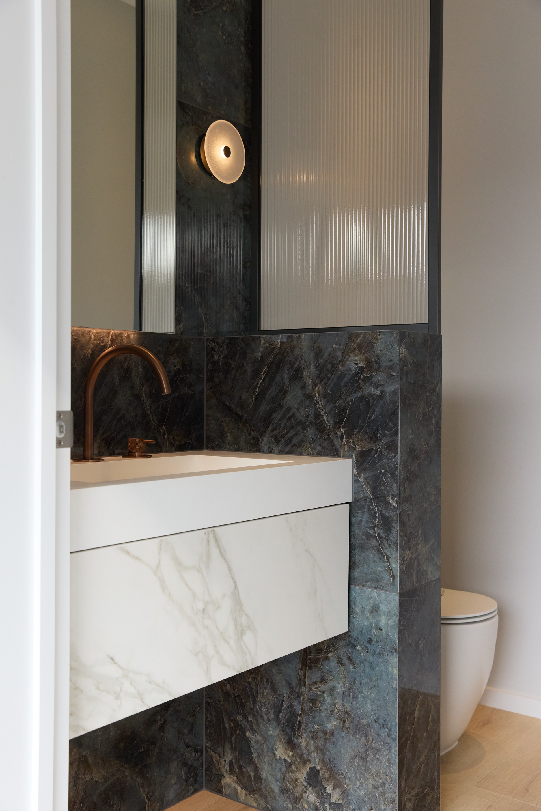 As well as four bedrooms, and the main suite with ensuite and dressing room, you’ll find a media room, family bathroom, powder room, office nook, scullery, laundry and double garage. The expansive communal space that flows between dining, kitchen and living has windows on both sides — another of bonus of the sun-trap, heat-absorbing floorplan. With such a focus on the courtyard, which is effectively the heart of the home, the decor is tastefully muted: think crisp white walls, marbled features, natural-toned tiles and timber floorboards. That’s not to say that the interior is completely neutral. You’ll find sage green fronting the kitchen island and the reeded feature wall in the moody media room. You’ll see evidence of craftsmanship wherever you turn, too. Turns out, H also stands for heavenly.