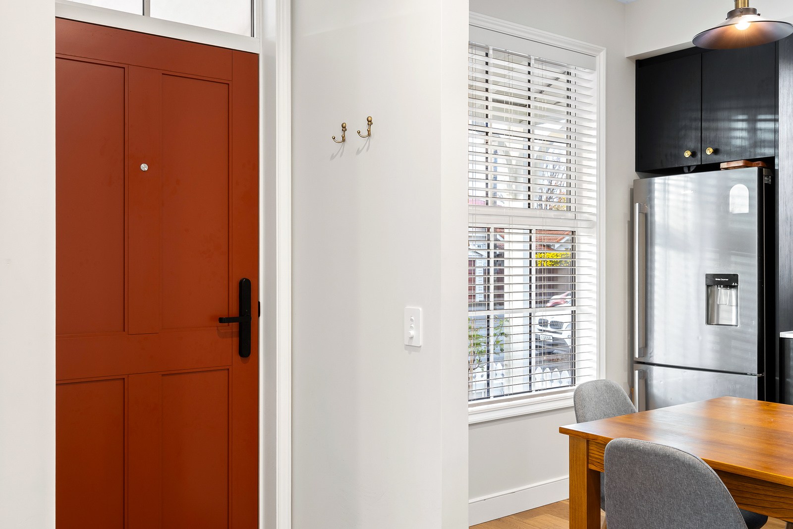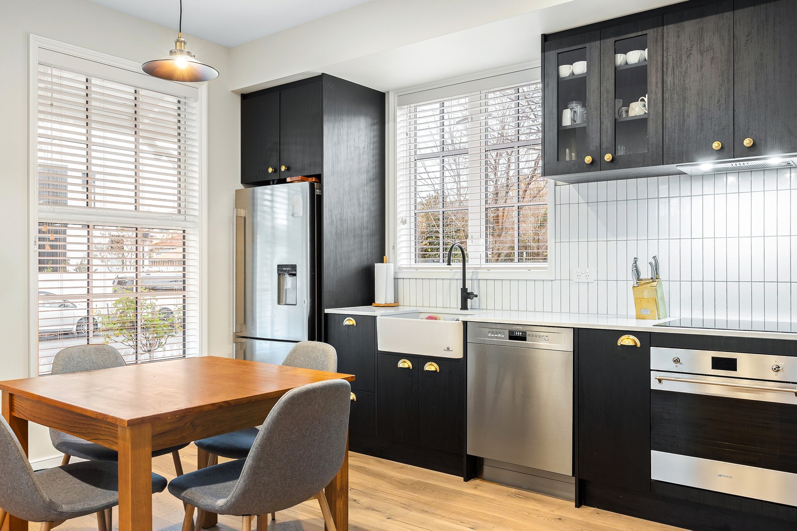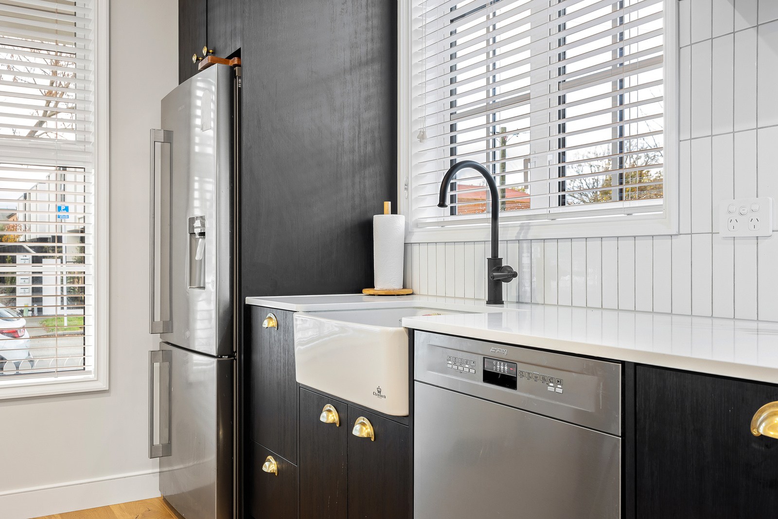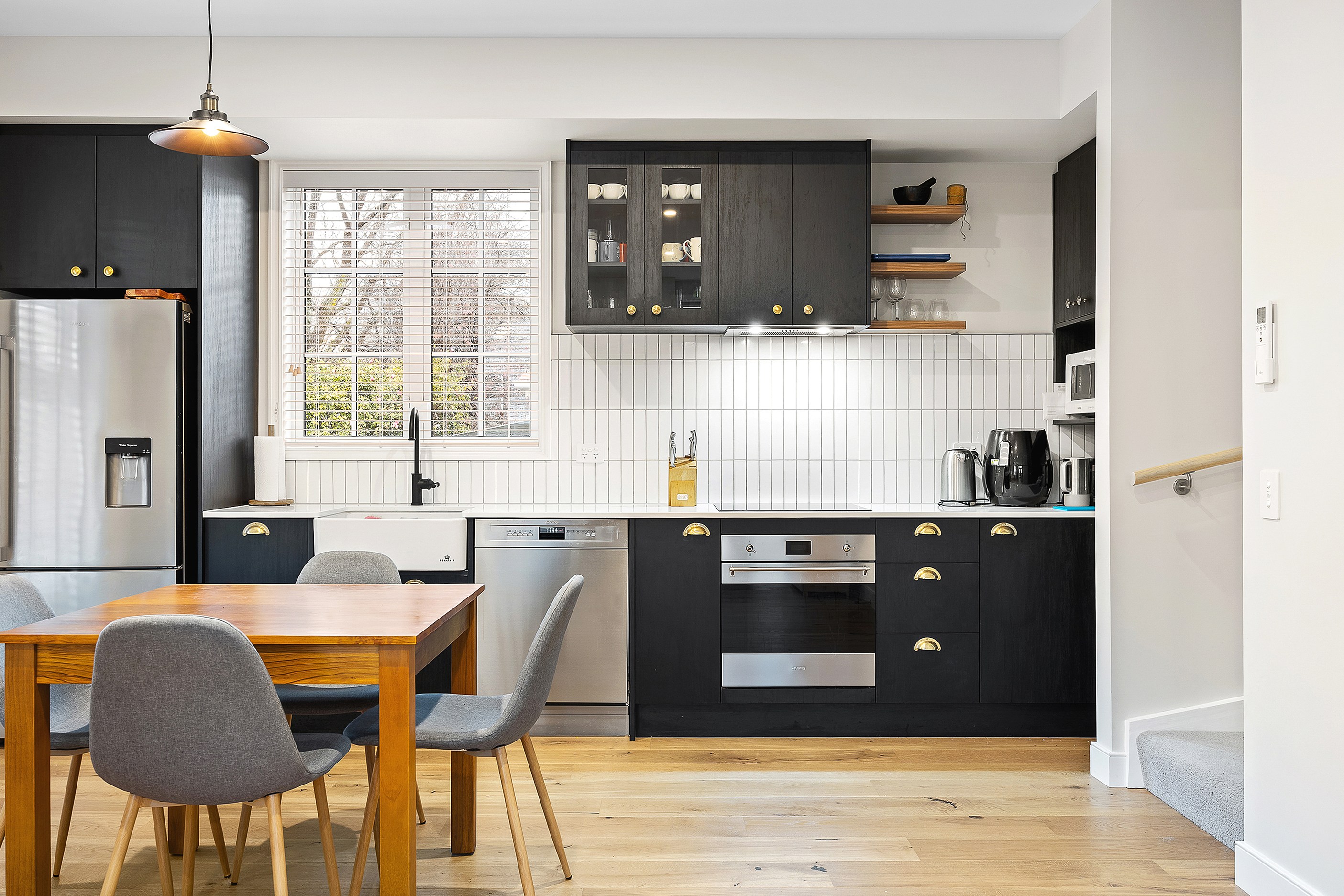 This, however, is an utterly modern, comfortable build. For example, you’ll find double-glazed joinery and sleek modern kitchens, but with nods to the era such as the brass handles. White walls form the backdrop for lovely details such as the red front door or jet-black or white tiles in the kitchens and bathrooms. Downstairs, the townhouses are all about living large and have the open-plan kitchen, dining and sitting areas, plus outdoor space and a garage. Upstairs, they have either two bedrooms and bathroom or three bedrooms — one of which has an ensuite and walk-in robe — plus a bathroom. This is how to blend century-old charm with modern must-haves.