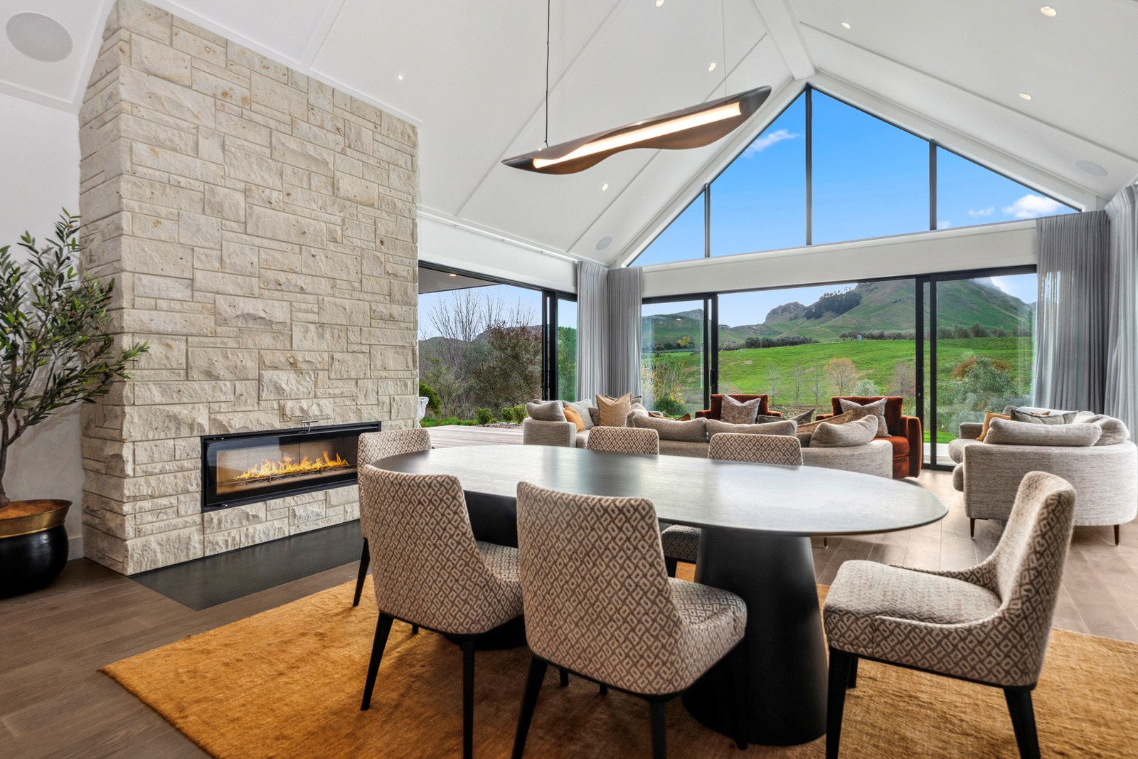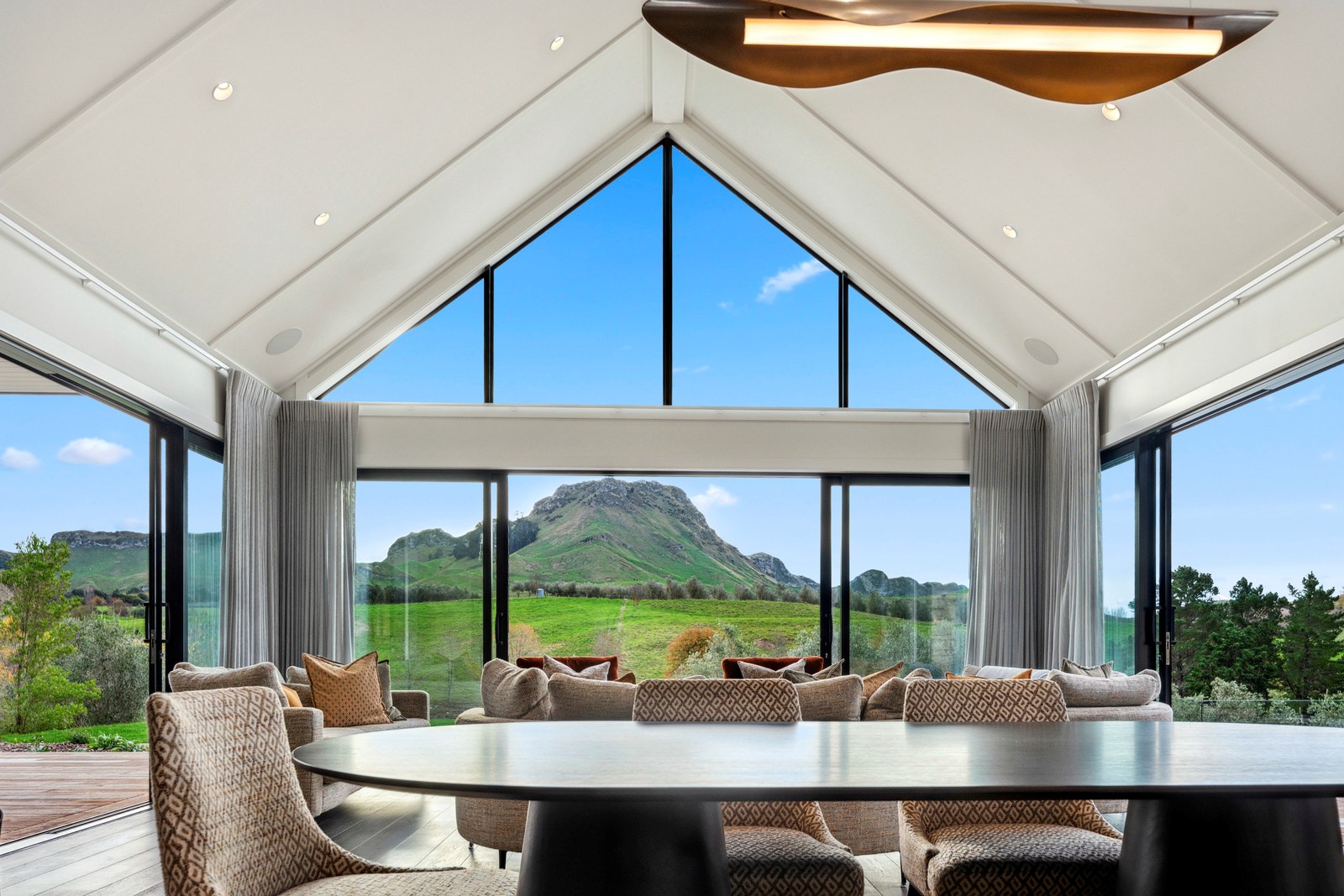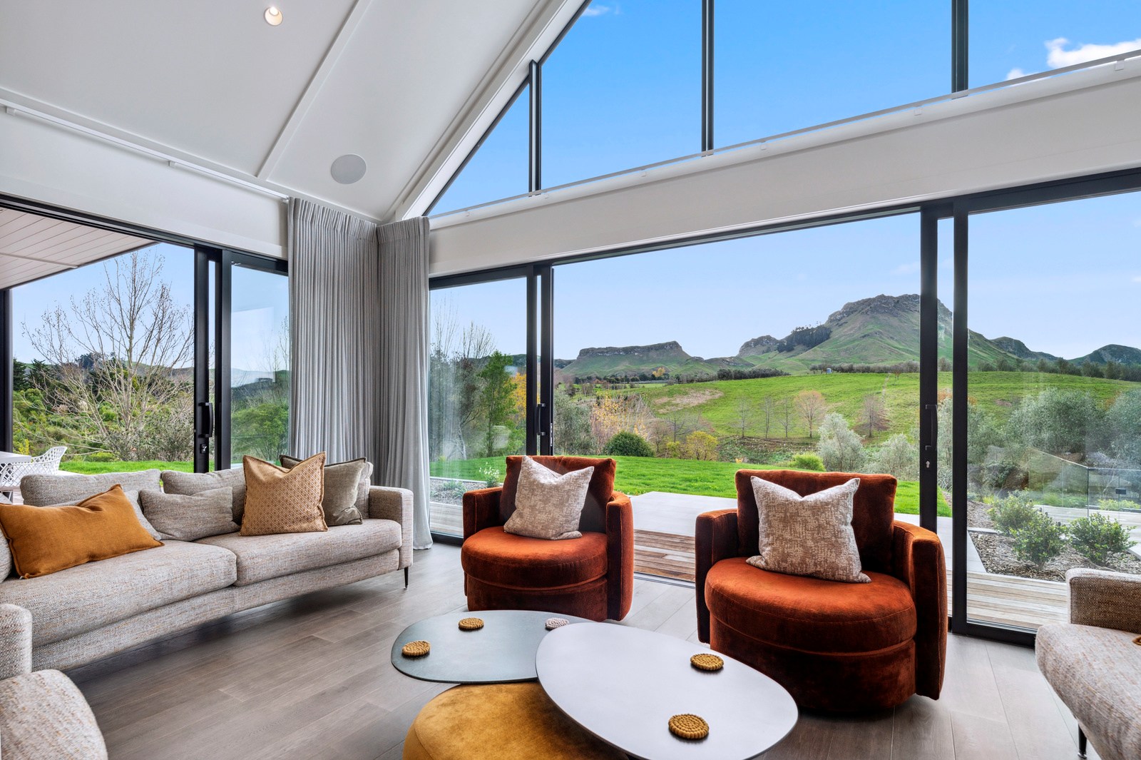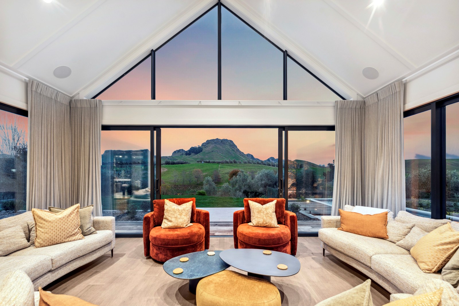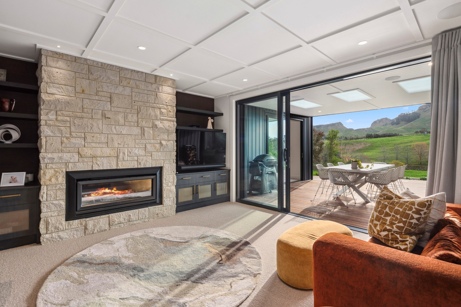 A sculptural entry wall of hand-laid stone sets the tone for this refined rural residence. From the outset, material honesty and regional character inform every detail – a fitting nod to the landscape and the wine region it calls home. Natural stone extends inside where a large open-plan living space revolves around a temperature-controlled wine room and a stone-clad fireplace. A separate lounge offers a more intimate retreat, also focussed around a stone fireplace and breathtaking views of Te Mata Peak. The layout is cleverly zoned. Three bedrooms and two bathrooms form a dedicated guest and family wing, while the main suite enjoys privacy in its own separate haven, complete with a luxurious ensuite and walk-in wardrobe.