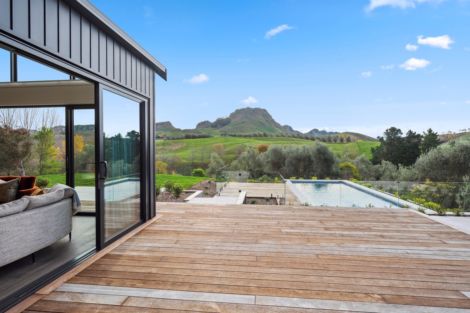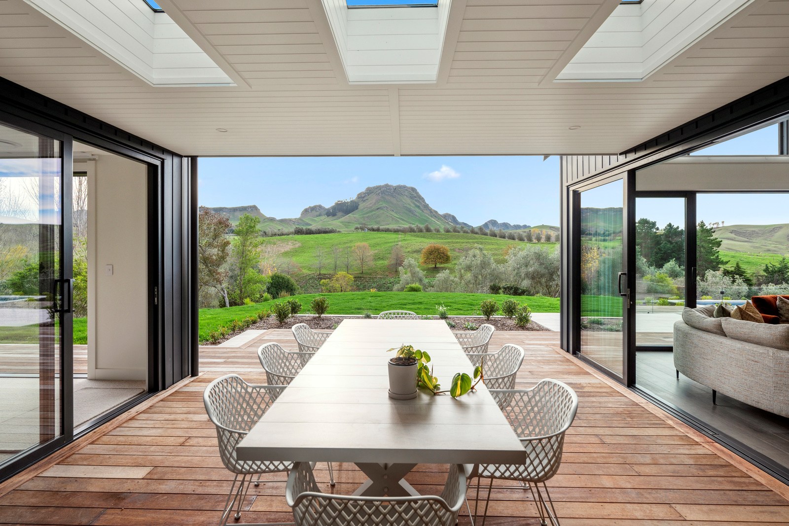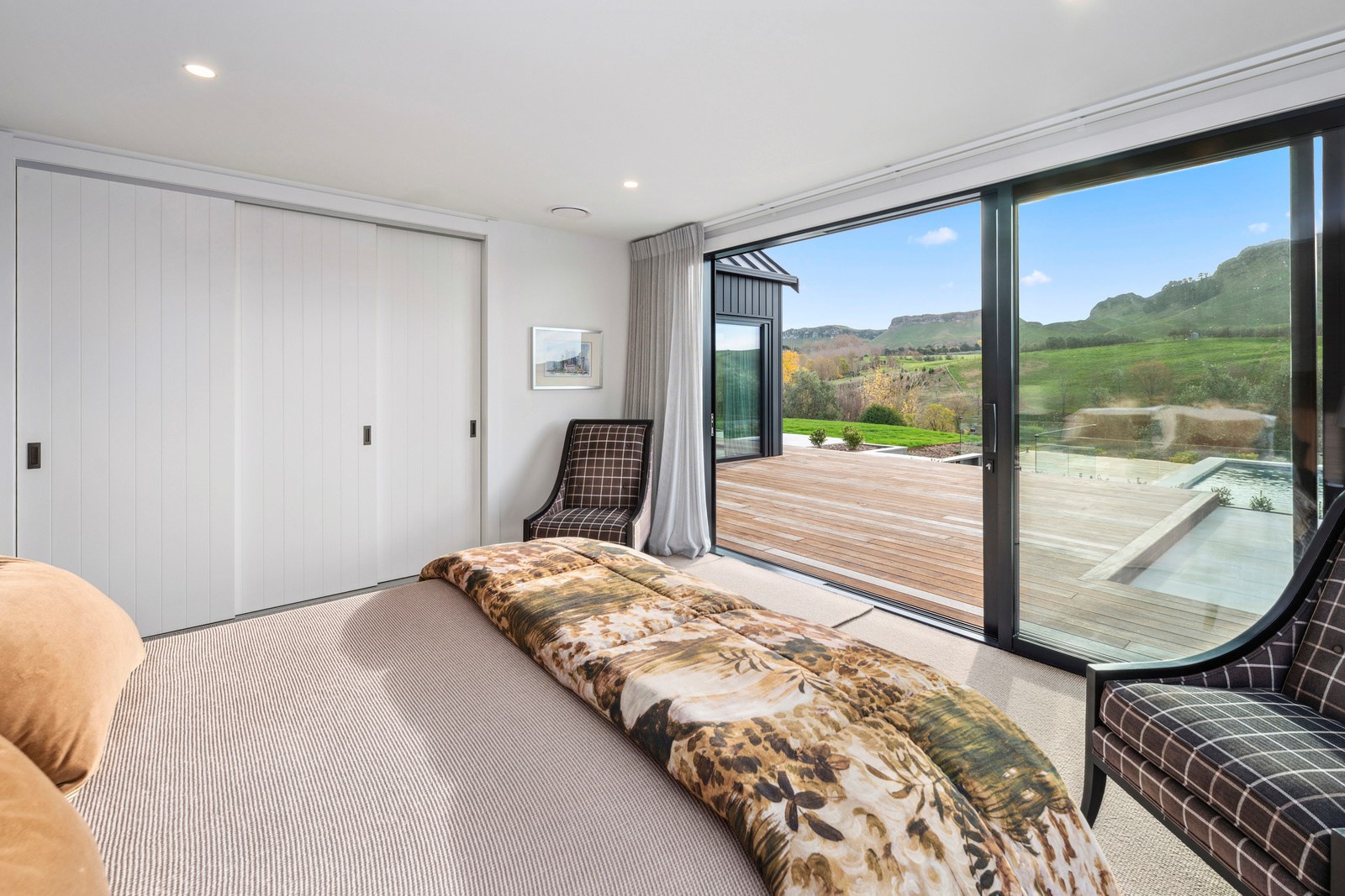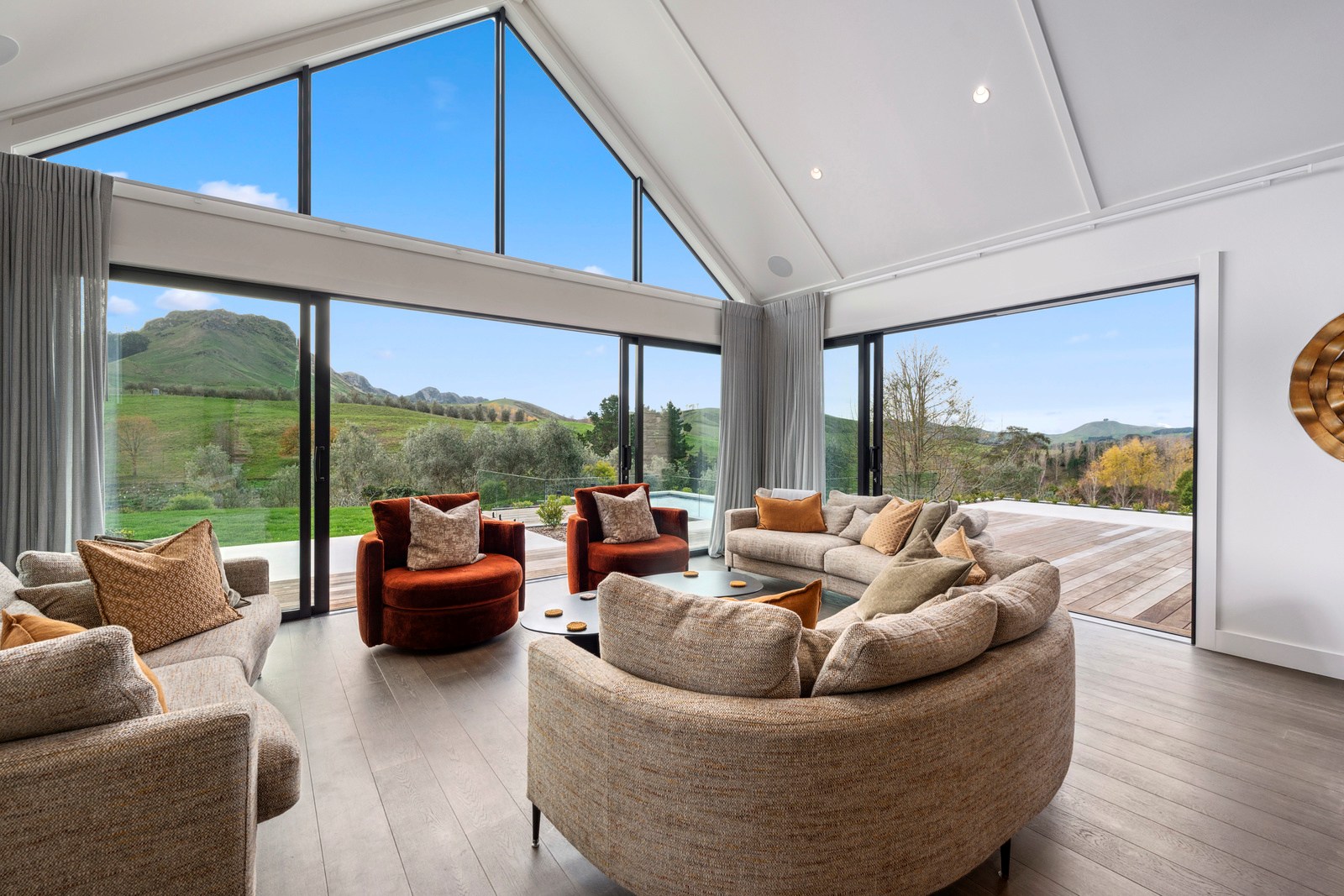 A sculptural entry wall of hand-laid stone sets the tone for this refined rural residence. From the outset, material honesty and regional character inform every detail – a fitting nod to the landscape and the wine region it calls home. Natural stone extends inside where a large open-plan living space revolves around a temperature-controlled wine room and a stone-clad fireplace. A separate lounge offers a more intimate retreat, also focussed around a stone fireplace and breathtaking views of Te Mata Peak. The layout is cleverly zoned. Three bedrooms and two bathrooms form a dedicated guest and family wing, while the main suite enjoys privacy in its own separate haven, complete with a luxurious ensuite and walk-in wardrobe.