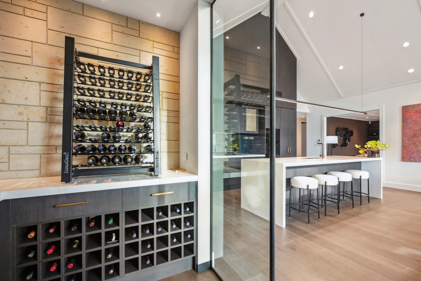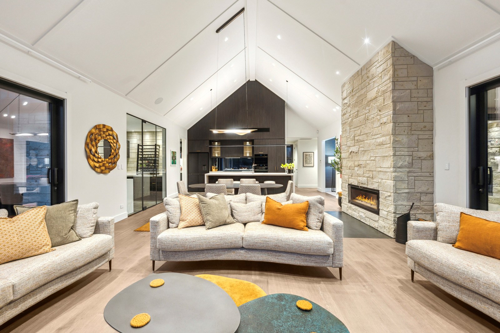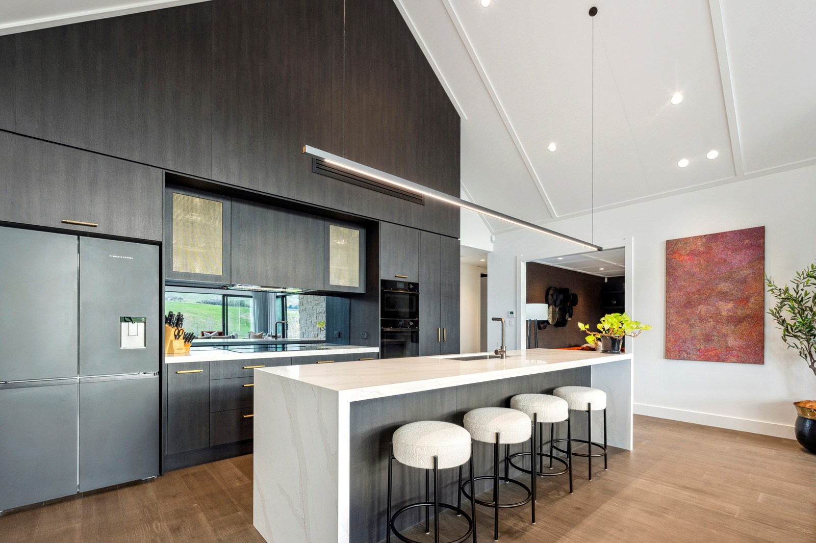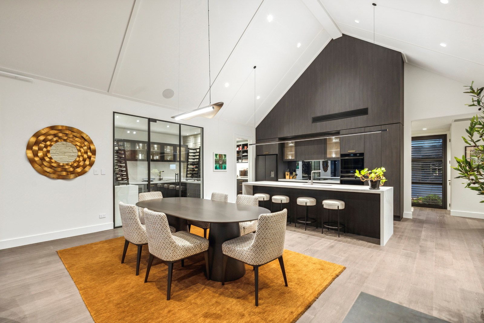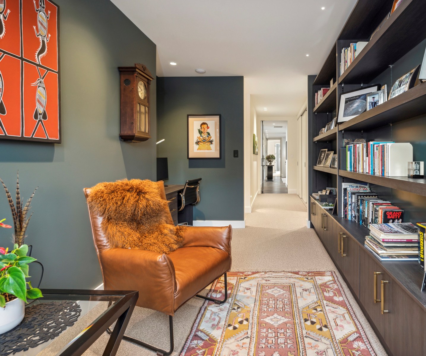 A library tucked away off the central hub offers a quiet place to retreat. This is also an environmentally responsible build. Energy efficiency is elevated by solar panels with battery storage, thermally broken joinery, advanced insulation, and motion-sensor lighting. The smart system allows for remote control of climate, lighting, and security. Materials were locally sourced, and the home was designed to reduce waste and water use throughout construction and occupancy. Clad in stone and metal, this 369sqm home celebrates craftsmanship, design and a light environmental footprint.