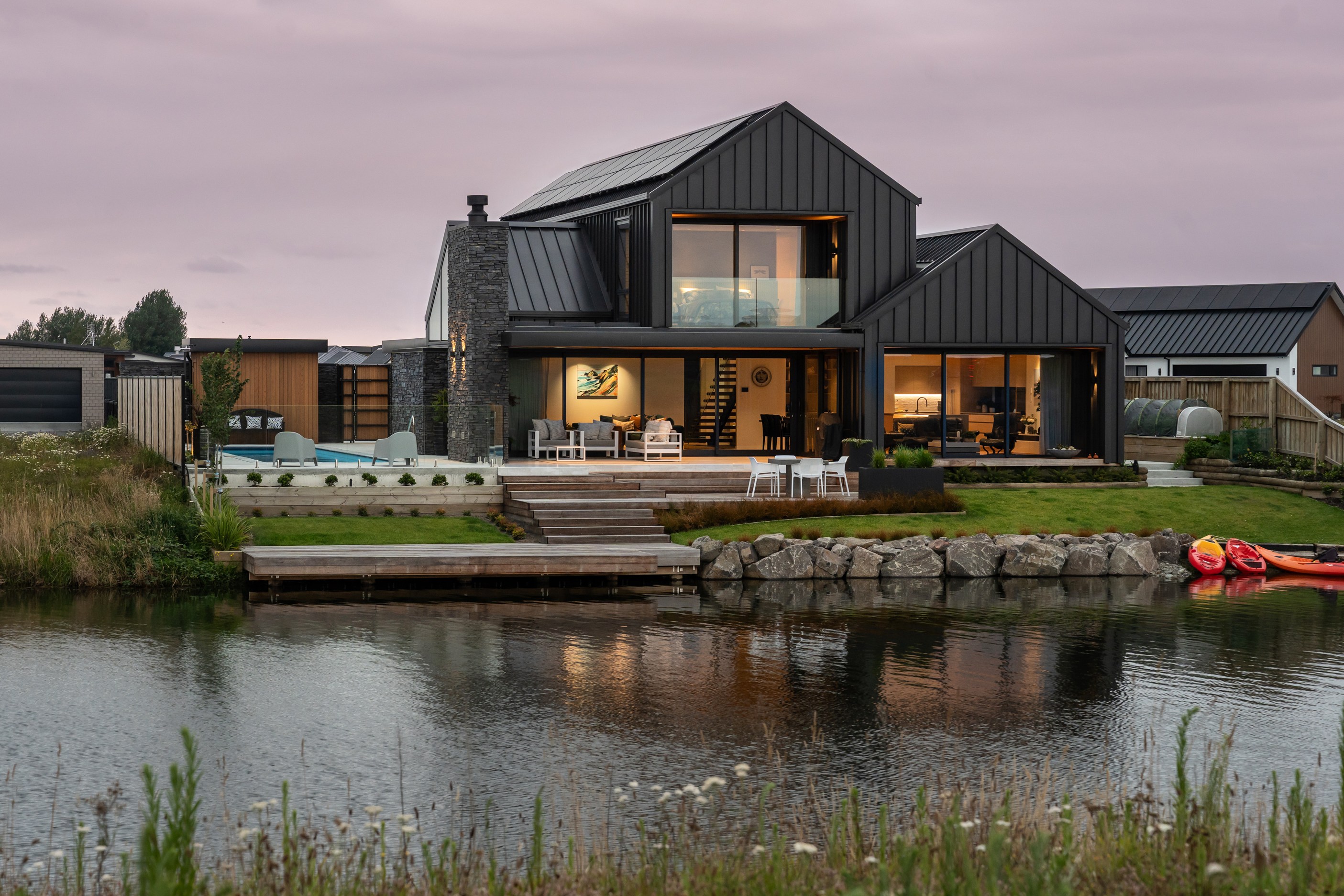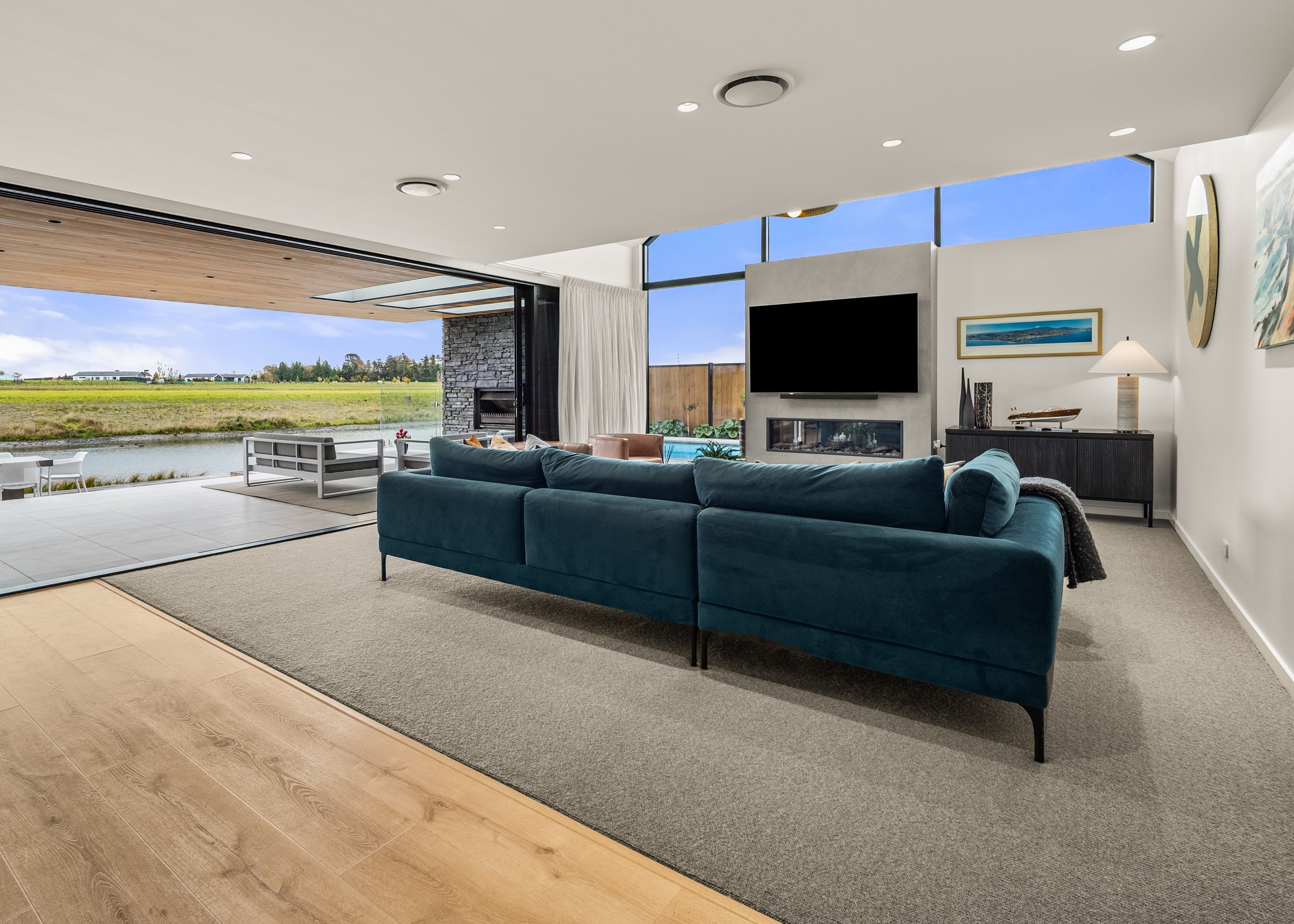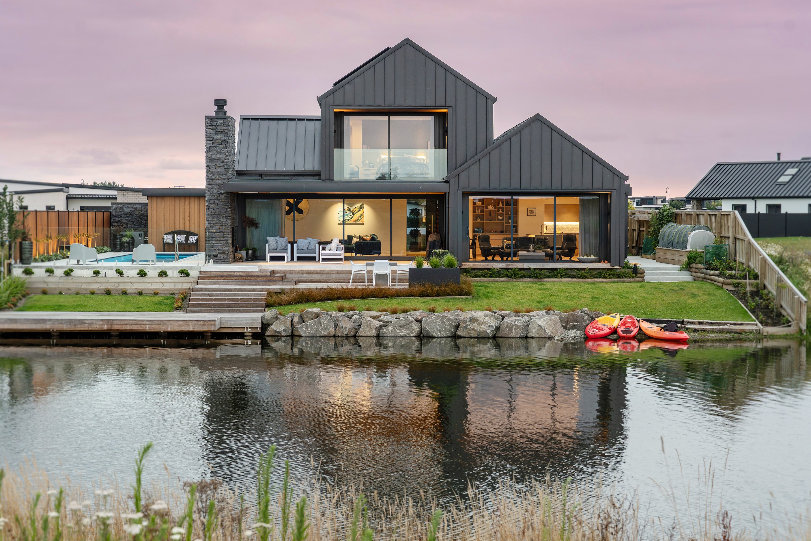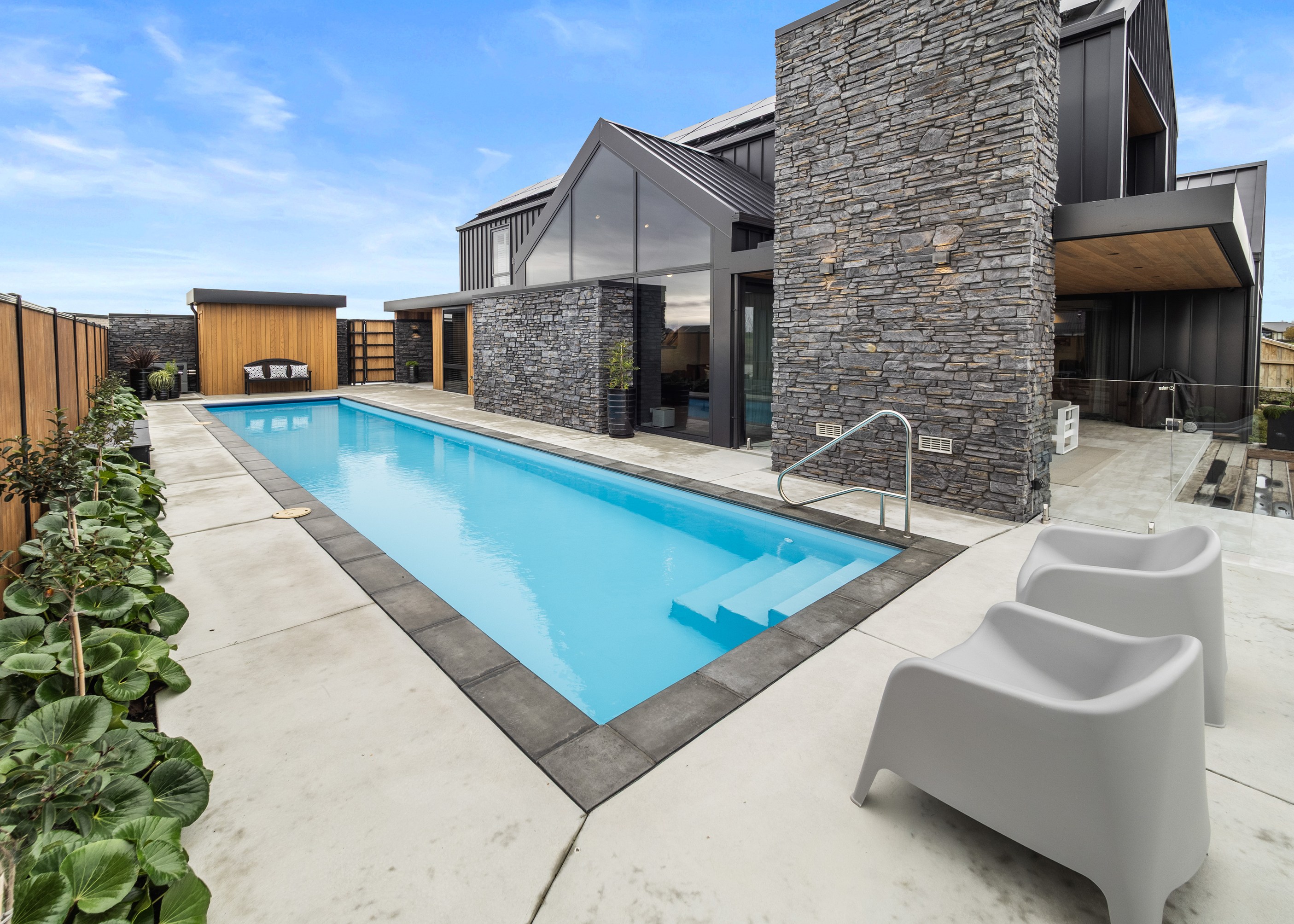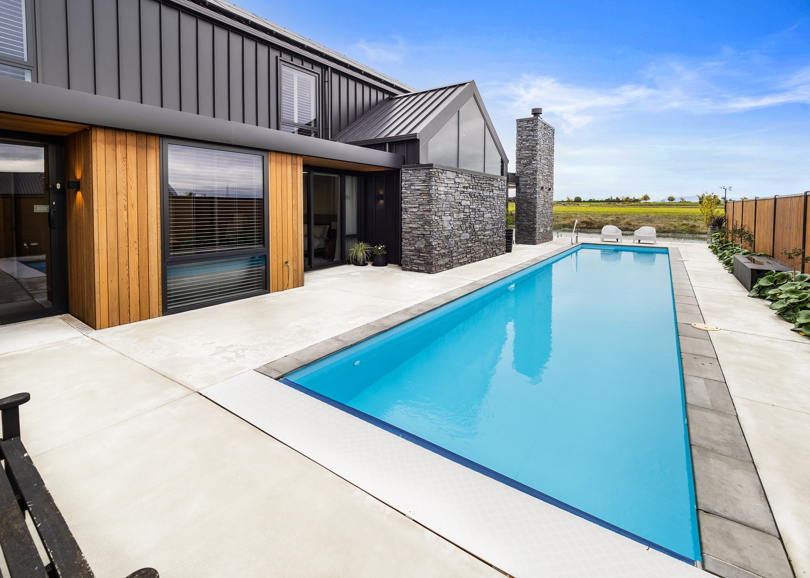 Located on the edge of Lake Hood, this 339sqm home captures the rhythm of its setting – from early morning when kayakers drift past to sundowners enjoyed with twilight reflections on the water. Built as a forever home, it’s a haven of comfort, performance and understated style. Imagine waking up to water views and ending the day with drinks on the terrace beside the fire. The living areas spill out to a spacious, sheltered outdoor zone with an in-built fireplace and a beautifully tiled lap pool that’s heated for year-round use. Upstairs, the main bedroom has its own balcony and ensuite, offering a private retreat with ever-changing views. There’s a lift for ease and future accessibility, plus a dedicated gym that doubles as a games room — perfect for visits from grandchildren.