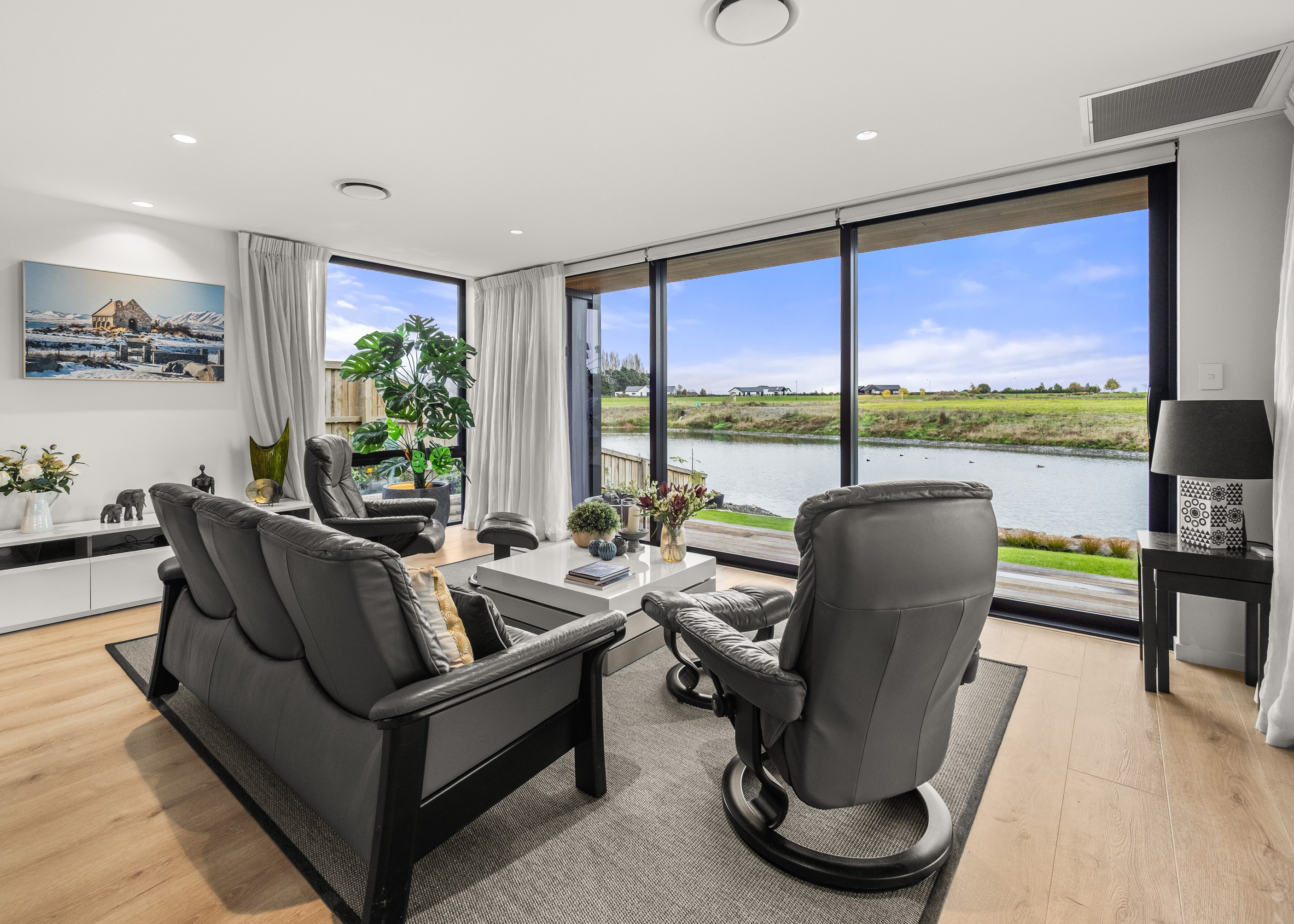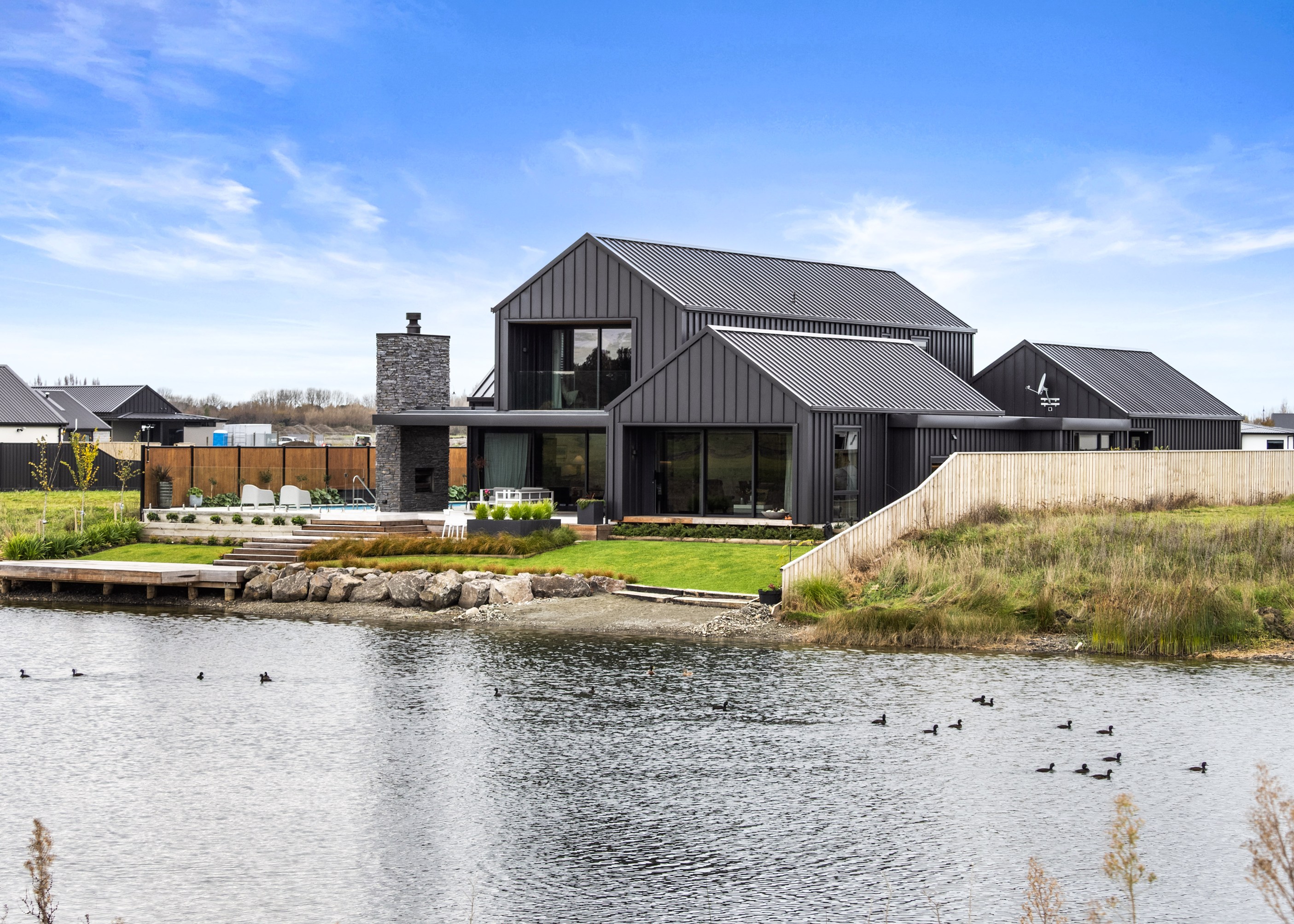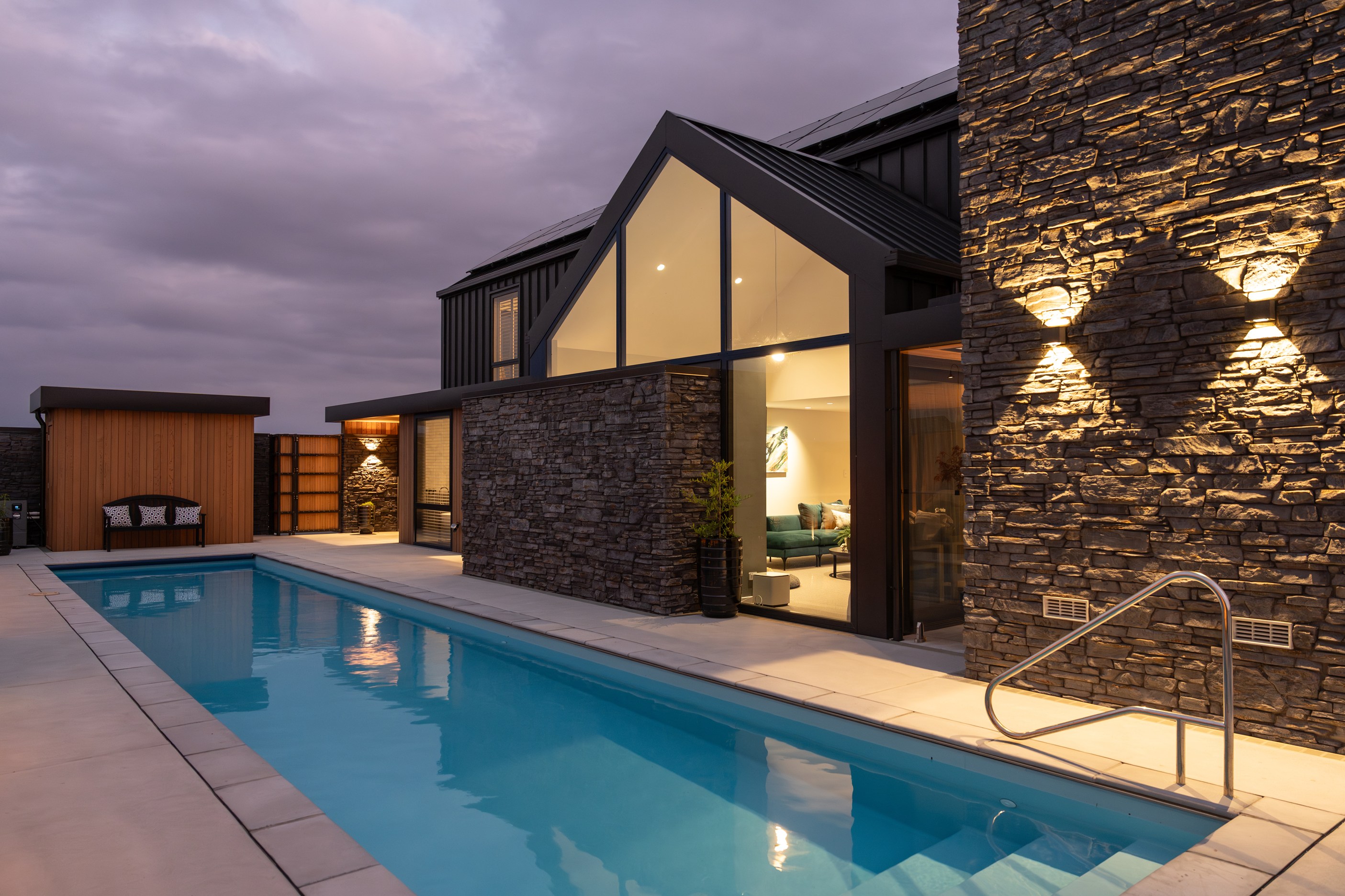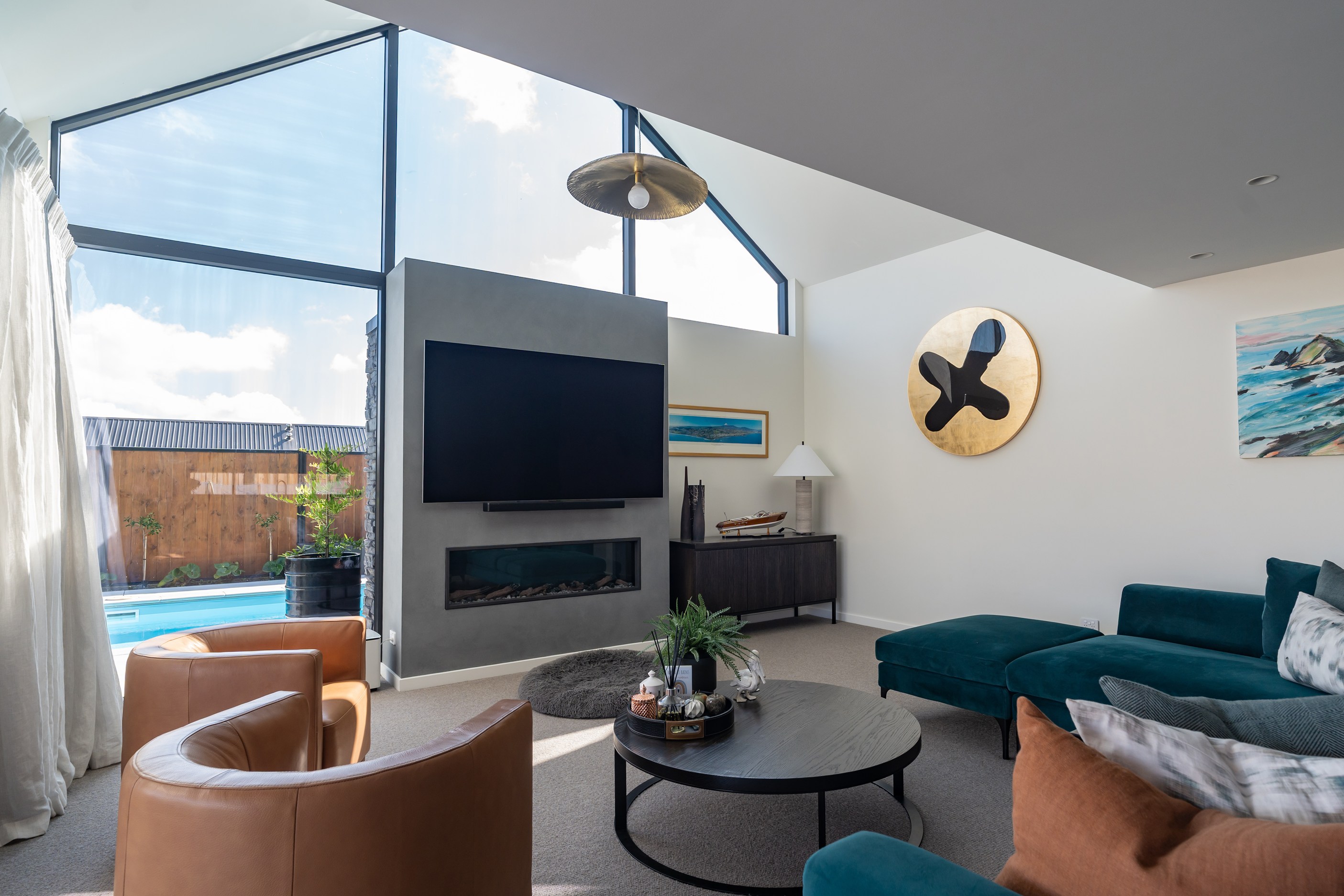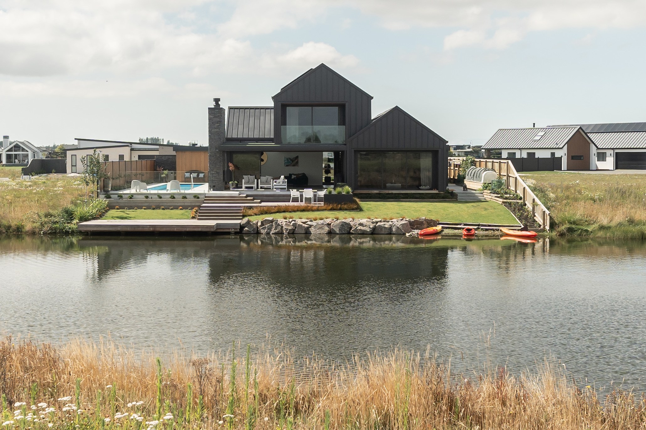 Located on the edge of Lake Hood, this 339sqm home captures the rhythm of its setting – from early morning when kayakers drift past to sundowners enjoyed with twilight reflections on the water. Built as a forever home, it’s a haven of comfort, performance and understated style. Imagine waking up to water views and ending the day with drinks on the terrace beside the fire. The living areas spill out to a spacious, sheltered outdoor zone with an in-built fireplace and a beautifully tiled lap pool that’s heated for year-round use. Upstairs, the main bedroom has its own balcony and ensuite, offering a private retreat with ever-changing views. There’s a lift for ease and future accessibility, plus a dedicated gym that doubles as a games room — perfect for visits from grandchildren.