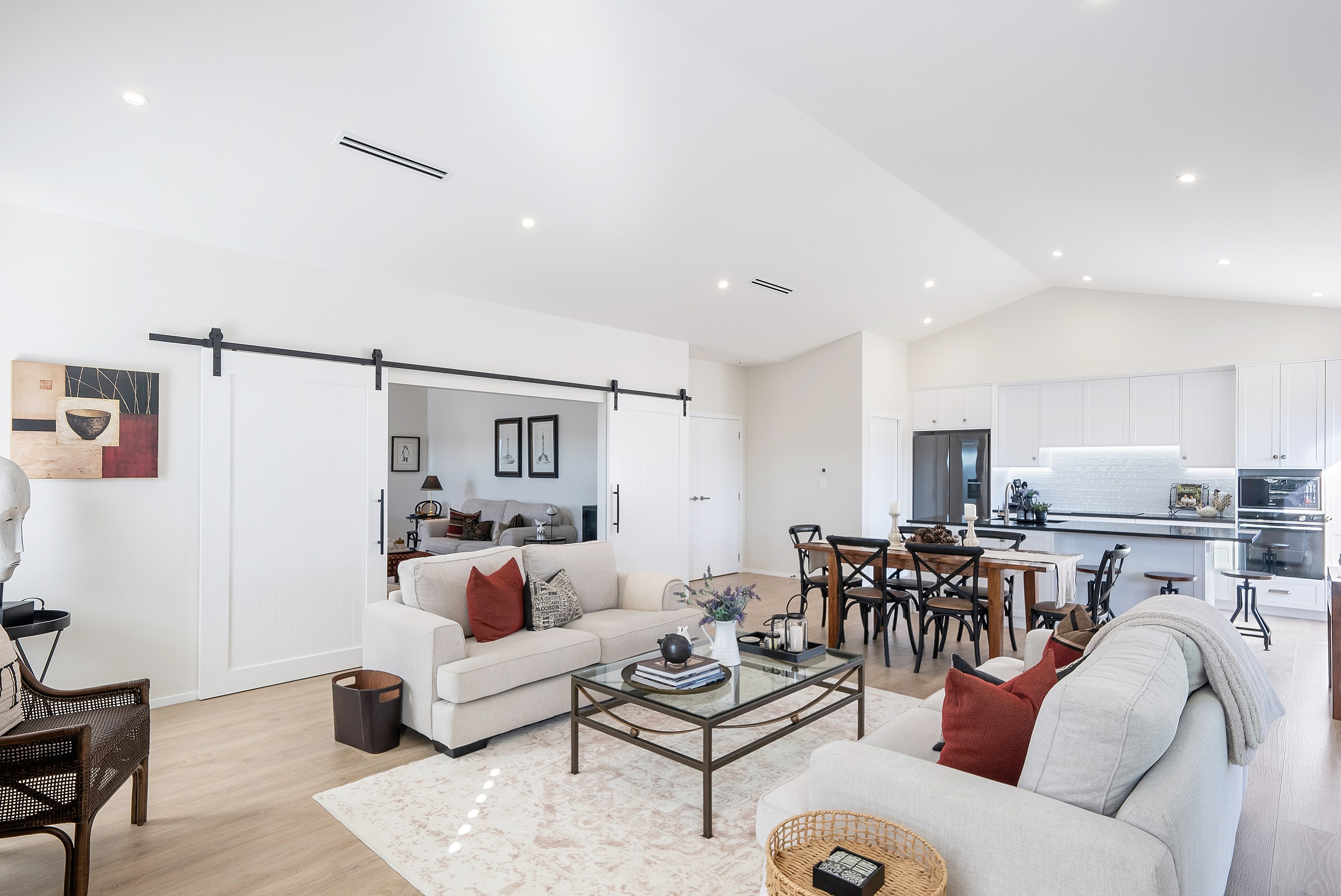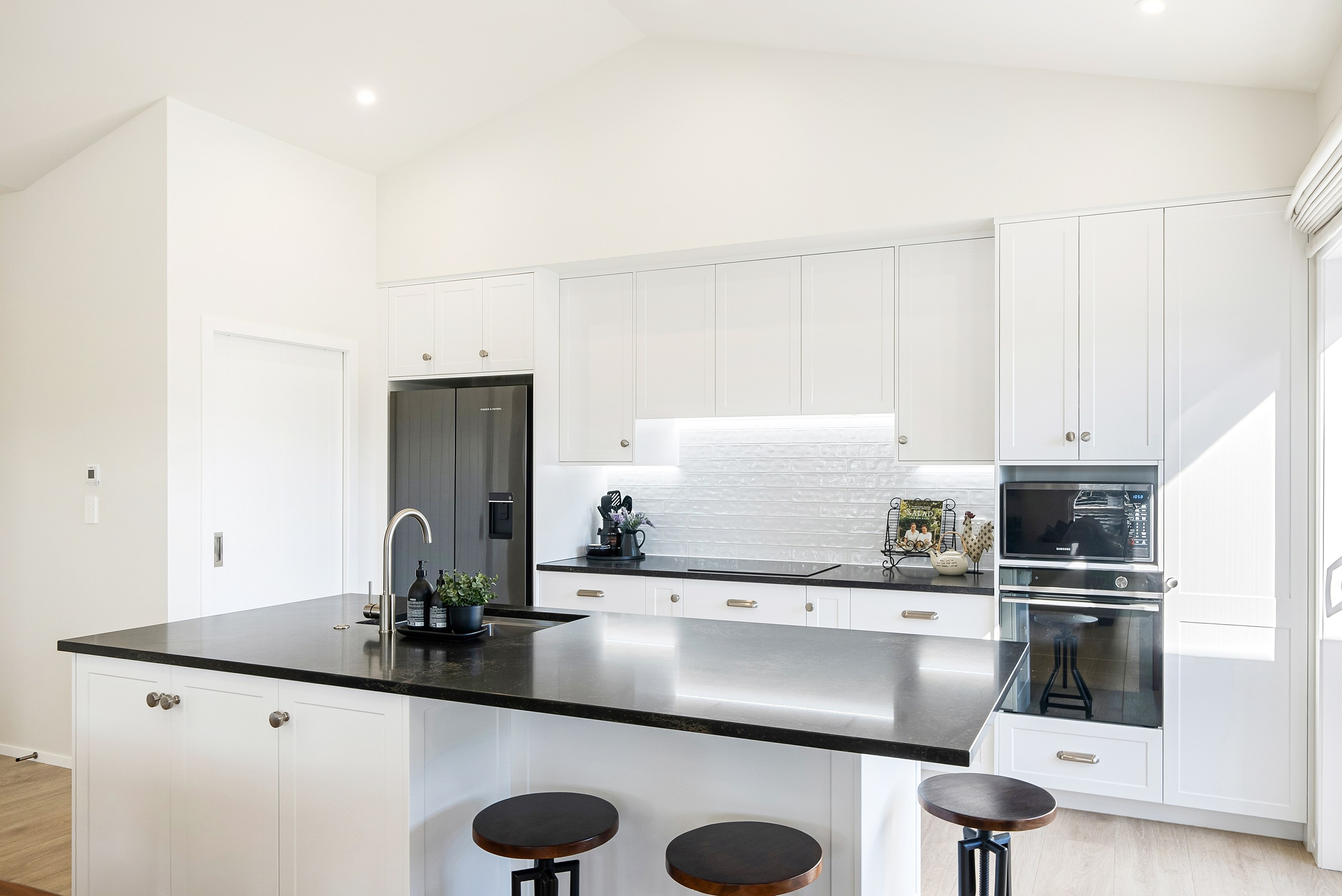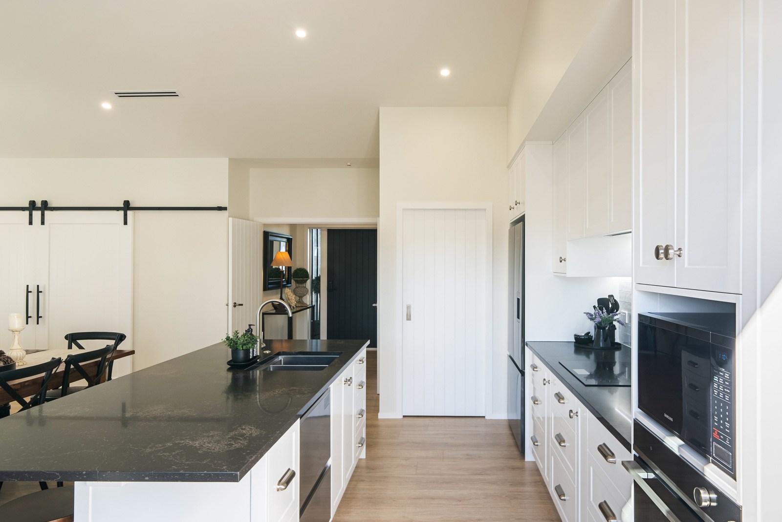 With this elegant home, dark handsome cladding plus a light, bright interior equals modern and marvellous. It’s clear from the outset that this three-bedroom home with two bathrooms, two living rooms and a study is going to be a beauty. The twin-gabled exterior with black board-andbatten trimmed with white joinery, soffits and surrounds is smart and commands attention. Inside, it is every bit as stylish, but reverses the palette. Crisp white and pale tones are contrasted with dark accents such as the black kitchen island benchtop, bathroom vanity tops, sliding barn door runners and some furniture. It works a treat. The sense of volume and airiness is achieved with a high stud throughout and a scissor-truss ceiling over the open-plan kitchen, dining and living zone.