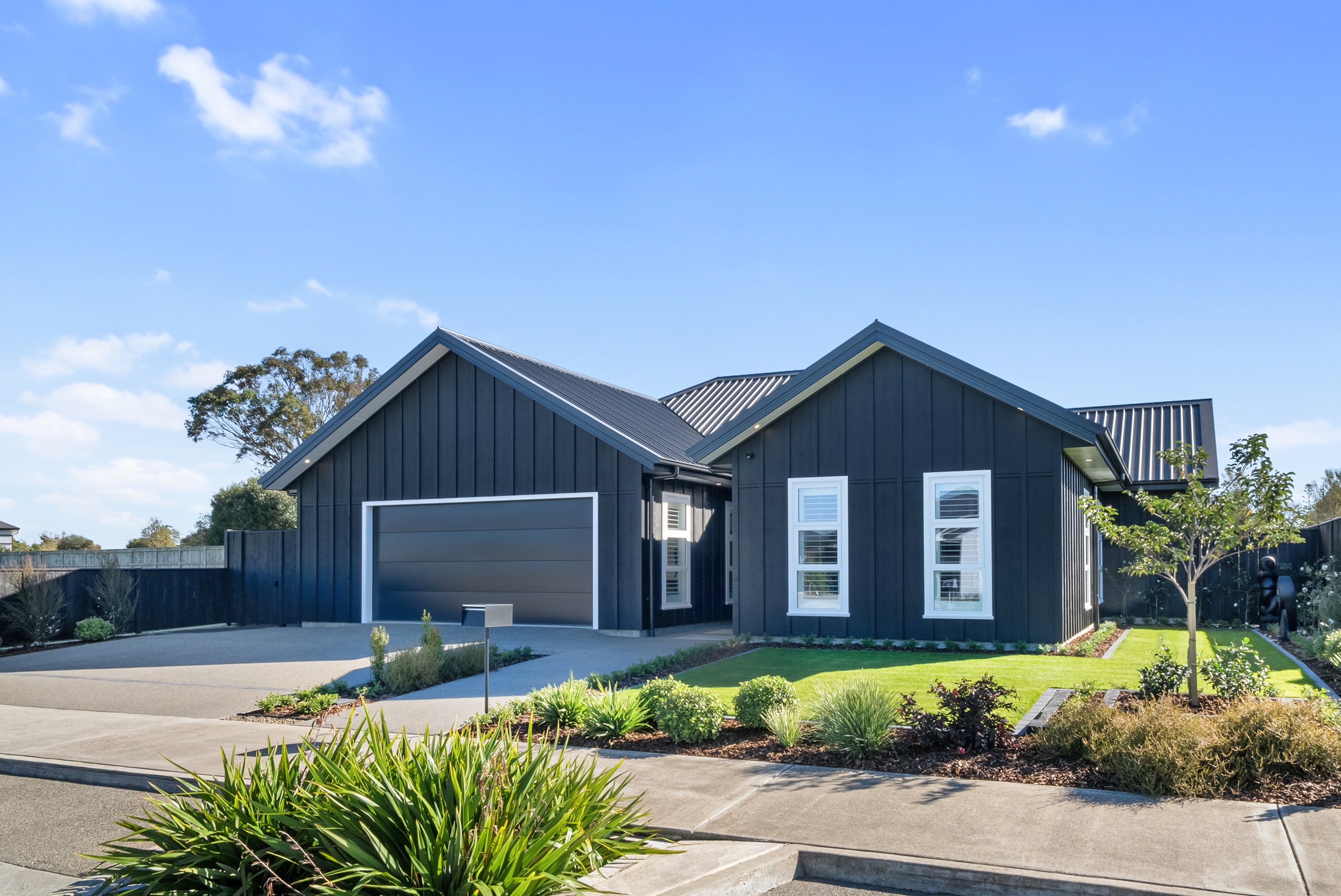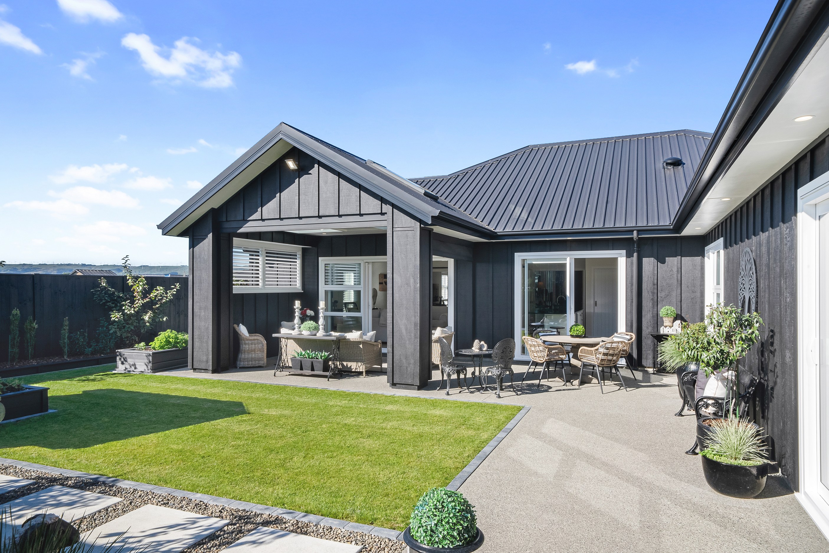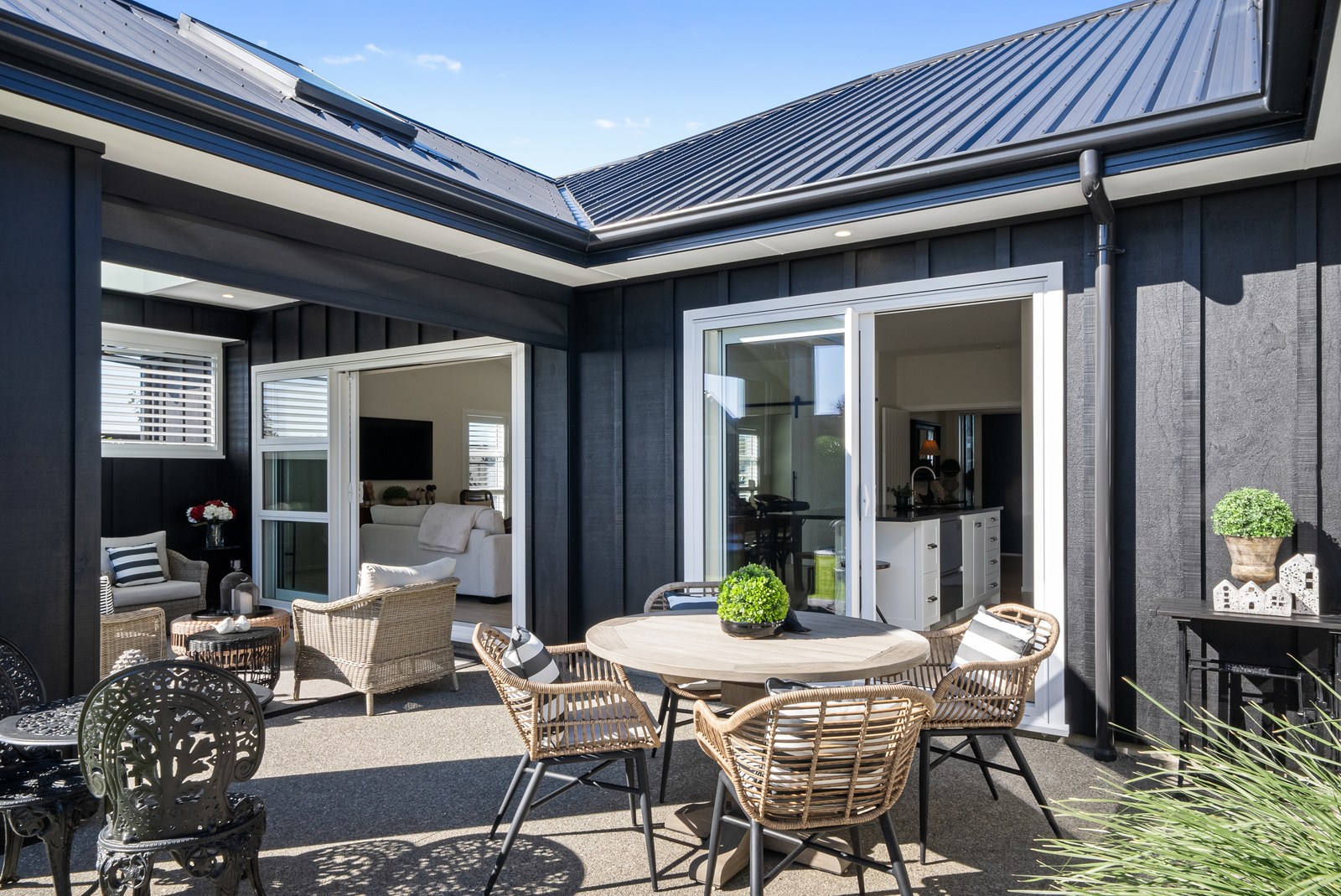 With this elegant home, dark handsome cladding plus a light, bright interior equals modern and marvellous. It’s clear from the outset that this three-bedroom home with two bathrooms, two living rooms and a study is going to be a beauty. The twin-gabled exterior with black board-andbatten trimmed with white joinery, soffits and surrounds is smart and commands attention. Inside, it is every bit as stylish, but reverses the palette. Crisp white and pale tones are contrasted with dark accents such as the black kitchen island benchtop, bathroom vanity tops, sliding barn door runners and some furniture. It works a treat. The sense of volume and airiness is achieved with a high stud throughout and a scissor-truss ceiling over the open-plan kitchen, dining and living zone.