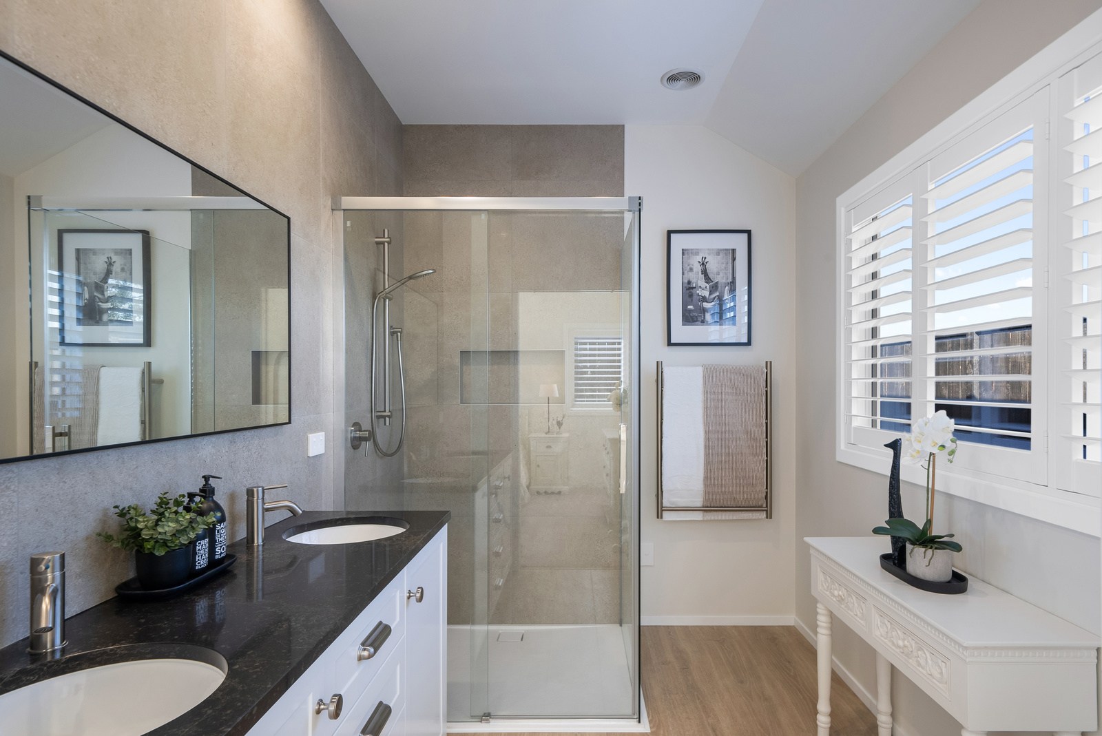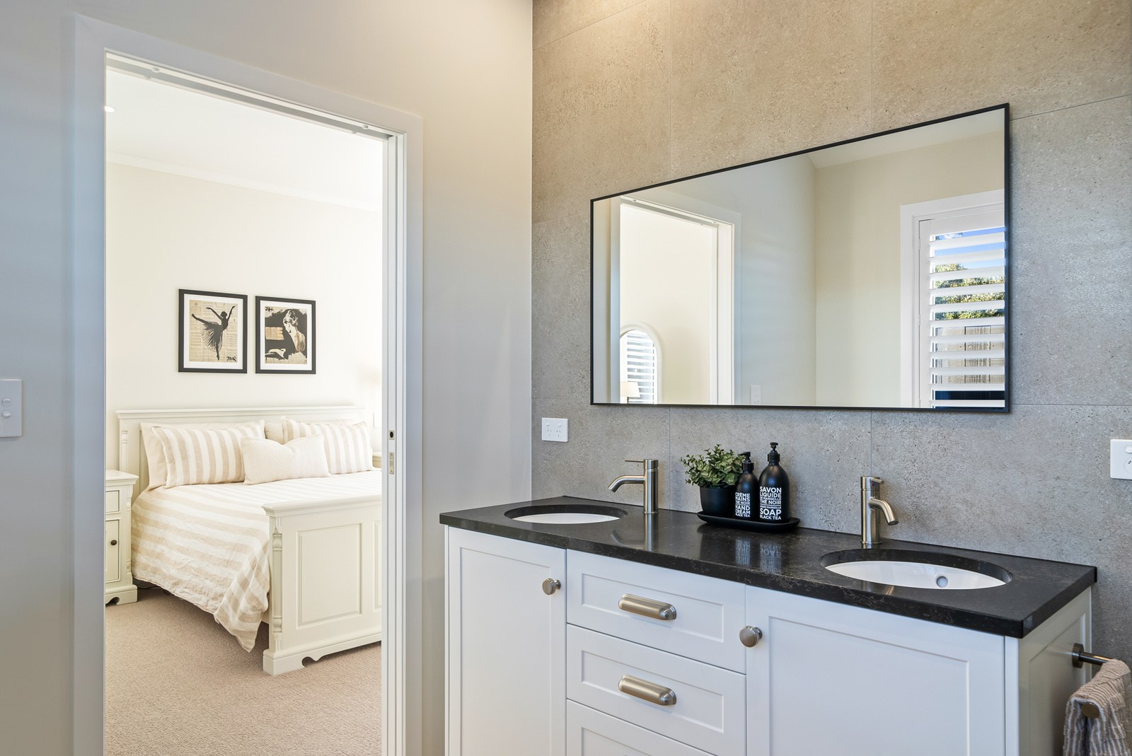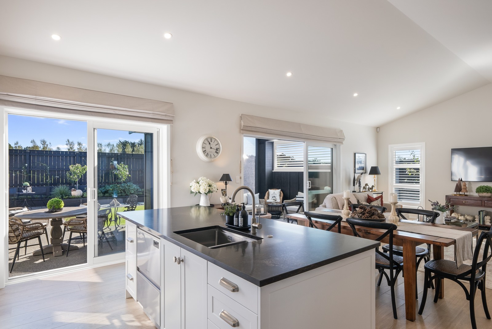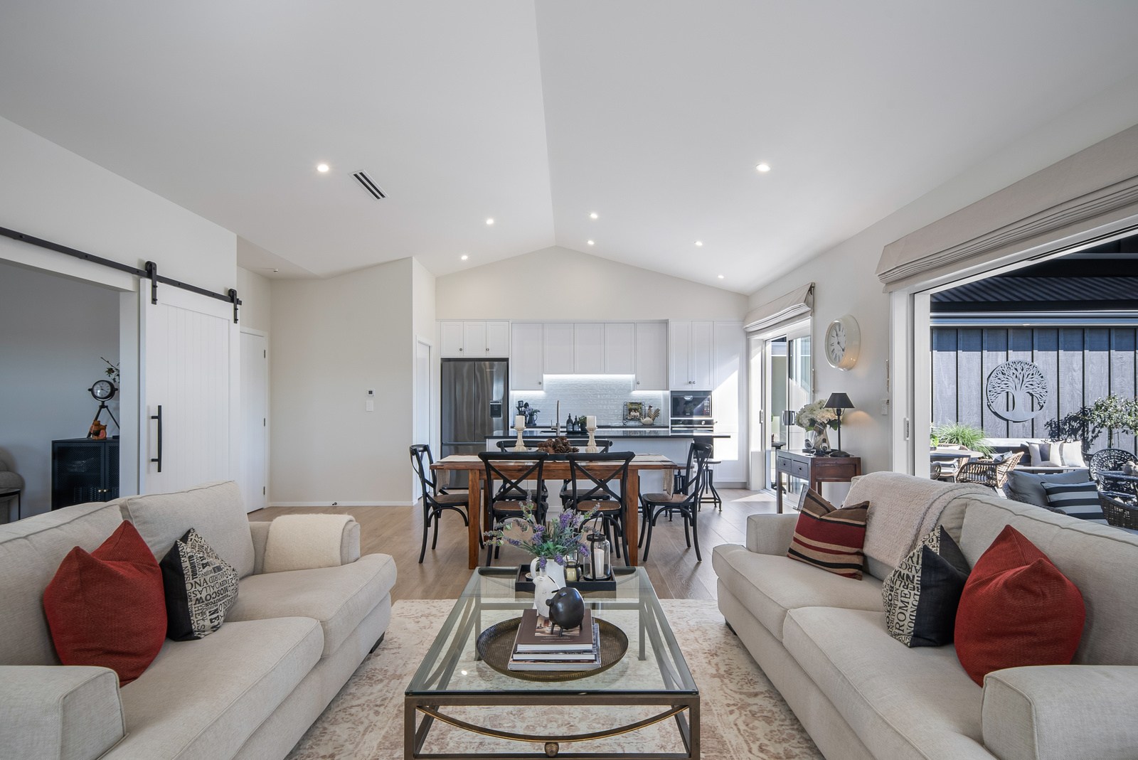 A key must-have of the 233sqm design was an abundance of natural light and the house delivers here, too. Tall windows and sliding doors that open to wow-factor outdoor living spaces, including a loggia, ensure there’s plenty of sun to illuminate and warm. The main bedroom at the very end of a wing in the L-shaped house has a walk-in wardrobe, ensuite and sliders that connect to the outdoors. There’s plenty more on the expertly constructed property’s CV, too, including a kitchen scullery, powder room and internal-access double garage with laundry. Modern, marvellous — and meticulous.