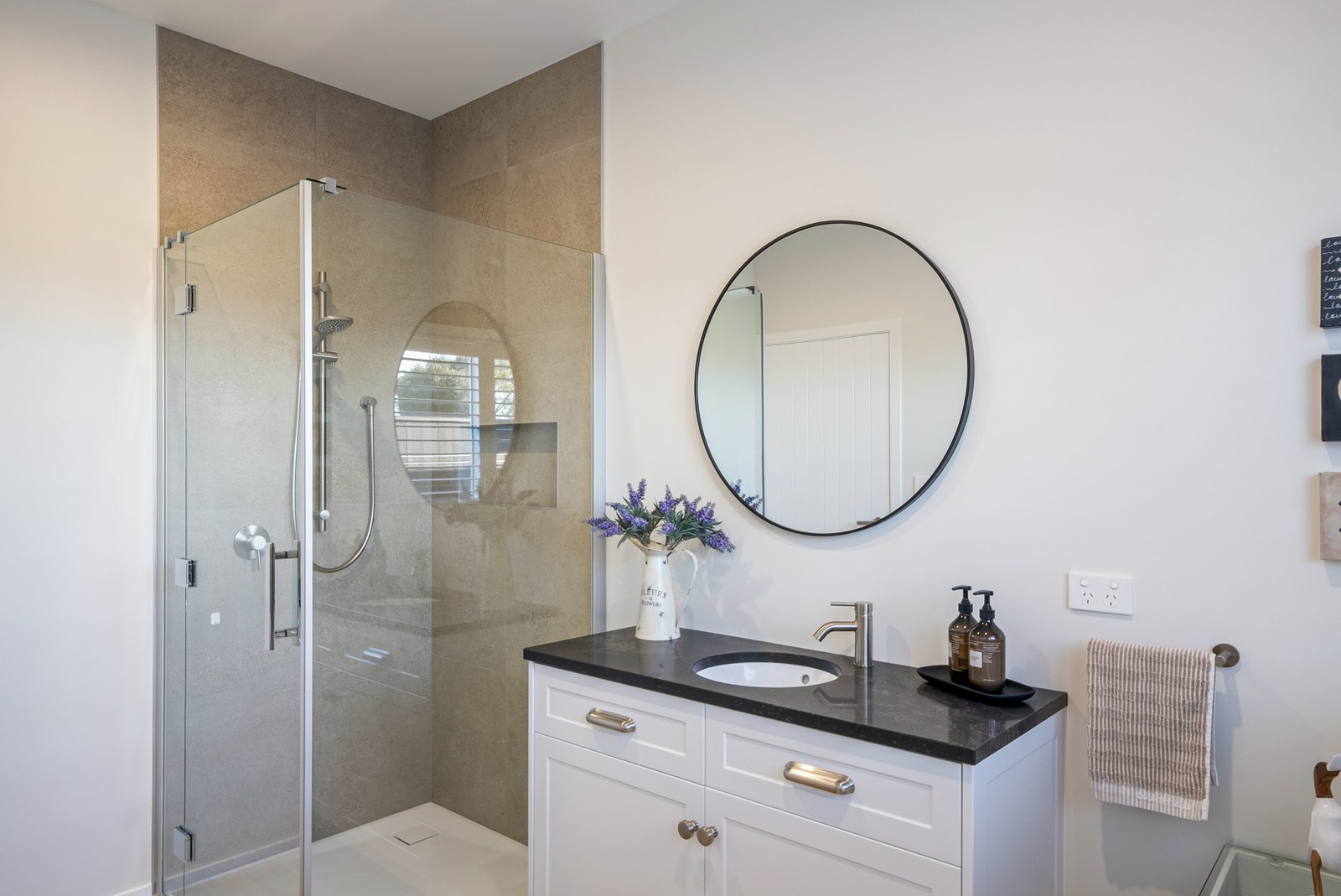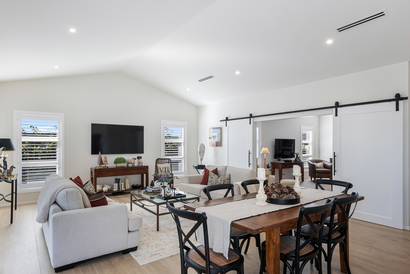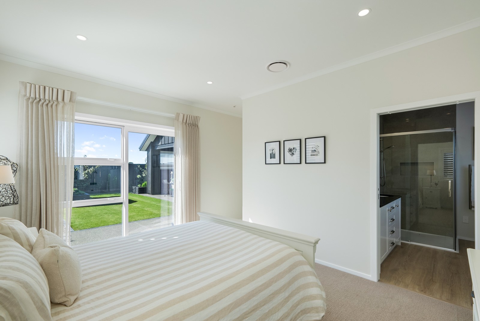 A key must-have of the 233sqm design was an abundance of natural light and the house delivers here, too. Tall windows and sliding doors that open to wow-factor outdoor living spaces, including a loggia, ensure there’s plenty of sun to illuminate and warm. The main bedroom at the very end of a wing in the L-shaped house has a walk-in wardrobe, ensuite and sliders that connect to the outdoors. There’s plenty more on the expertly constructed property’s CV, too, including a kitchen scullery, powder room and internal-access double garage with laundry. Modern, marvellous — and meticulous.