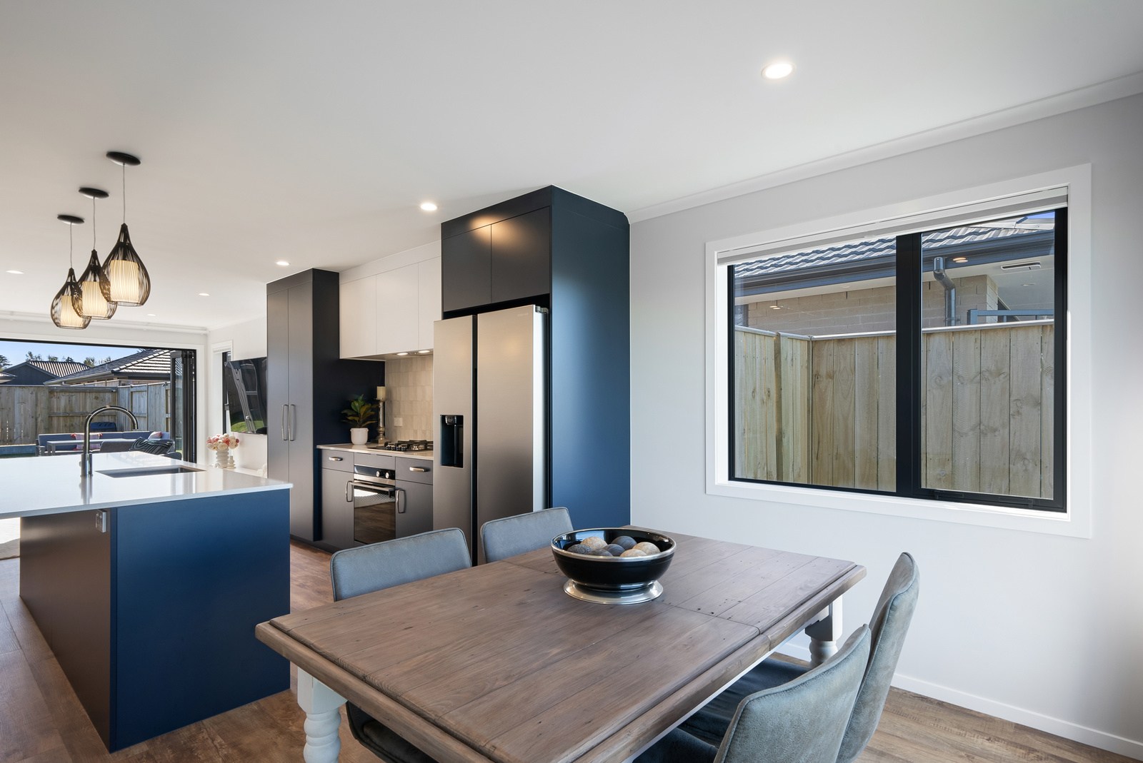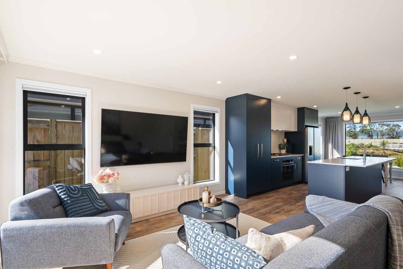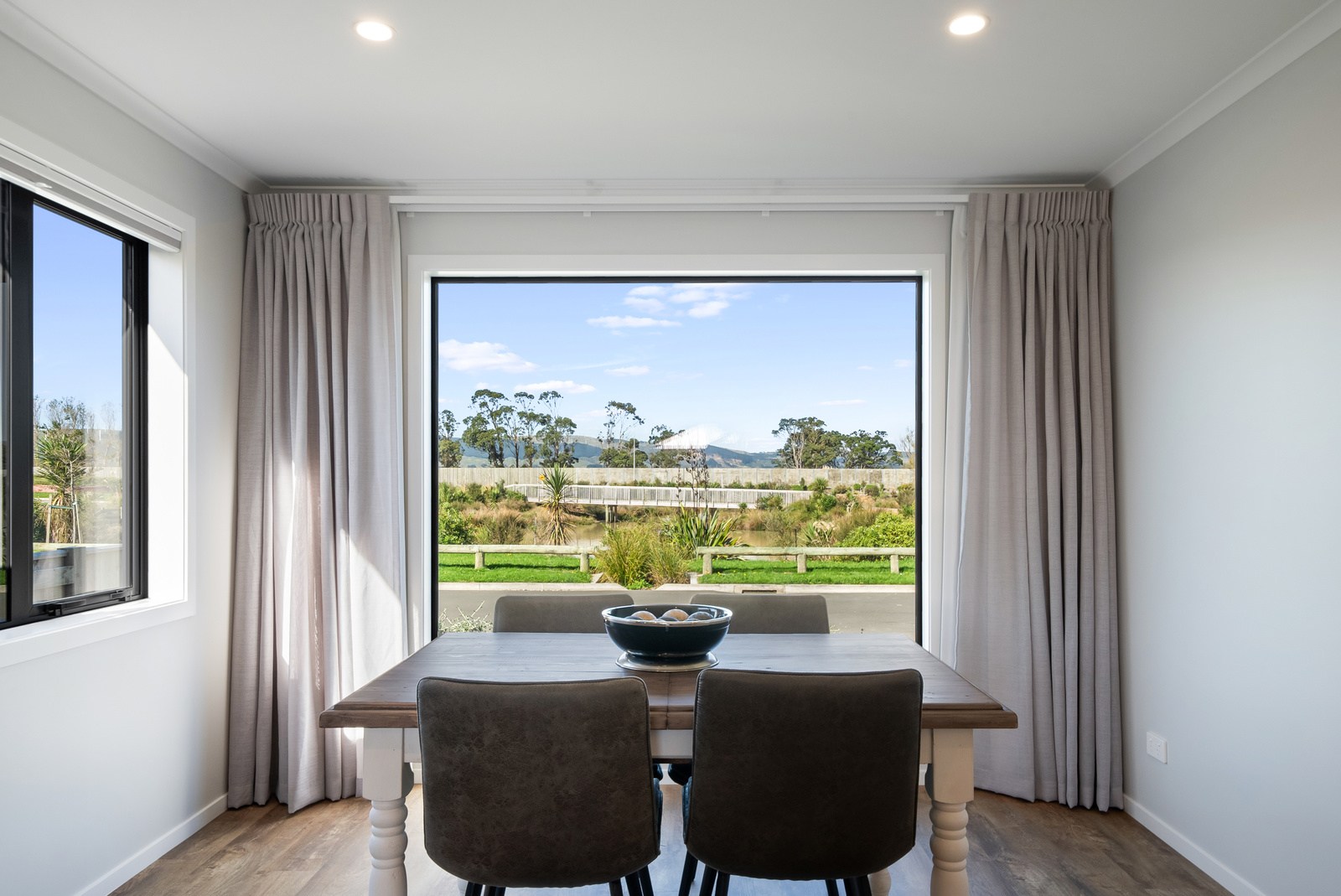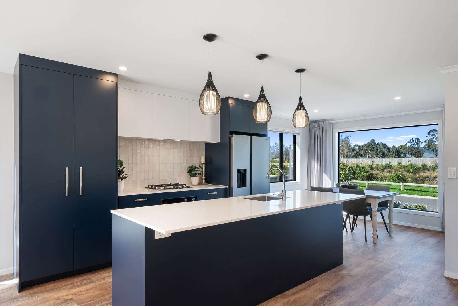 A showstopping picture window in the dining space offers a framed view to Koa Reserve, bringing in both light and tranquillity. The interior palette is clean and modern – timber-look flooring, soft whites, and dark-toned cabinetry bring warmth and cohesion throughout. Both bathrooms are stylish and practical, with floating vanities, black fittings, sleek tiling and thoughtful detailing that enhances everyday comfort. With three double bedrooms, two bathrooms and a double garage, the layout is ideal for a growing household or visiting guests. Every element — from solar orientation to understated finishes — contributes to a home that’s elegant, efficient and designed to stand the test of time