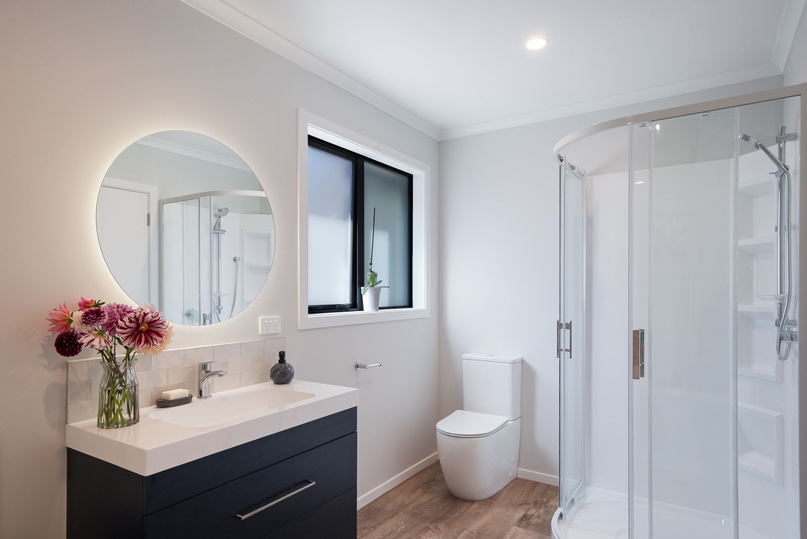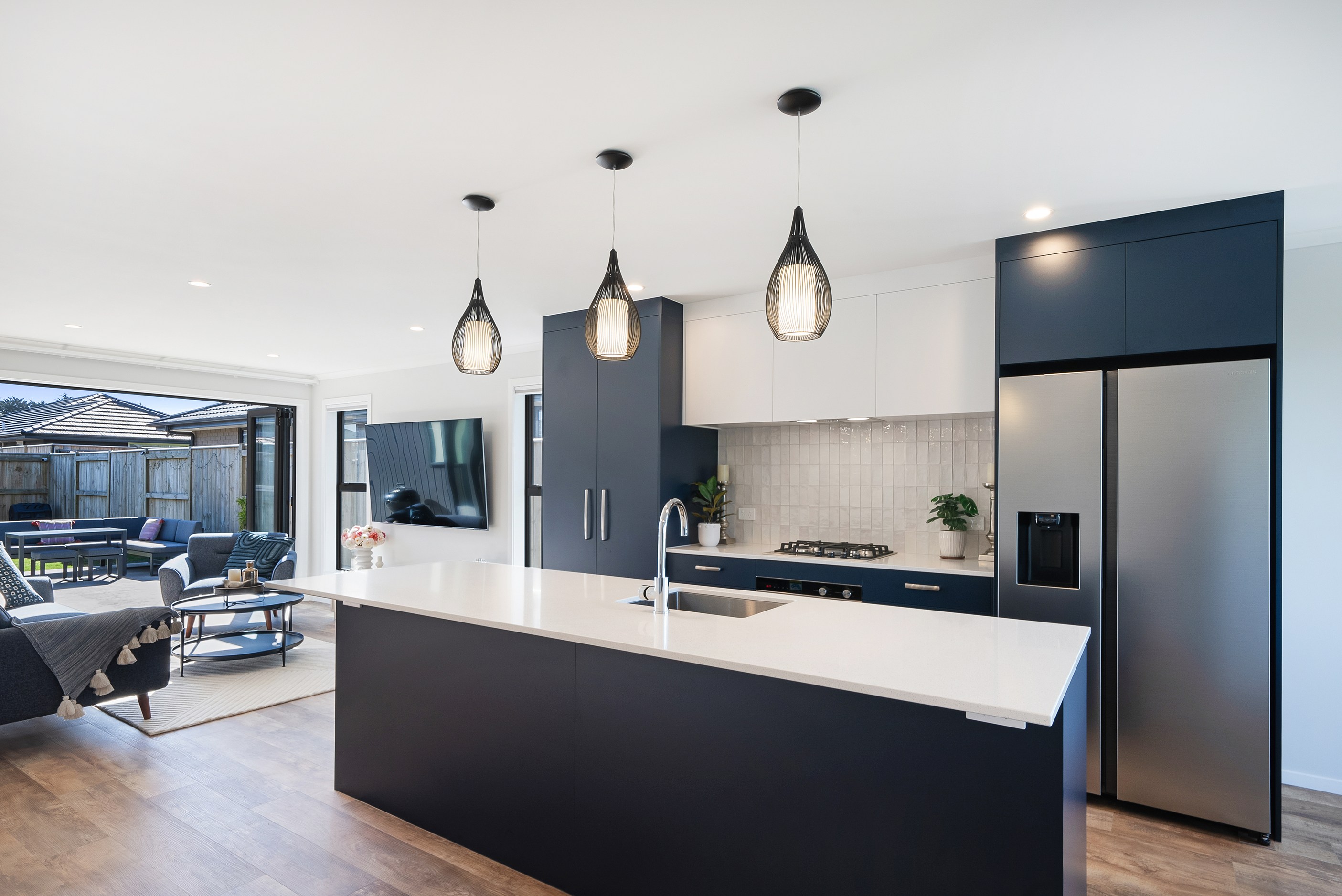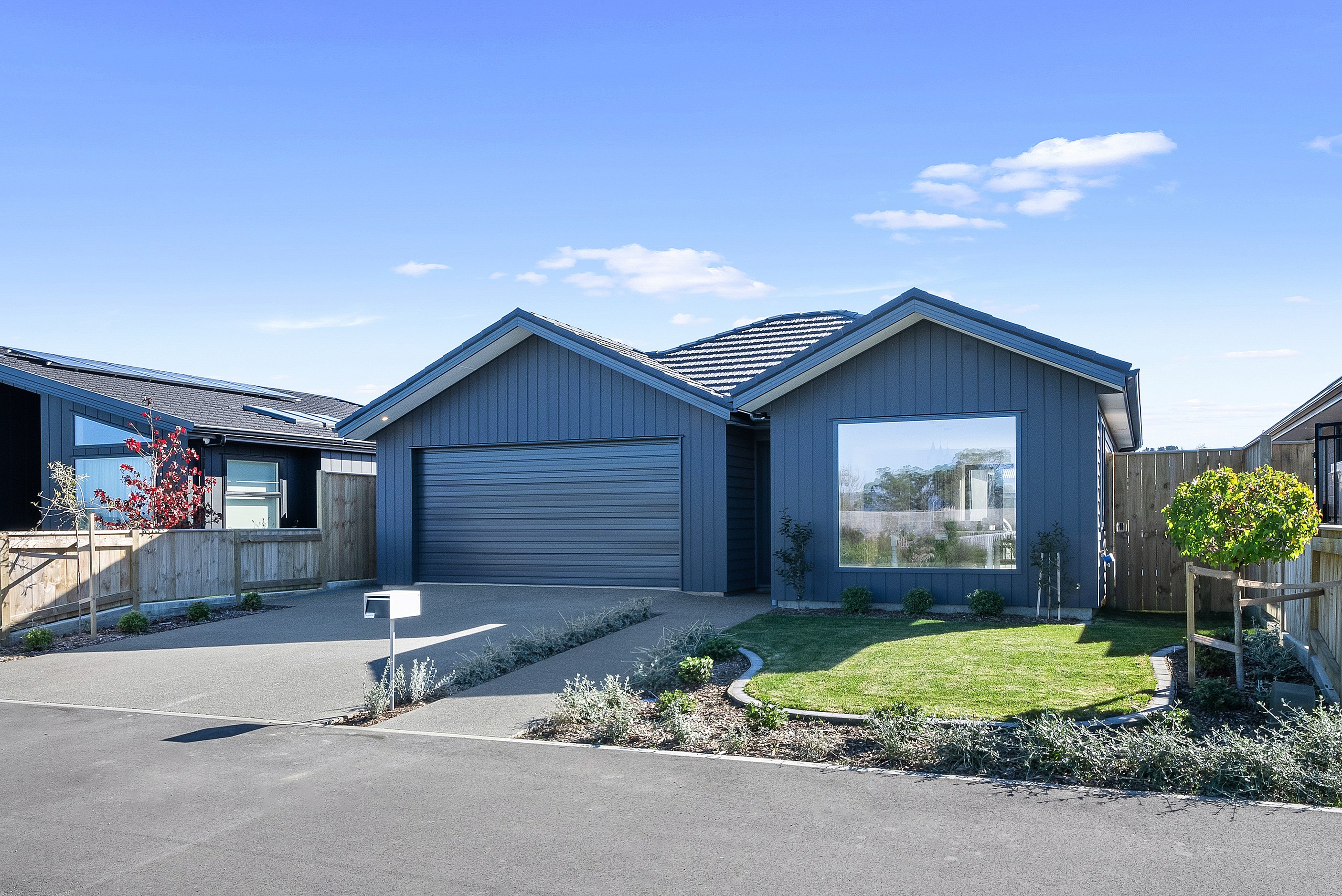 A showstopping picture window in the dining space offers a framed view to Koa Reserve, bringing in both light and tranquillity. The interior palette is clean and modern – timber-look flooring, soft whites, and dark-toned cabinetry bring warmth and cohesion throughout. Both bathrooms are stylish and practical, with floating vanities, black fittings, sleek tiling and thoughtful detailing that enhances everyday comfort. With three double bedrooms, two bathrooms and a double garage, the layout is ideal for a growing household or visiting guests. Every element — from solar orientation to understated finishes — contributes to a home that’s elegant, efficient and designed to stand the test of time