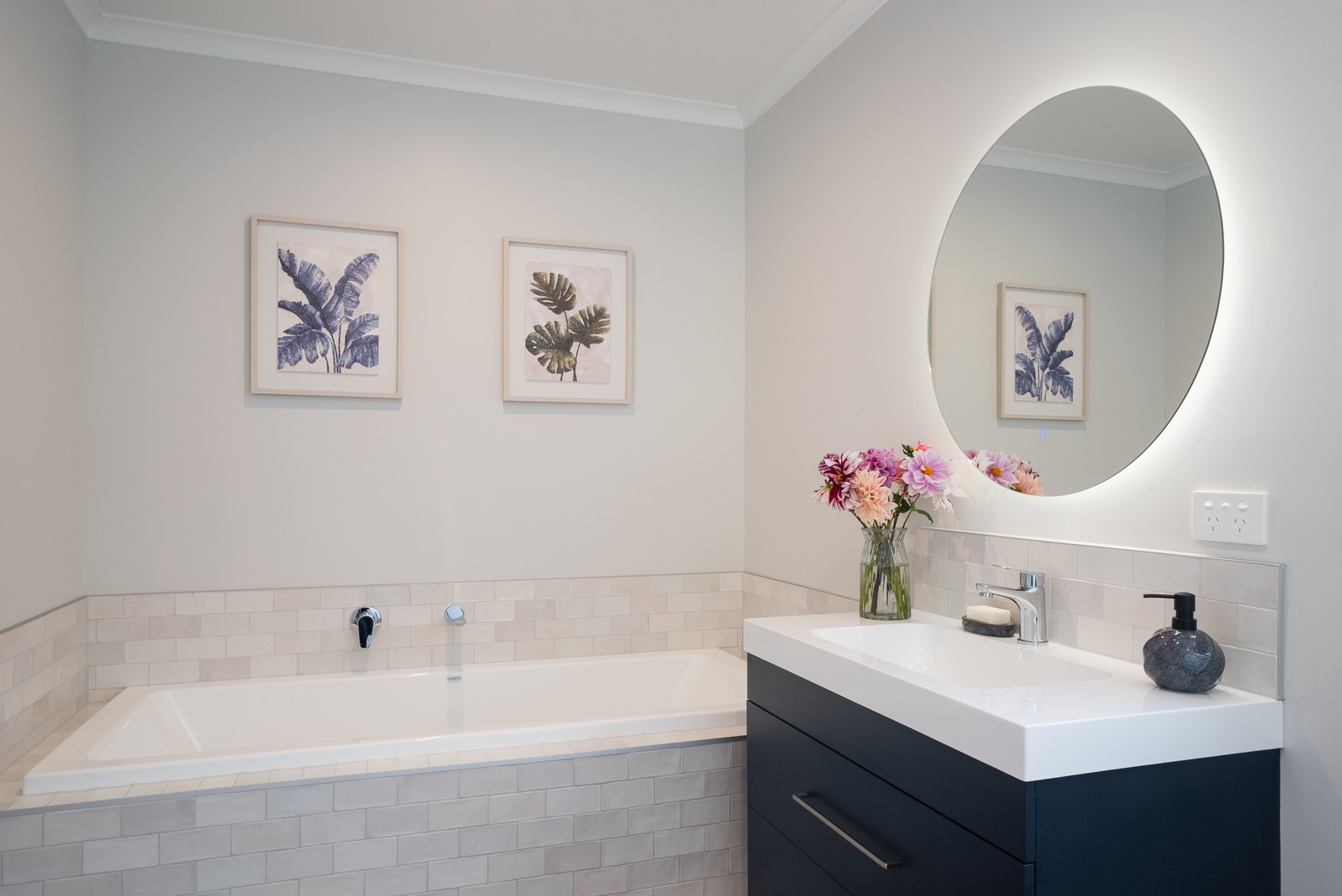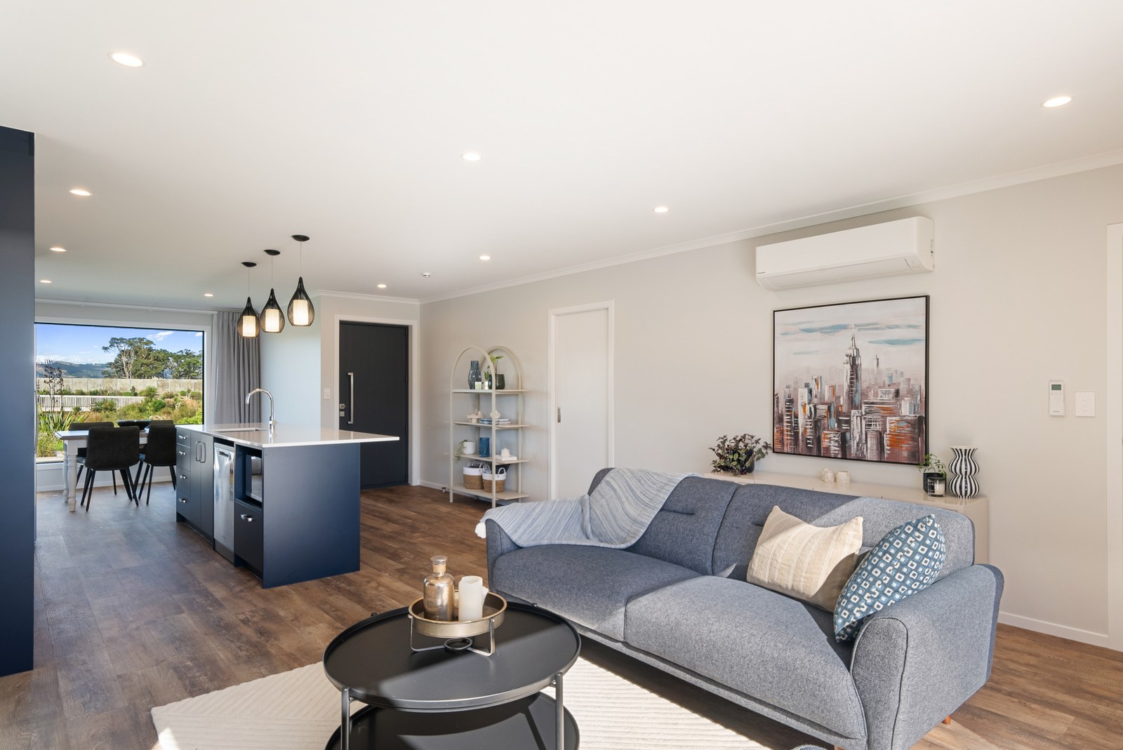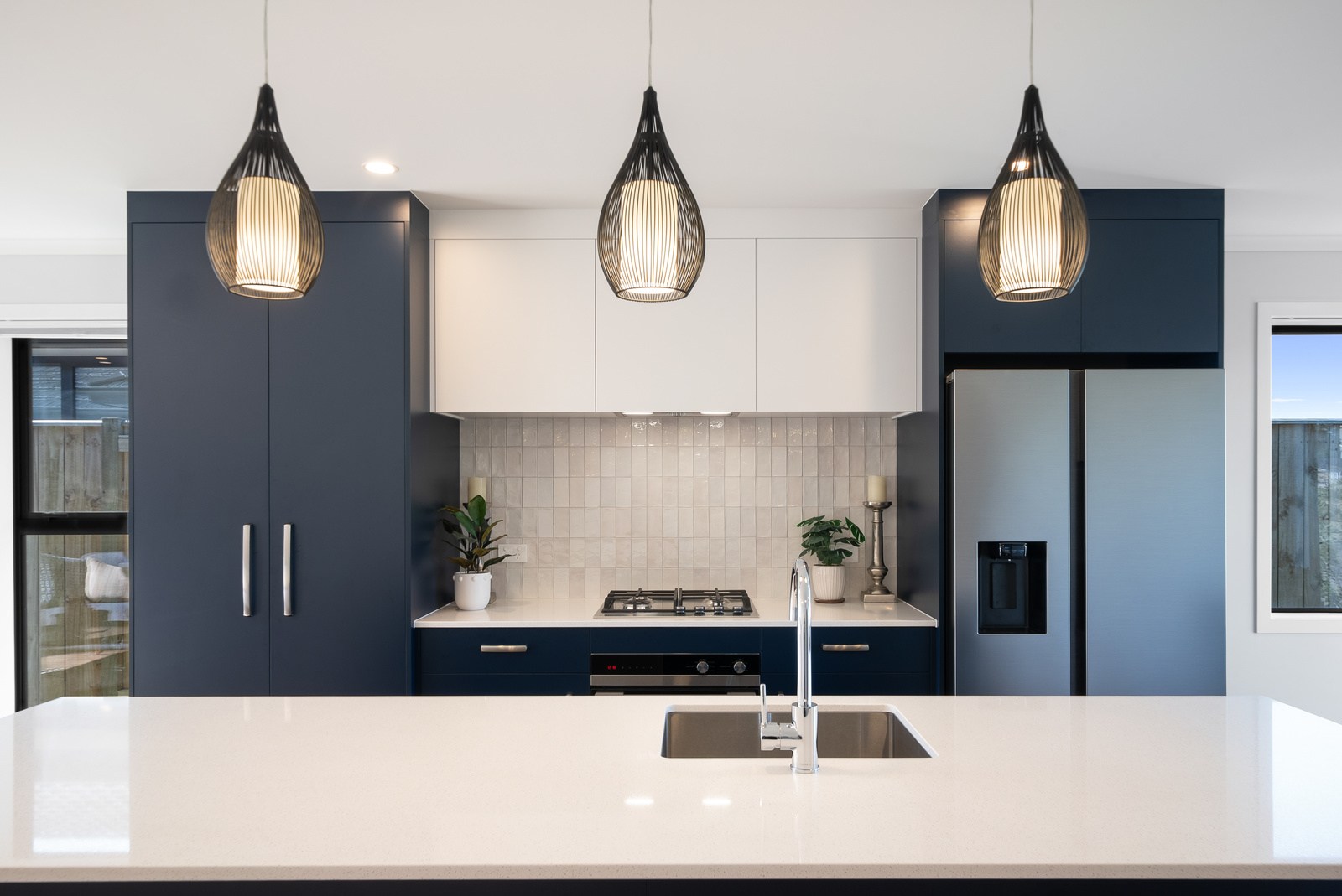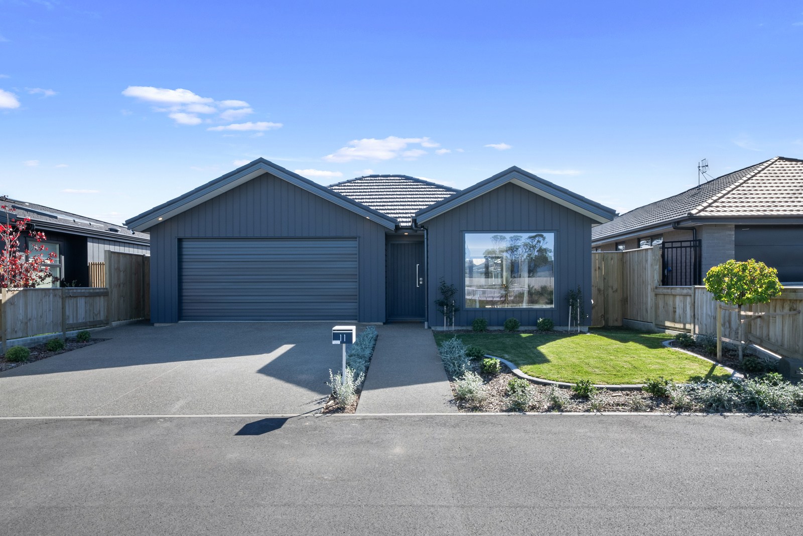 A showstopping picture window in the dining space offers a framed view to Koa Reserve, bringing in both light and tranquillity. The interior palette is clean and modern – timber-look flooring, soft whites, and dark-toned cabinetry bring warmth and cohesion throughout. Both bathrooms are stylish and practical, with floating vanities, black fittings, sleek tiling and thoughtful detailing that enhances everyday comfort. With three double bedrooms, two bathrooms and a double garage, the layout is ideal for a growing household or visiting guests. Every element — from solar orientation to understated finishes — contributes to a home that’s elegant, efficient and designed to stand the test of time