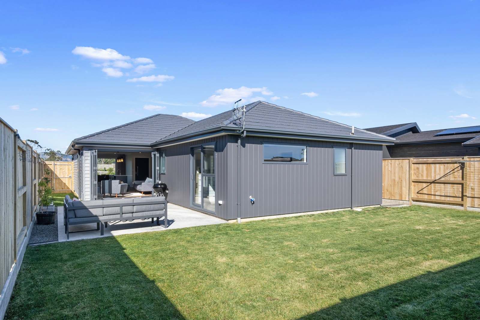 This smart, site-specific build proves that great design doesn’t demand a high price tag. Set against the backdrop of a reserve, the 149sqm home makes the most of its natural outlook, with north-facing living areas and generous glazing that floods the interior with light. At the front, crisp vertical cladding and clean lines shape a modern, low-profile form that feels both calm and confident, while a recessed entry draws you inward. Inside, the kitchen, living and dining zones are open, inviting and functional, extending effortlessly to a sheltered patio for outdoor entertaining or relaxing with family and friends.