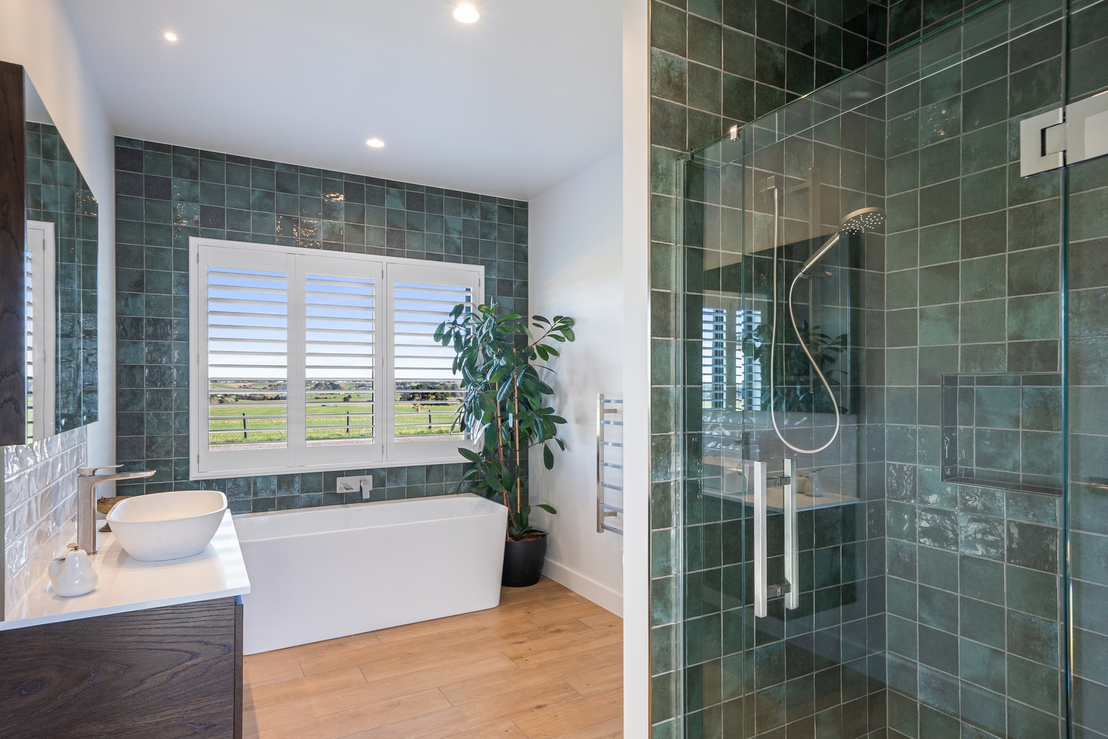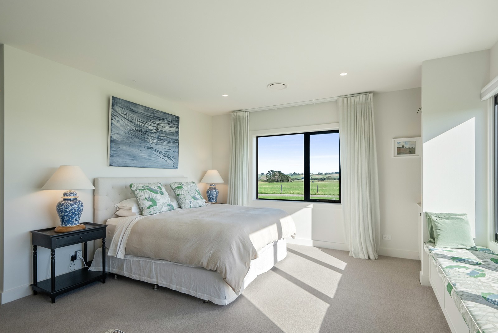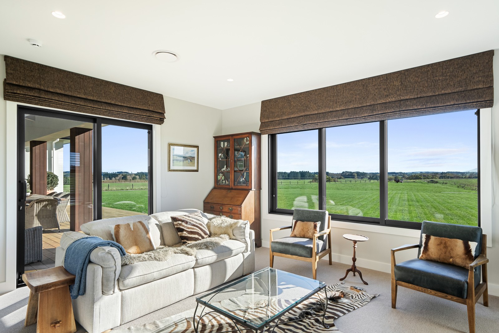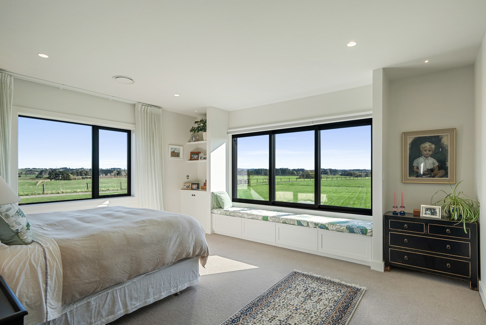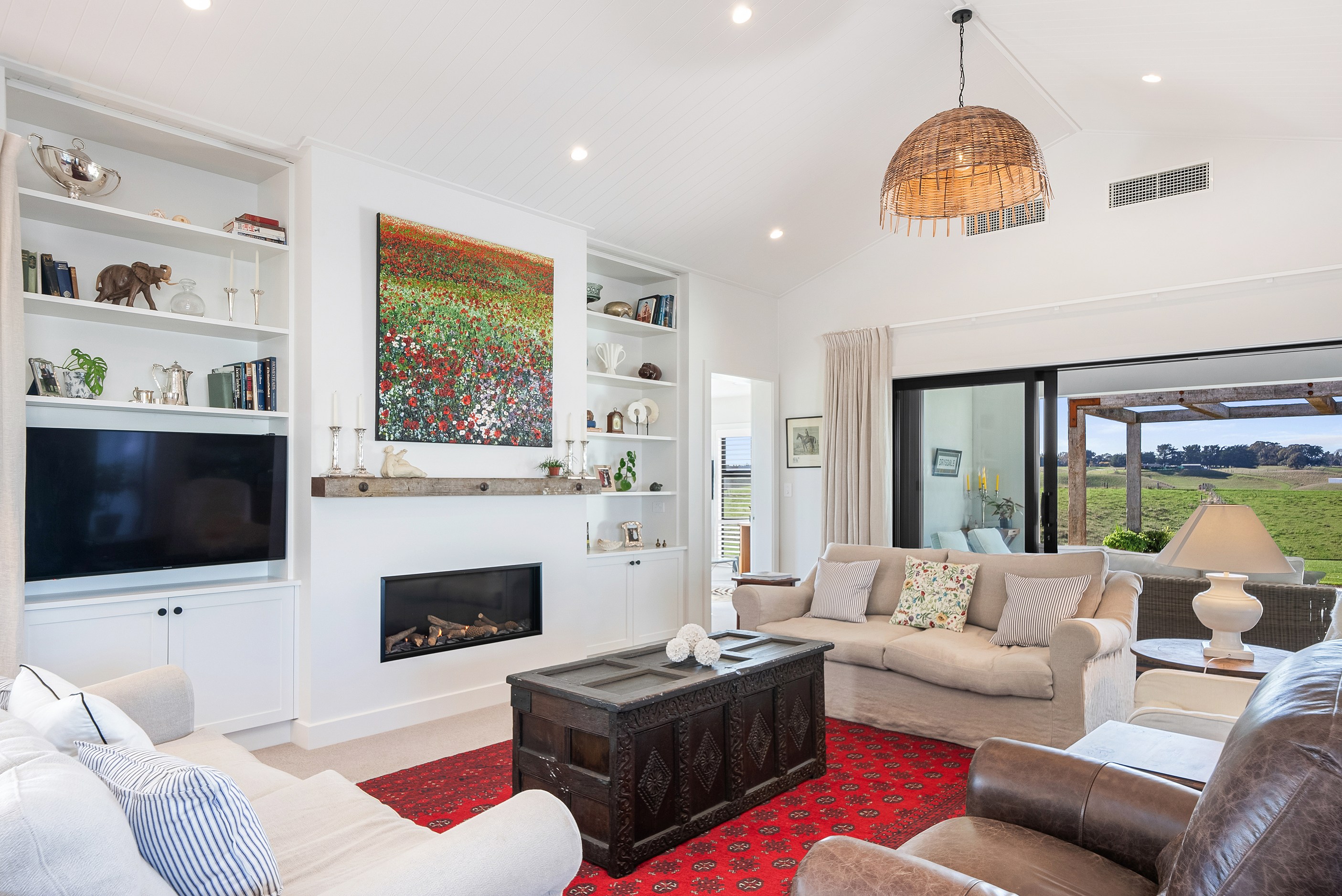 Textural contrast comes through country-style panelled cabinetry, timber flooring, and curved glass pendants that float above the oversized kitchen island. A scullery provides support for large-scale hosting, while the lounge and dining spaces flow on to a pergola-framed patio and beyond to green pastures and open skies. The main bedroom includes a charming window seat and dual-aspect windows that frame uninterrupted countryside views. A luxurious bathroom features richly toned wall tiles, timber cabinetry and a deep soaking tub set beneath louvred shutters. Every detail has been considered to deliver both character and clarity.