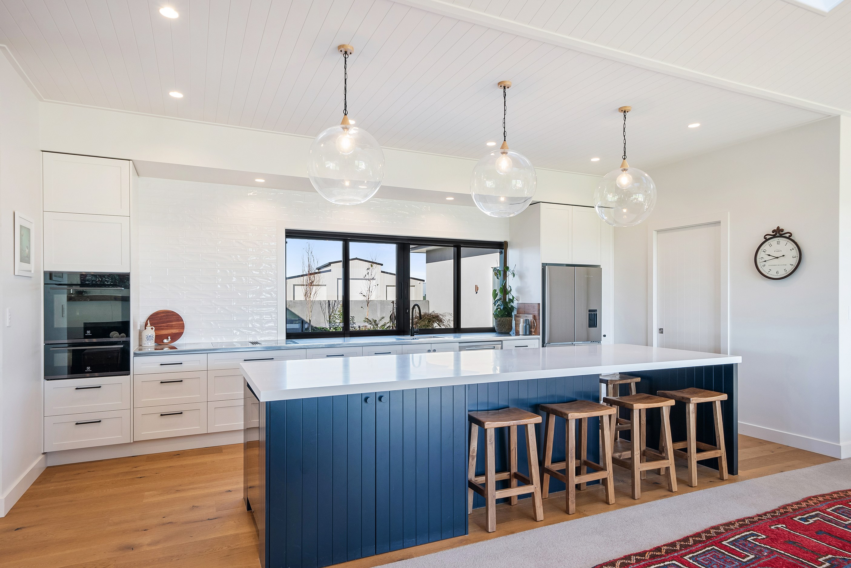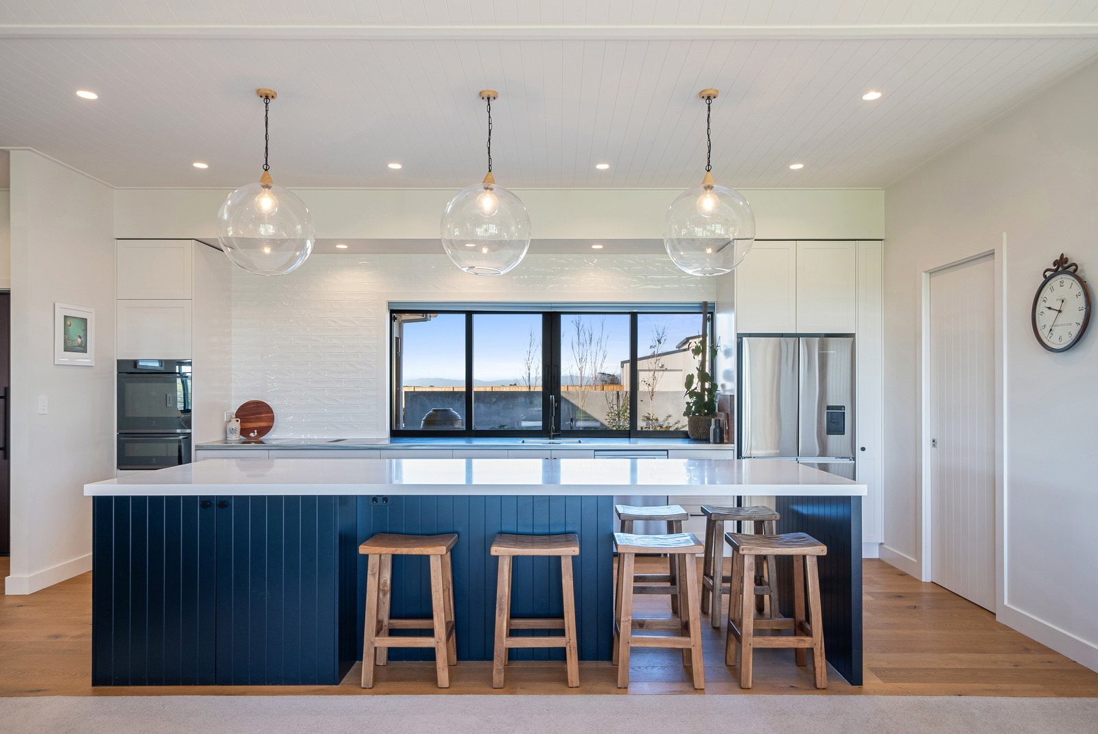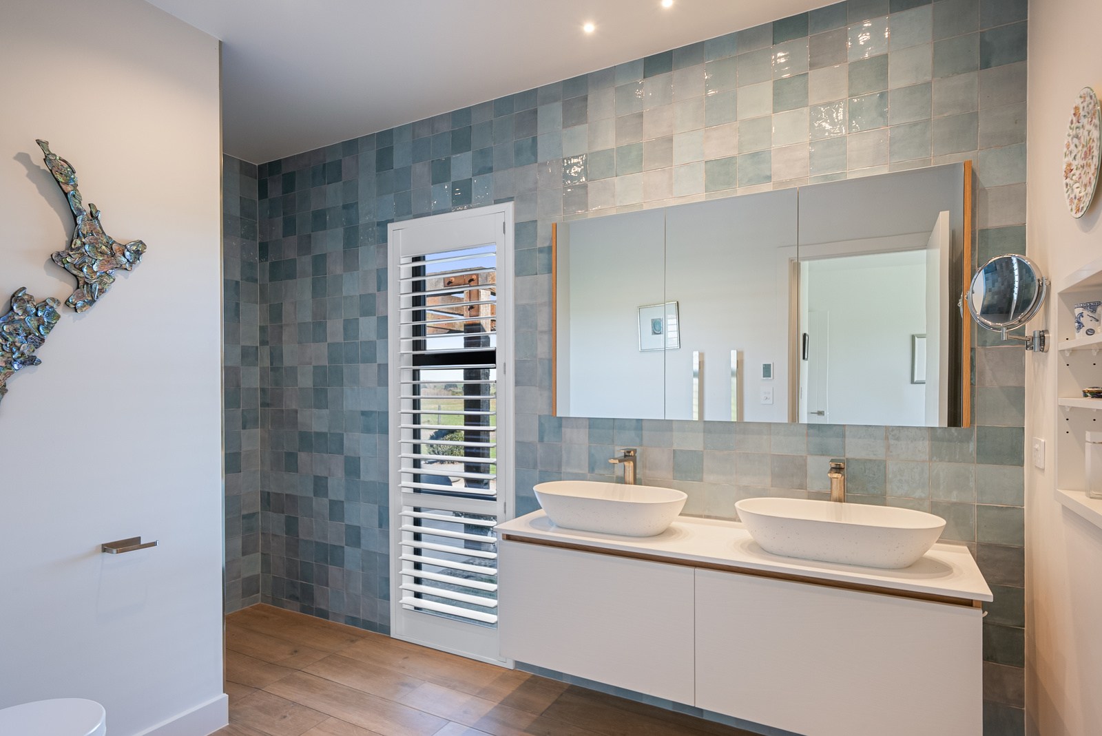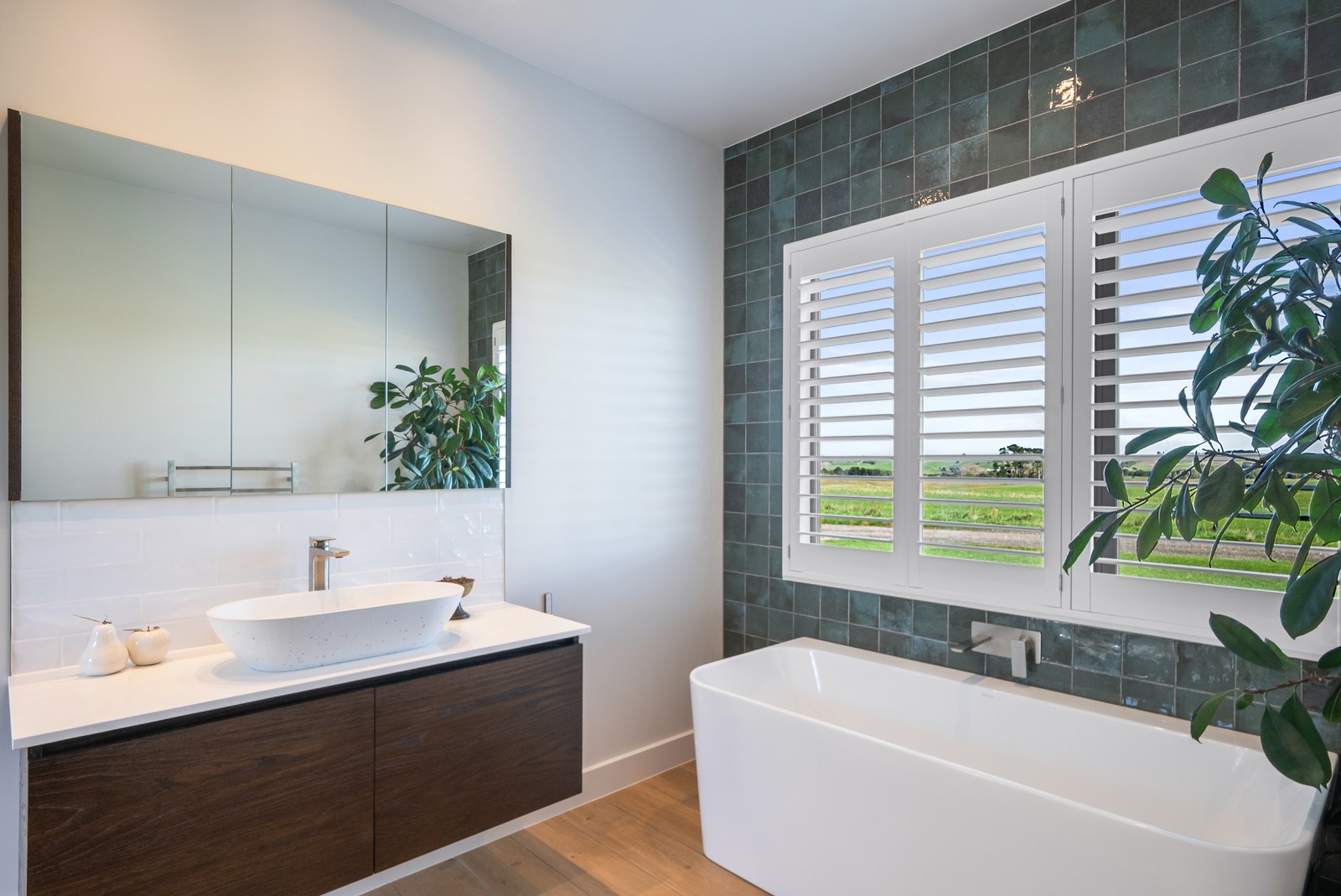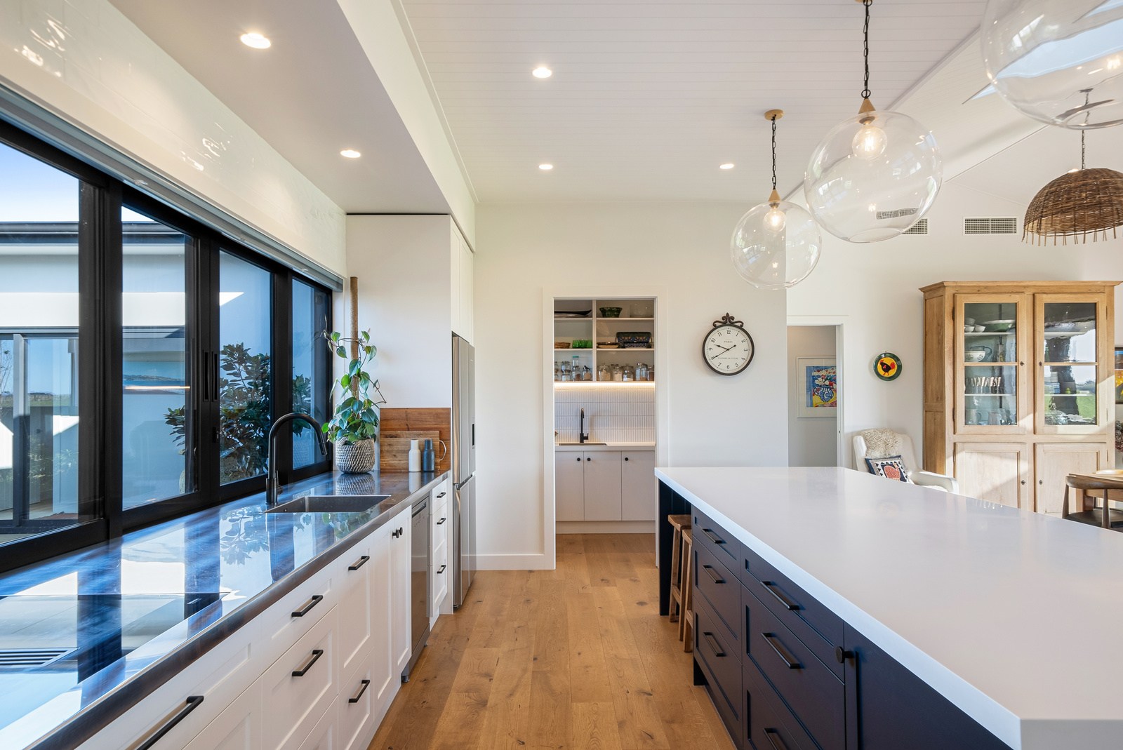 Textural contrast comes through country-style panelled cabinetry, timber flooring, and curved glass pendants that float above the oversized kitchen island. A scullery provides support for large-scale hosting, while the lounge and dining spaces flow on to a pergola-framed patio and beyond to green pastures and open skies. The main bedroom includes a charming window seat and dual-aspect windows that frame uninterrupted countryside views. A luxurious bathroom features richly toned wall tiles, timber cabinetry and a deep soaking tub set beneath louvred shutters. Every detail has been considered to deliver both character and clarity.