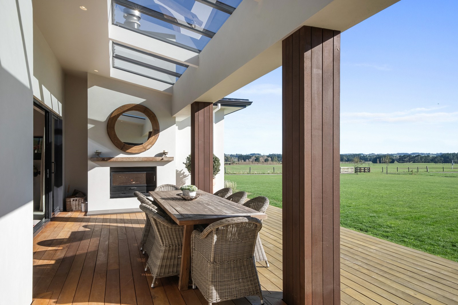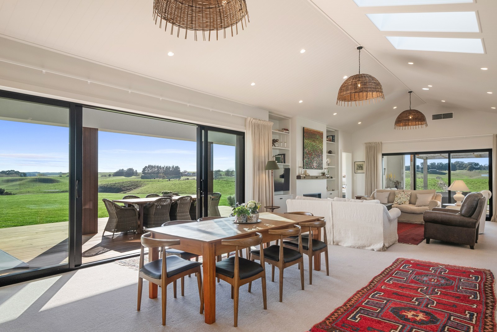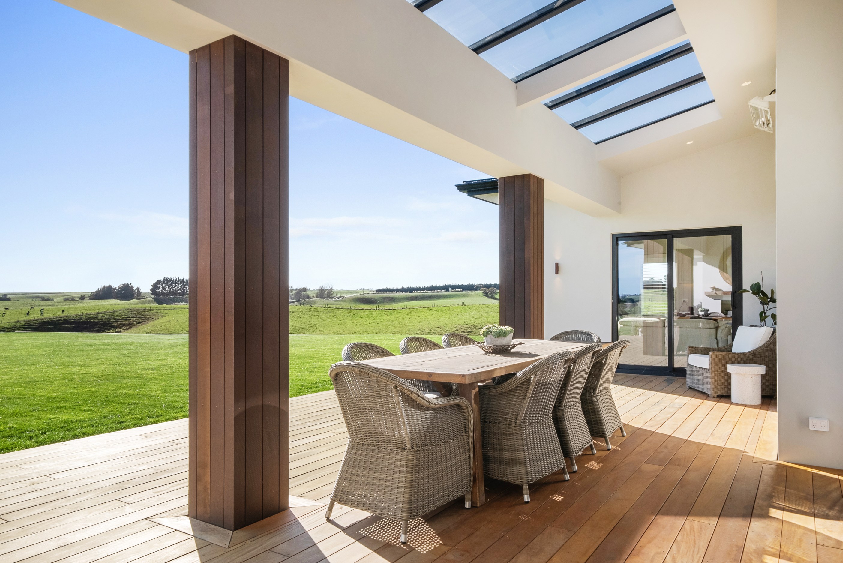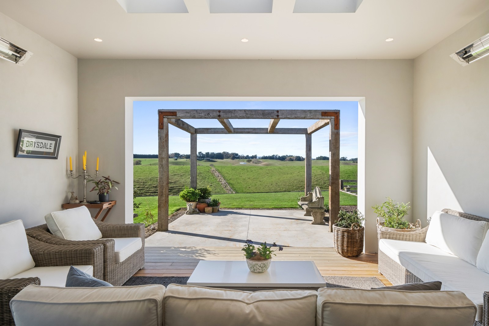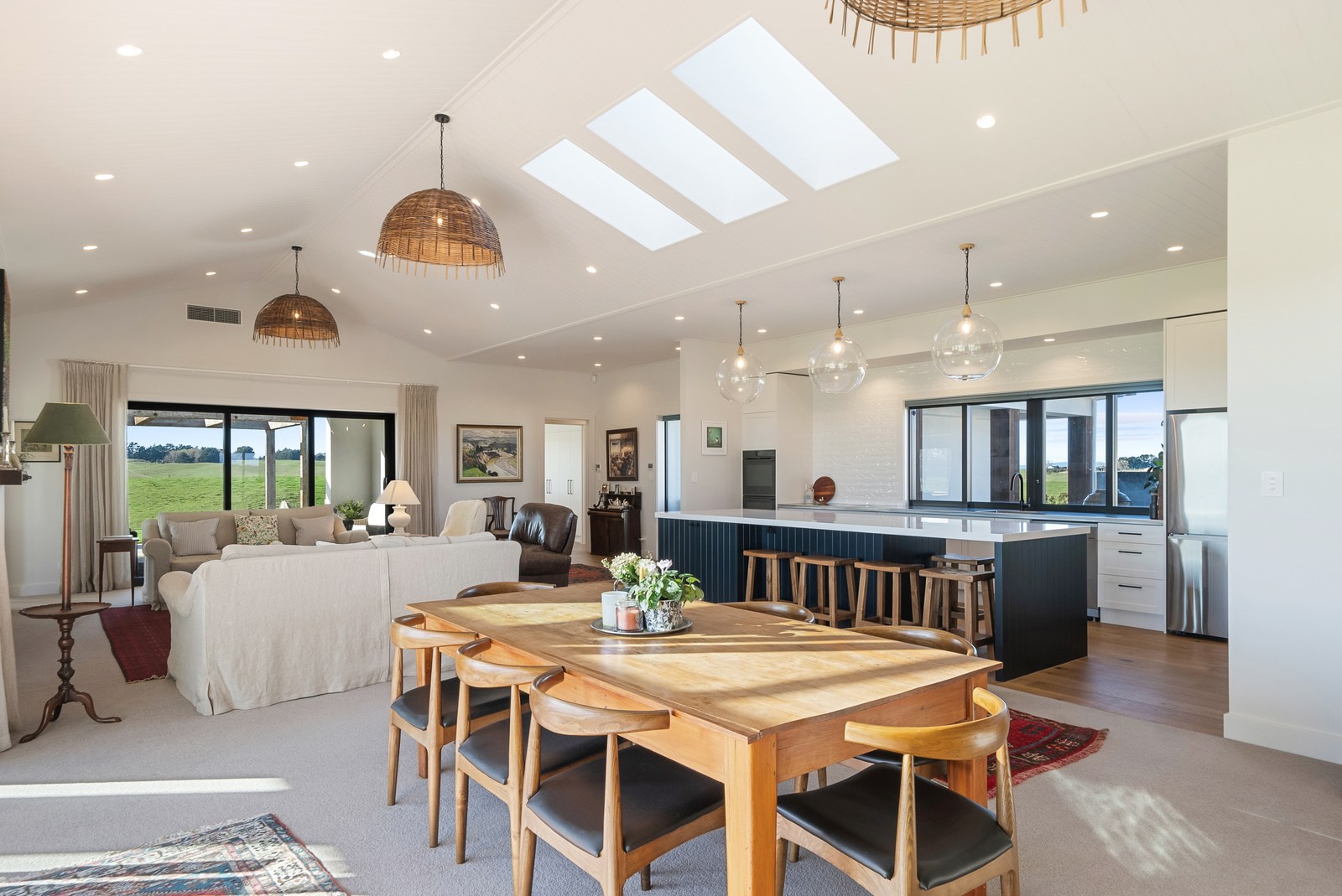 Set amid expansive views of rolling farmland, this four-bedroom, two-bathroom retreat is made for rural living. A walled gravel courtyard, complete with planter boxes and a water feature, creates a welcoming approach, while generous garaging is practical in this setting. Covered outdoor living zones are anchored by a built-in fireplace, offering a warm, sheltered vantage point to enjoy the shifting light as it colours the surrounding landscape. Inside, the 337sqm layout blends timeless materials with contemporary ease. Traditional farmhouse cues — weathered timber features, crisp plaster and deep eaves — give way to expansive, open-plan living, where three skylights draw light into the heart of the home.