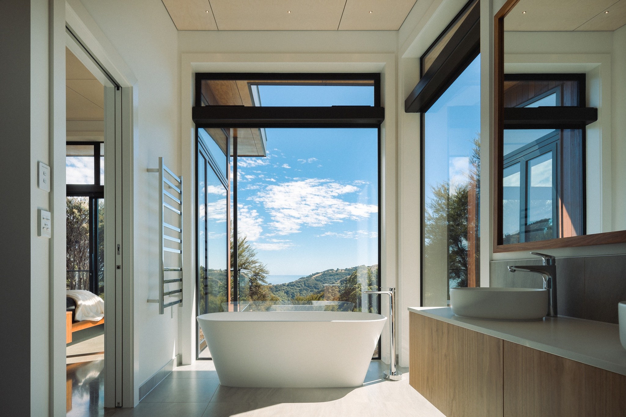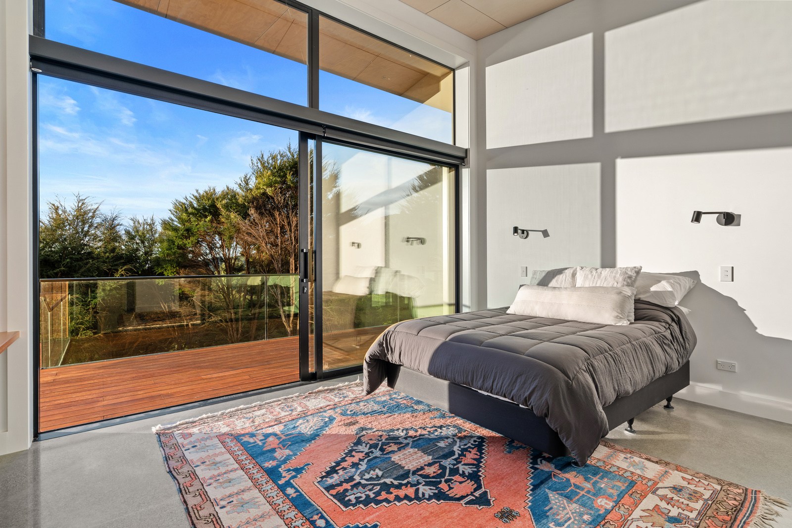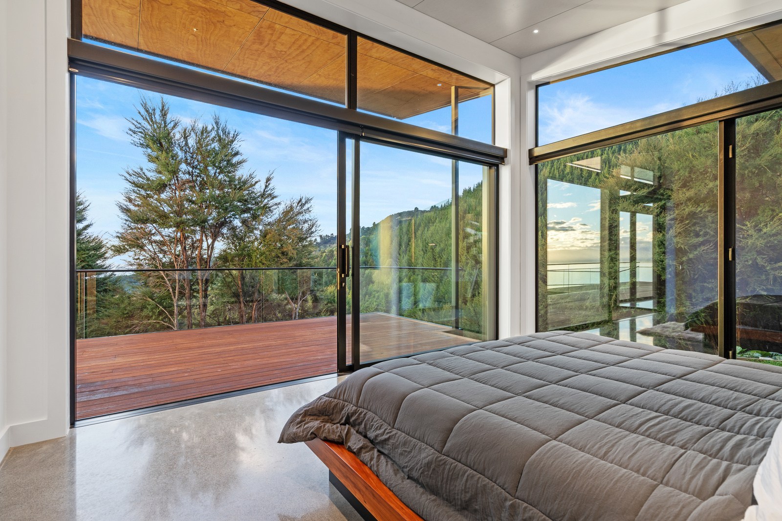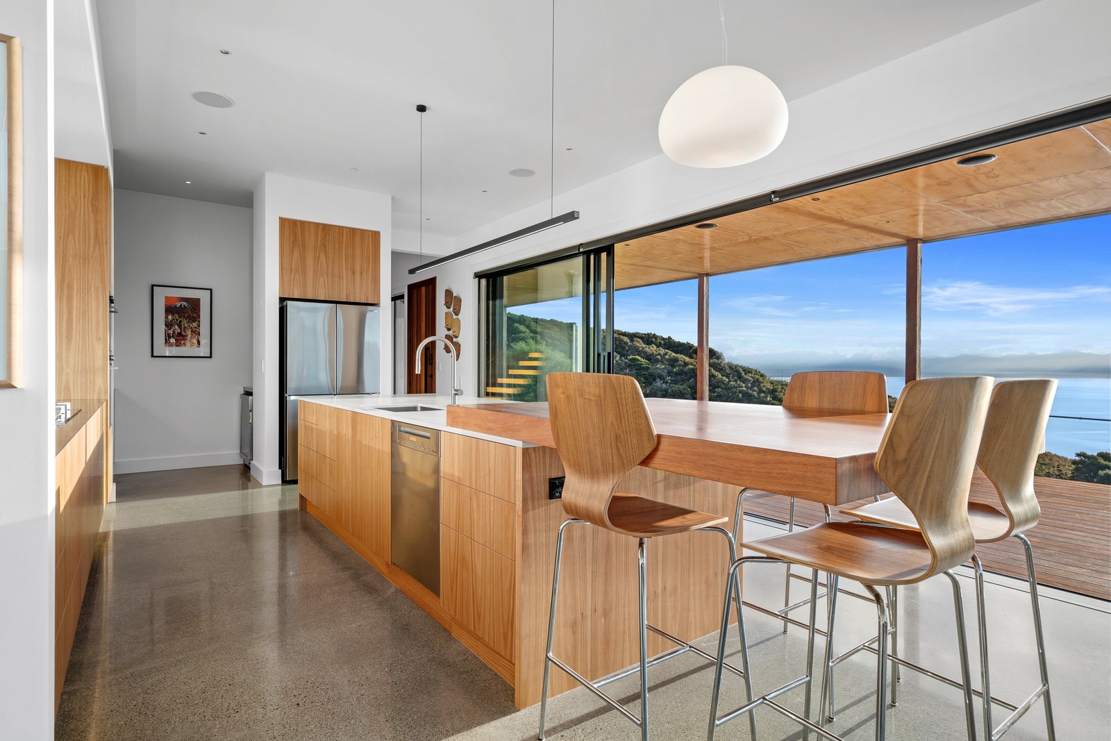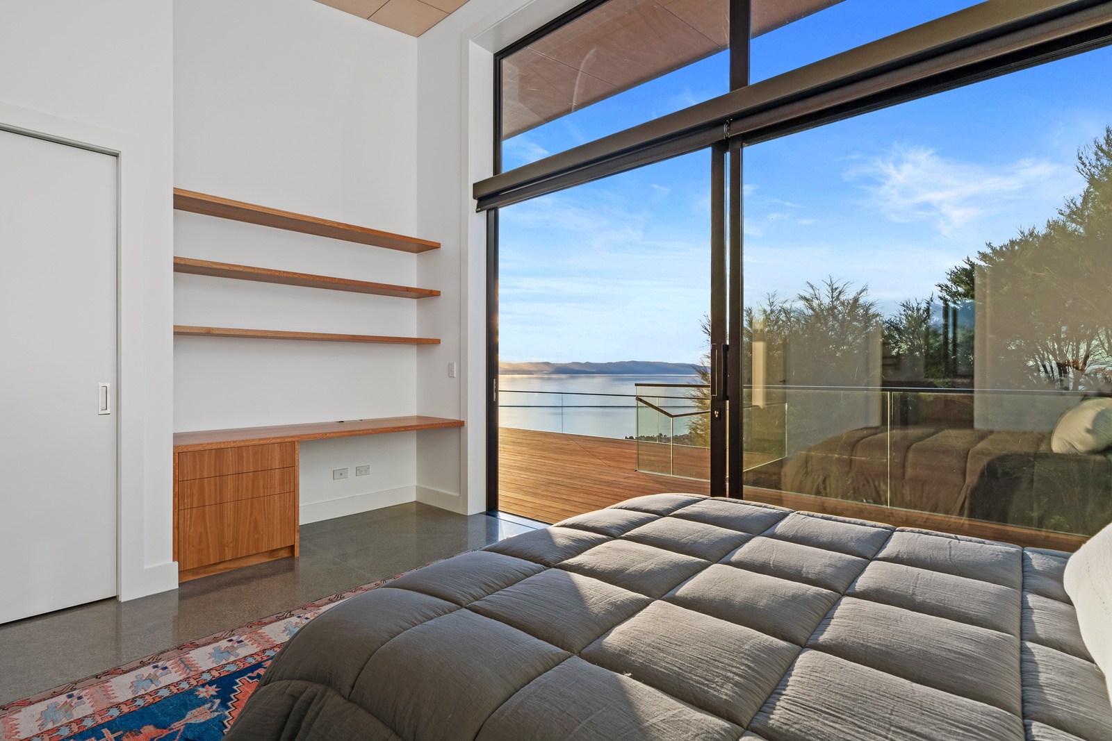 Inside, the design sings with textural richness and artisanal detail. A dramatic oak staircase, mounted on a steel portal frame, welcomes visitors. The kitchen anchors the living space, while custom-built elements — including birch ply and Tasmanian blackwood and oak shelving, and a main bed that mixes modern lines with natural materials — imbue the home with character. You’ll also find a cedar-lined sauna and, upstairs, an oak-floored art studio overlooking the Tasman. With 75 solar panels powering a photovoltaic system and hydronic heating laid beneath the polished-concrete floors, comfort here is conscious and quietly confident. This is more than a statement home — it’s a lifestyle manifesto. With refined sustainability at its heart and luxury in every detail, this build proves going off-grid doesn’t mean going without.
