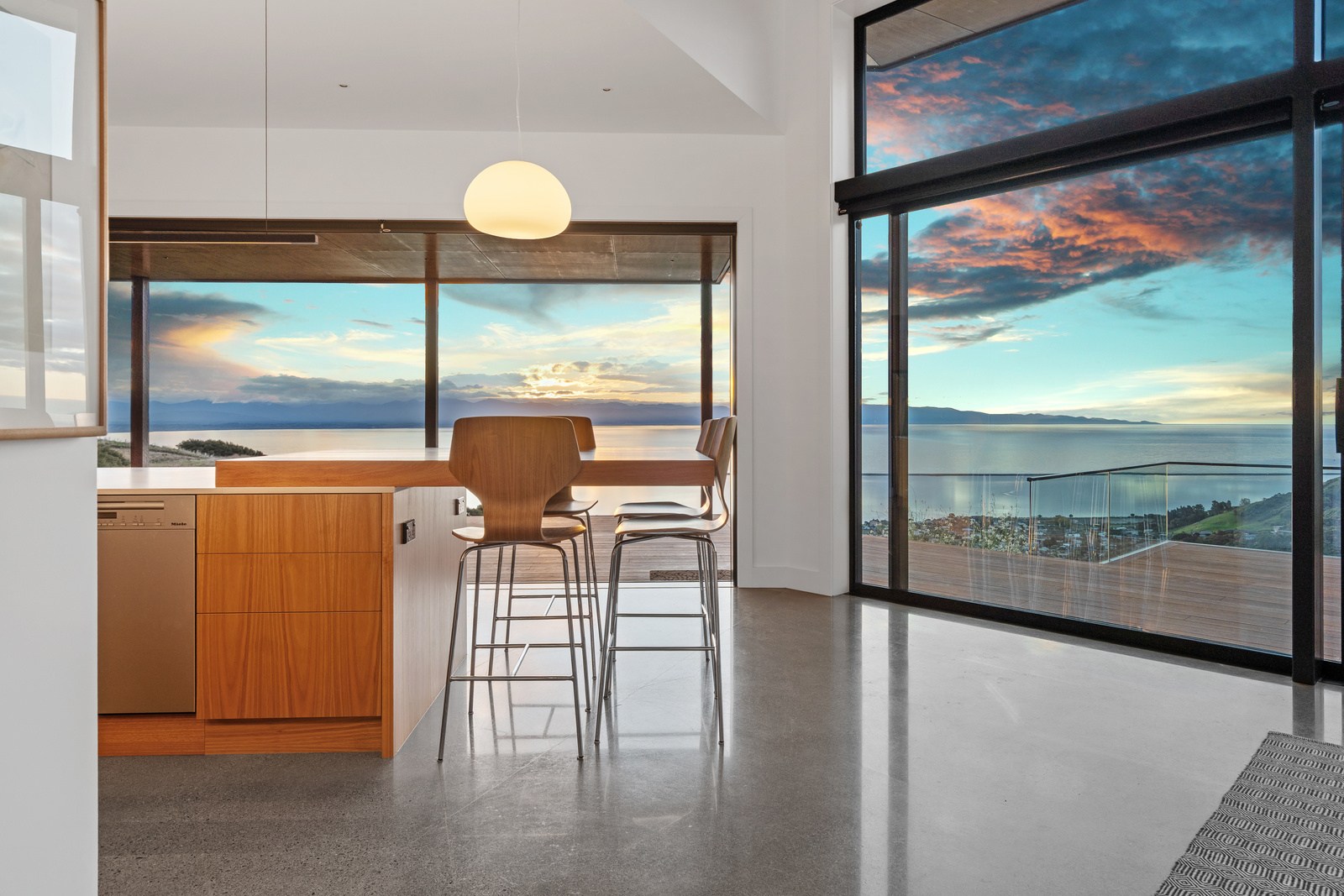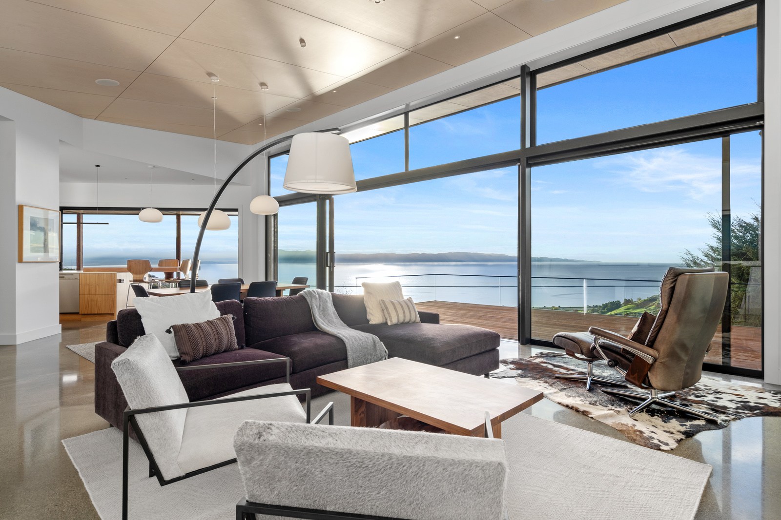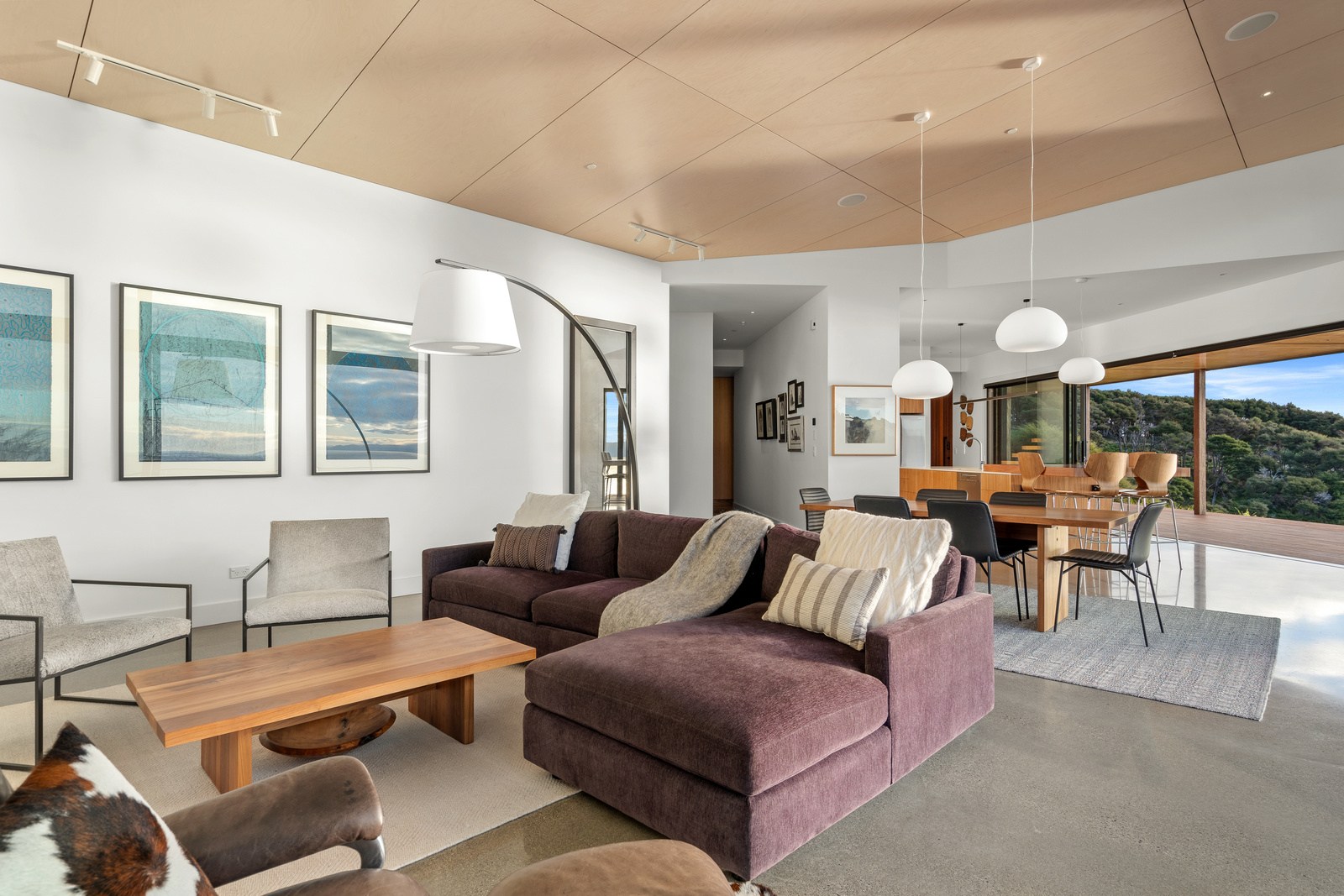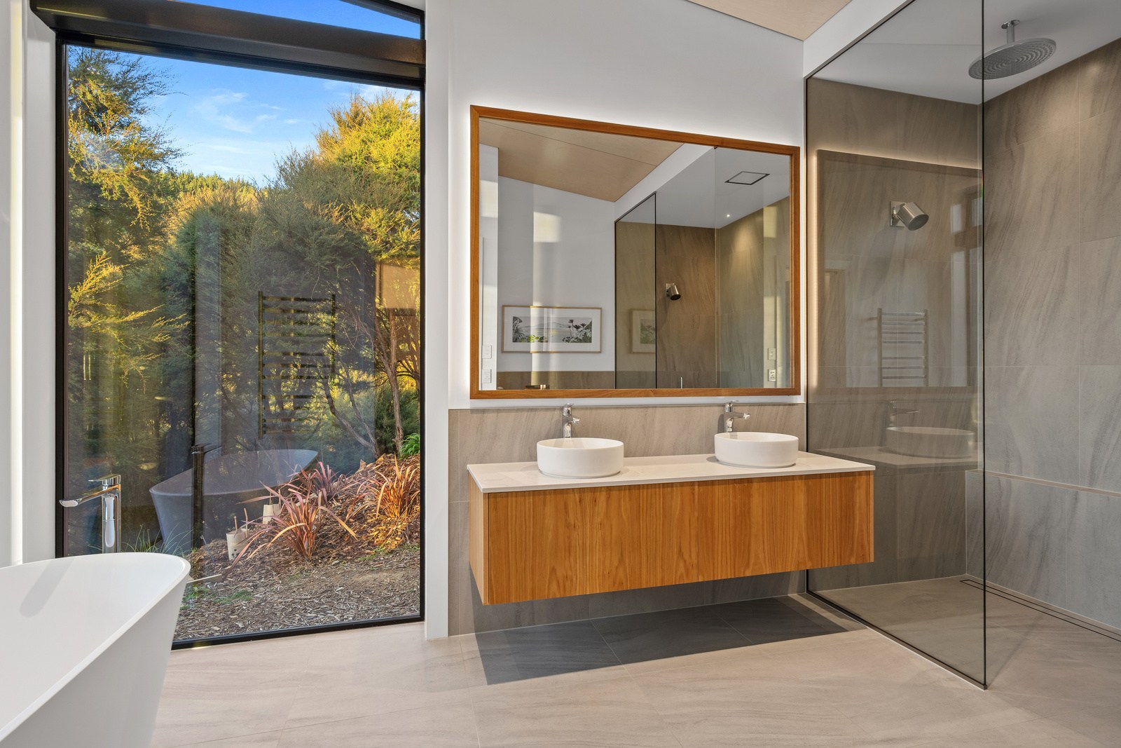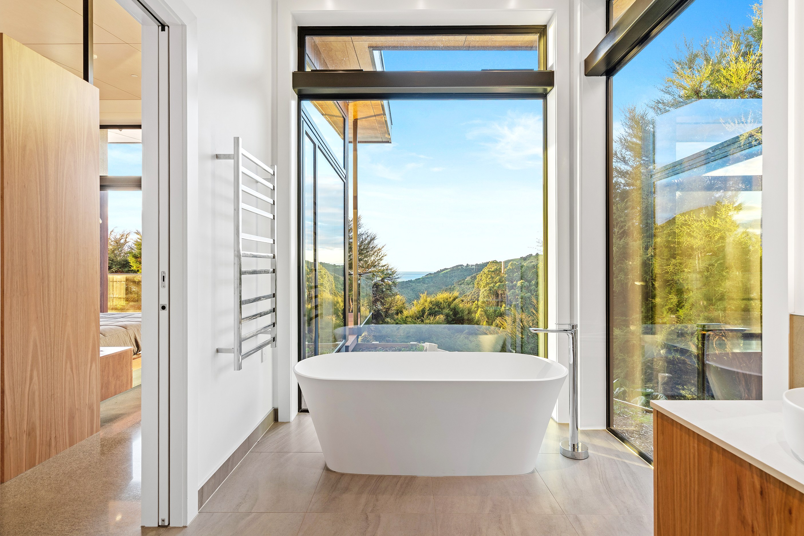 Inside, the design sings with textural richness and artisanal detail. A dramatic oak staircase, mounted on a steel portal frame, welcomes visitors. The kitchen anchors the living space, while custom-built elements — including birch ply and Tasmanian blackwood and oak shelving, and a main bed that mixes modern lines with natural materials — imbue the home with character. You’ll also find a cedar-lined sauna and, upstairs, an oak-floored art studio overlooking the Tasman. With 75 solar panels powering a photovoltaic system and hydronic heating laid beneath the polished-concrete floors, comfort here is conscious and quietly confident. This is more than a statement home — it’s a lifestyle manifesto. With refined sustainability at its heart and luxury in every detail, this build proves going off-grid doesn’t mean going without.