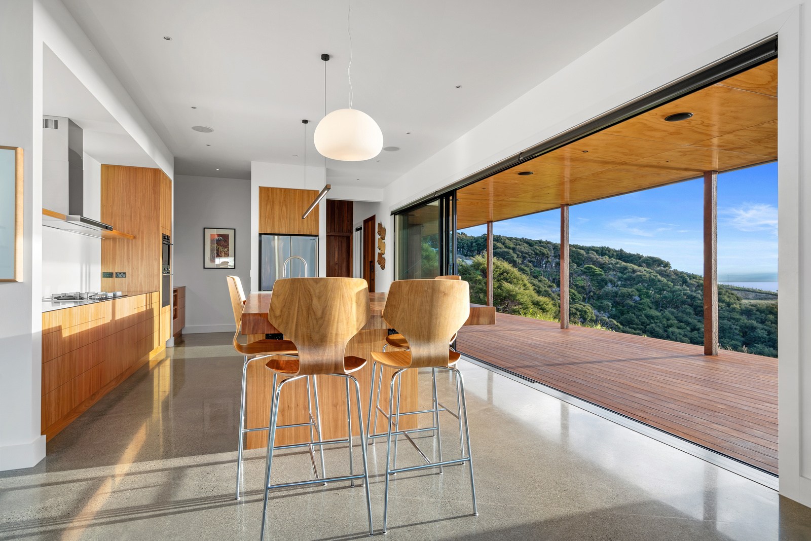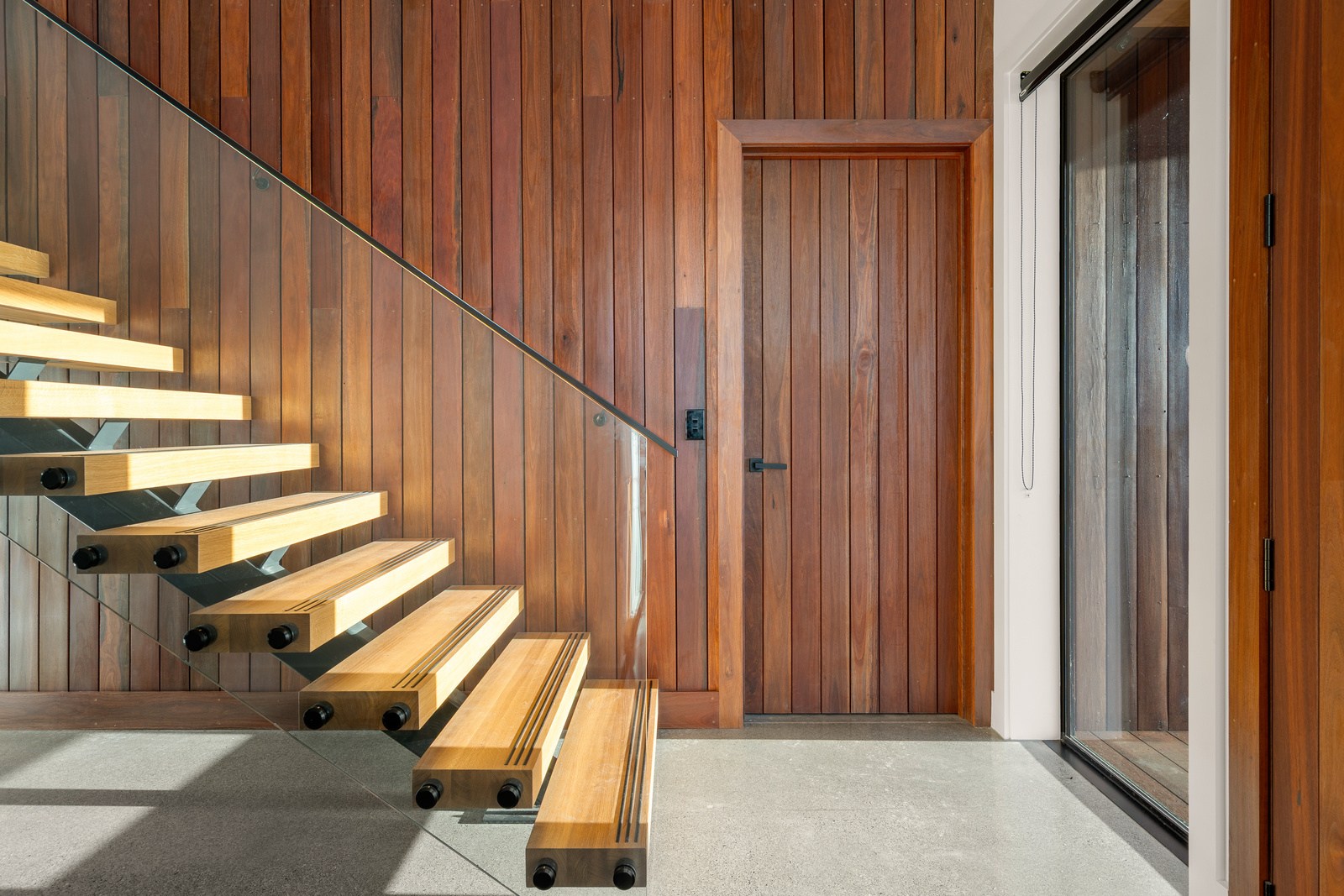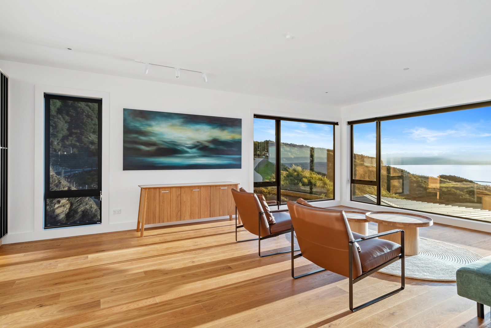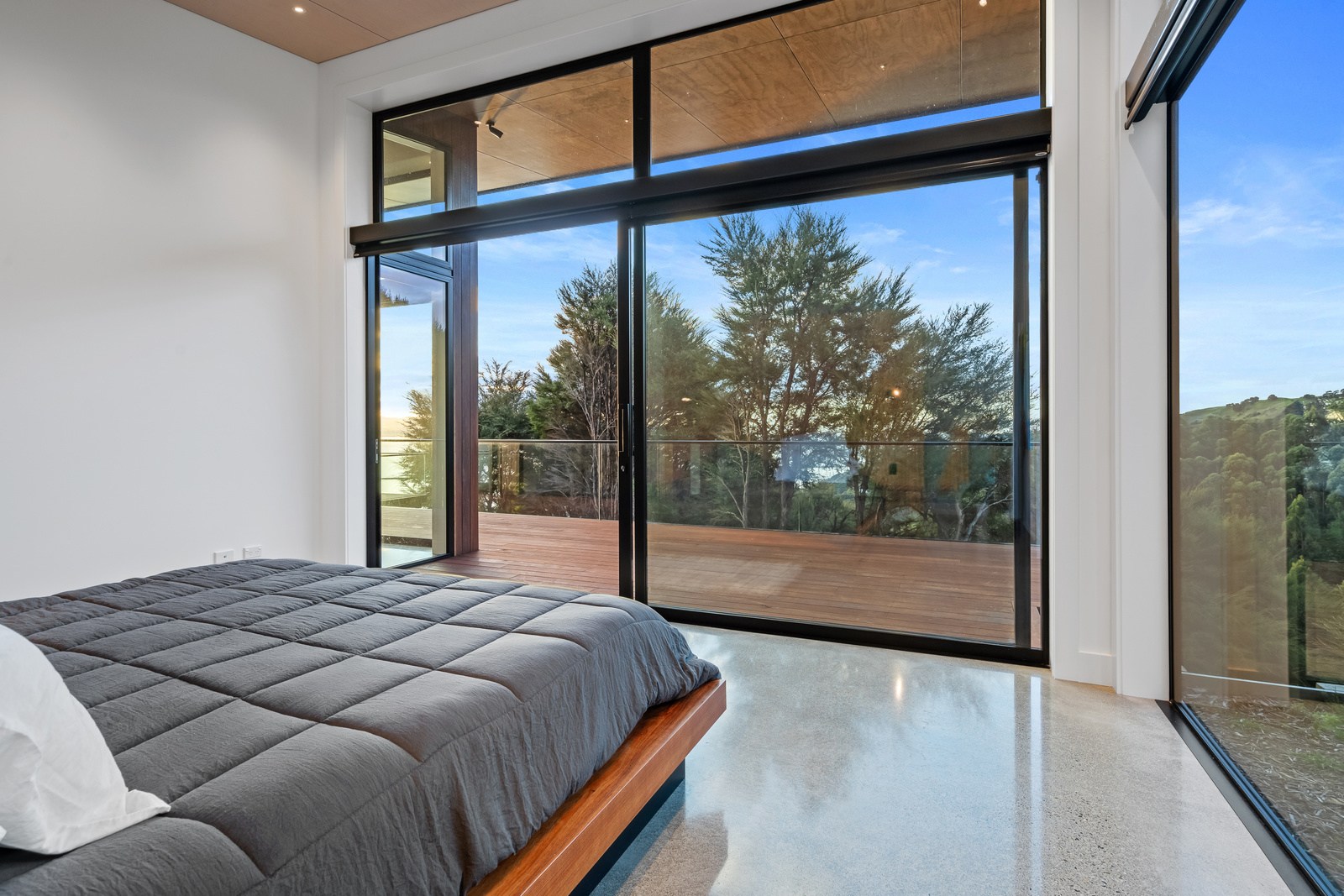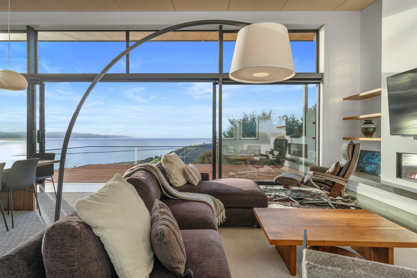 Inside, the design sings with textural richness and artisanal detail. A dramatic oak staircase, mounted on a steel portal frame, welcomes visitors. The kitchen anchors the living space, while custom-built elements — including birch ply and Tasmanian blackwood and oak shelving, and a main bed that mixes modern lines with natural materials — imbue the home with character. You’ll also find a cedar-lined sauna and, upstairs, an oak-floored art studio overlooking the Tasman. With 75 solar panels powering a photovoltaic system and hydronic heating laid beneath the polished-concrete floors, comfort here is conscious and quietly confident. This is more than a statement home — it’s a lifestyle manifesto. With refined sustainability at its heart and luxury in every detail, this build proves going off-grid doesn’t mean going without.