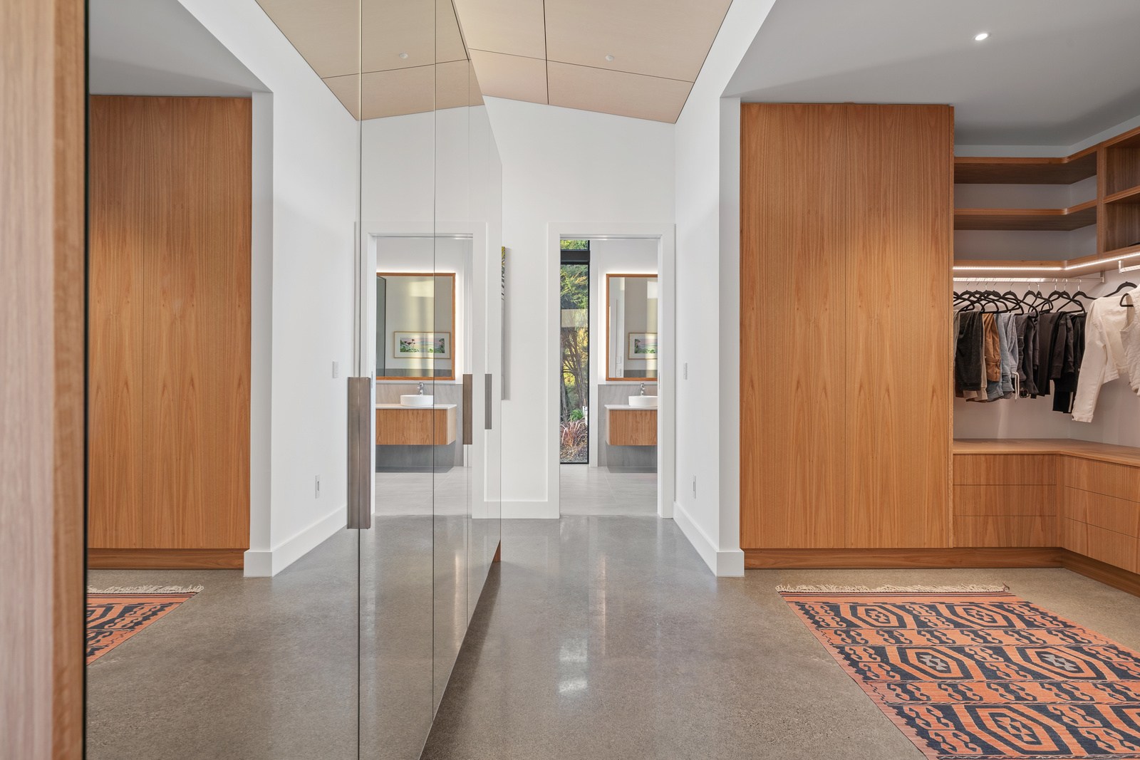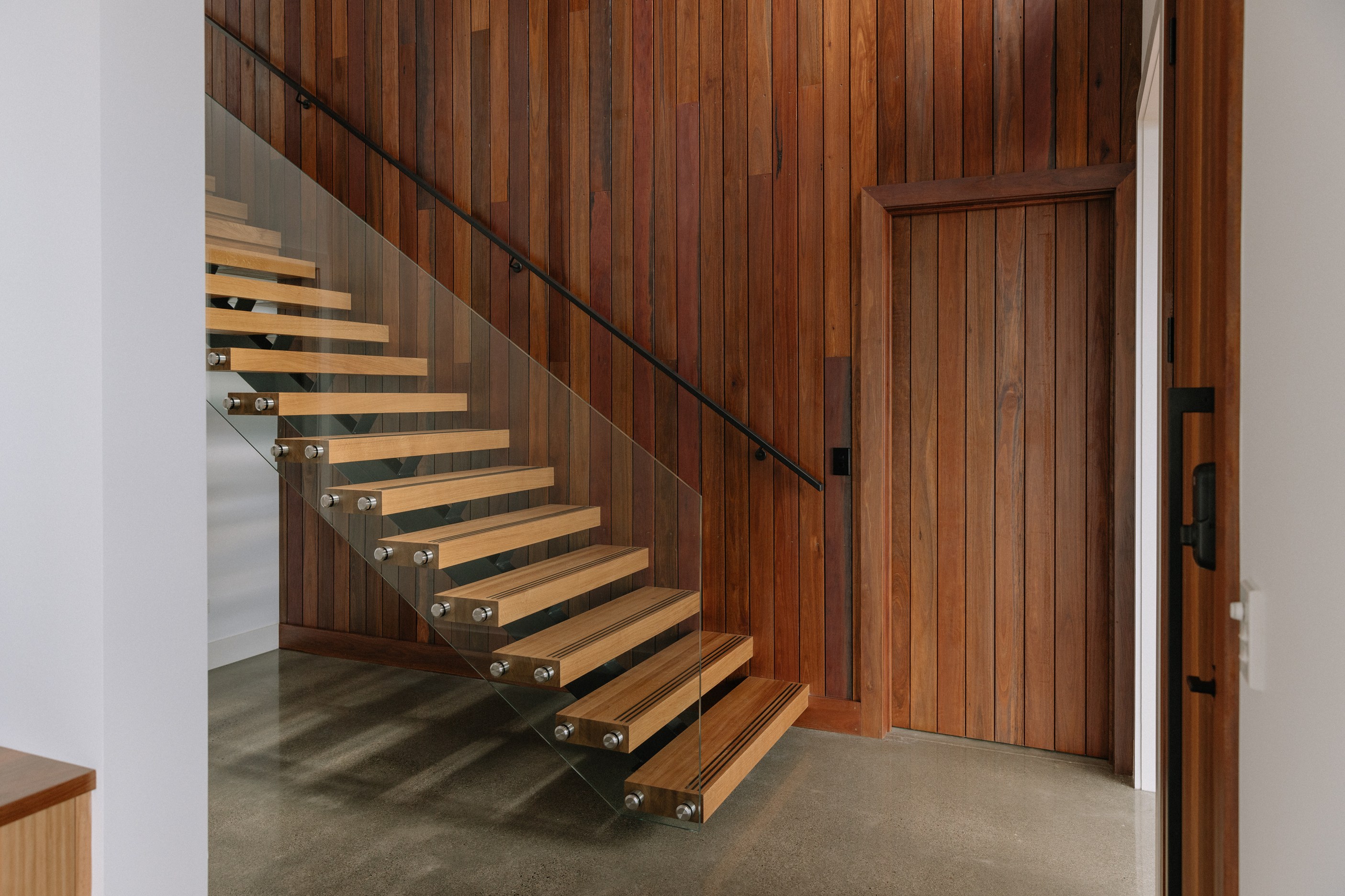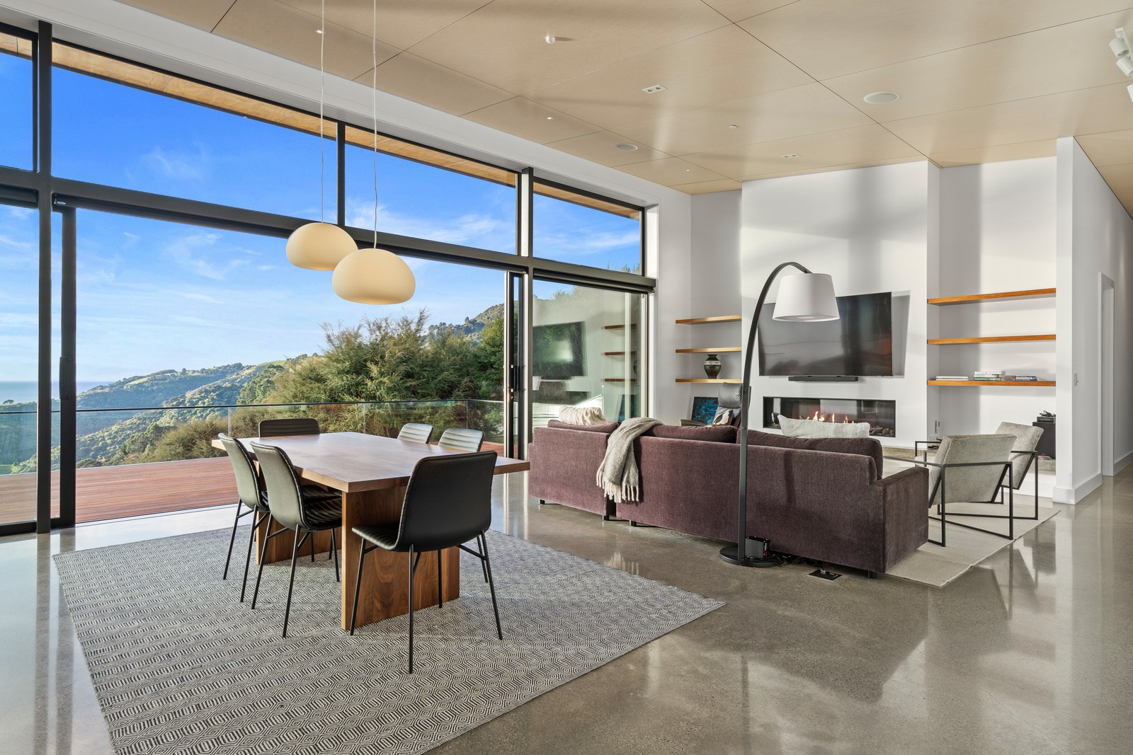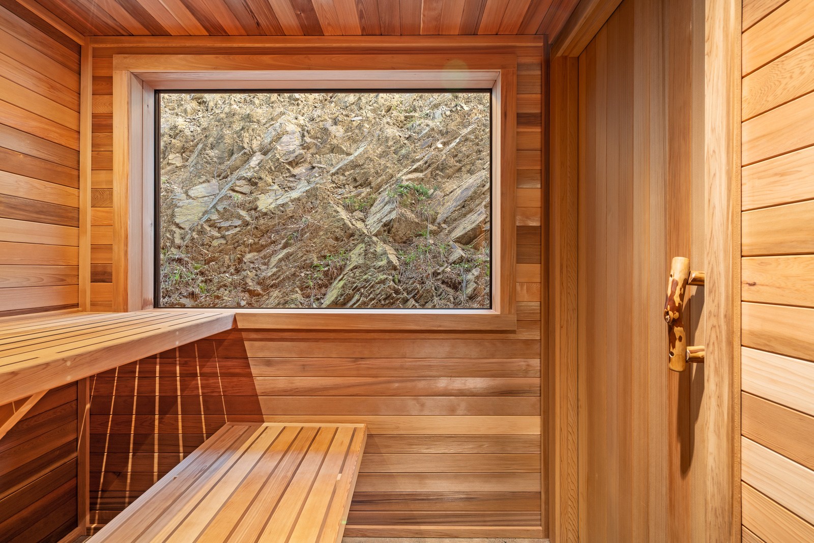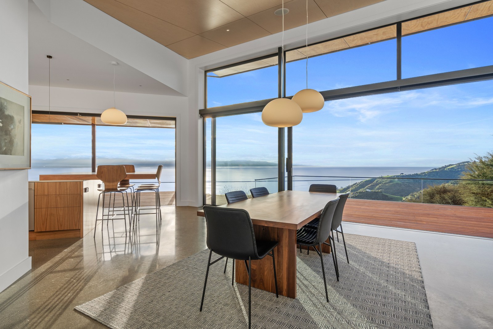 Inside, the design sings with textural richness and artisanal detail. A dramatic oak staircase, mounted on a steel portal frame, welcomes visitors. The kitchen anchors the living space, while custom-built elements — including birch ply and Tasmanian blackwood and oak shelving, and a main bed that mixes modern lines with natural materials — imbue the home with character. You’ll also find a cedar-lined sauna and, upstairs, an oak-floored art studio overlooking the Tasman. With 75 solar panels powering a photovoltaic system and hydronic heating laid beneath the polished-concrete floors, comfort here is conscious and quietly confident. This is more than a statement home — it’s a lifestyle manifesto. With refined sustainability at its heart and luxury in every detail, this build proves going off-grid doesn’t mean going without.