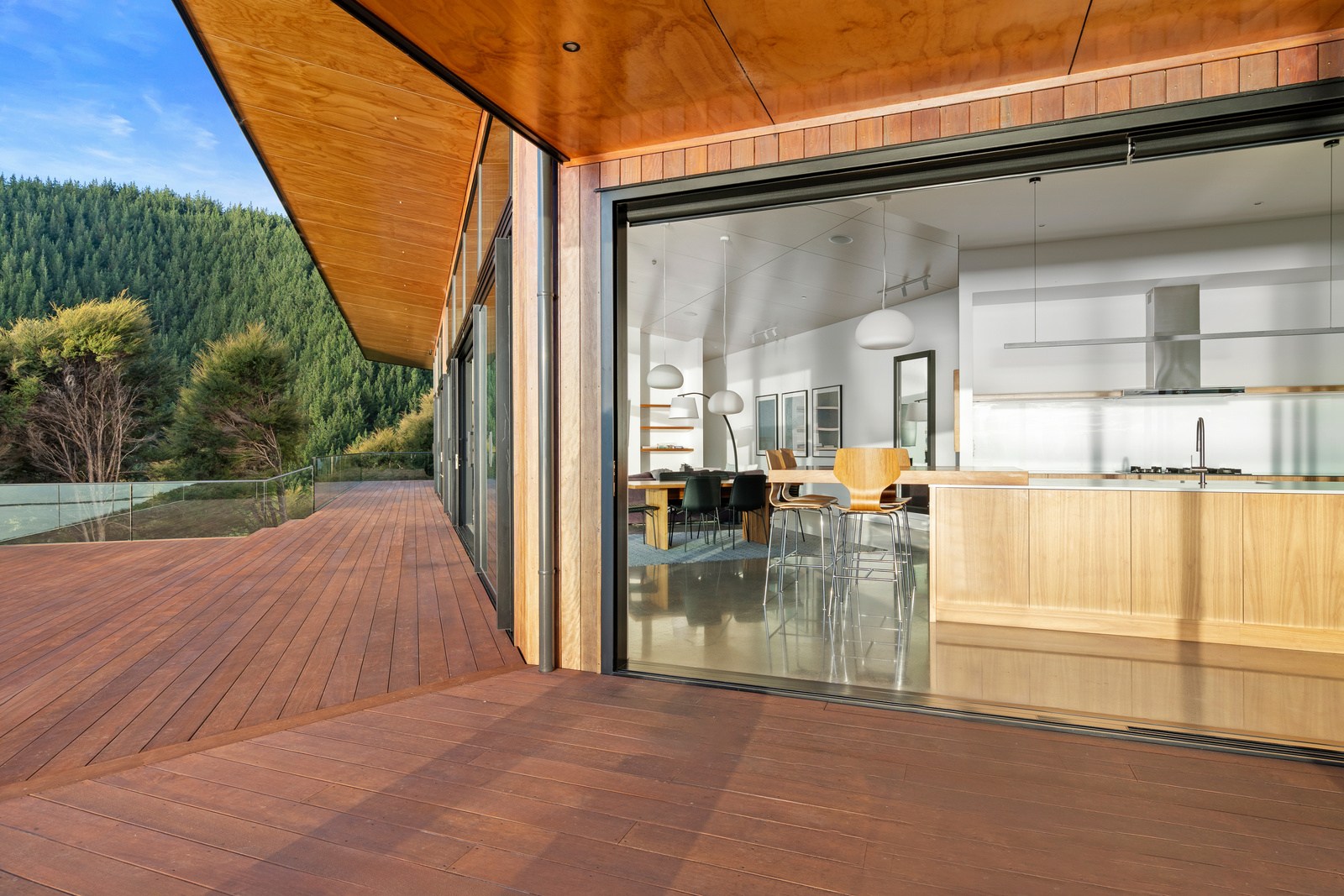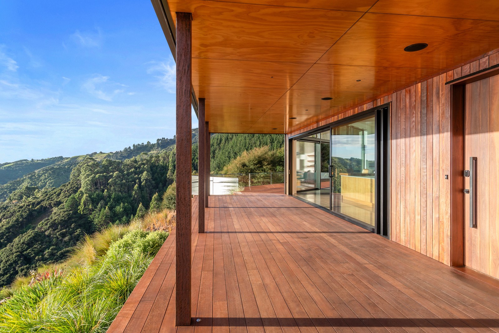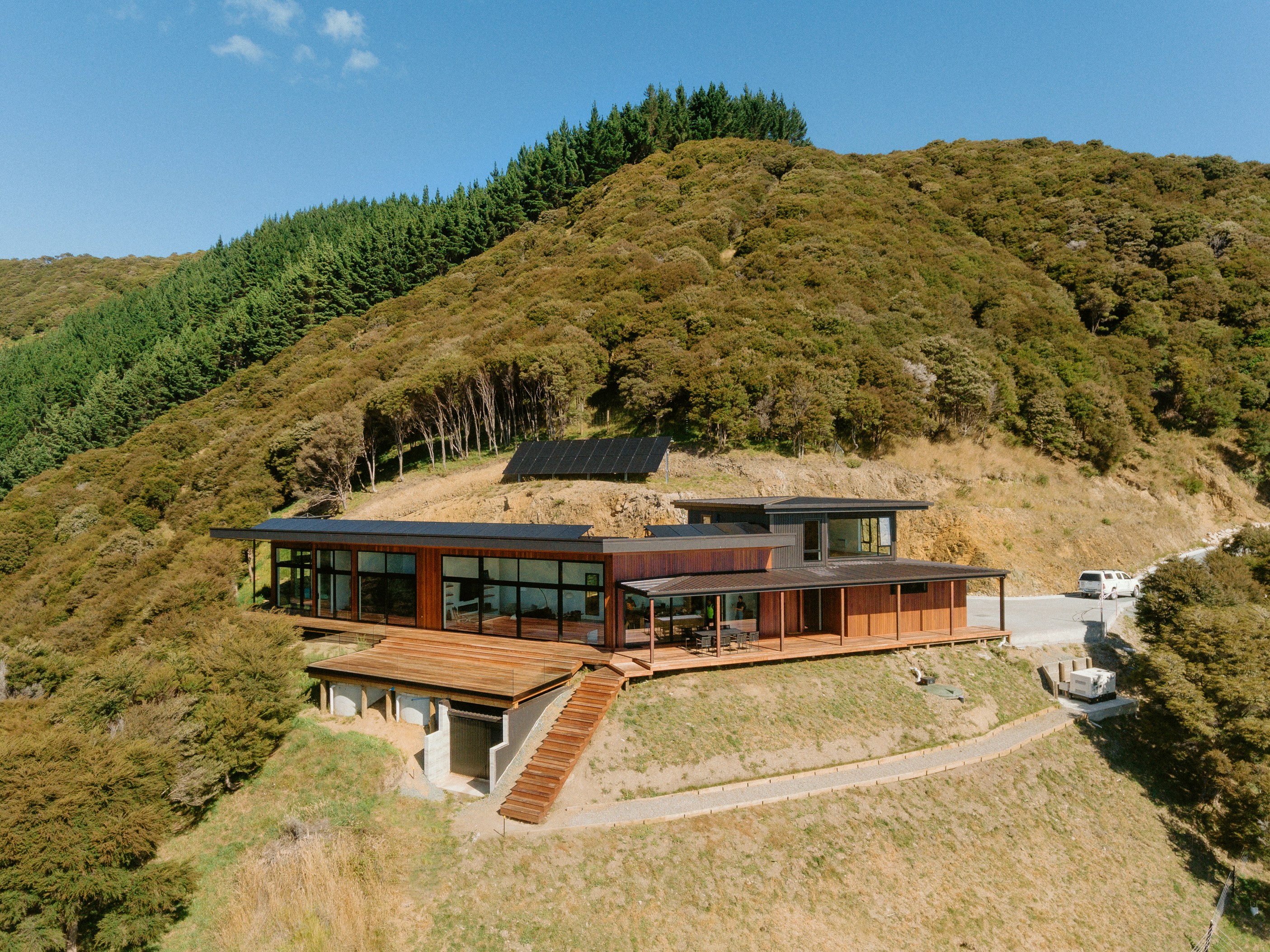 Tucked high into the hills north of Nelson, this 420sqm home is a breathtaking blend of modern off-grid living and finely crafted architecture. Offering its owners a retreat that’s as selfsufficient as it is stunning, the home combines luxury, sustainability and warm materiality. Clad in rich hardwood, the dwelling sits confidently in its natural environment. More than 220sqm of decking wraps around the structure, drawing the outdoors into every corner and framing uninterrupted views over Nelson Bay.