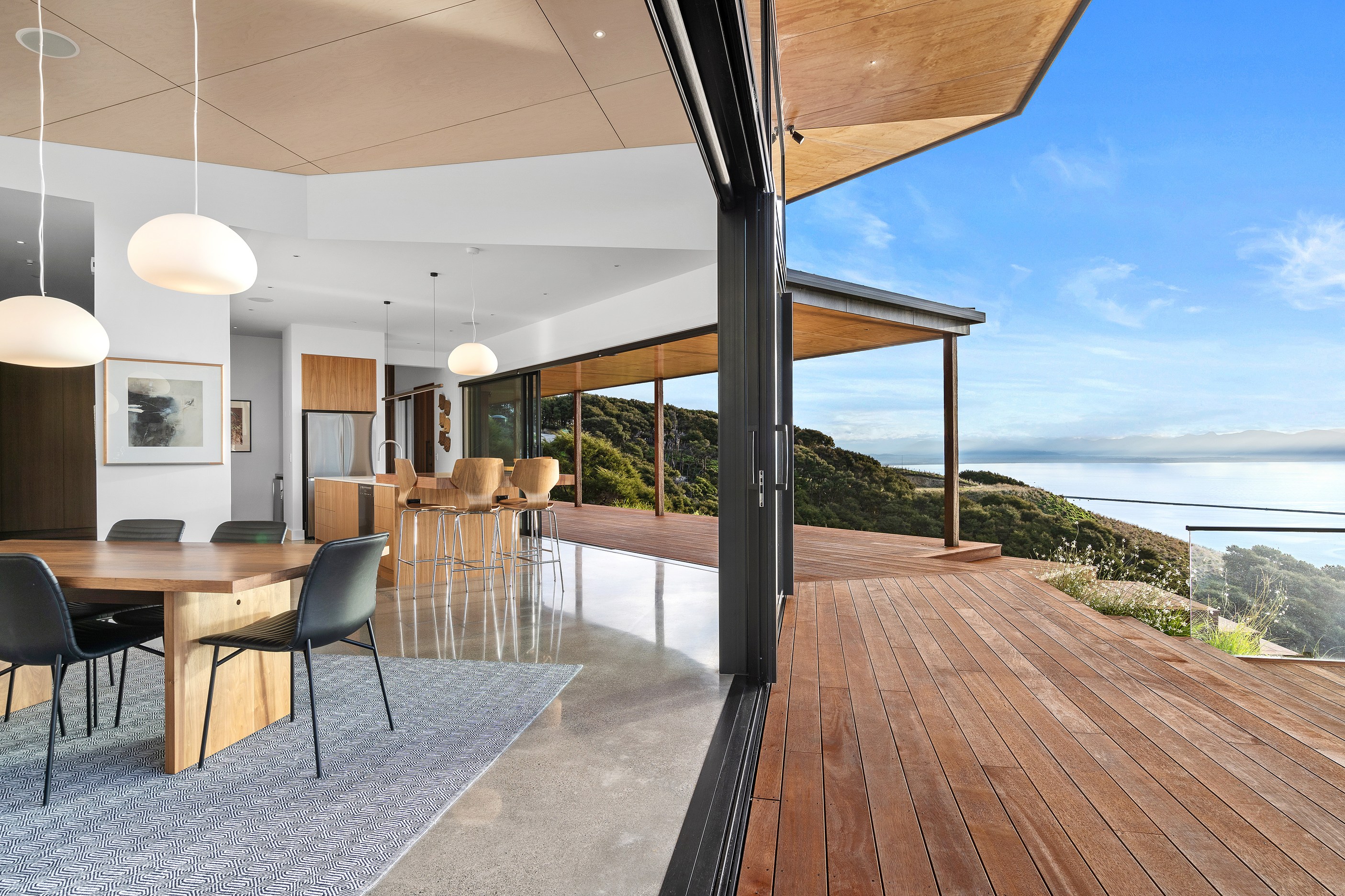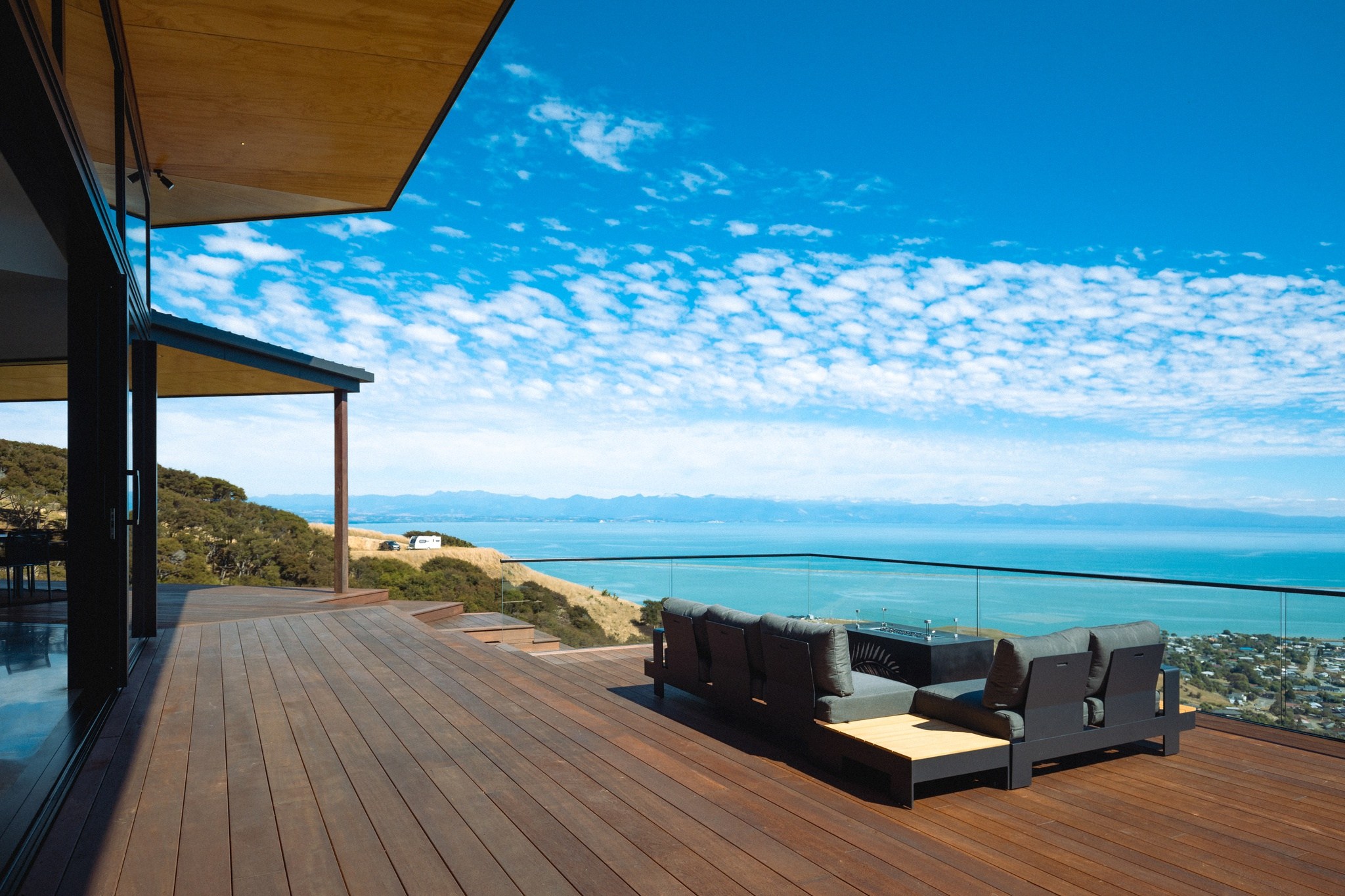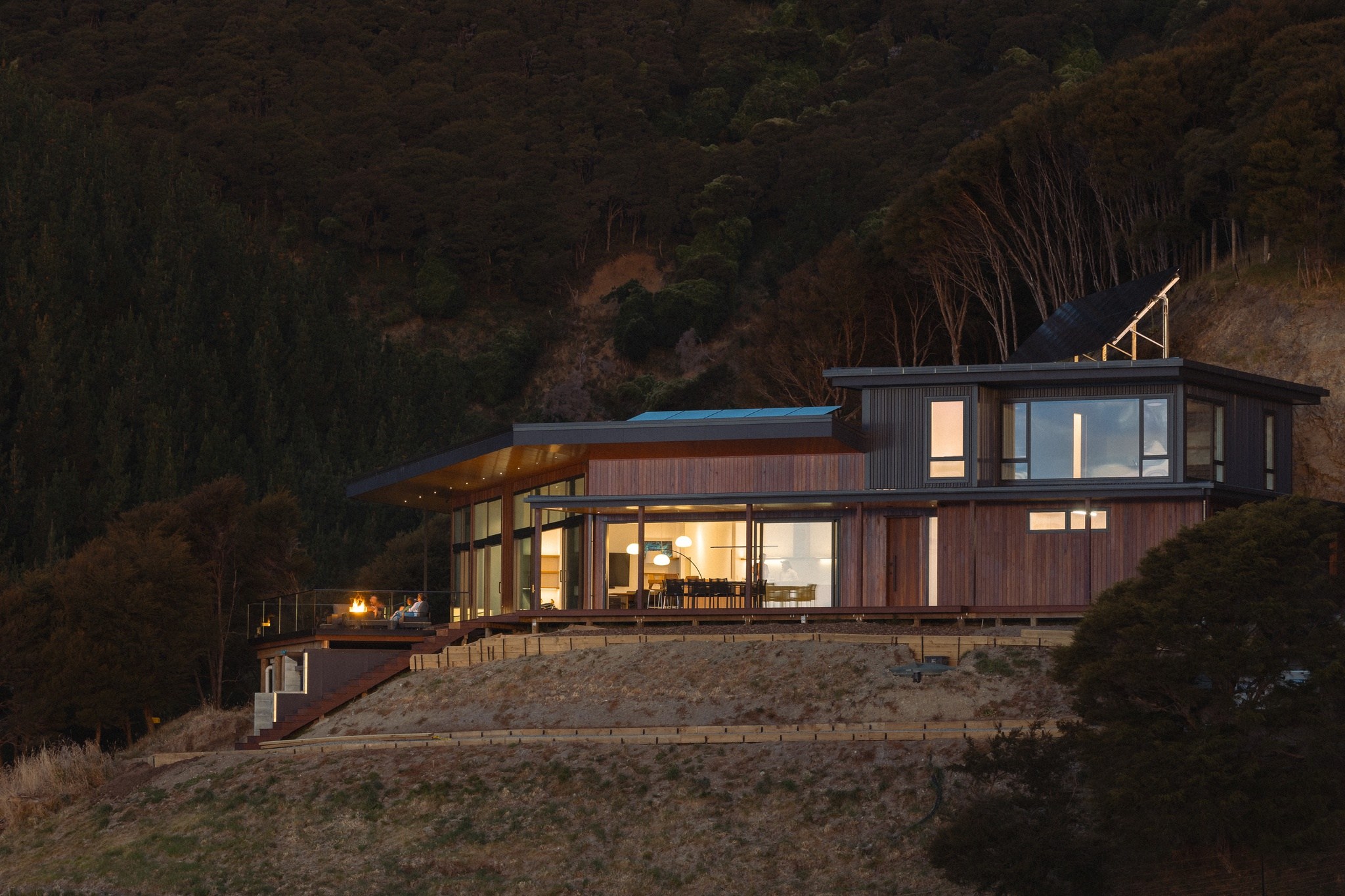Tucked high into the hills north of Nelson, this 420sqm home is a breathtaking blend of modern off-grid living and finely crafted architecture. Offering its owners a retreat that’s as selfsufficient as it is stunning, the home combines luxury, sustainability and warm materiality. Clad in rich hardwood, the dwelling sits confidently in its natural environment. More than 220sqm of decking wraps around the structure, drawing the outdoors into every corner and framing uninterrupted views over Nelson Bay.
