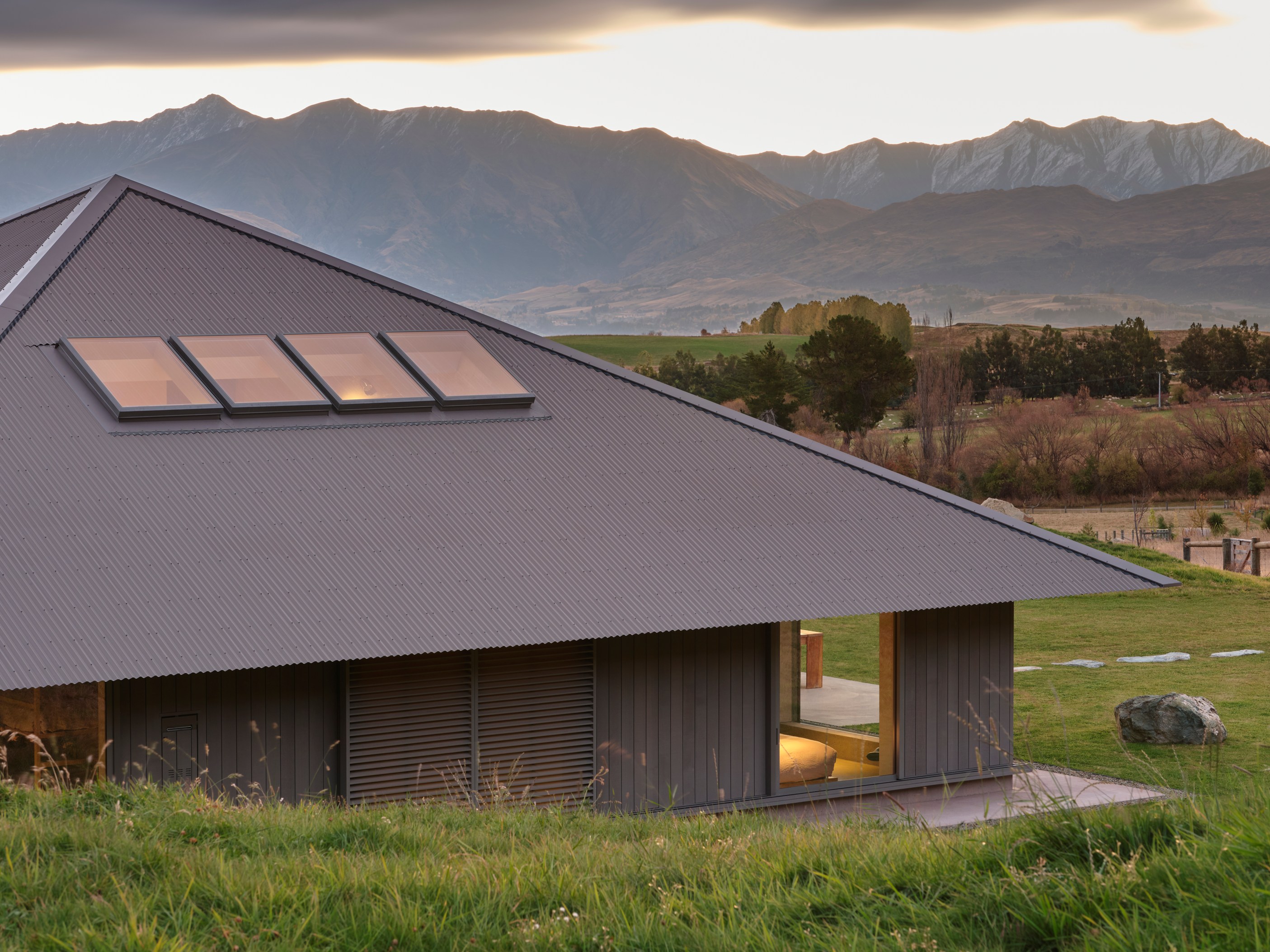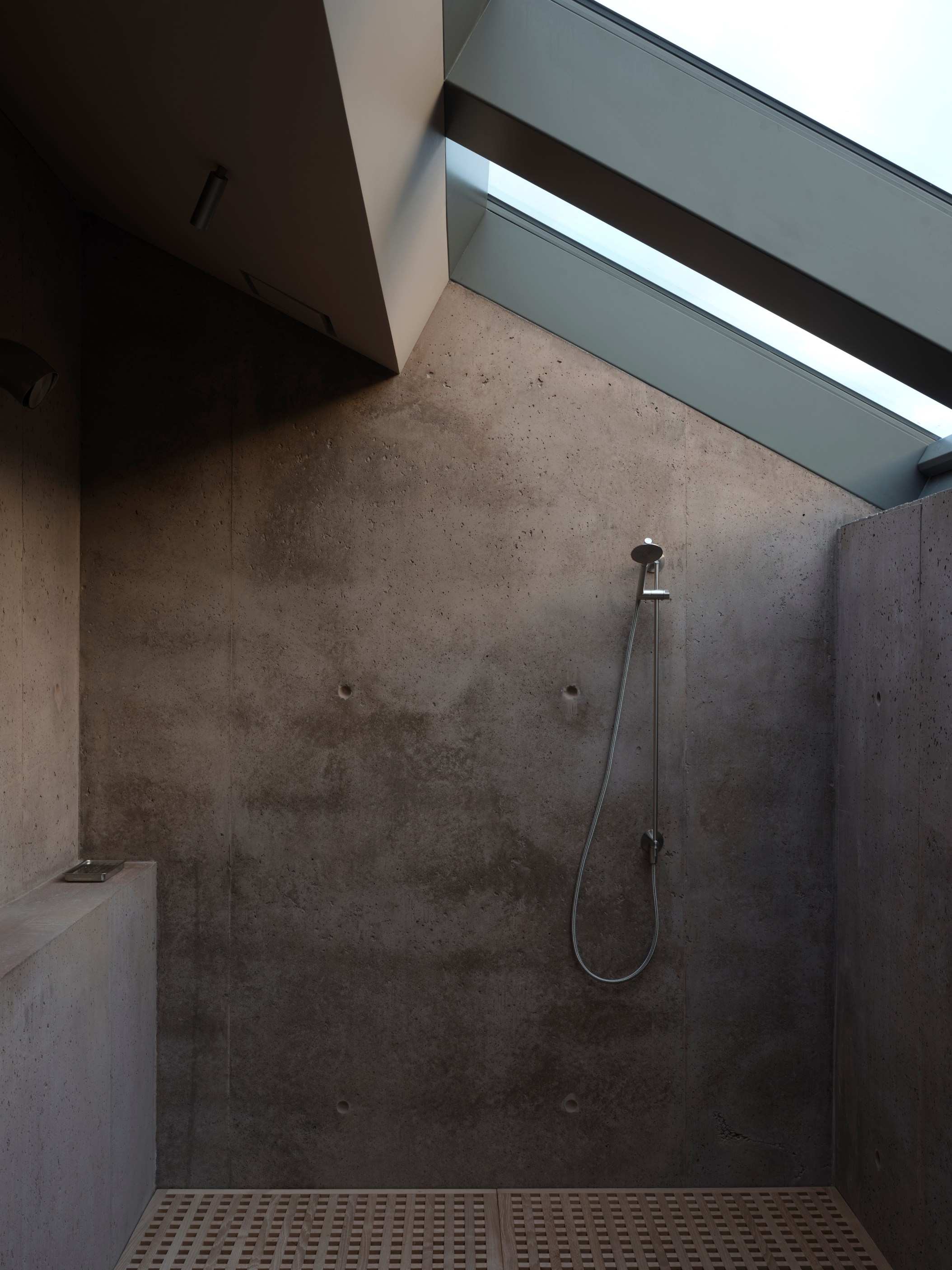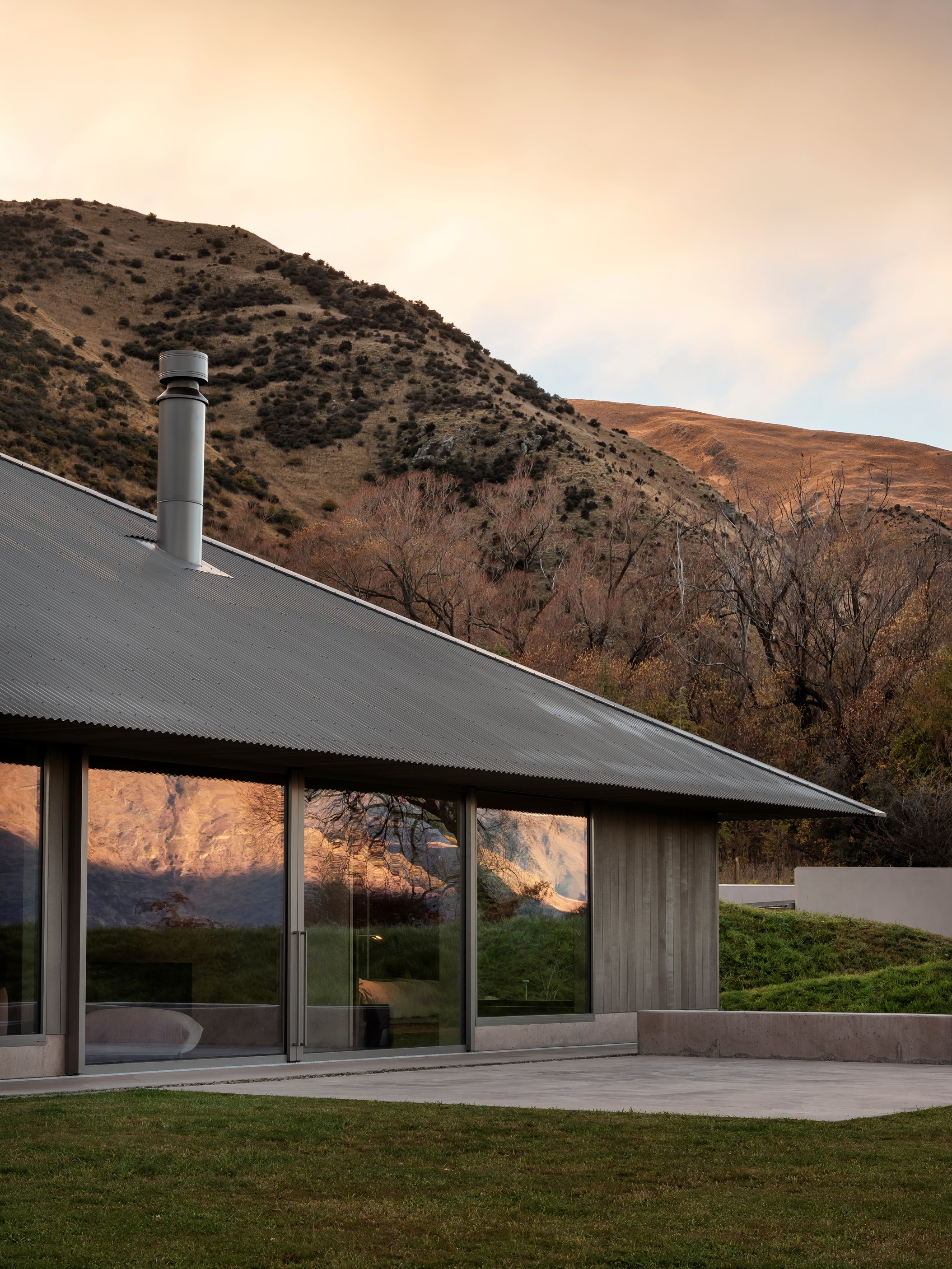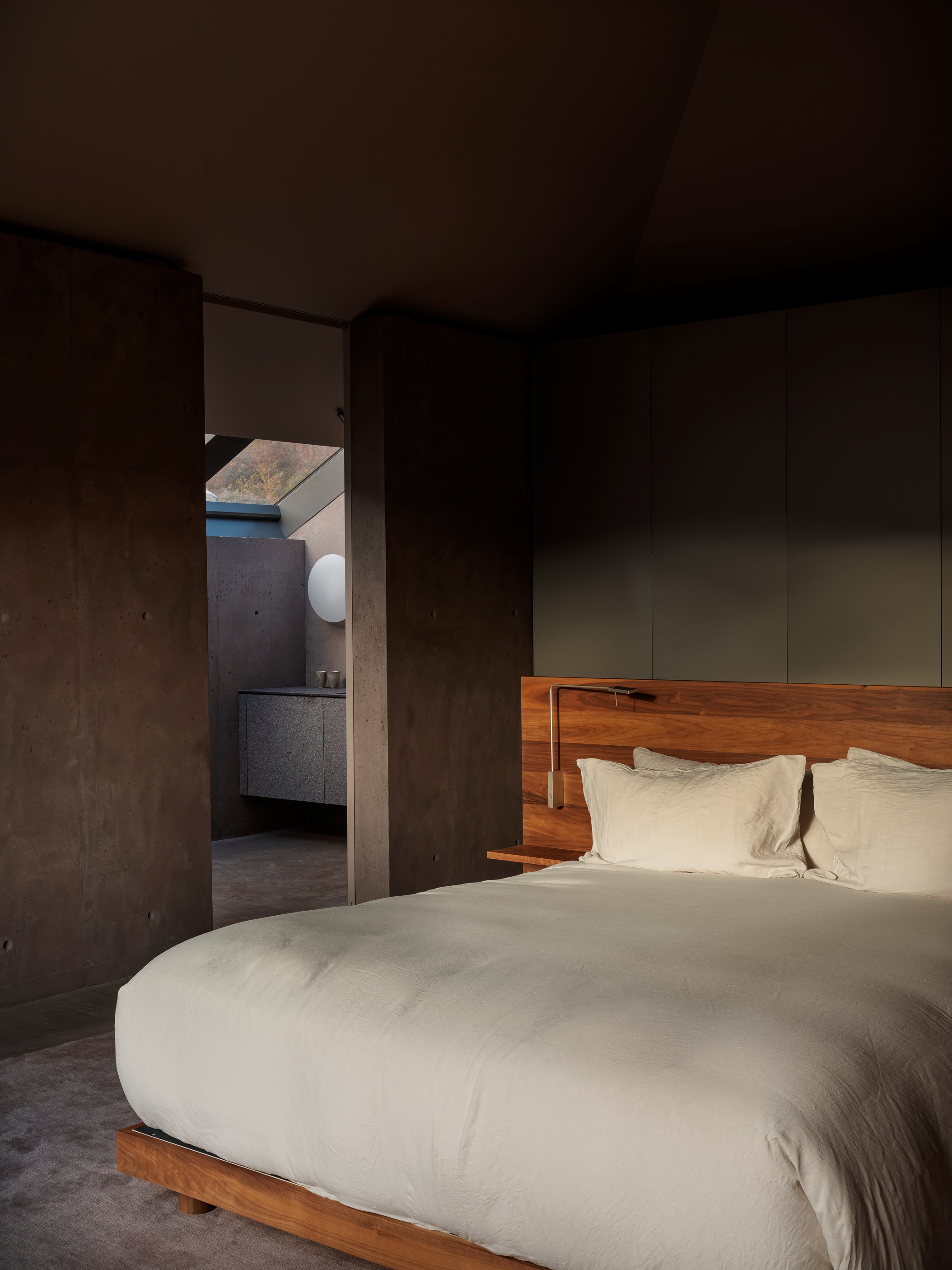 The first floor of the home, encapsulated by the roofline, includes an additional bedroom with a distinctive round window offering views of the mountains and night sky. The main bedroom flows into a bespoke ensuite, featuring carefully crafted teak accents. This third bathroom continues the use of concrete found throughout the entire home. Externally, the home makes a geometric statement, anchored by in-situ concrete that rises from the rugged terrain. The material palette is a blend of earthy and industrial — with cedar and concrete complemented by a pyramidal corrugate roof designed to shed snow and rain. Sustainability and smart systems are embedded. An automation network controls lighting, heating, blinds, audio and security, offering insights into energy usage.