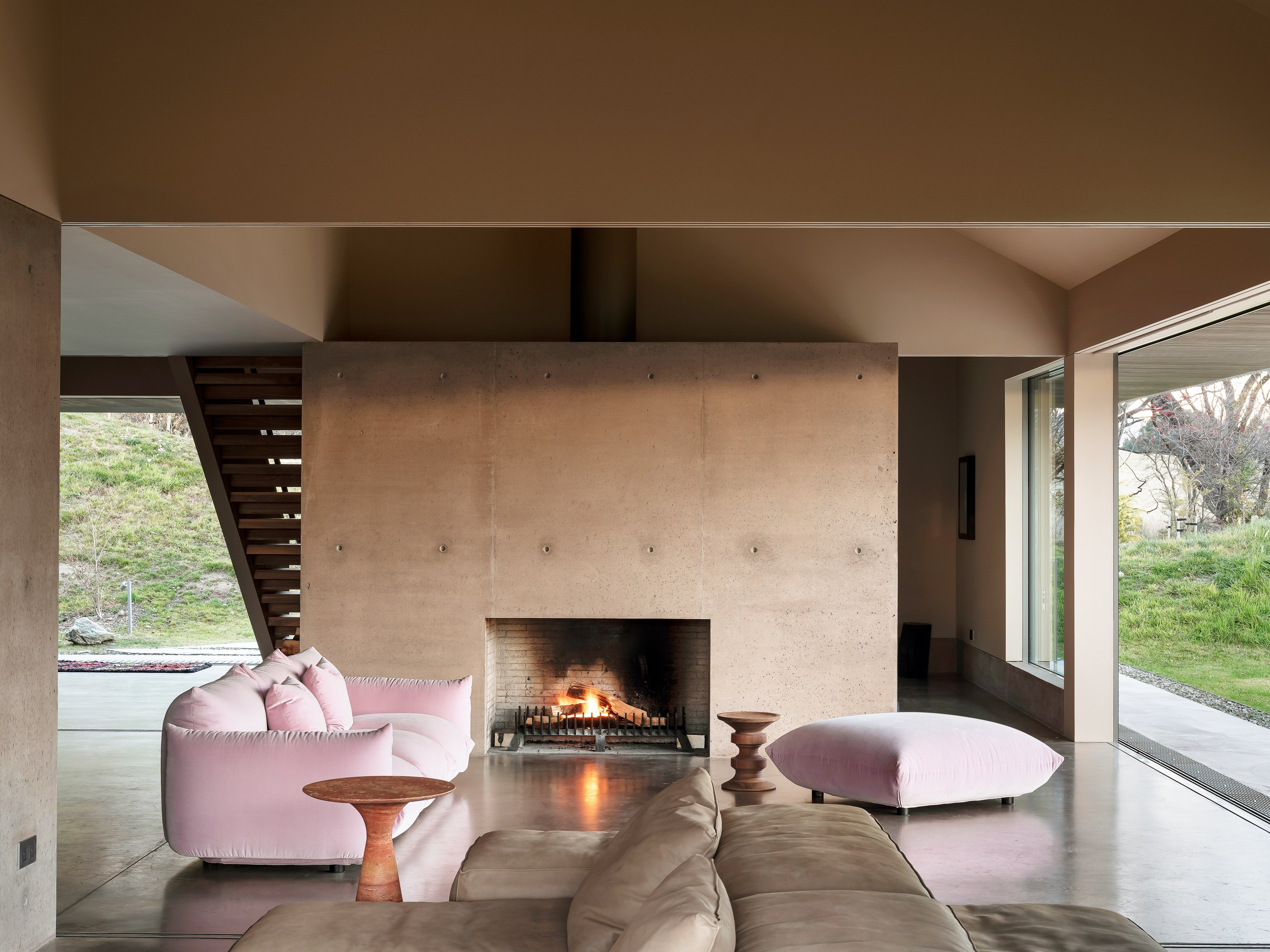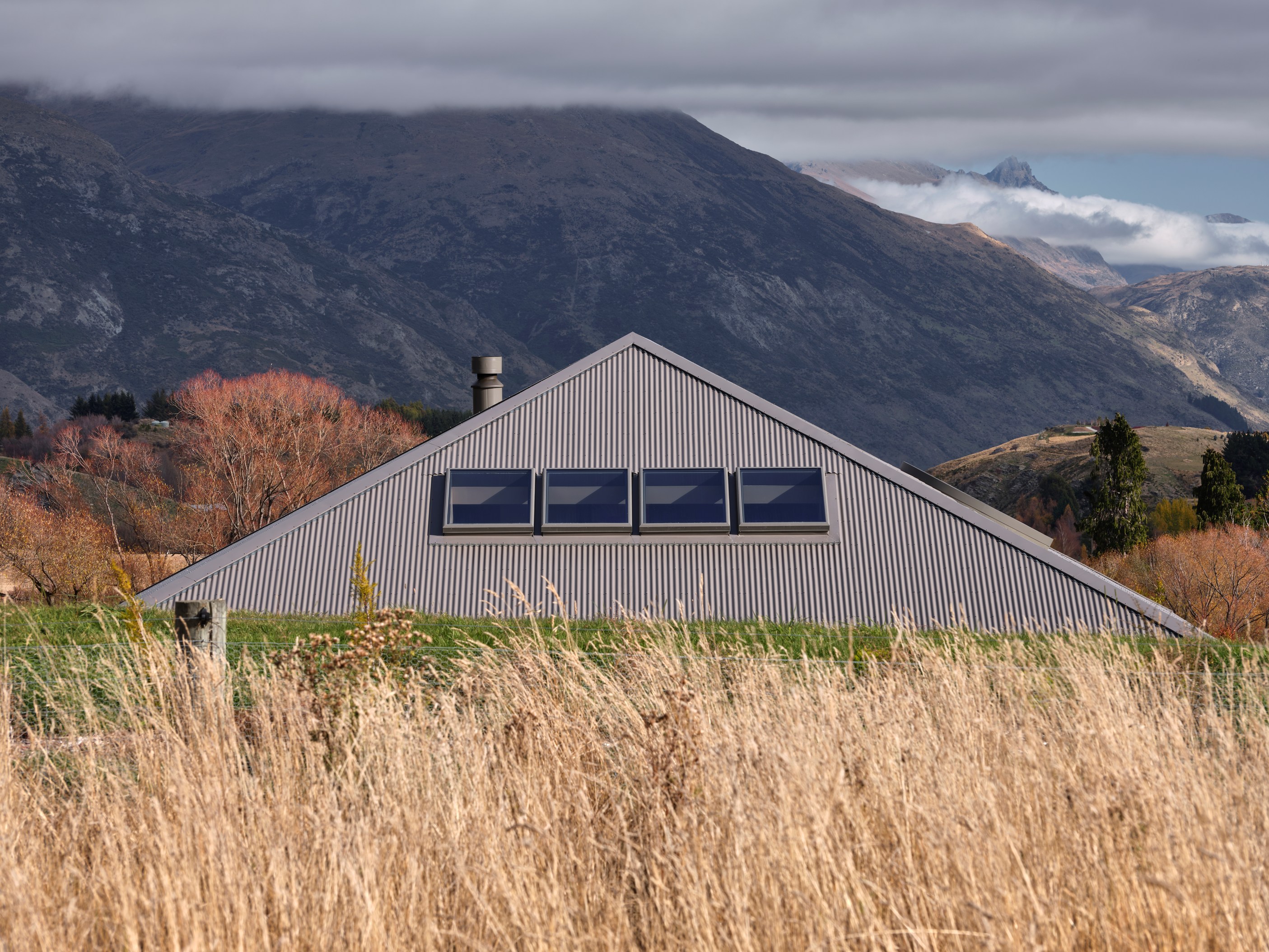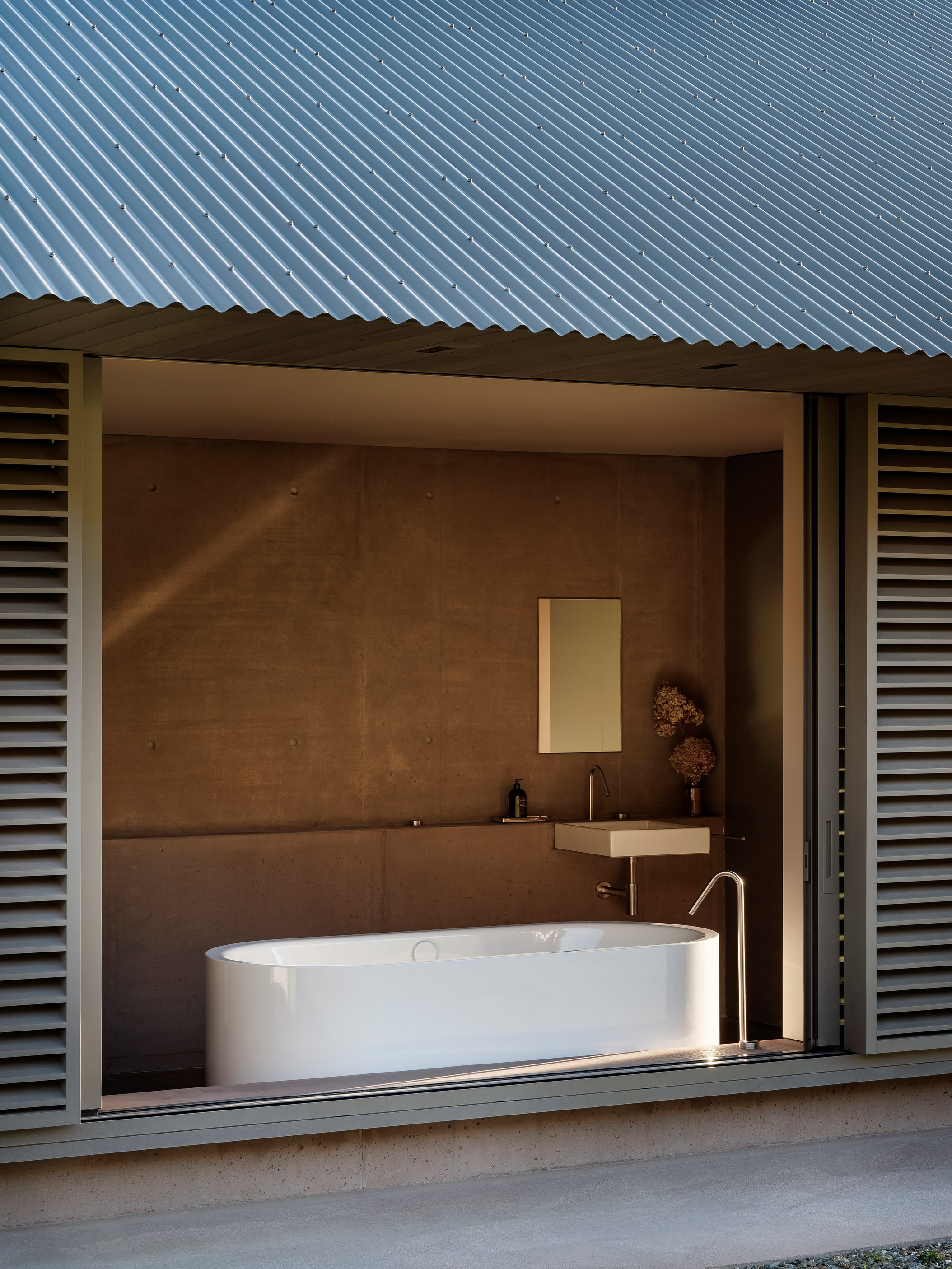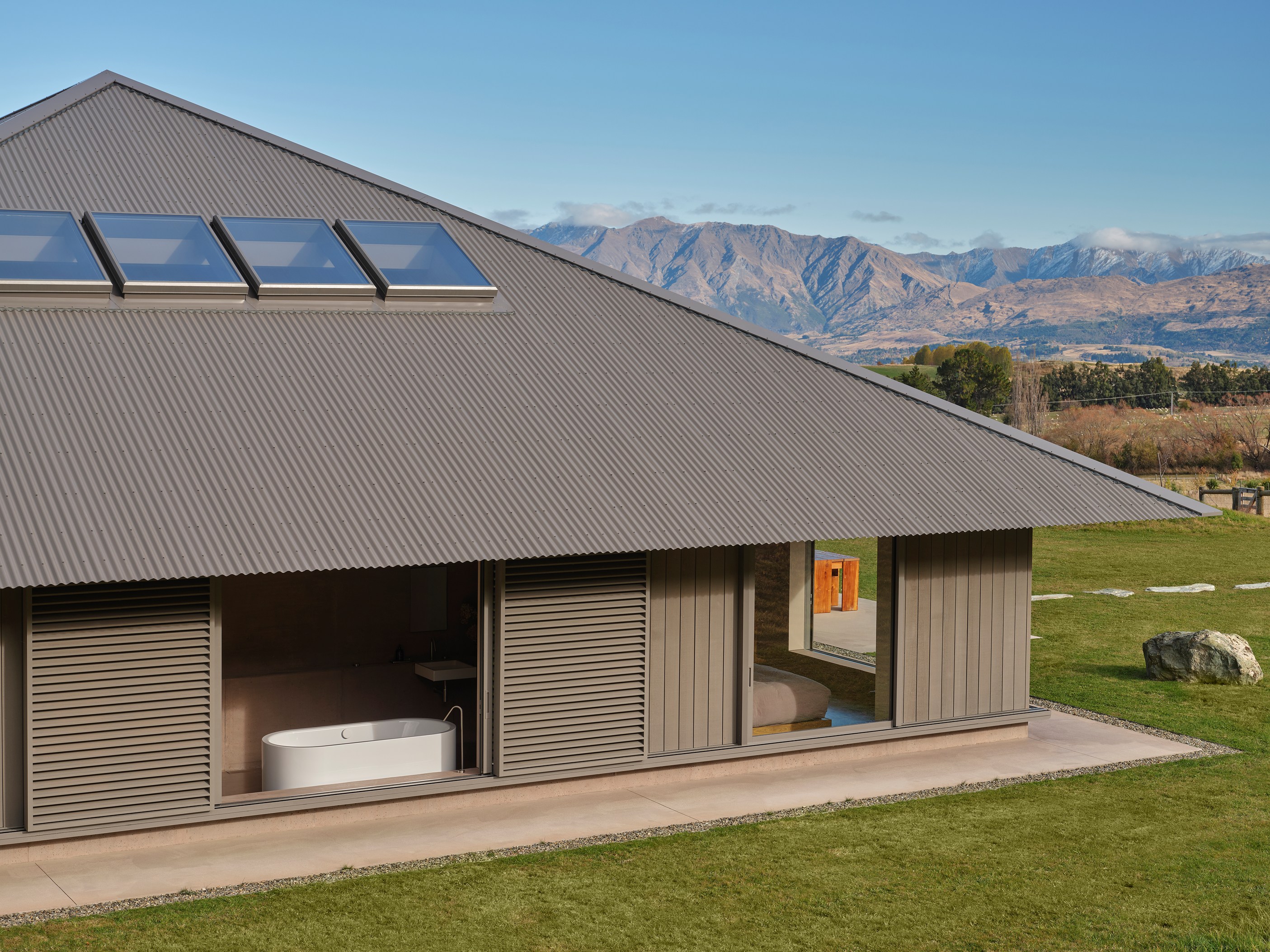The first floor of the home, encapsulated by the roofline, includes an additional bedroom with a distinctive round window offering views of the mountains and night sky. The main bedroom flows into a bespoke ensuite, featuring carefully crafted teak accents. This third bathroom continues the use of concrete found throughout the entire home. Externally, the home makes a geometric statement, anchored by in-situ concrete that rises from the rugged terrain. The material palette is a blend of earthy and industrial — with cedar and concrete complemented by a pyramidal corrugate roof designed to shed snow and rain. Sustainability and smart systems are embedded. An automation network controls lighting, heating, blinds, audio and security, offering insights into energy usage.