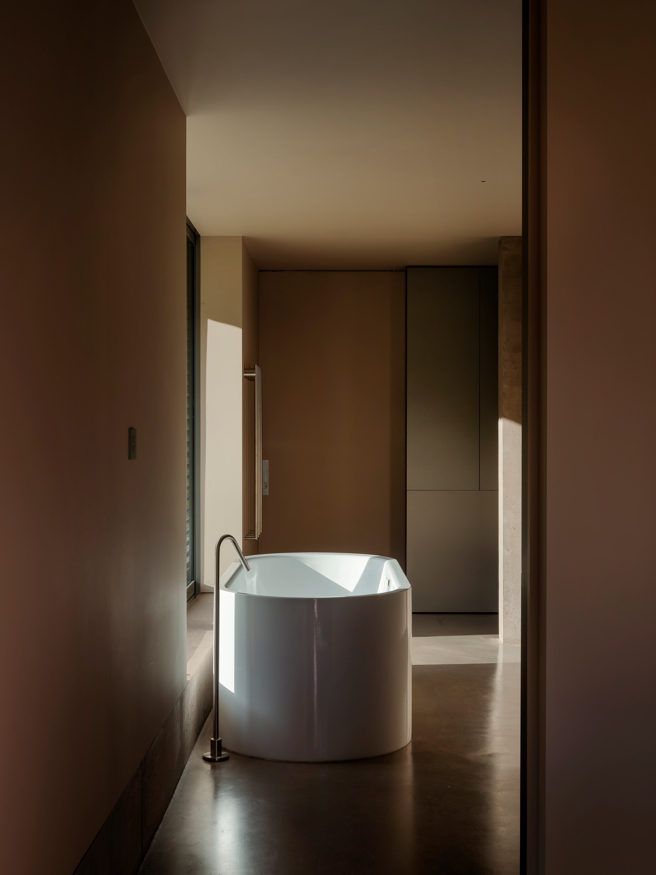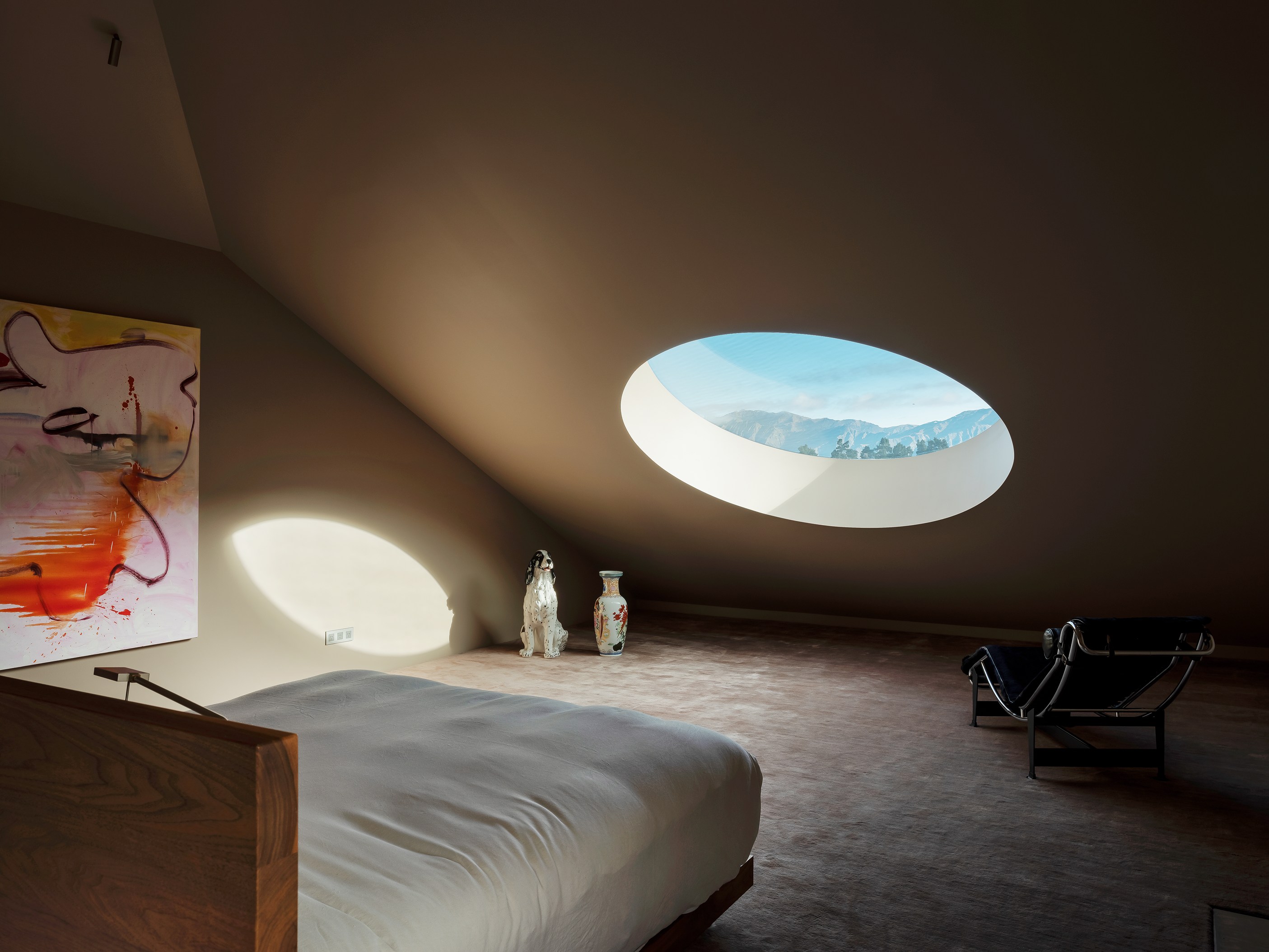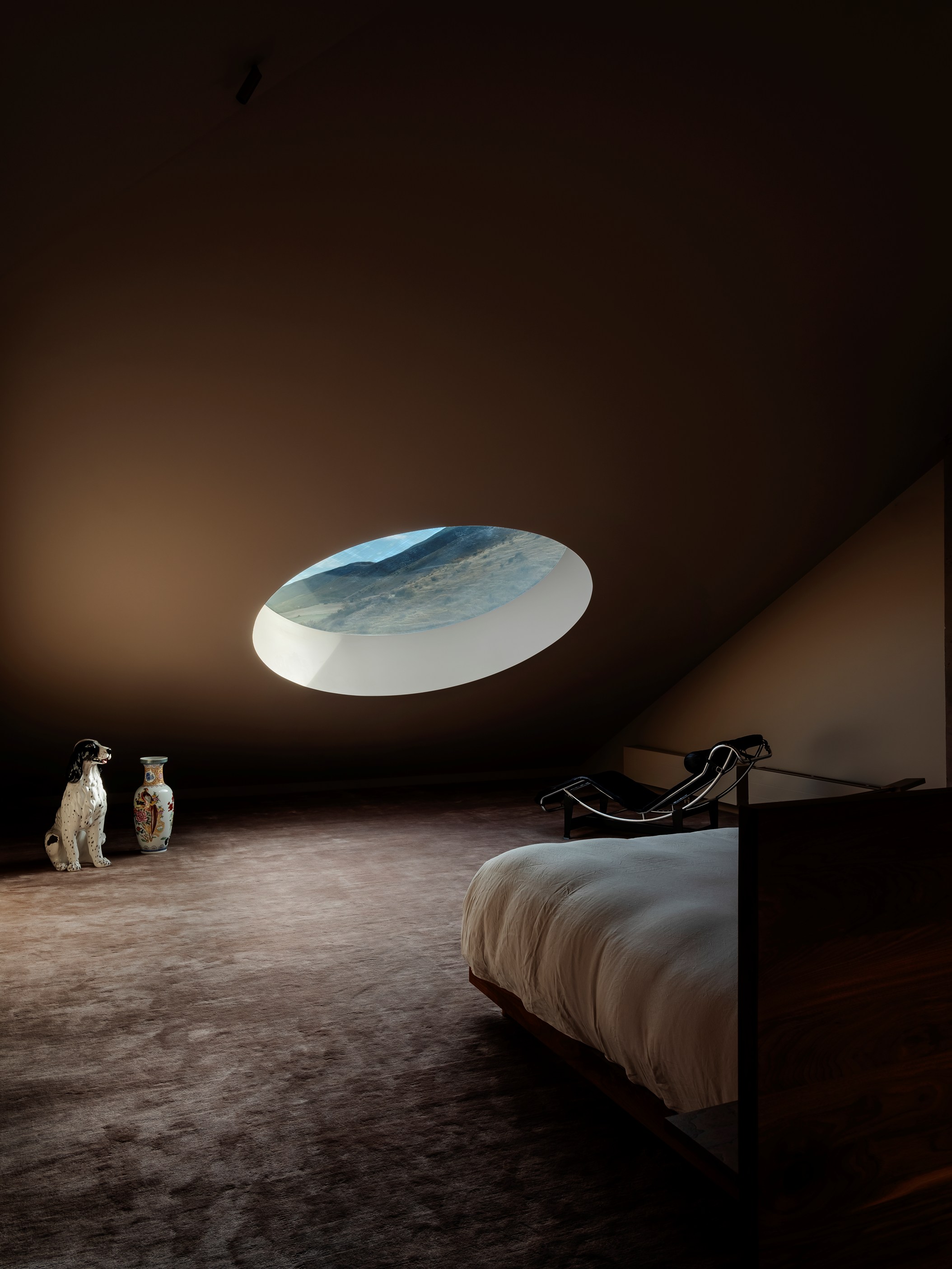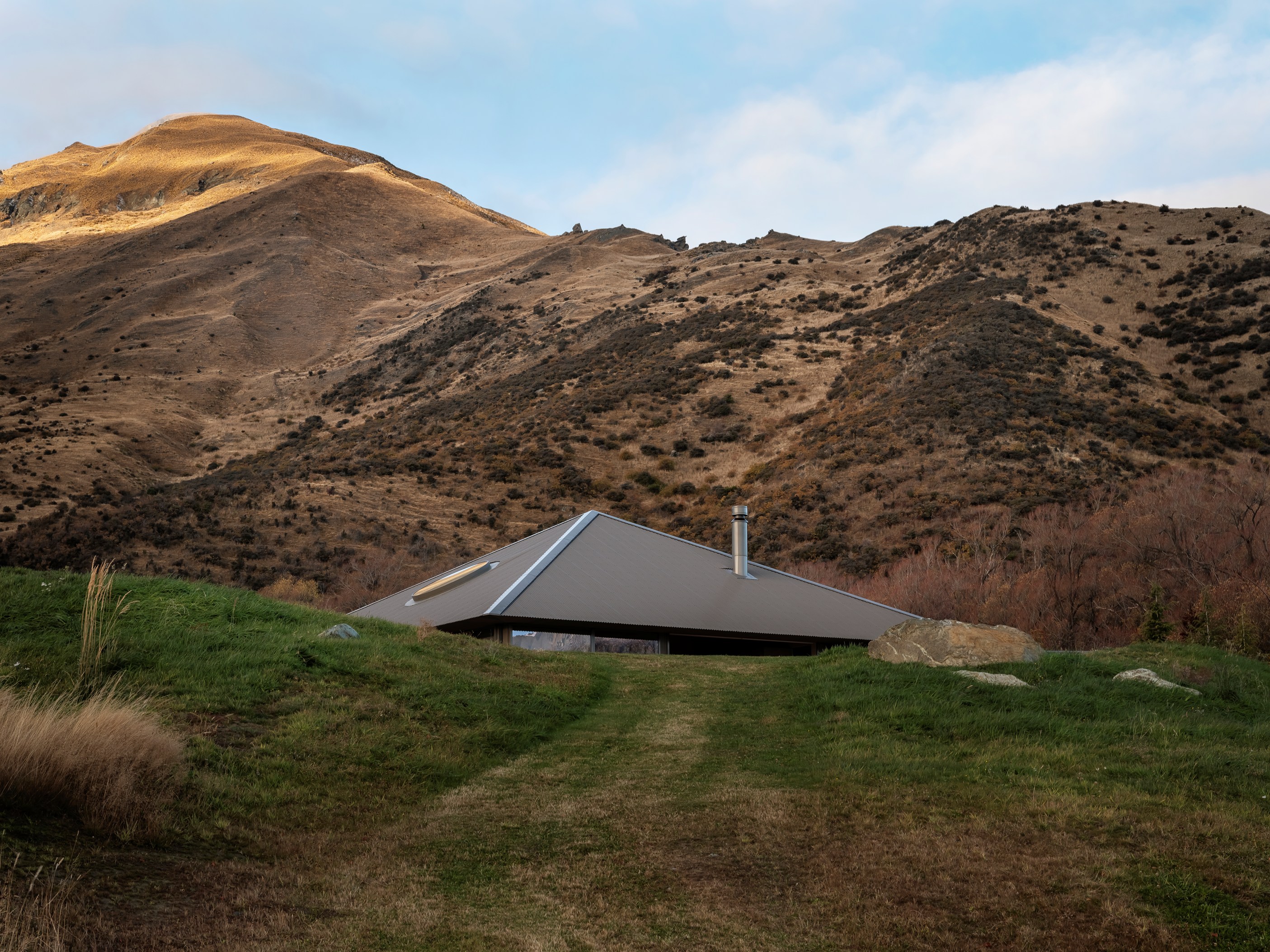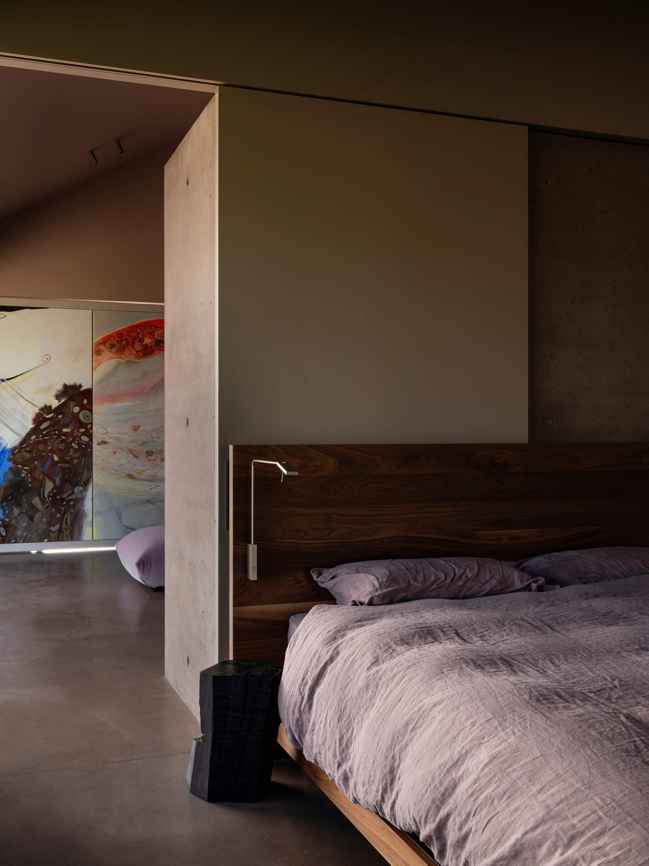 The first floor of the home, encapsulated by the roofline, includes an additional bedroom with a distinctive round window offering views of the mountains and night sky. The main bedroom flows into a bespoke ensuite, featuring carefully crafted teak accents. This third bathroom continues the use of concrete found throughout the entire home. Externally, the home makes a geometric statement, anchored by in-situ concrete that rises from the rugged terrain. The material palette is a blend of earthy and industrial — with cedar and concrete complemented by a pyramidal corrugate roof designed to shed snow and rain. Sustainability and smart systems are embedded. An automation network controls lighting, heating, blinds, audio and security, offering insights into energy usage.