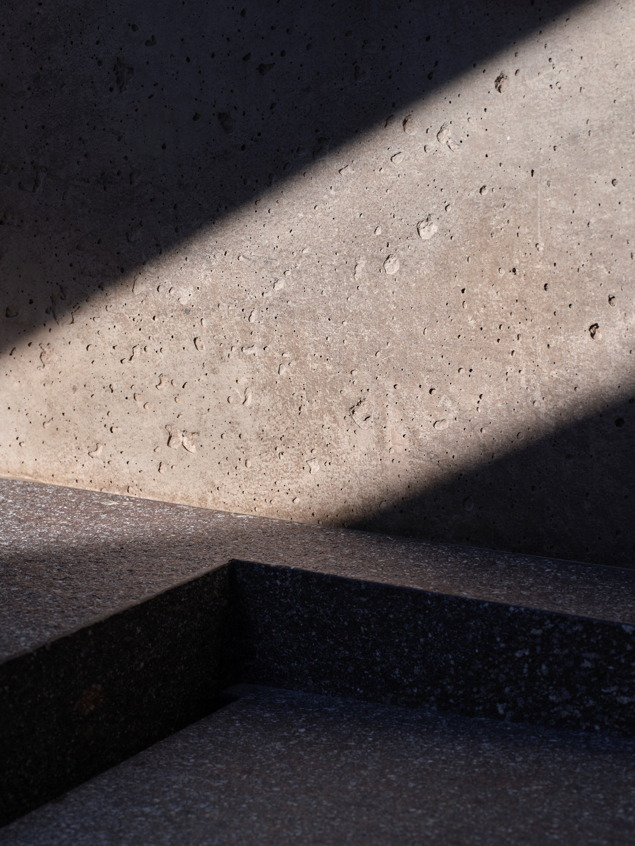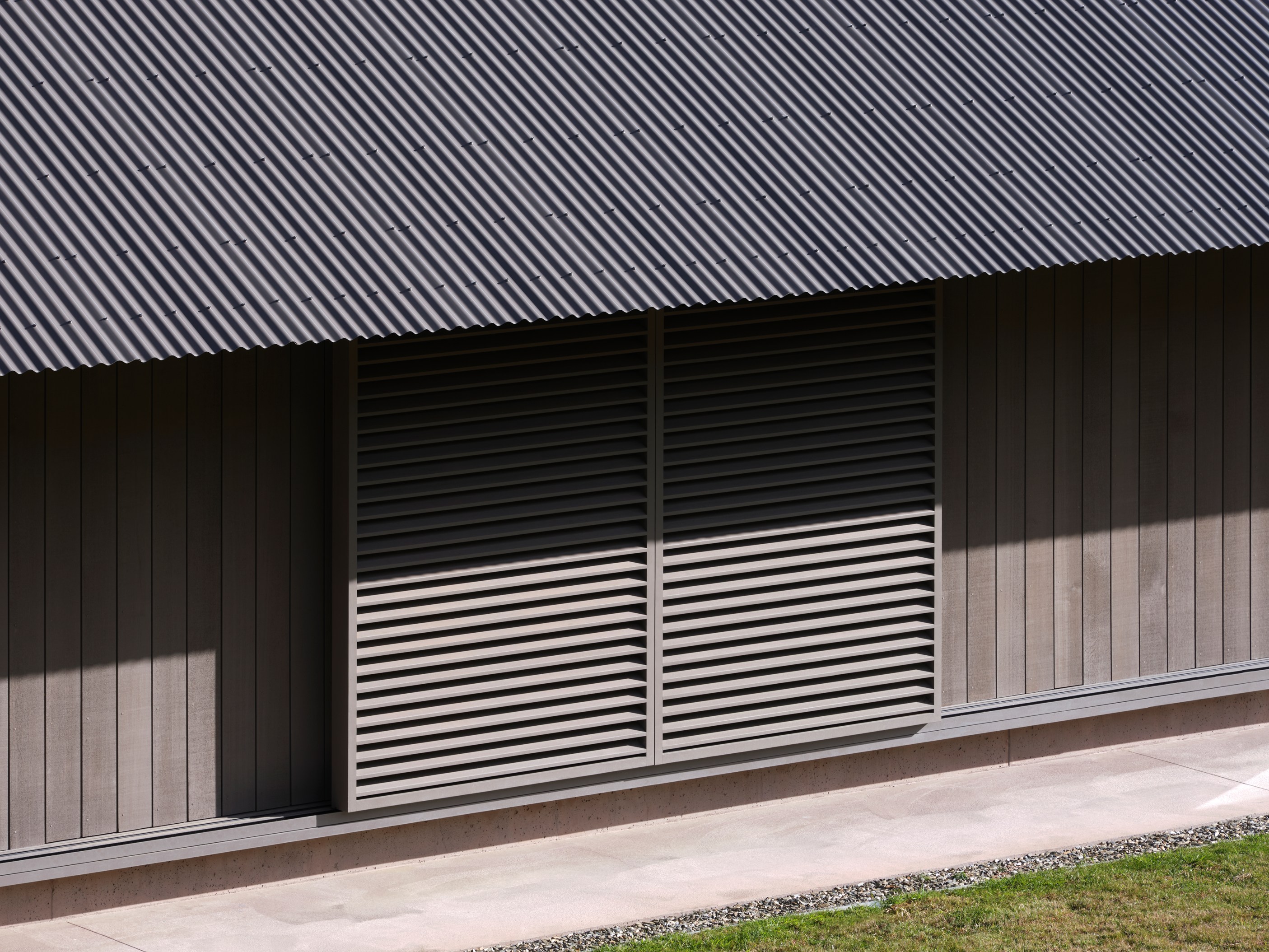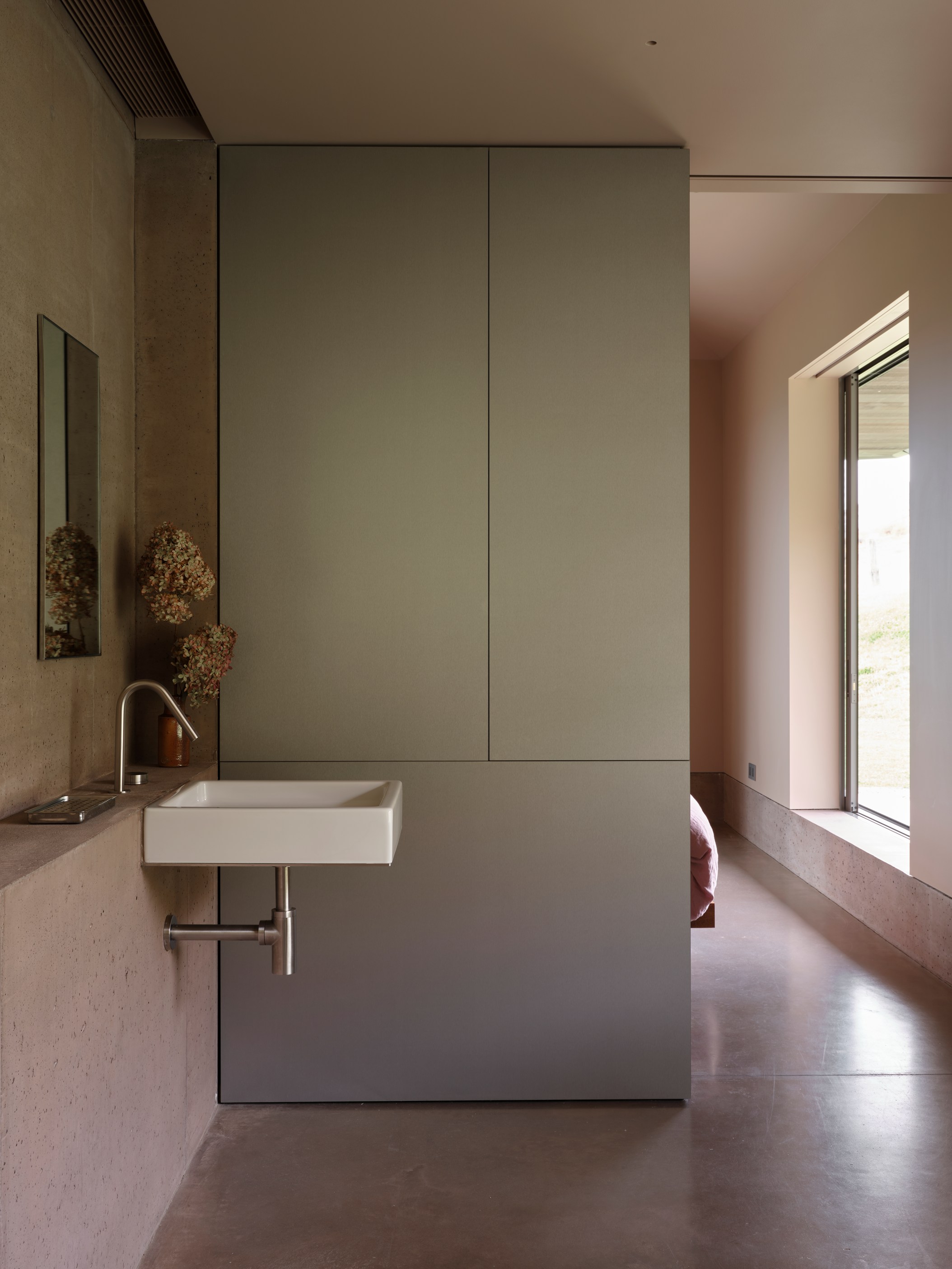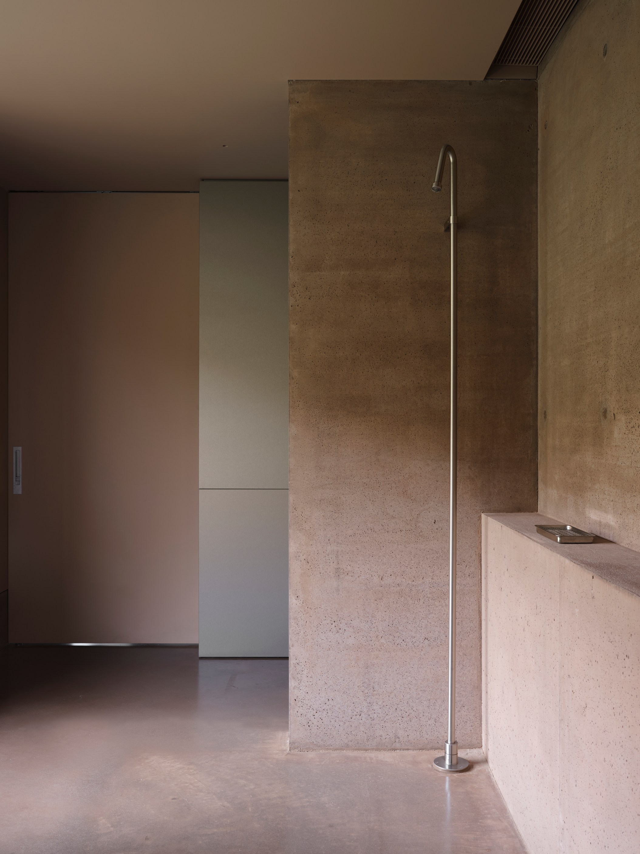 The first floor of the home, encapsulated by the roofline, includes an additional bedroom with a distinctive round window offering views of the mountains and night sky. The main bedroom flows into a bespoke ensuite, featuring carefully crafted teak accents. This third bathroom continues the use of concrete found throughout the entire home. Externally, the home makes a geometric statement, anchored by in-situ concrete that rises from the rugged terrain. The material palette is a blend of earthy and industrial — with cedar and concrete complemented by a pyramidal corrugate roof designed to shed snow and rain. Sustainability and smart systems are embedded. An automation network controls lighting, heating, blinds, audio and security, offering insights into energy usage.