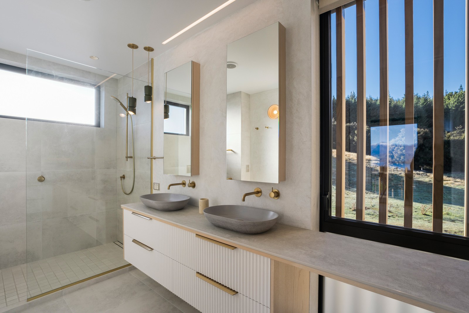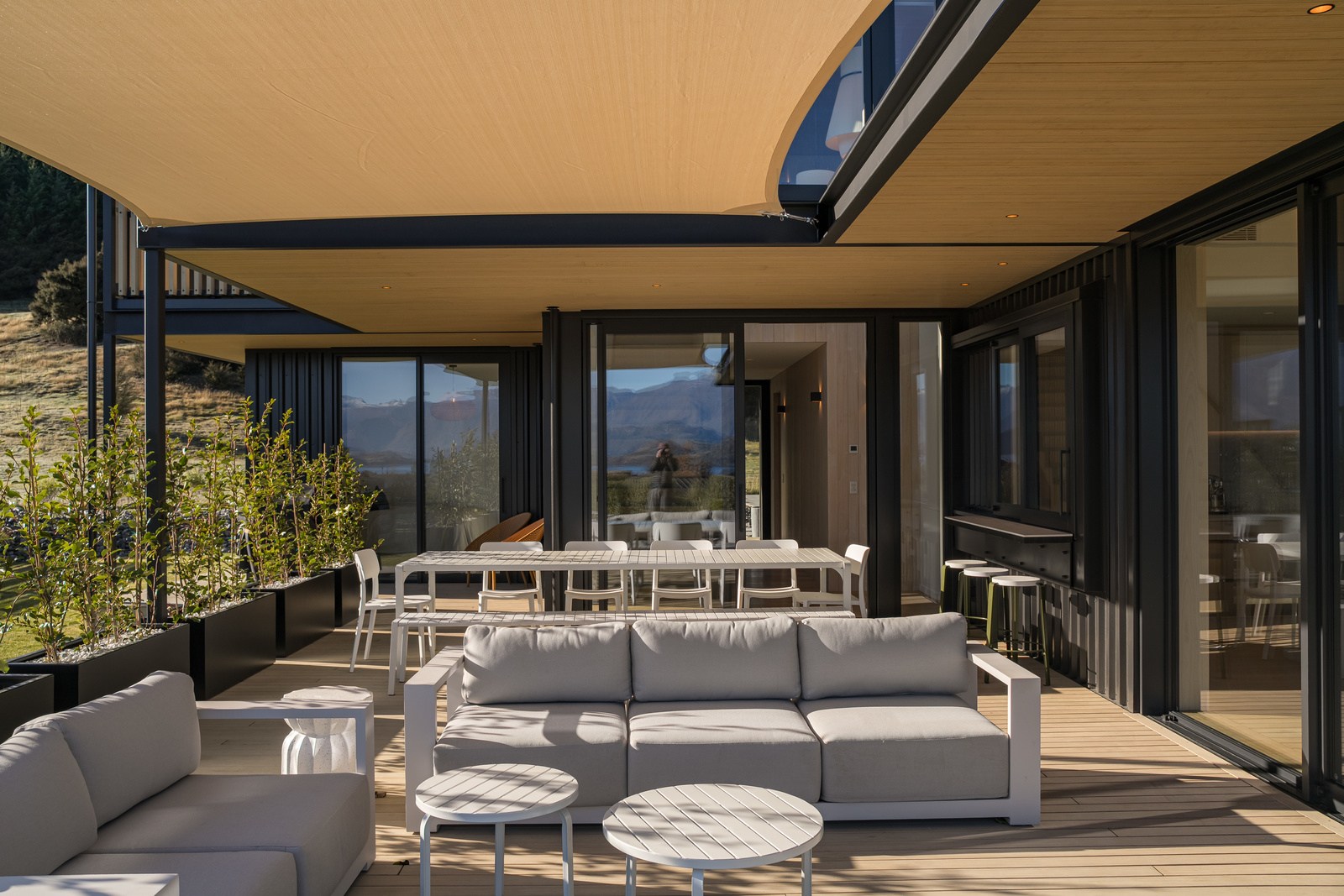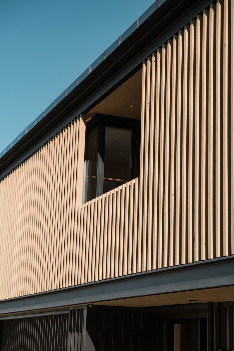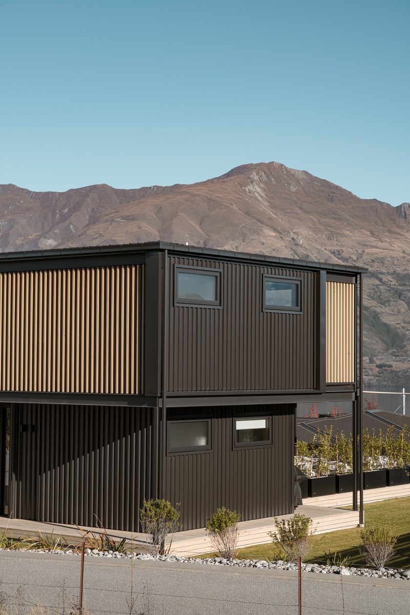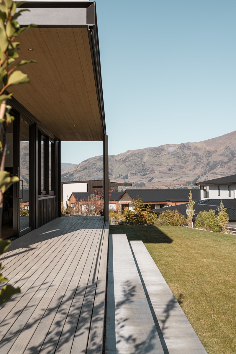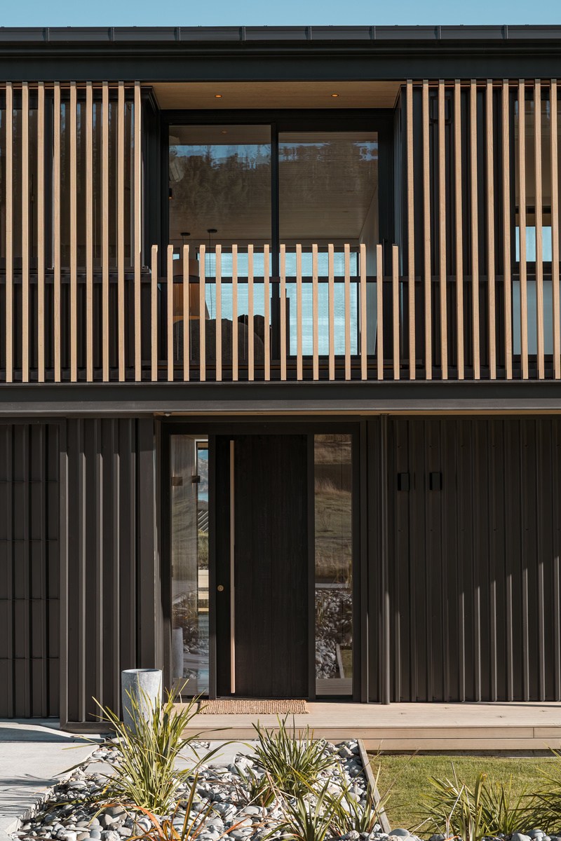 The brief was for a future-proofed family retreat with a strong Danish aesthetic, made to suit the Central Otago landscape. The result is a sophisticated 259sqm residence where light and shadow are architectural features in their own right. Blonded timber linings (in keeping with the Scandi look) and soft finishes lend warmth to the minimalist palette, while slender slatted screens bring dappled light and layered privacy to decks and windows. Exterior vertical-timber fins animate the black façade, casting changing shadows as the sun shifts through the day.