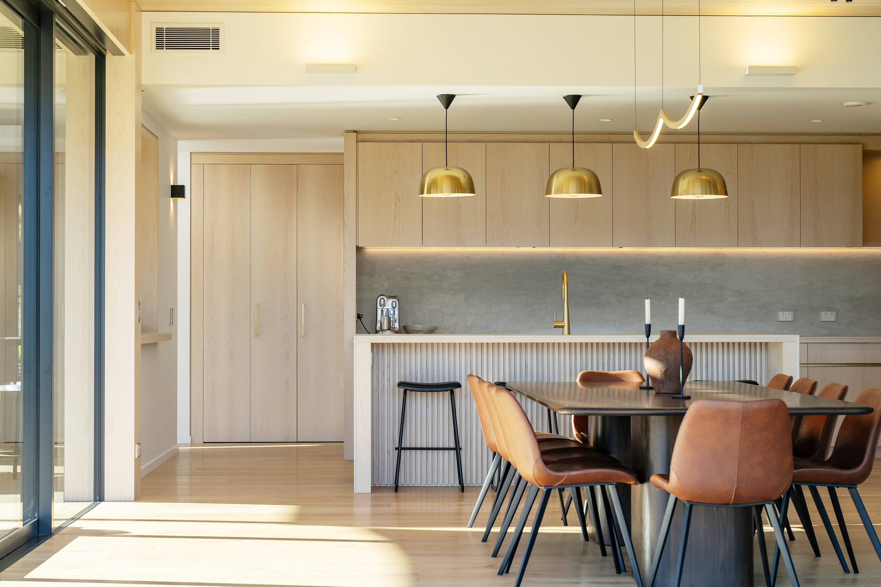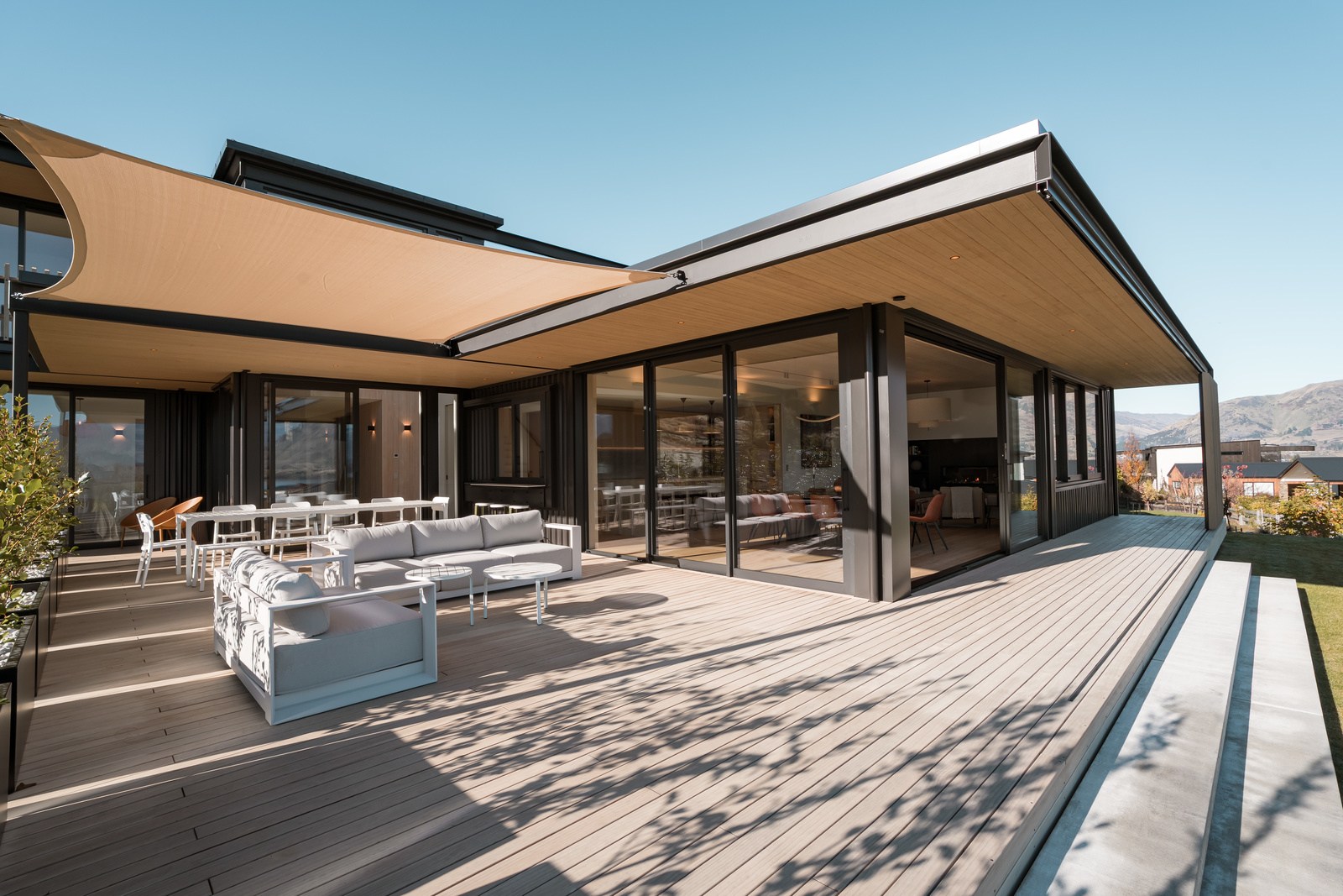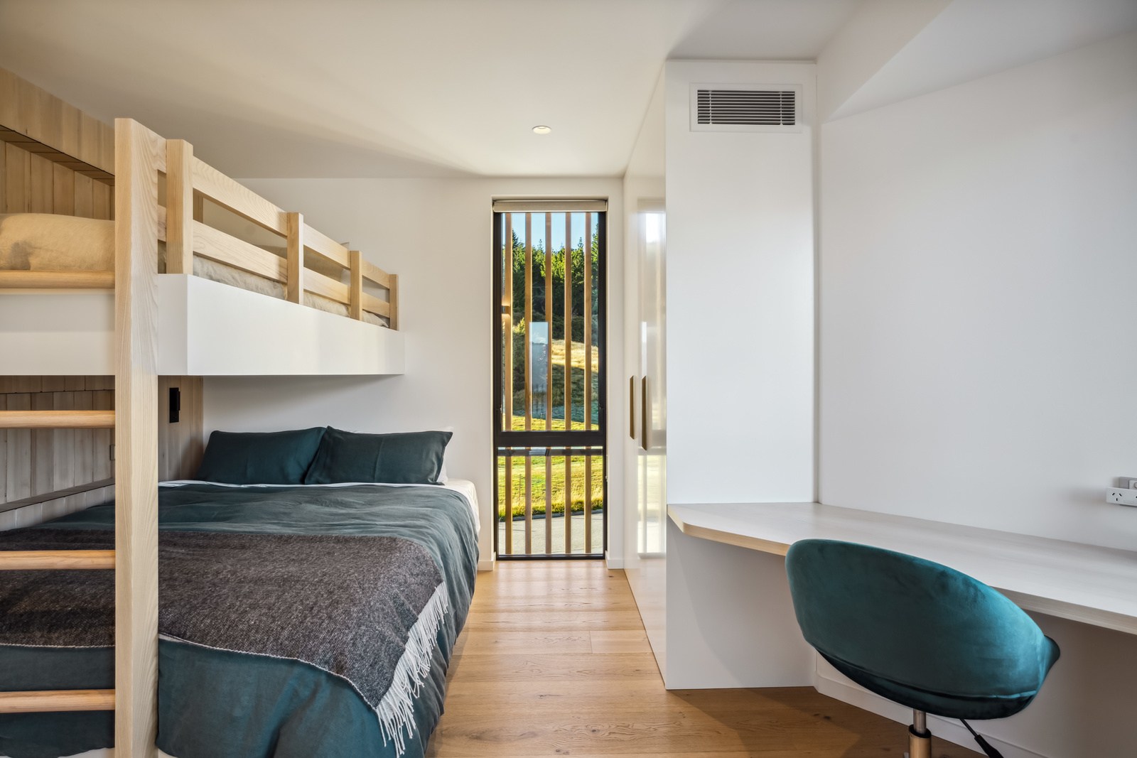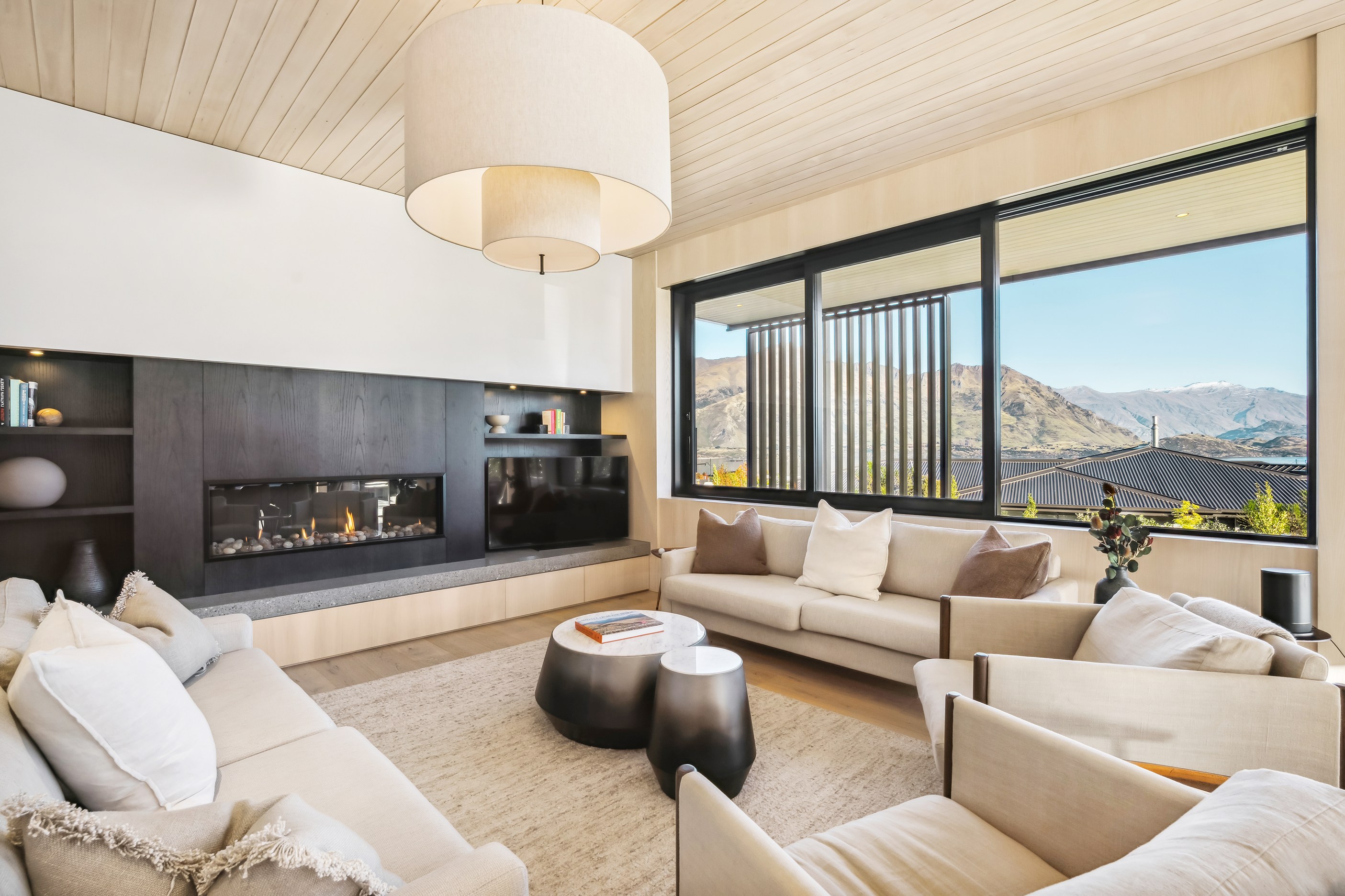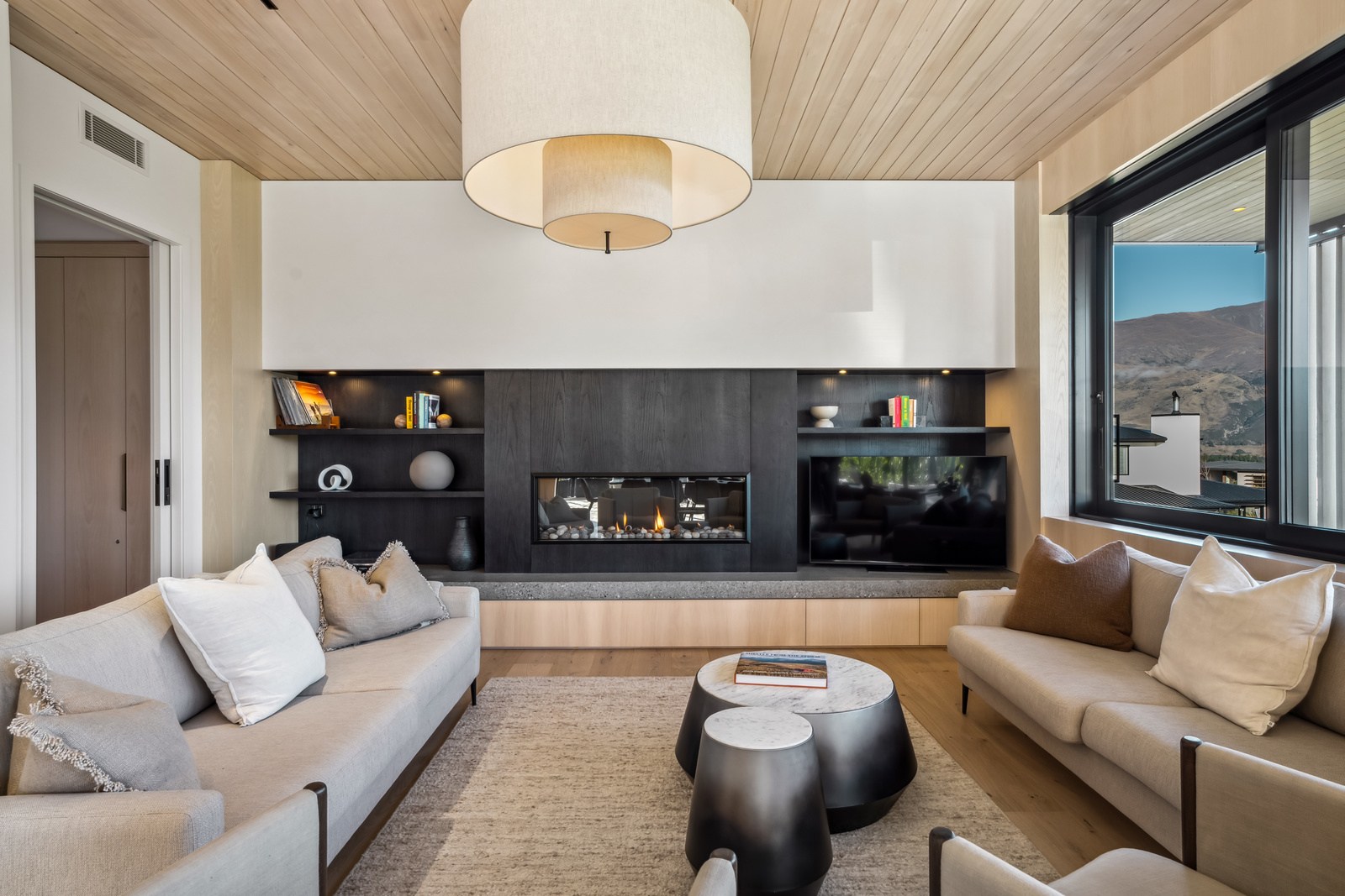 The brief was for a future-proofed family retreat with a strong Danish aesthetic, made to suit the Central Otago landscape. The result is a sophisticated 259sqm residence where light and shadow are architectural features in their own right. Blonded timber linings (in keeping with the Scandi look) and soft finishes lend warmth to the minimalist palette, while slender slatted screens bring dappled light and layered privacy to decks and windows. Exterior vertical-timber fins animate the black façade, casting changing shadows as the sun shifts through the day.