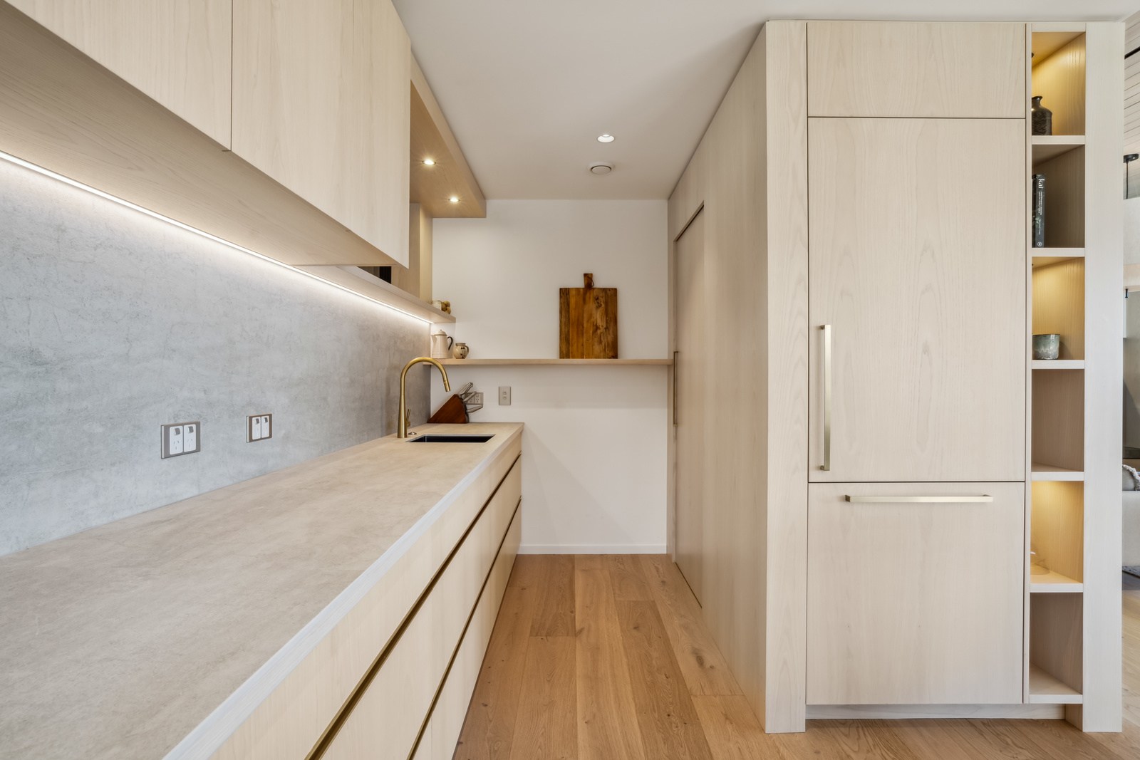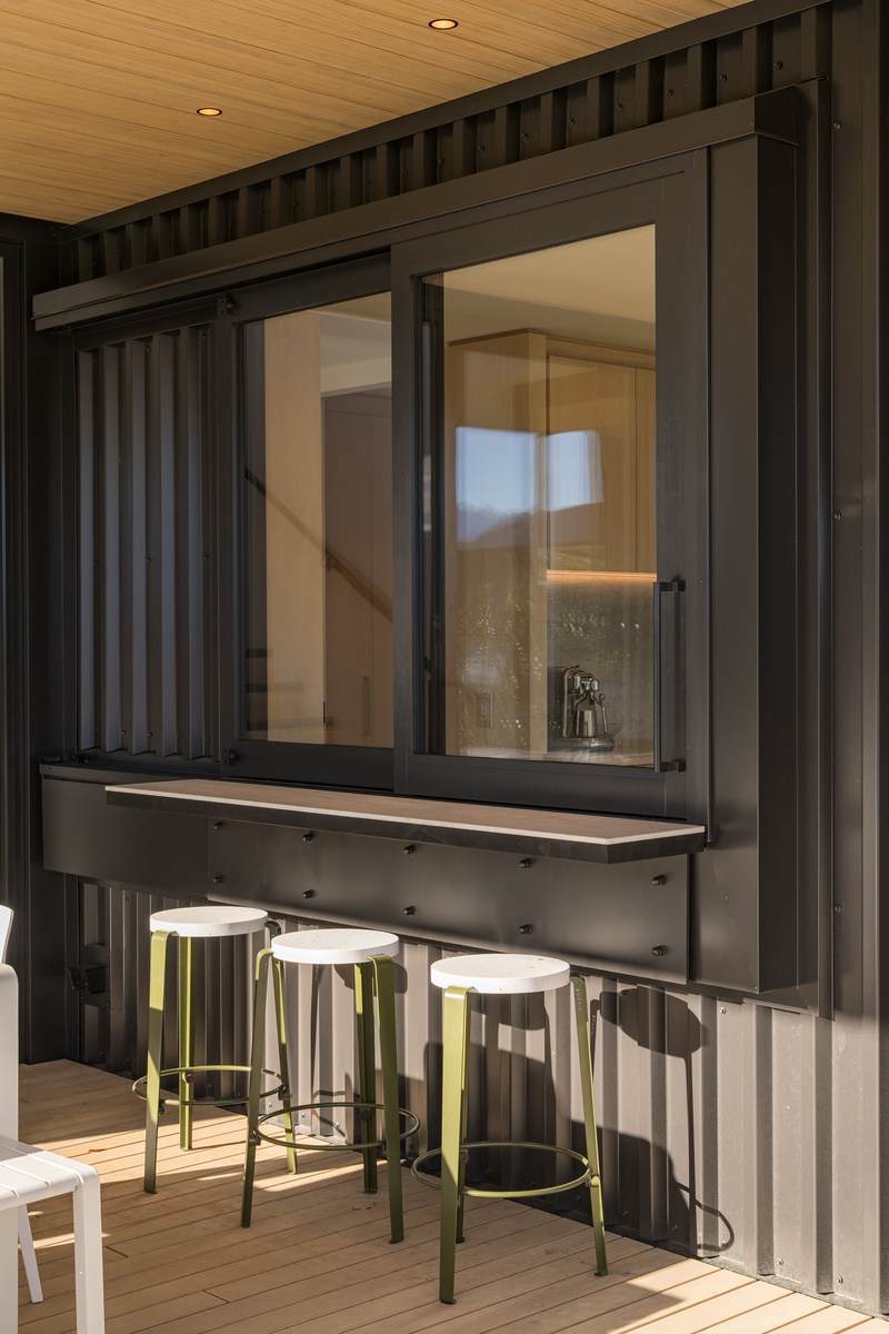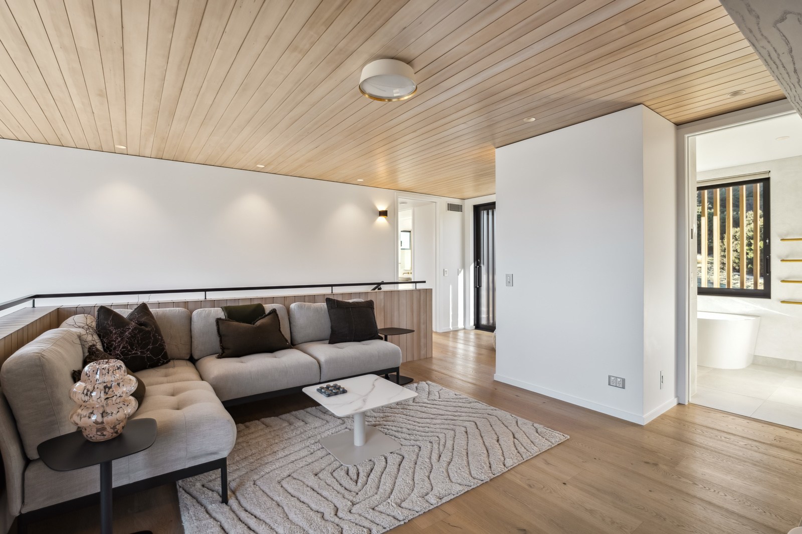 Inside, the home opens to voluminous living spaces with clean lines and expansive glazing. A strong sense of calm prevails across the three bedrooms and two living rooms, where understated materials demand absolute precision. With no decorative trims or cover pieces to disguise errors, the detailing had to be perfect — a true test of craftsmanship. The flat-roofed form – deceptively simple in appearance – required extensive engineering to achieve, while deep eaves and sliding sails add to the functionality of the outdoor spaces, making the home liveable in all seasons. Low-slung against its mountainous backdrop, this is a home that celebrates its dual heritage – teaming Northern European restraint and Southern Alpine presence.