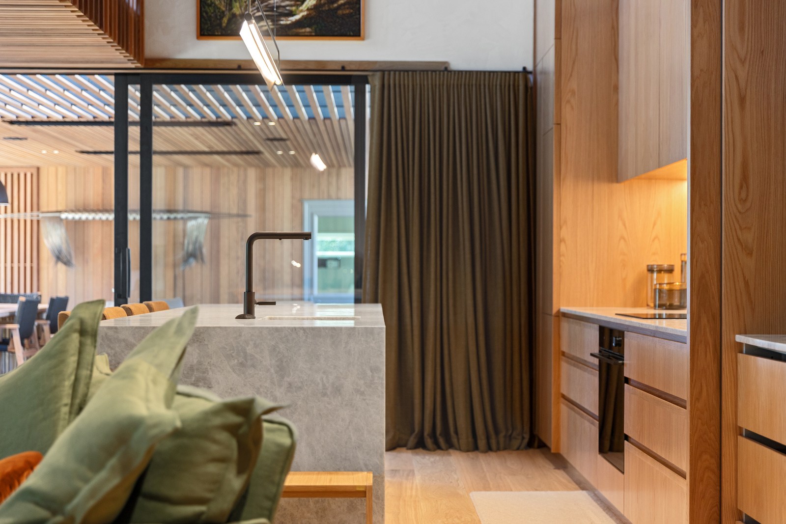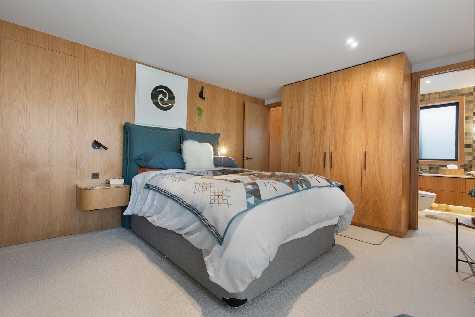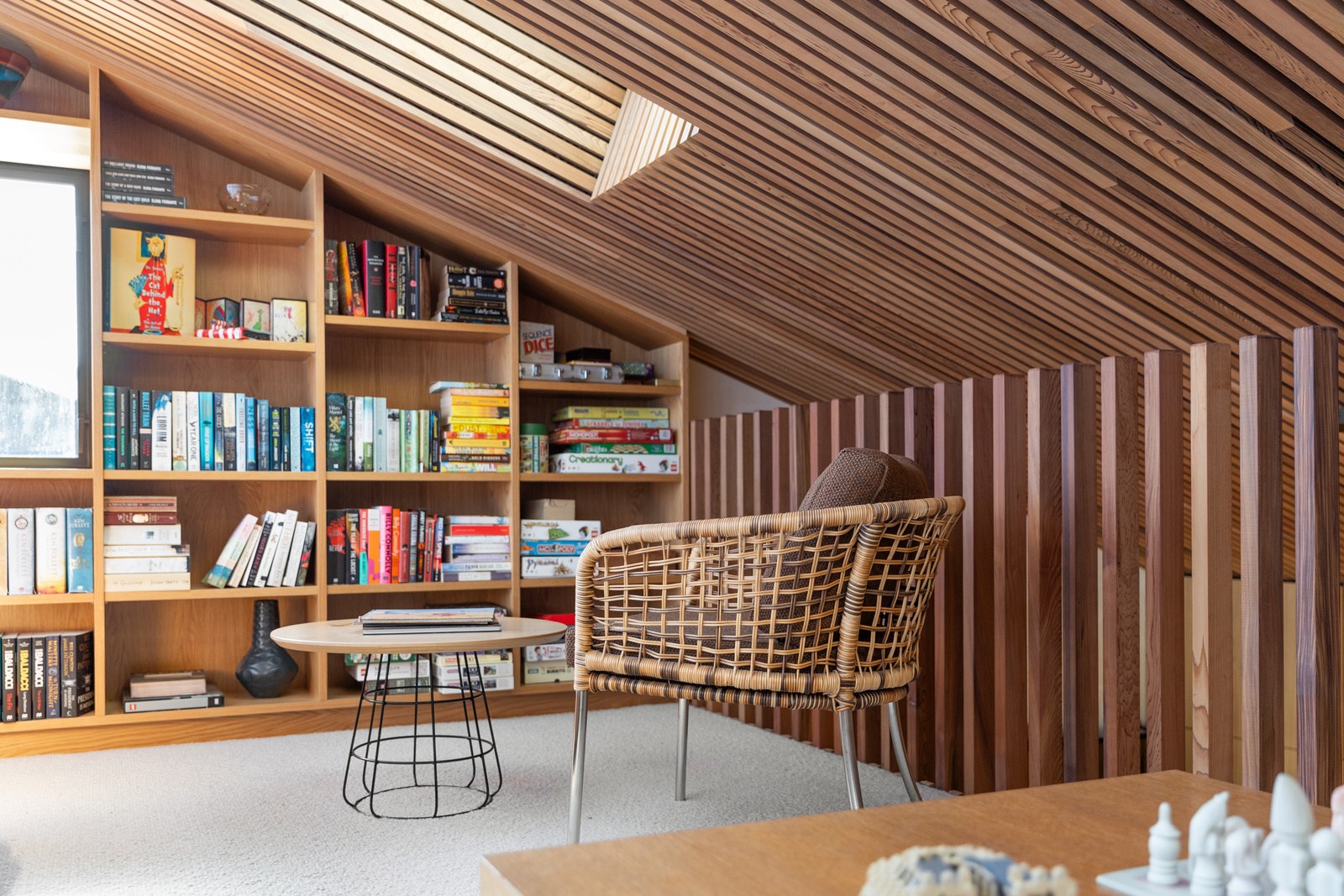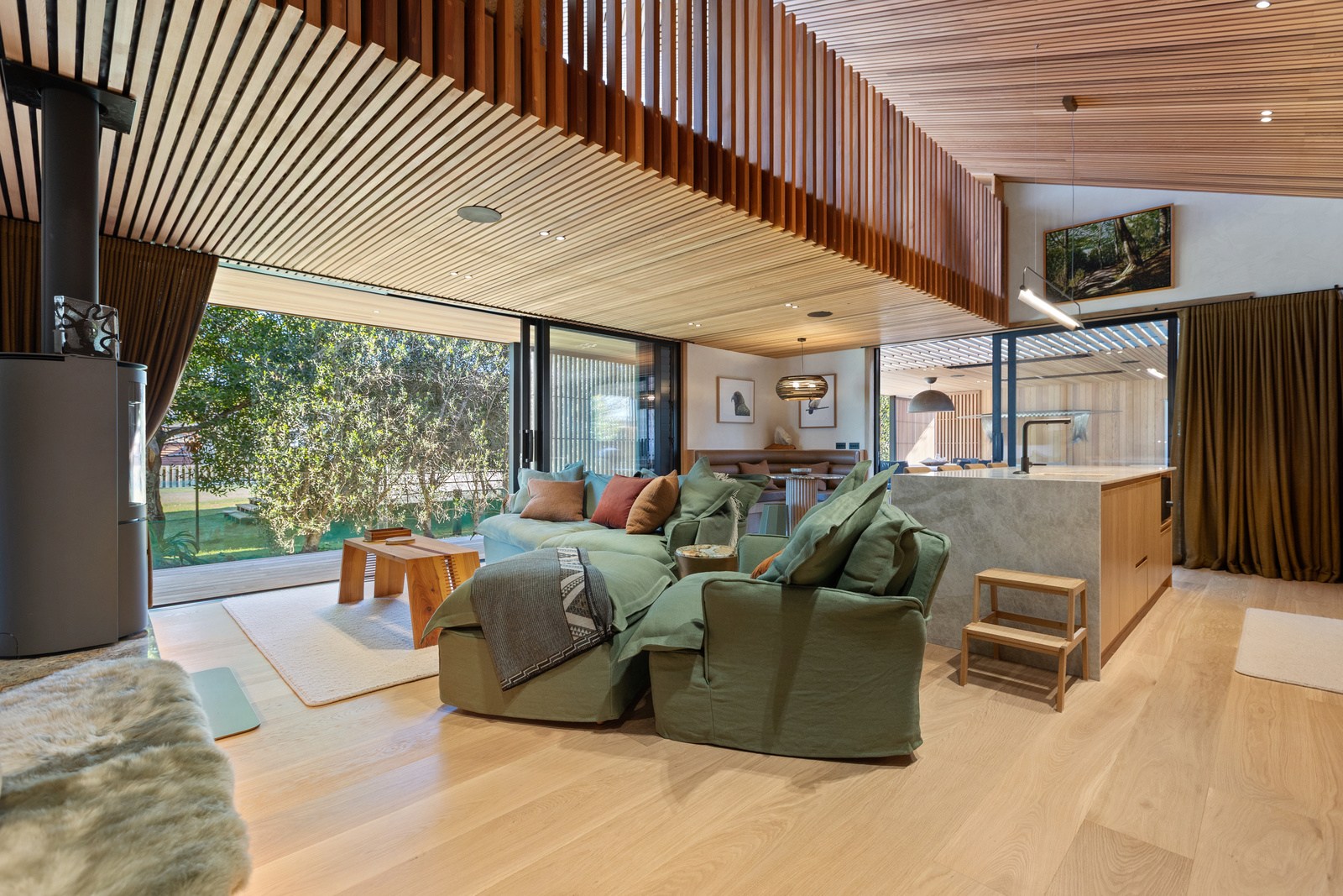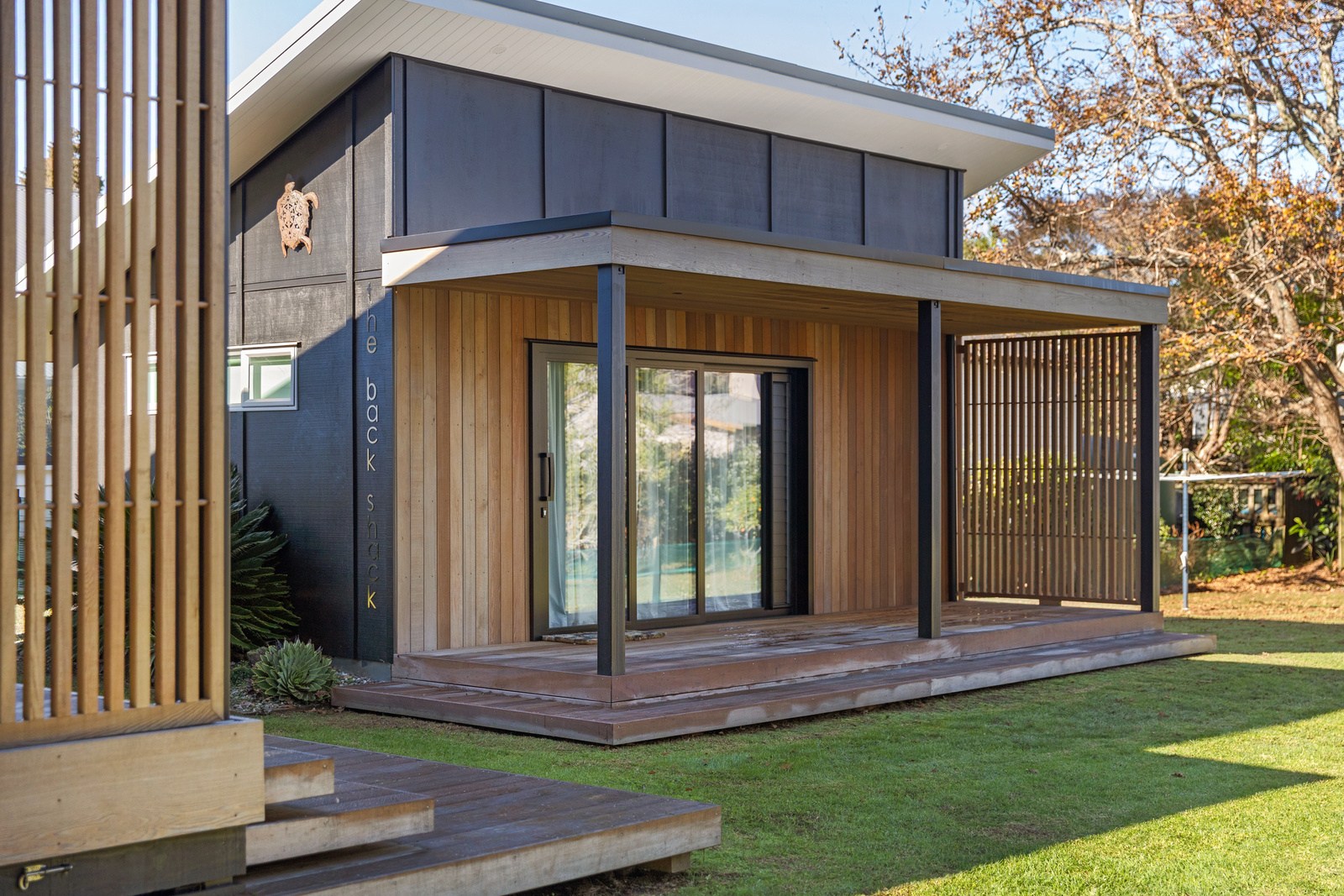 To describe this project as an extension to a family bach doesn’t come close to doing it justice. The timber-clad addition (with monopitch roof and cedar screens) that dovetails effortlessly into the existing house is simply beautiful, inside and out. And you don’t achieve this result without a high degree of skill. The builder, who owns the beach property, wanted it to be big enough to accommodate friends and grown-up family, and planned a new open-plan communal space, bedroom suite, laundry and powder room on the ground floor, plus a mezzanine with a lounge and another bedroom with ensuite.