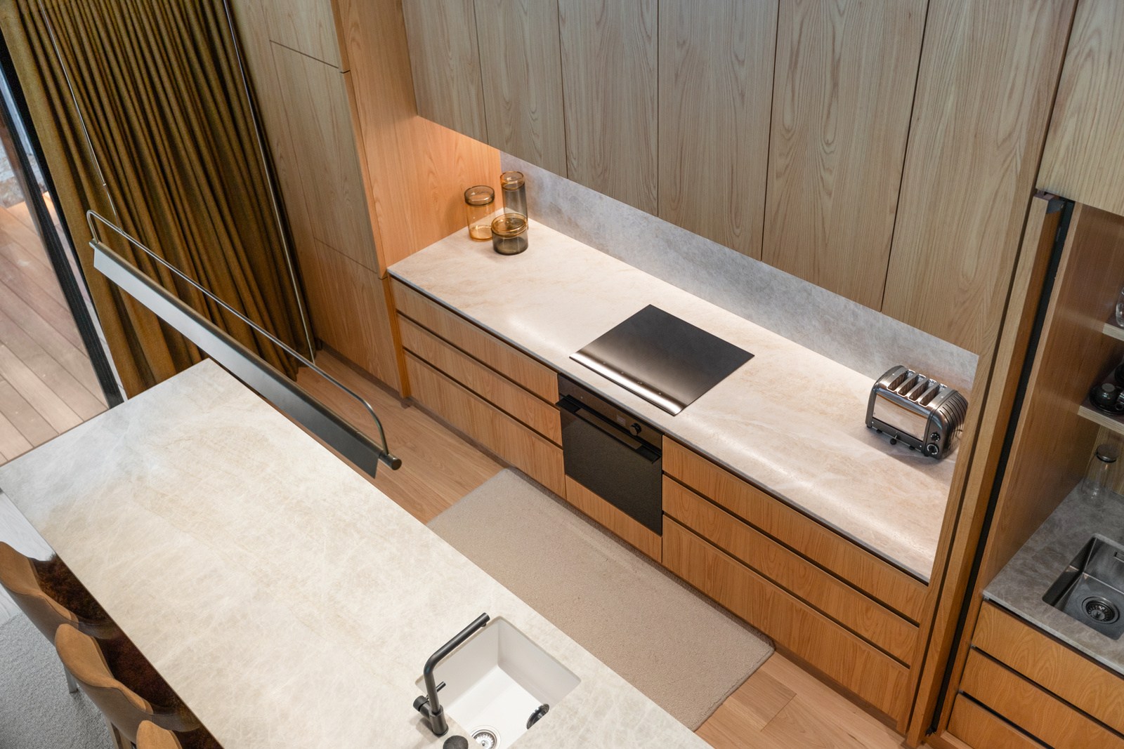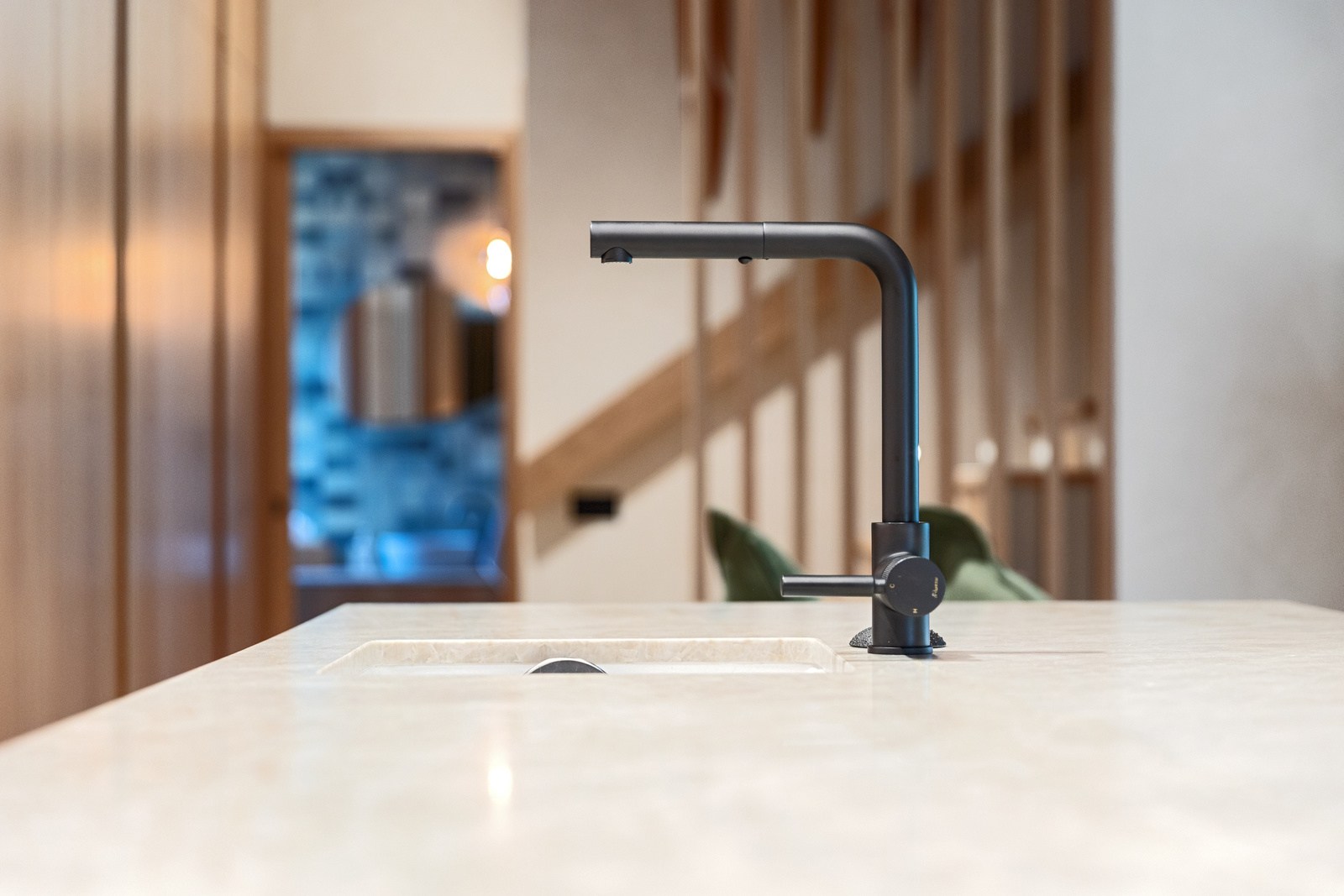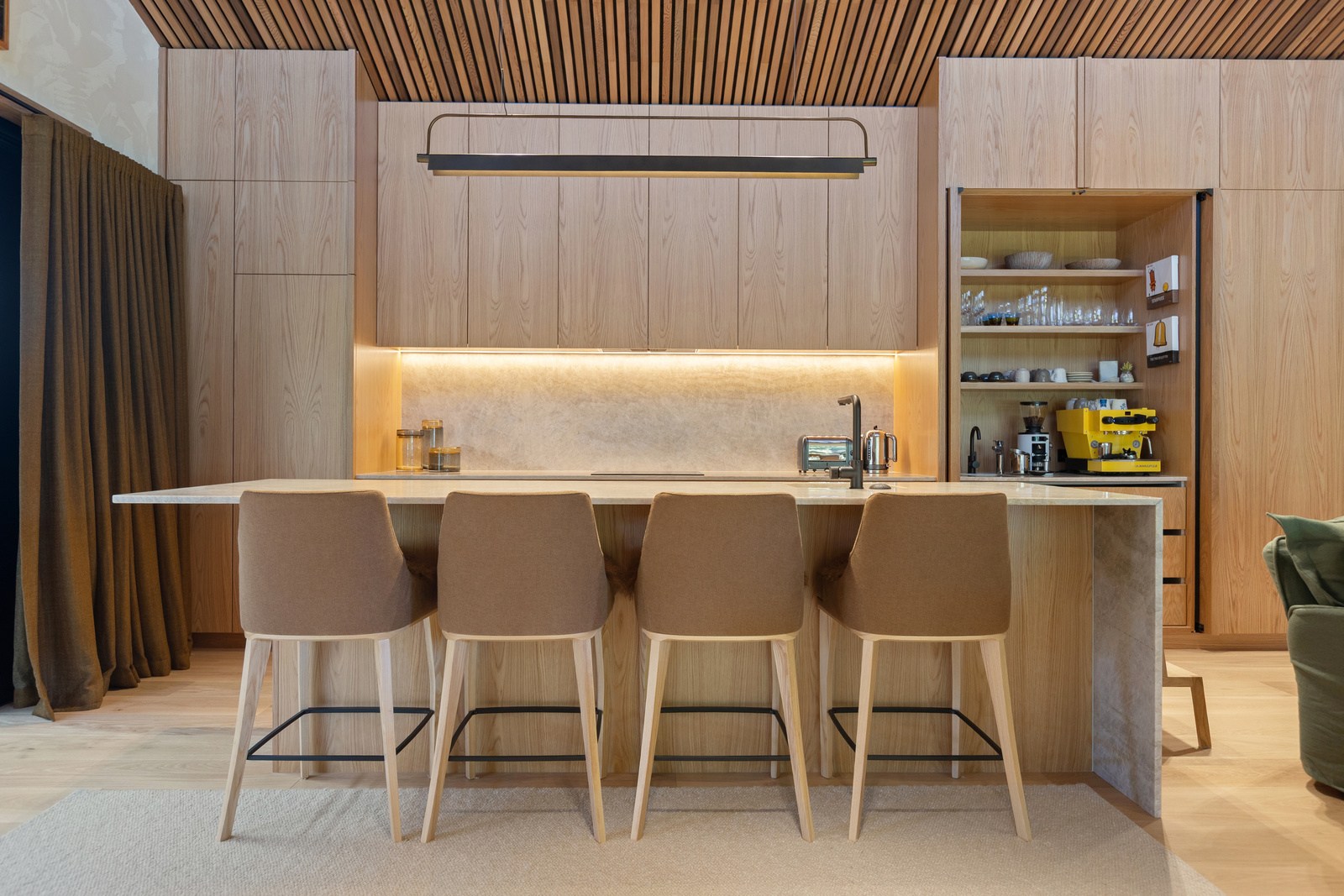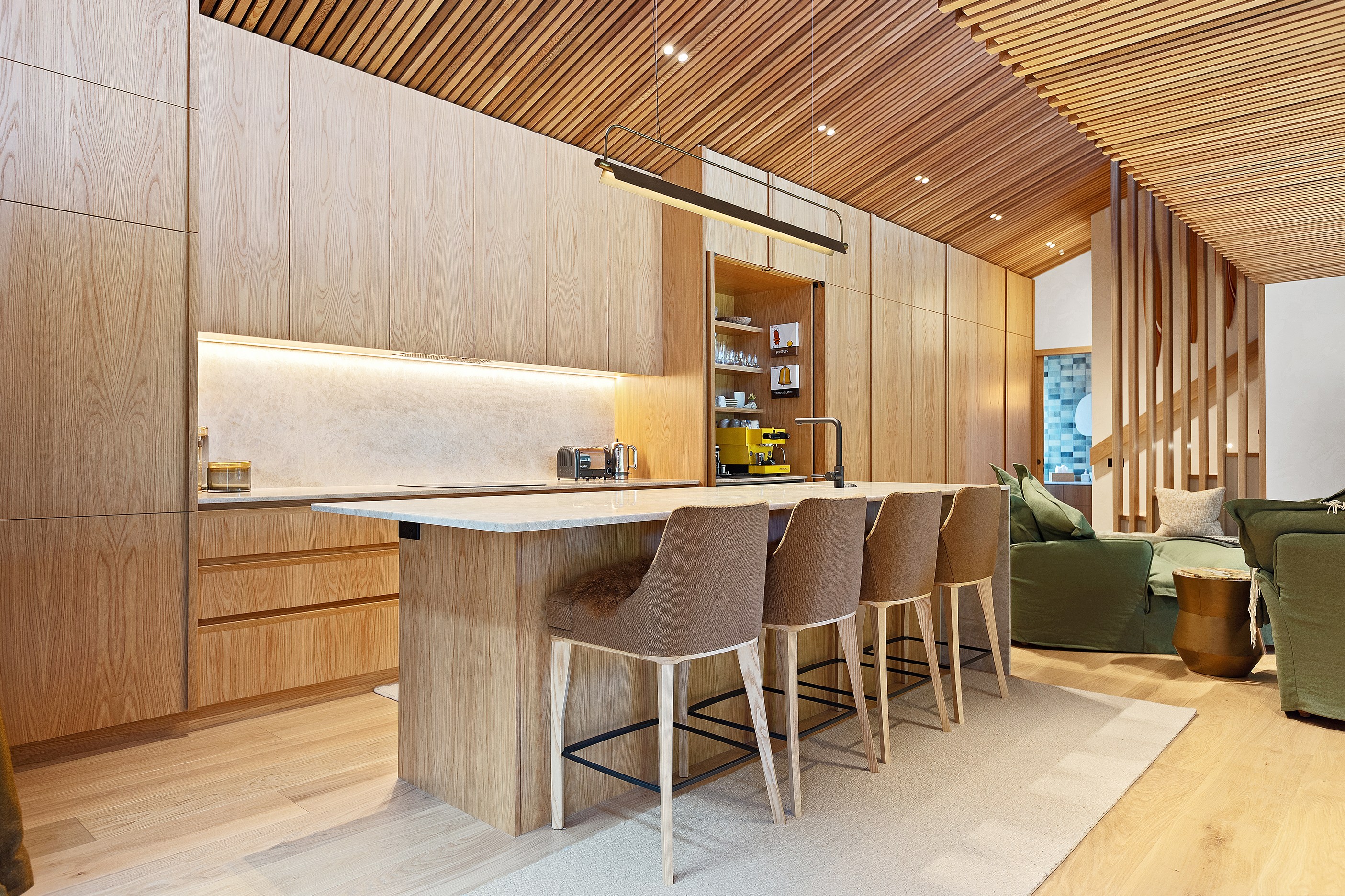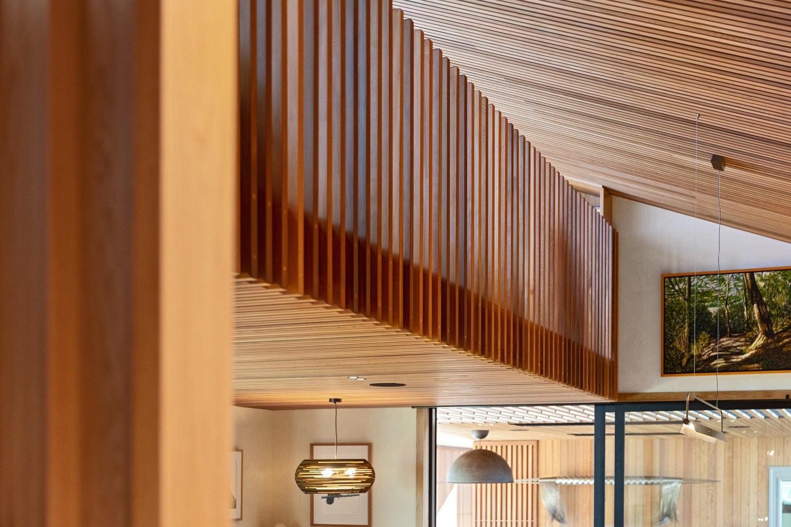 To describe this project as an extension to a family bach doesn’t come close to doing it justice. The timber-clad addition (with monopitch roof and cedar screens) that dovetails effortlessly into the existing house is simply beautiful, inside and out. And you don’t achieve this result without a high degree of skill. The builder, who owns the beach property, wanted it to be big enough to accommodate friends and grown-up family, and planned a new open-plan communal space, bedroom suite, laundry and powder room on the ground floor, plus a mezzanine with a lounge and another bedroom with ensuite.