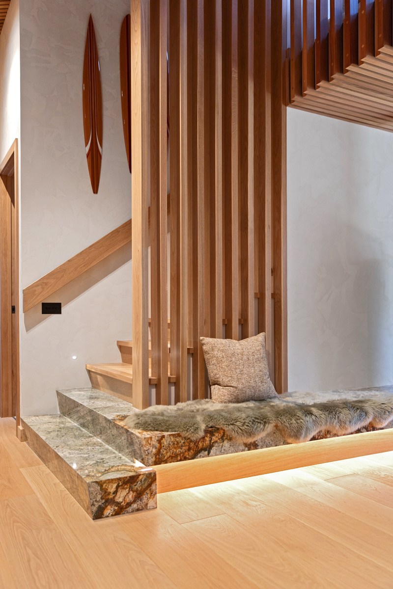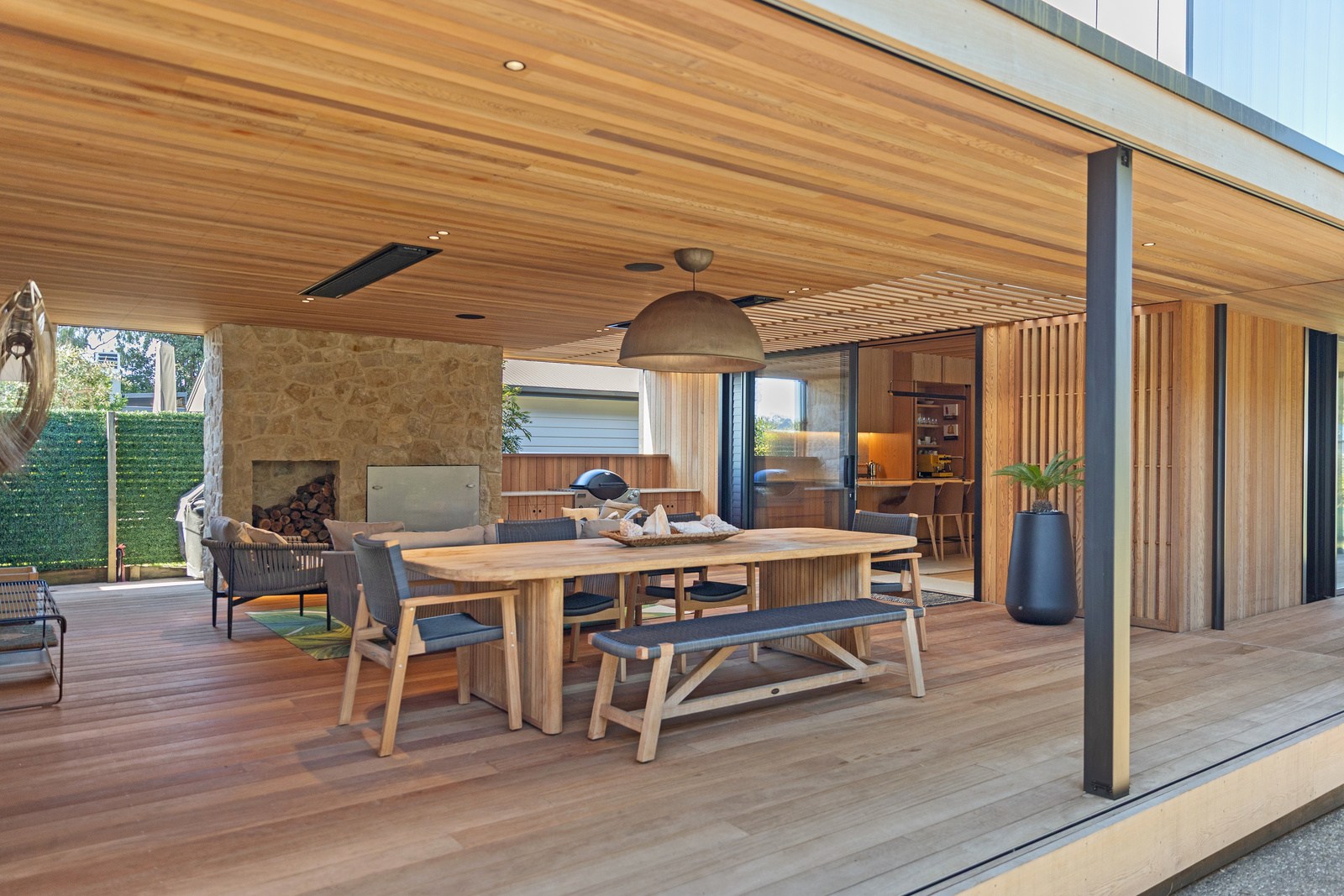 The project, depicted as a modern take on the existing bach and with the subtle use of Kiwiana, again goes beyond these descriptions. It starts with creative design, continues with materials such as timber and stone that reflect the coastal environment and extends into exemplary indoor-outdoor living, some of it covered. It finishes with undoubted craftsmanship. With timber ceilings, screens, cabinetry and feature walls, the quality of finishing is there for all to see. Now the builder and his family have 231sqm of divine beach house with four bedrooms, three tiled bathrooms and two living spaces, one with a fireplace and stone hearth. It’s also a special place to gather, relax and make memories for generations to come.