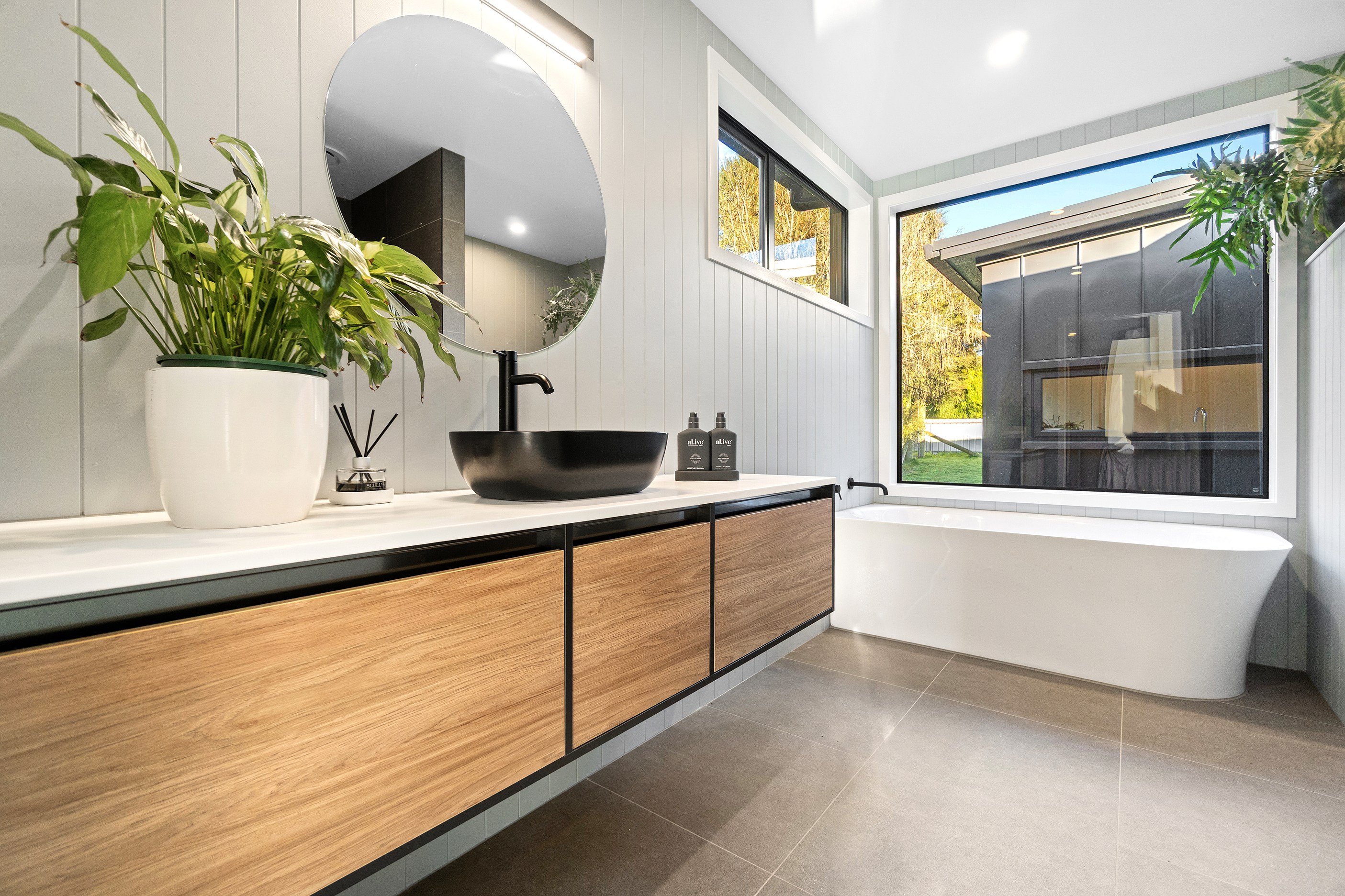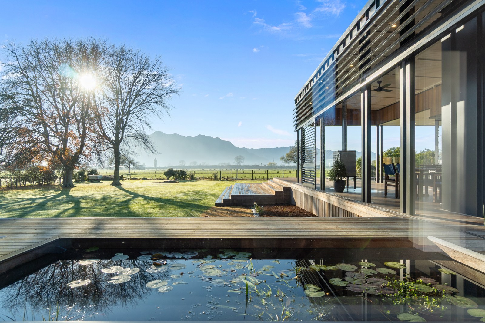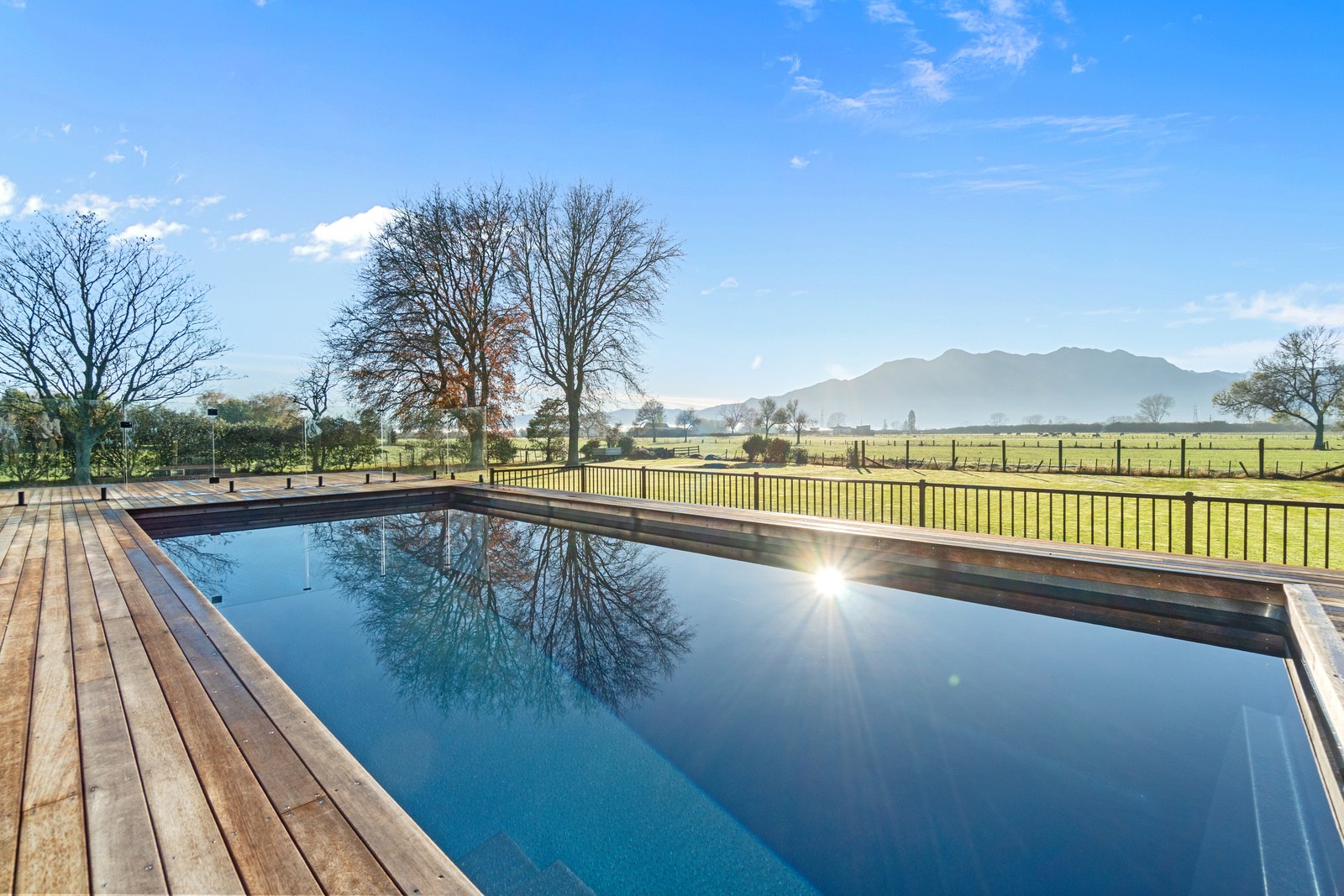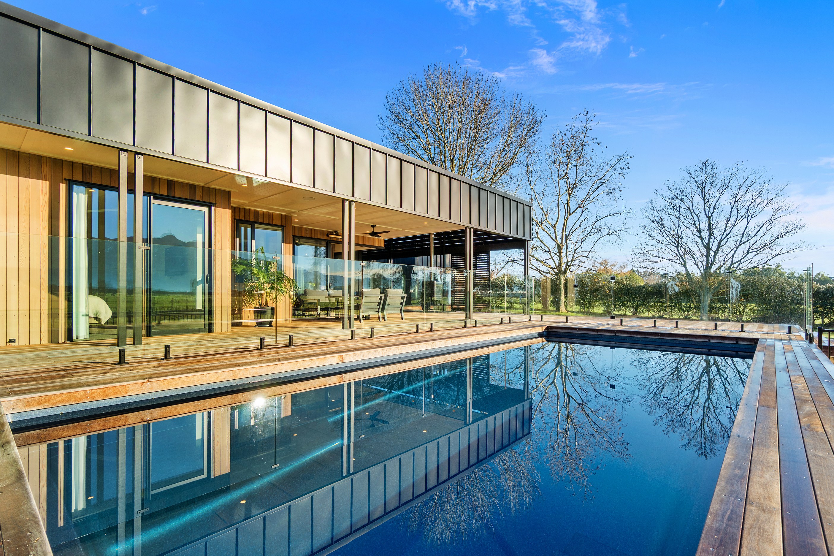 Indoors, the kitchen’s classic white splashback and benchtops contrast the dark cabinetry. Two living areas provide abundant space, with generous floor-to-ceiling glazing that maximises natural light and highlights the seamless indoor-outdoor transition onto expansive decking. The careful design ensures mountain views are enjoyed from multiple vantage points. The main ensuite, a luxurious retreat, includes a bath with a picture window and grooved wall linings. Outside, the inviting pool area extends the home’s living zones. The water’s reflection of the home’s symmetrical rectangular form adds to the property’s aesthetic appeal and harmonious design. Extensive glazing truly gives this home a heart of glass, beautifully connecting its interior warmth to the stunning exterior vistas.