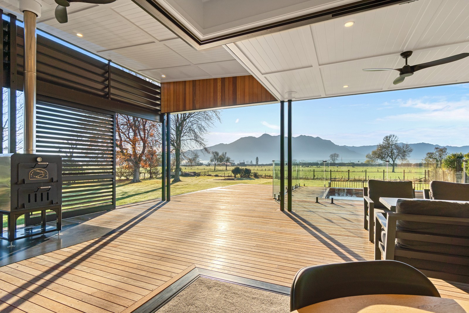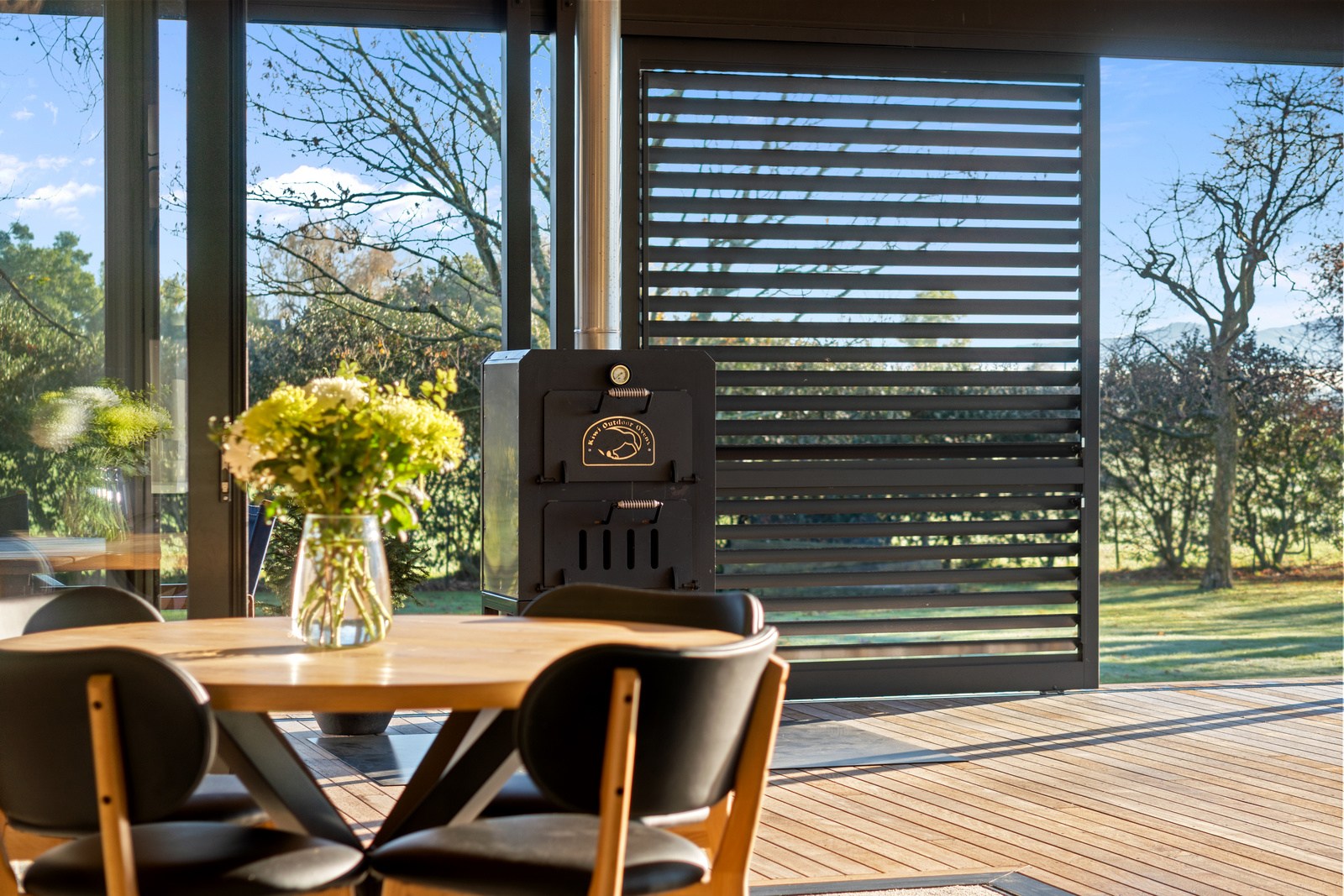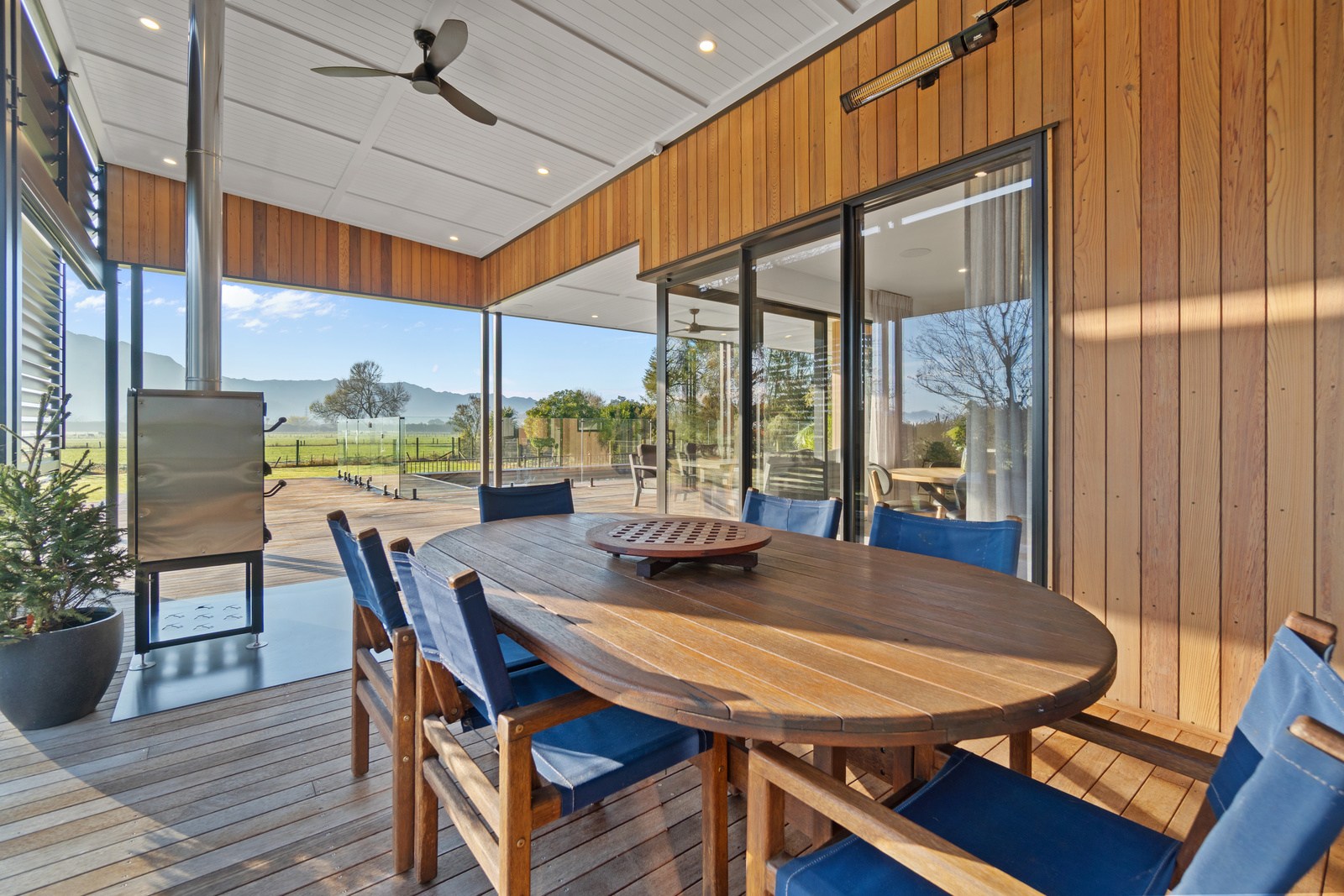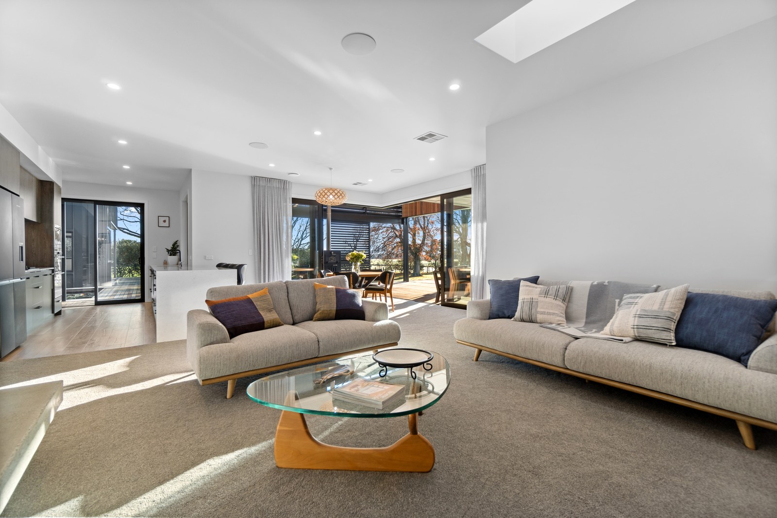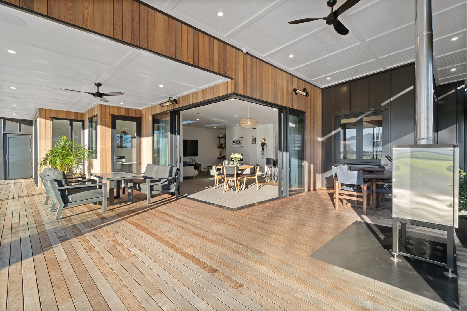 Indoors, the kitchen’s classic white splashback and benchtops contrast the dark cabinetry. Two living areas provide abundant space, with generous floor-to-ceiling glazing that maximises natural light and highlights the seamless indoor-outdoor transition onto expansive decking. The careful design ensures mountain views are enjoyed from multiple vantage points. The main ensuite, a luxurious retreat, includes a bath with a picture window and grooved wall linings. Outside, the inviting pool area extends the home’s living zones. The water’s reflection of the home’s symmetrical rectangular form adds to the property’s aesthetic appeal and harmonious design. Extensive glazing truly gives this home a heart of glass, beautifully connecting its interior warmth to the stunning exterior vistas.