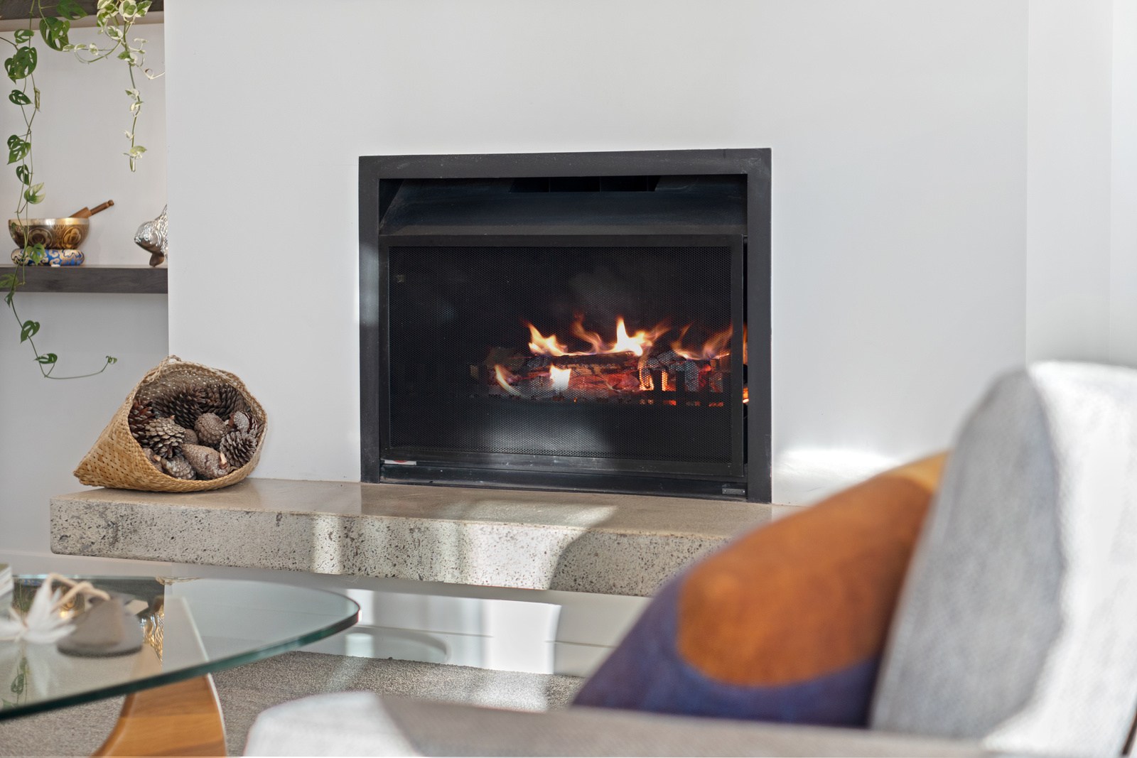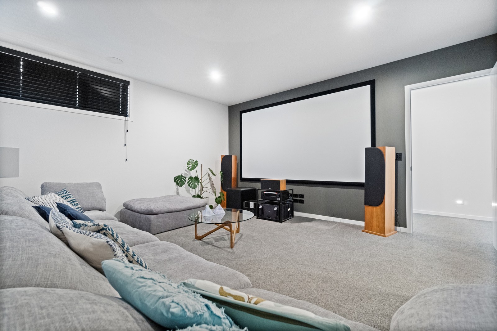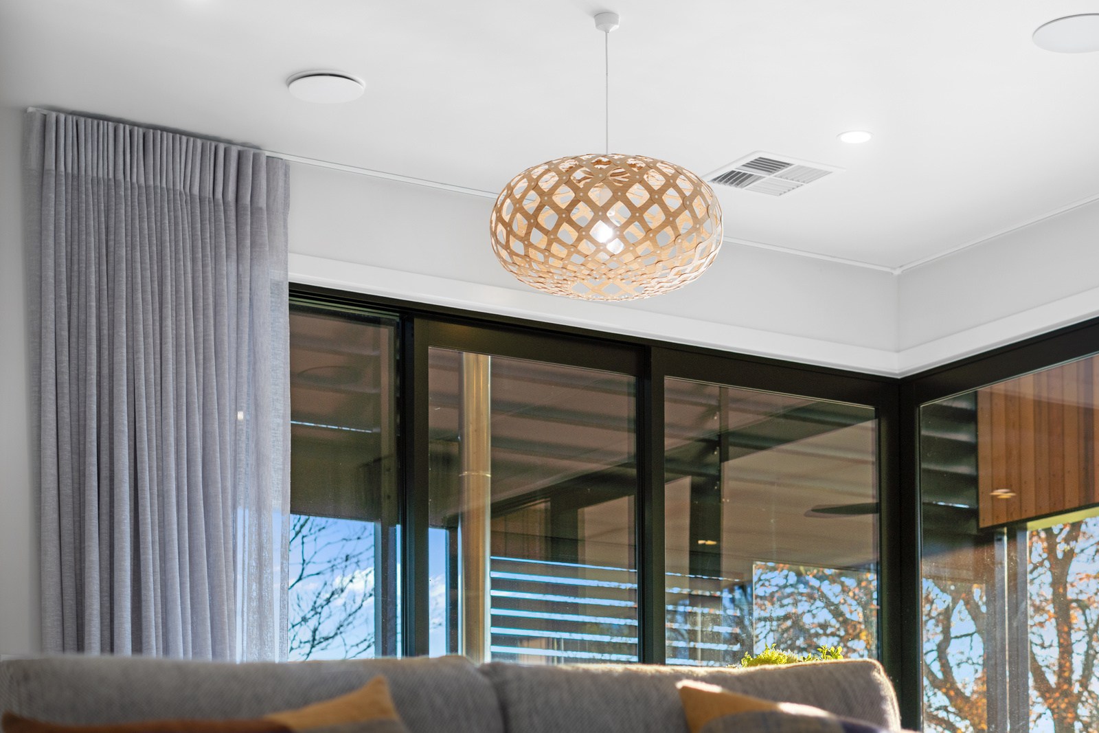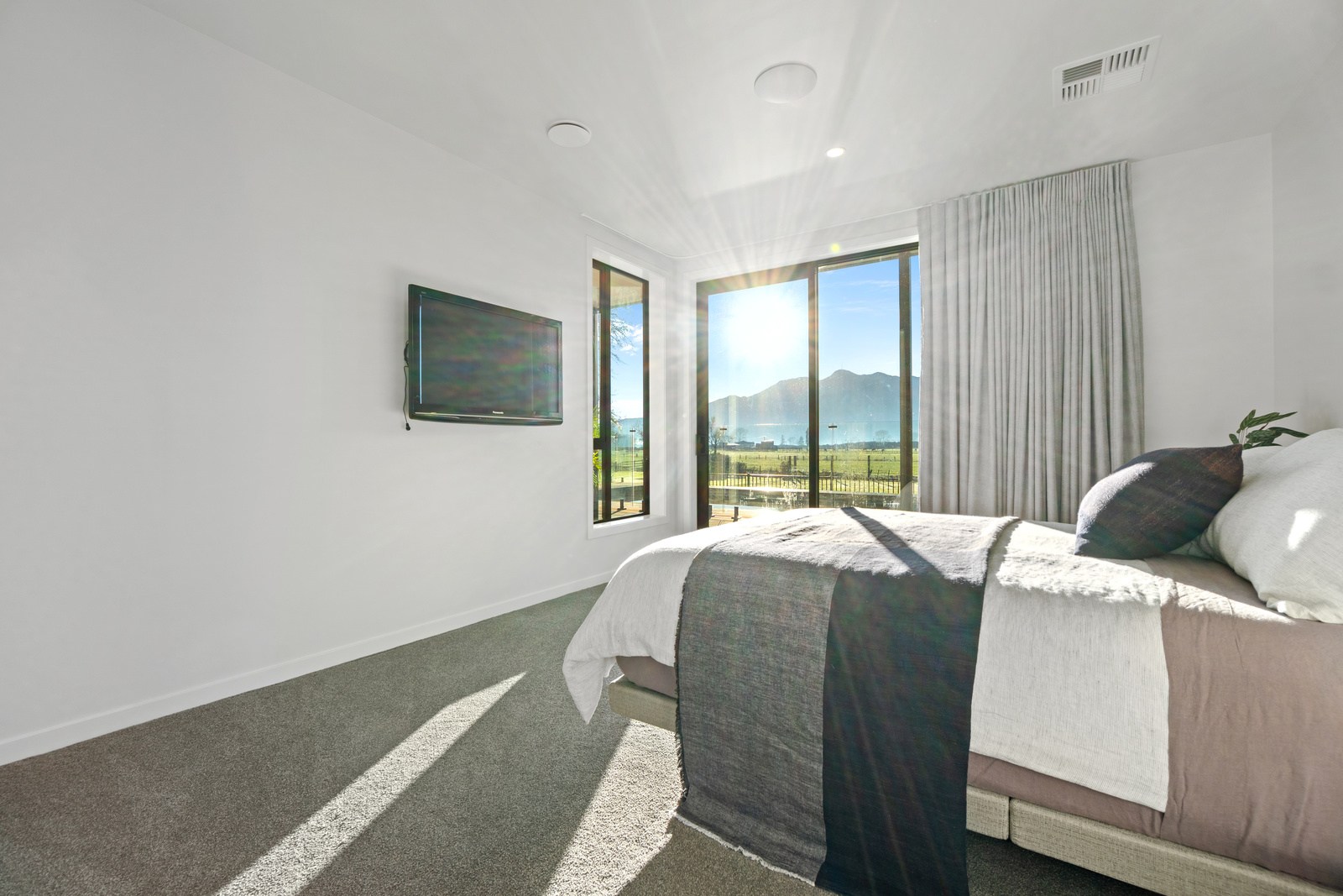 Indoors, the kitchen’s classic white splashback and benchtops contrast the dark cabinetry. Two living areas provide abundant space, with generous floor-to-ceiling glazing that maximises natural light and highlights the seamless indoor-outdoor transition onto expansive decking. The careful design ensures mountain views are enjoyed from multiple vantage points. The main ensuite, a luxurious retreat, includes a bath with a picture window and grooved wall linings. Outside, the inviting pool area extends the home’s living zones. The water’s reflection of the home’s symmetrical rectangular form adds to the property’s aesthetic appeal and harmonious design. Extensive glazing truly gives this home a heart of glass, beautifully connecting its interior warmth to the stunning exterior vistas.